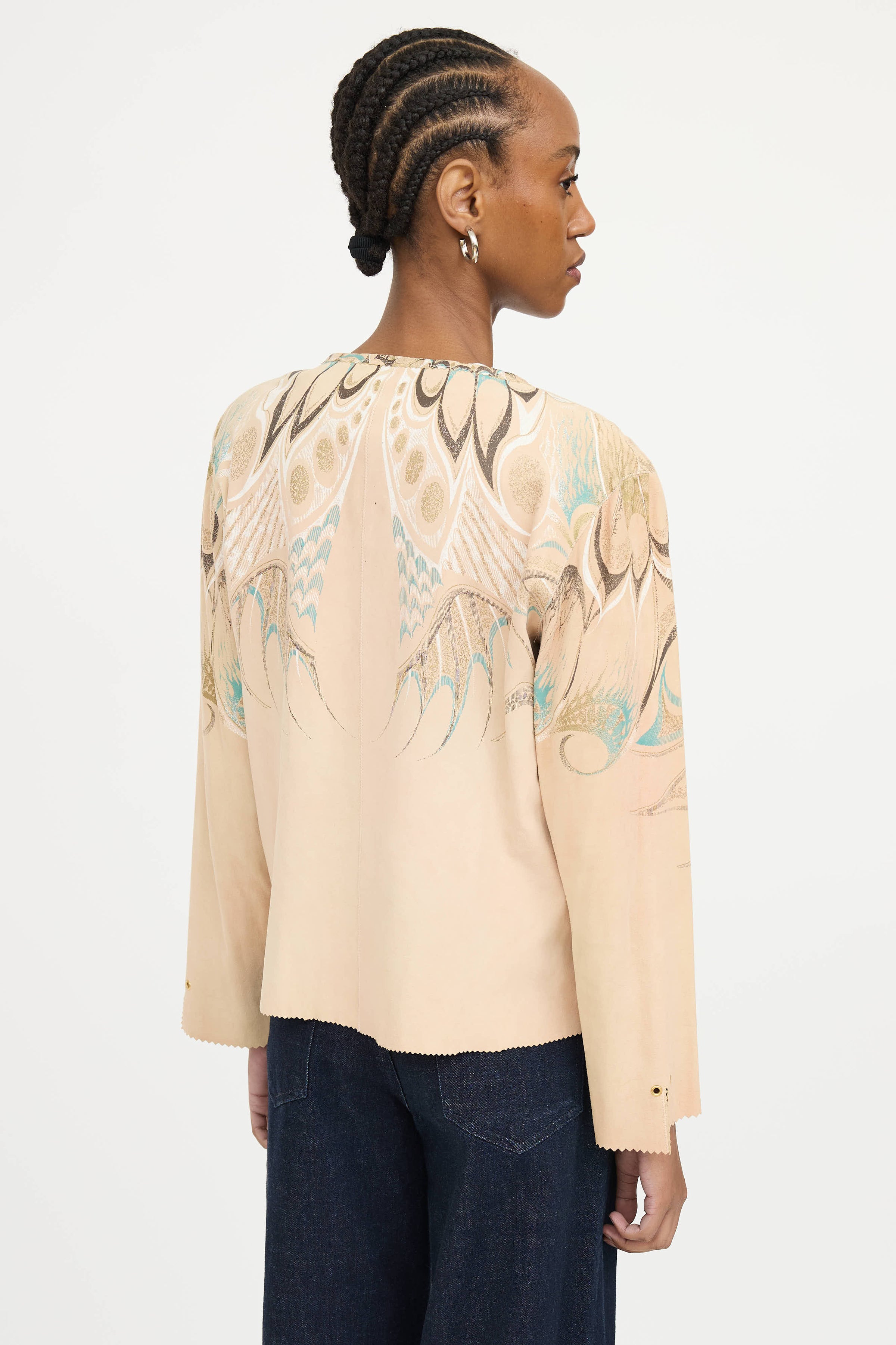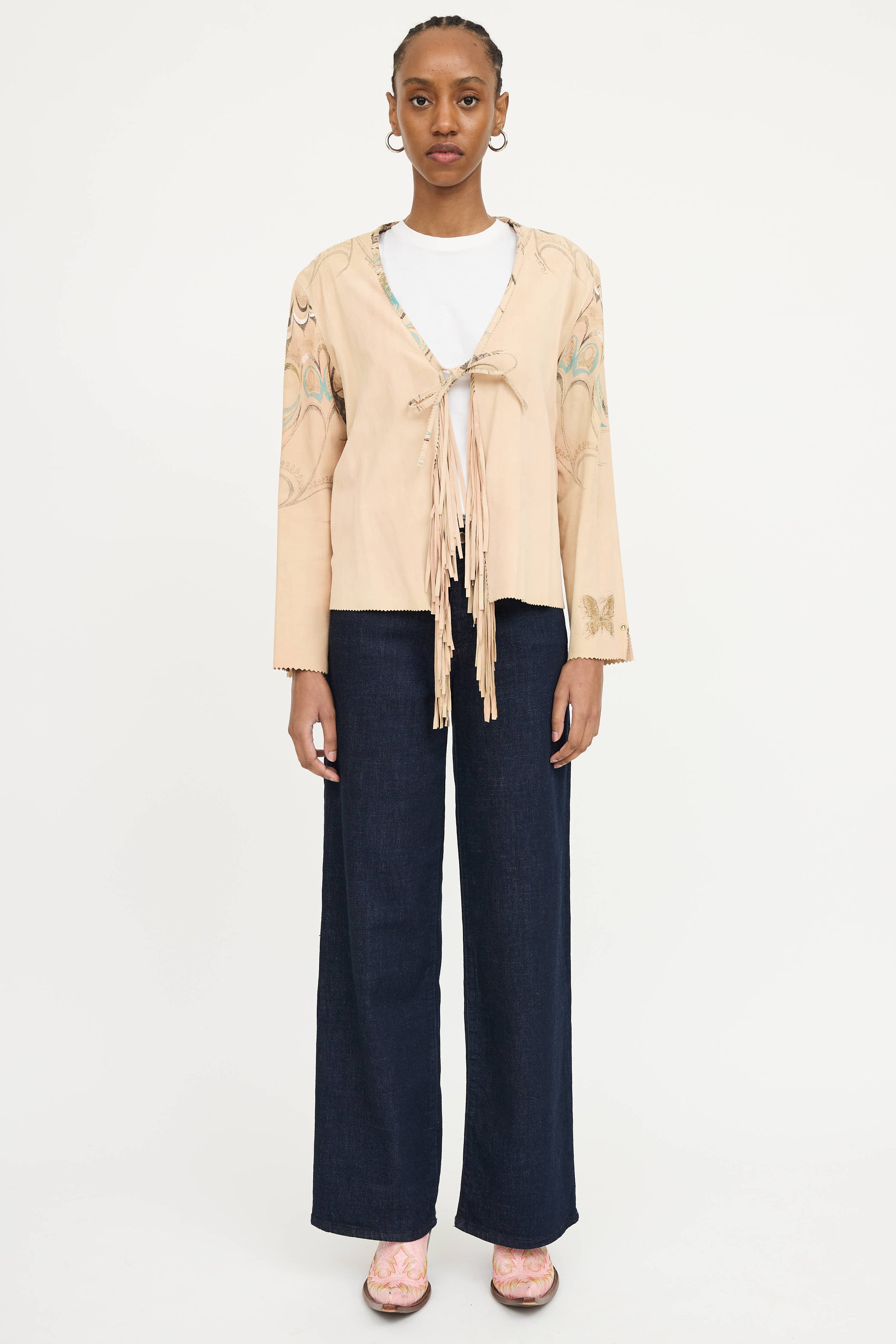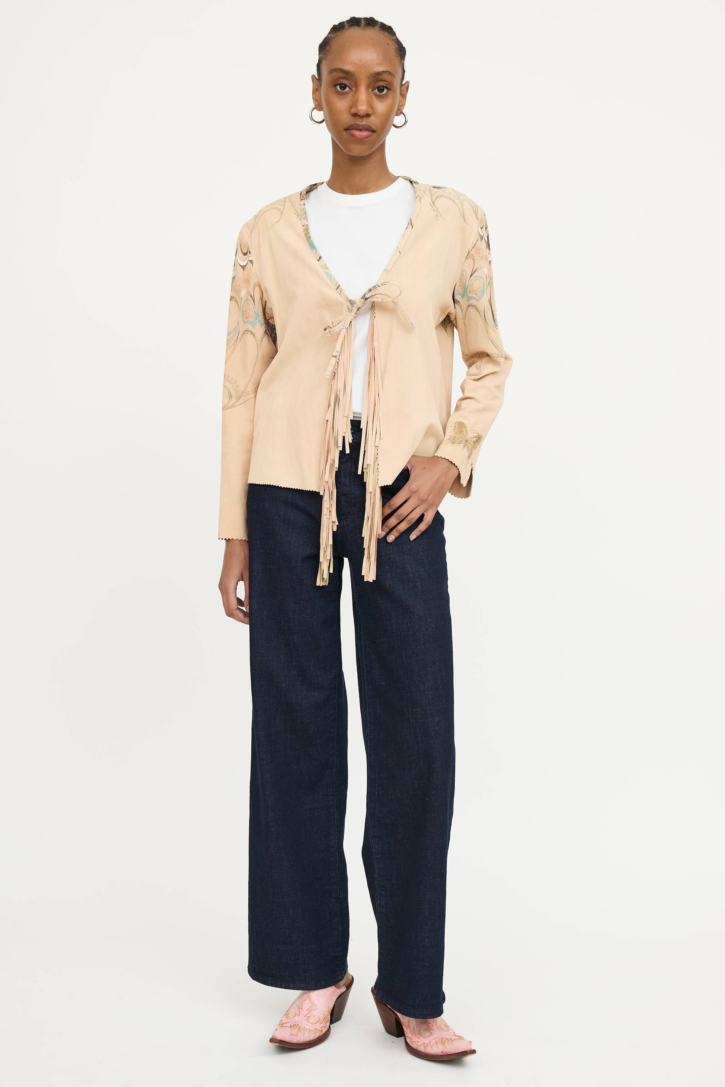 Pre-owned Roberto Cavalli 2004 beige suede long sleeve jacket featuring open tie front, fringe front, printed back, logo patch at sleeve, scalloped hem, and slit at cuffs.