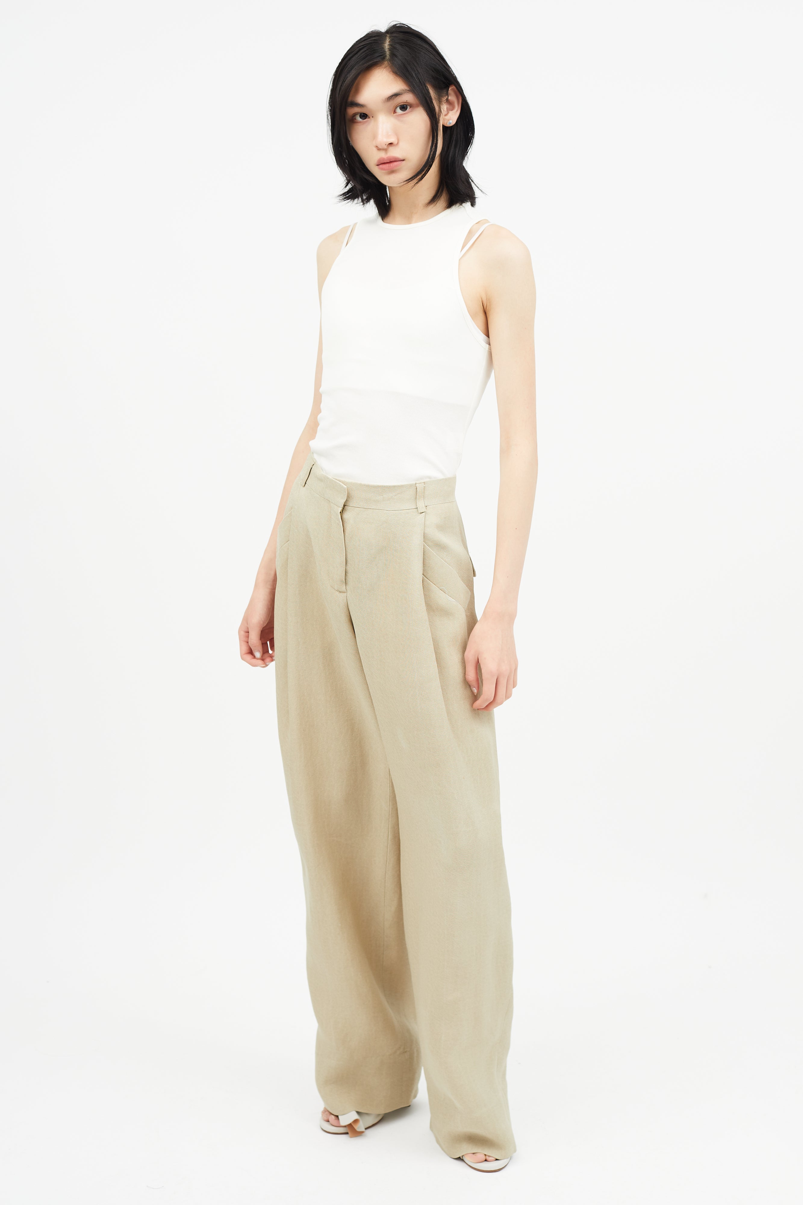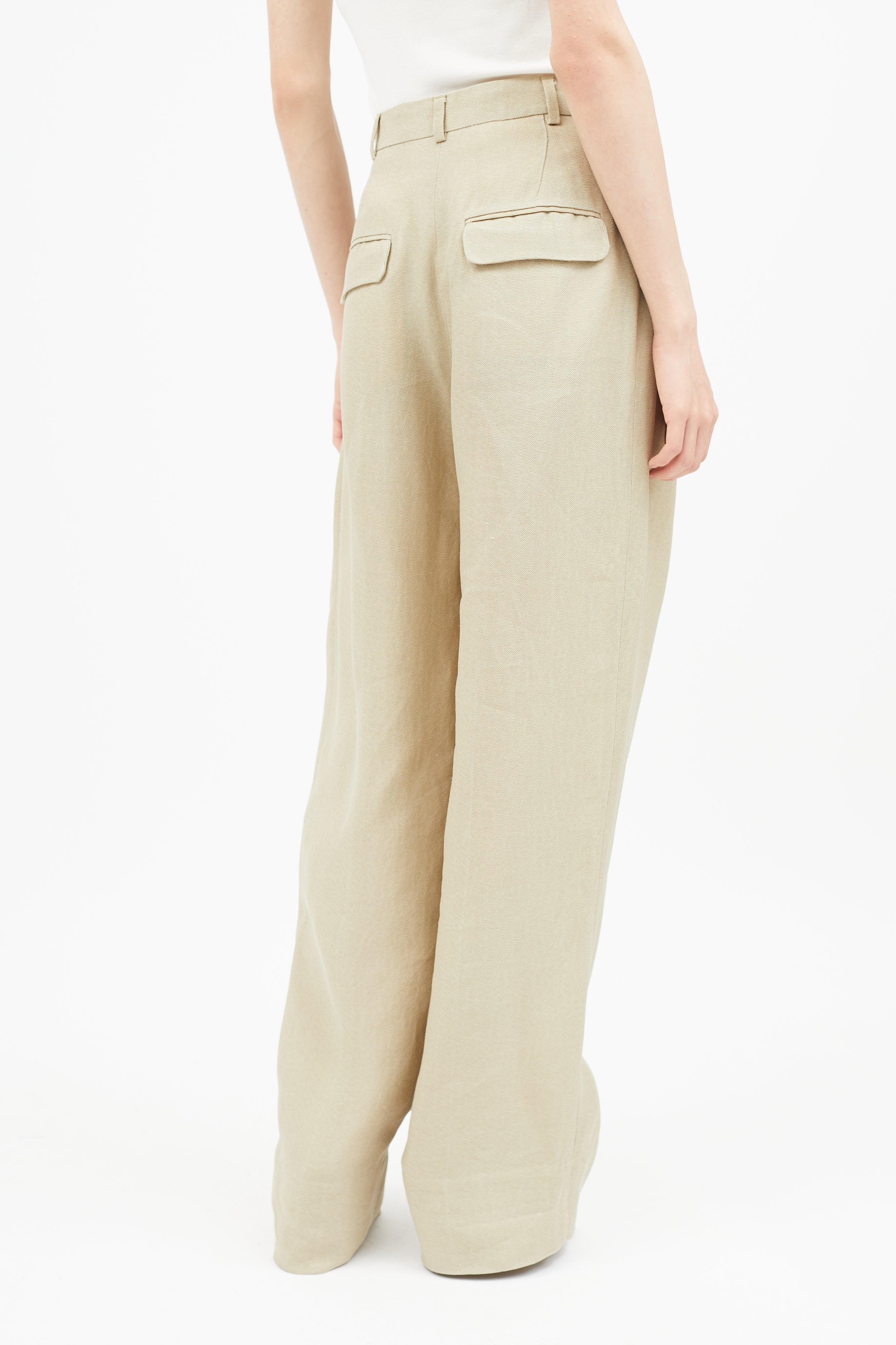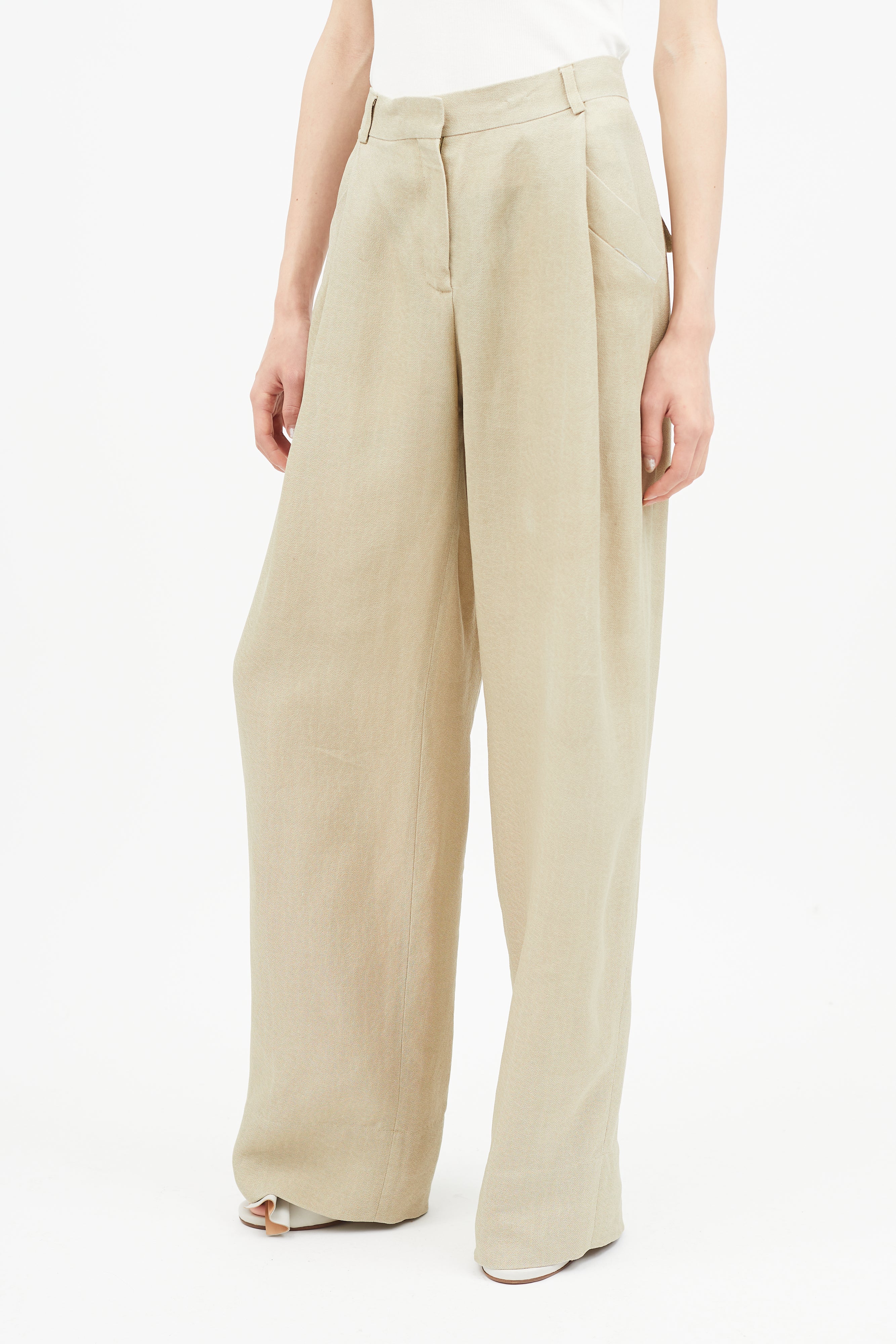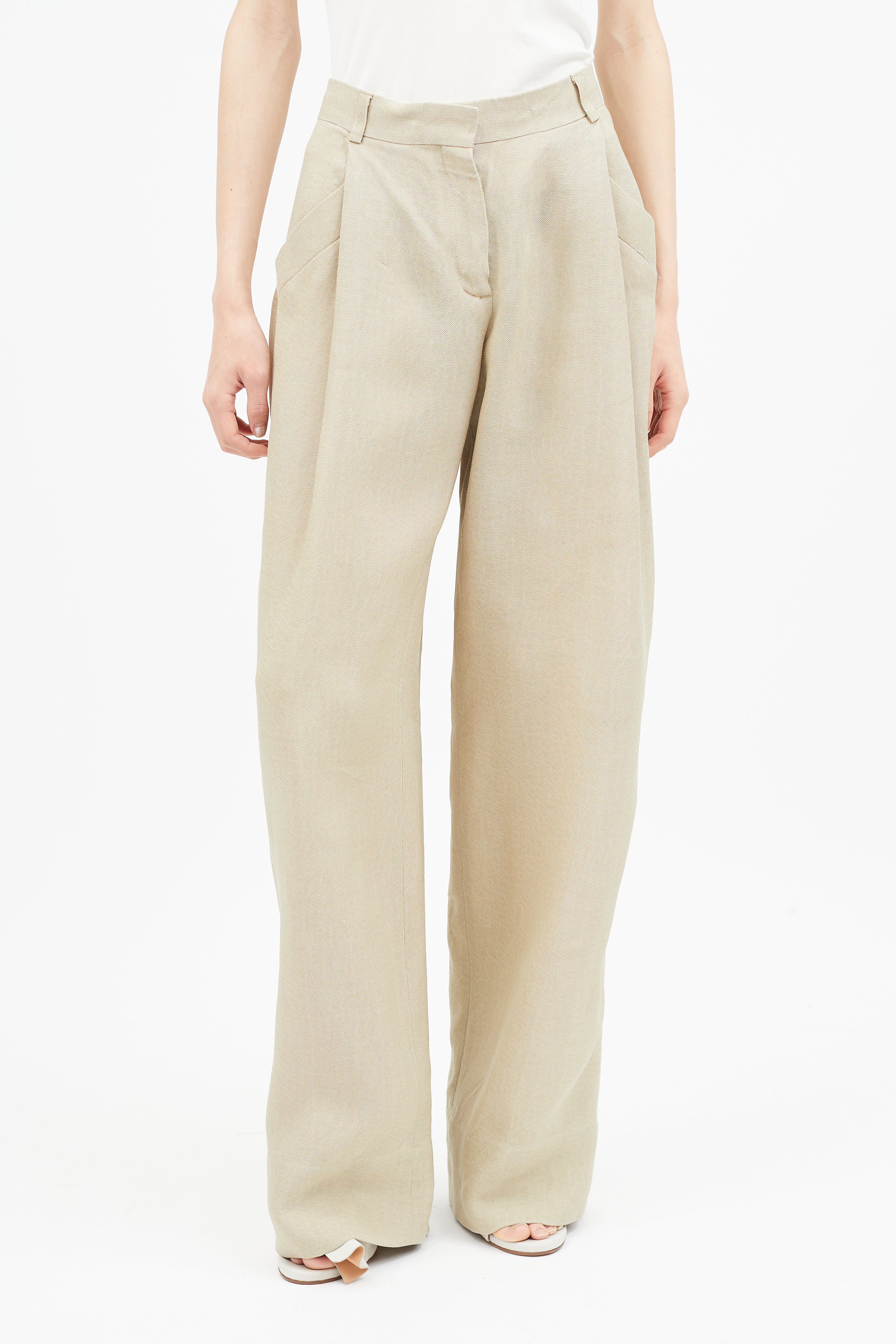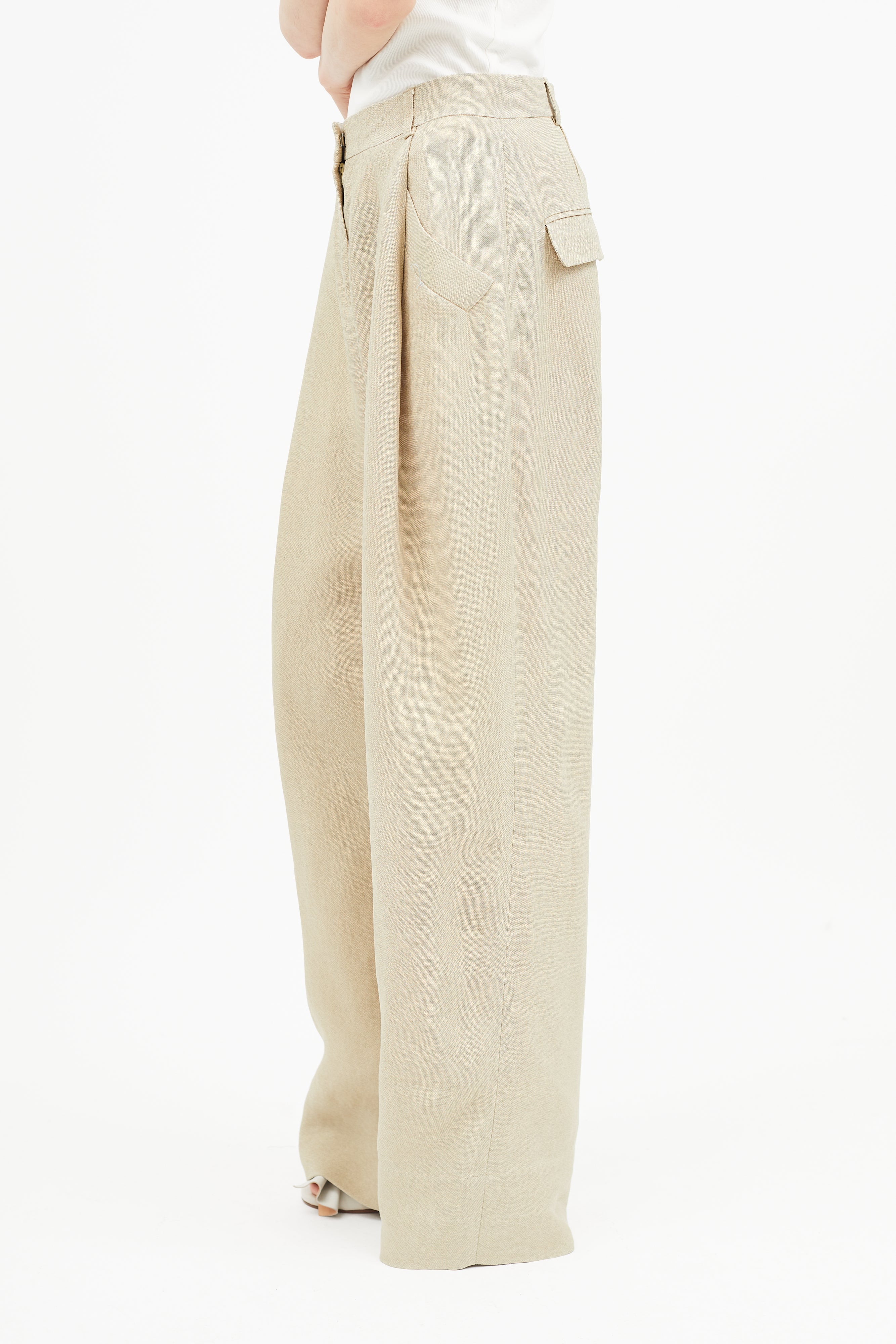 Pre-owned Jacquemus beige linen trousers featuring two slip pockets at hip, two flap pockets at back, centre pleat, wide leg, and zip fly with hook and eye closure.