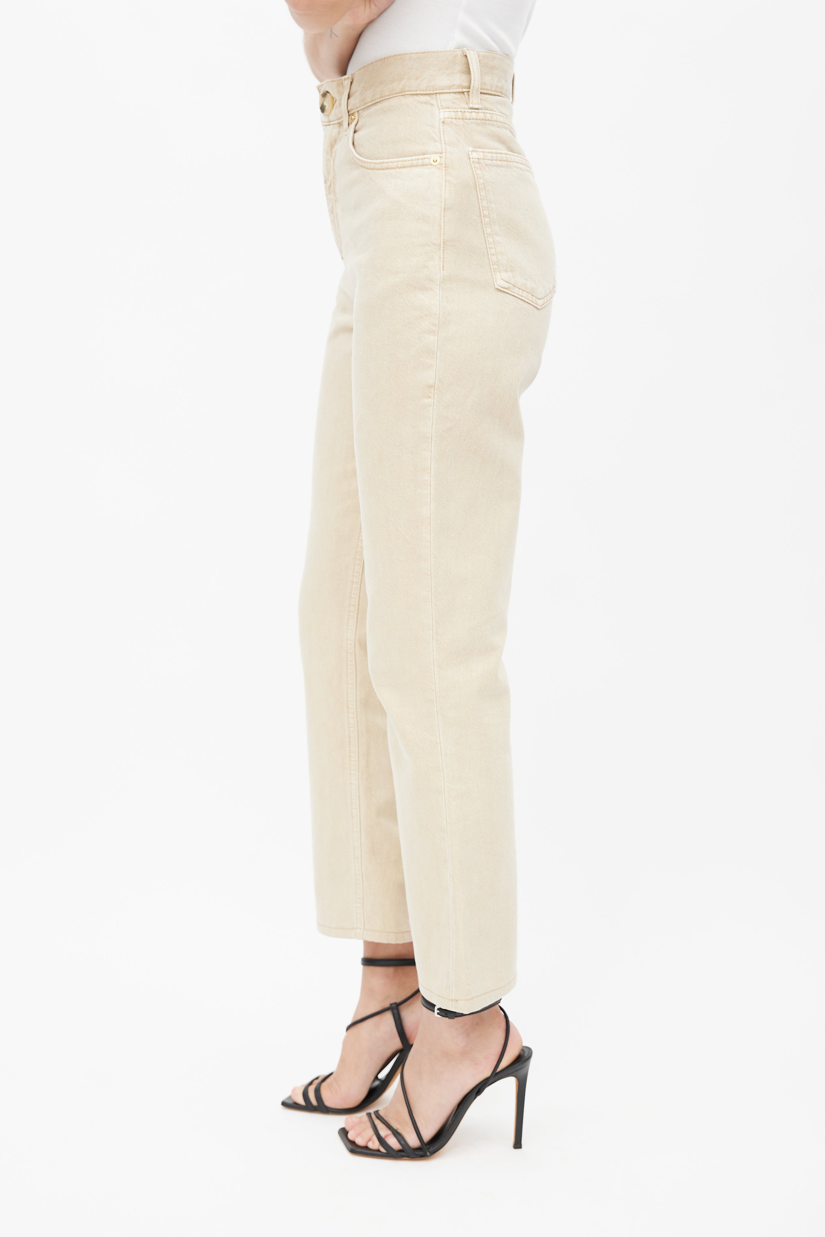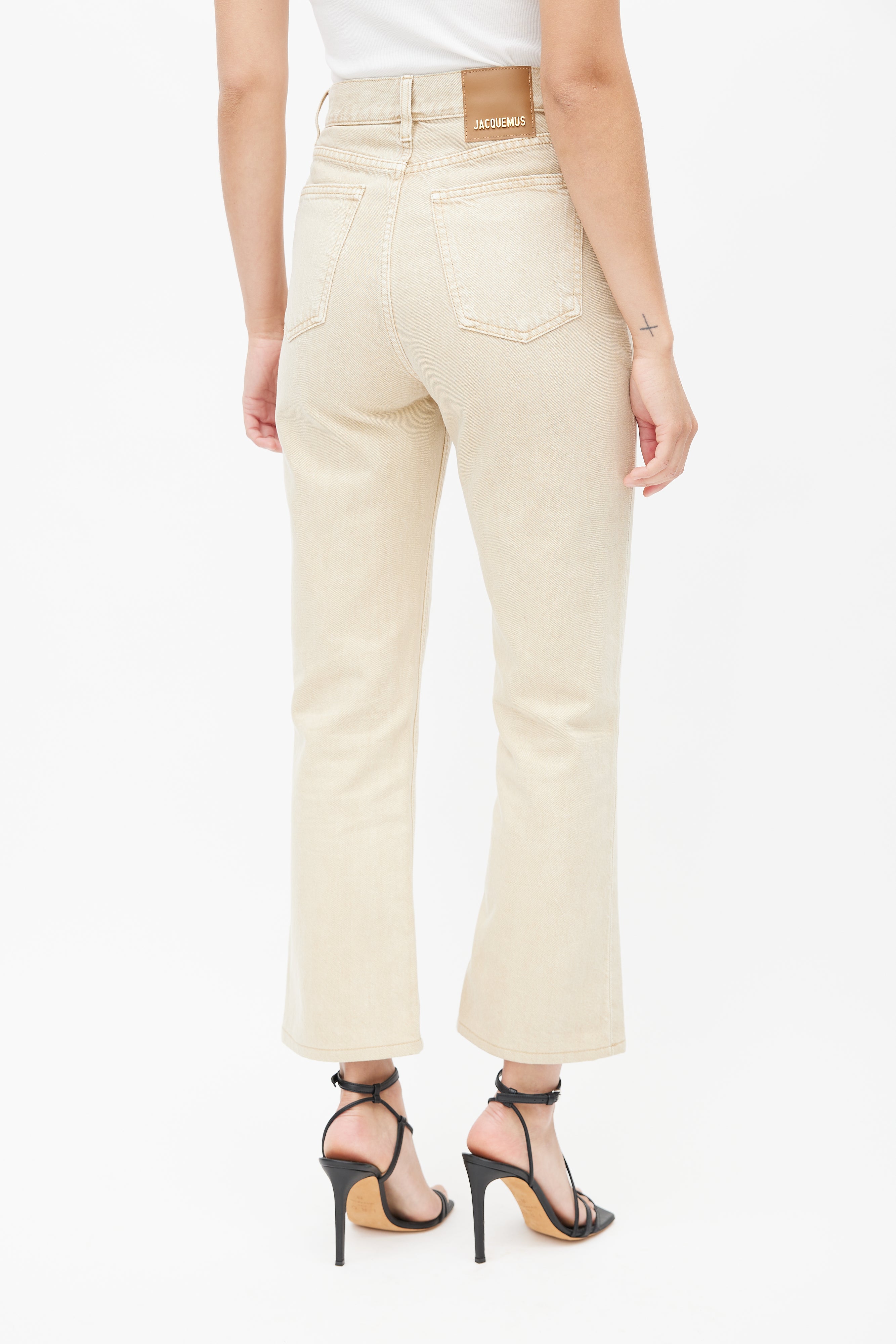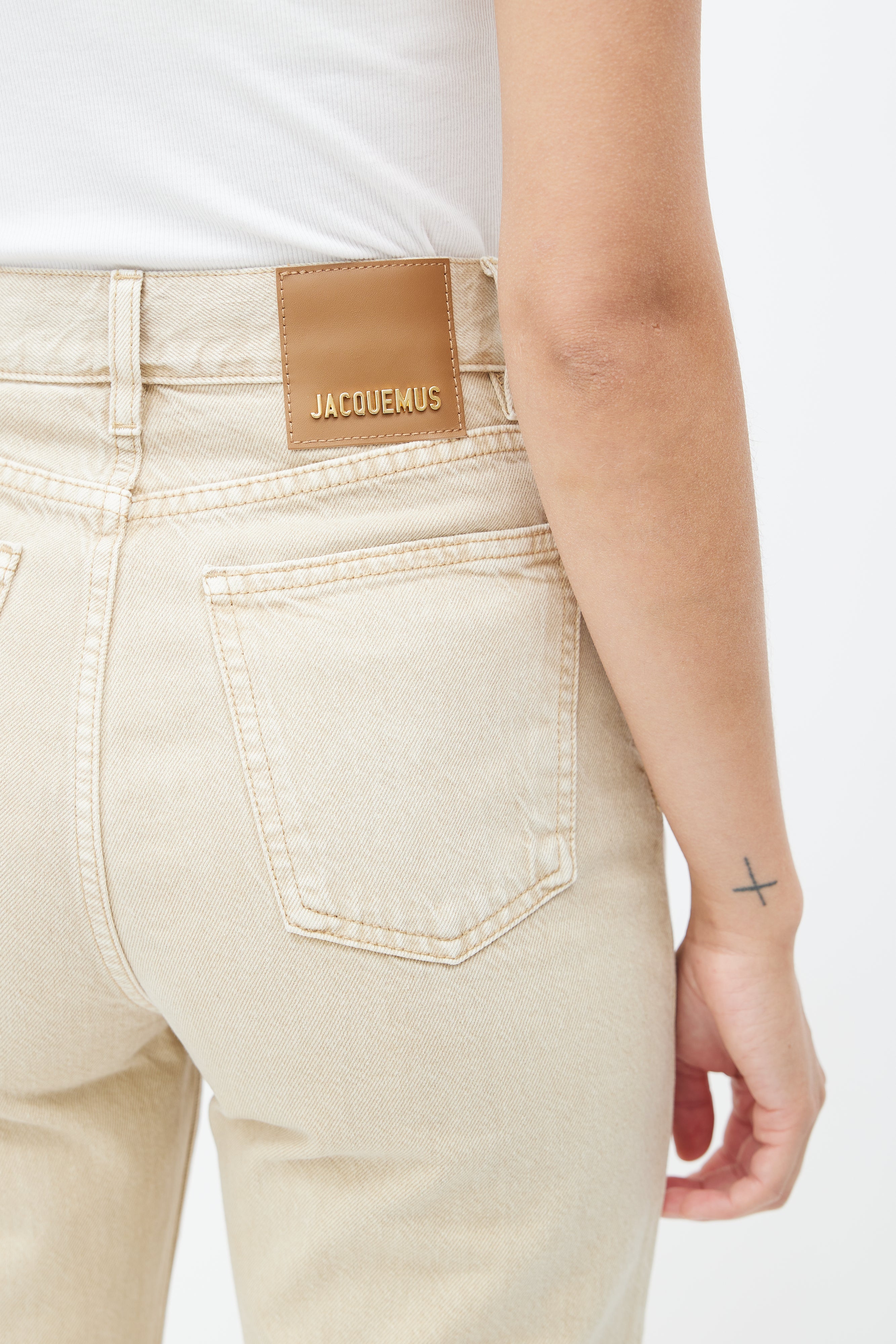 Pre-owned Jacquemus beige stonewash denim jeans featuring five pocket styling, slim leg, leather logo tab with gold tone logo hardware, and zip fly with button closure.