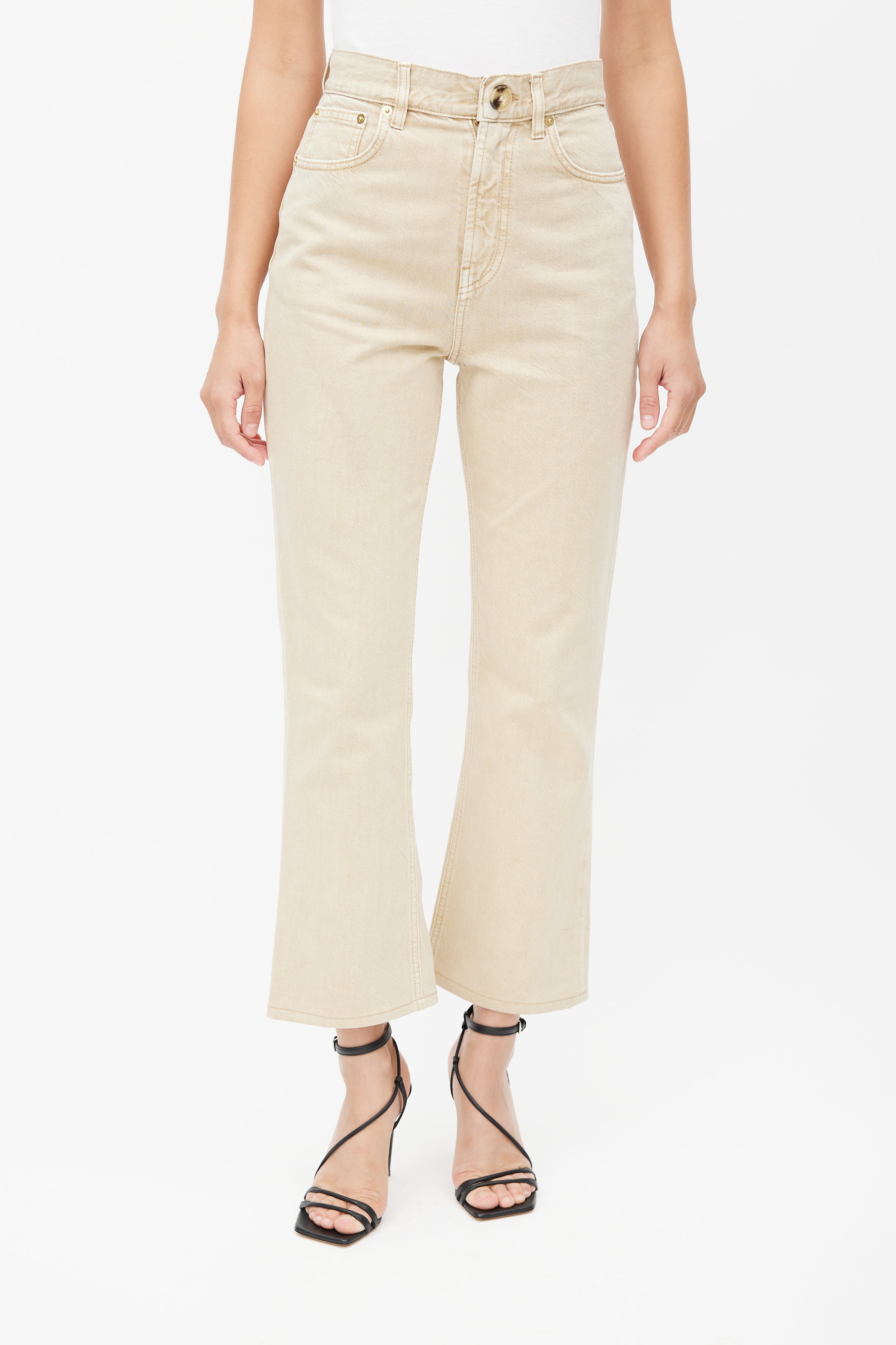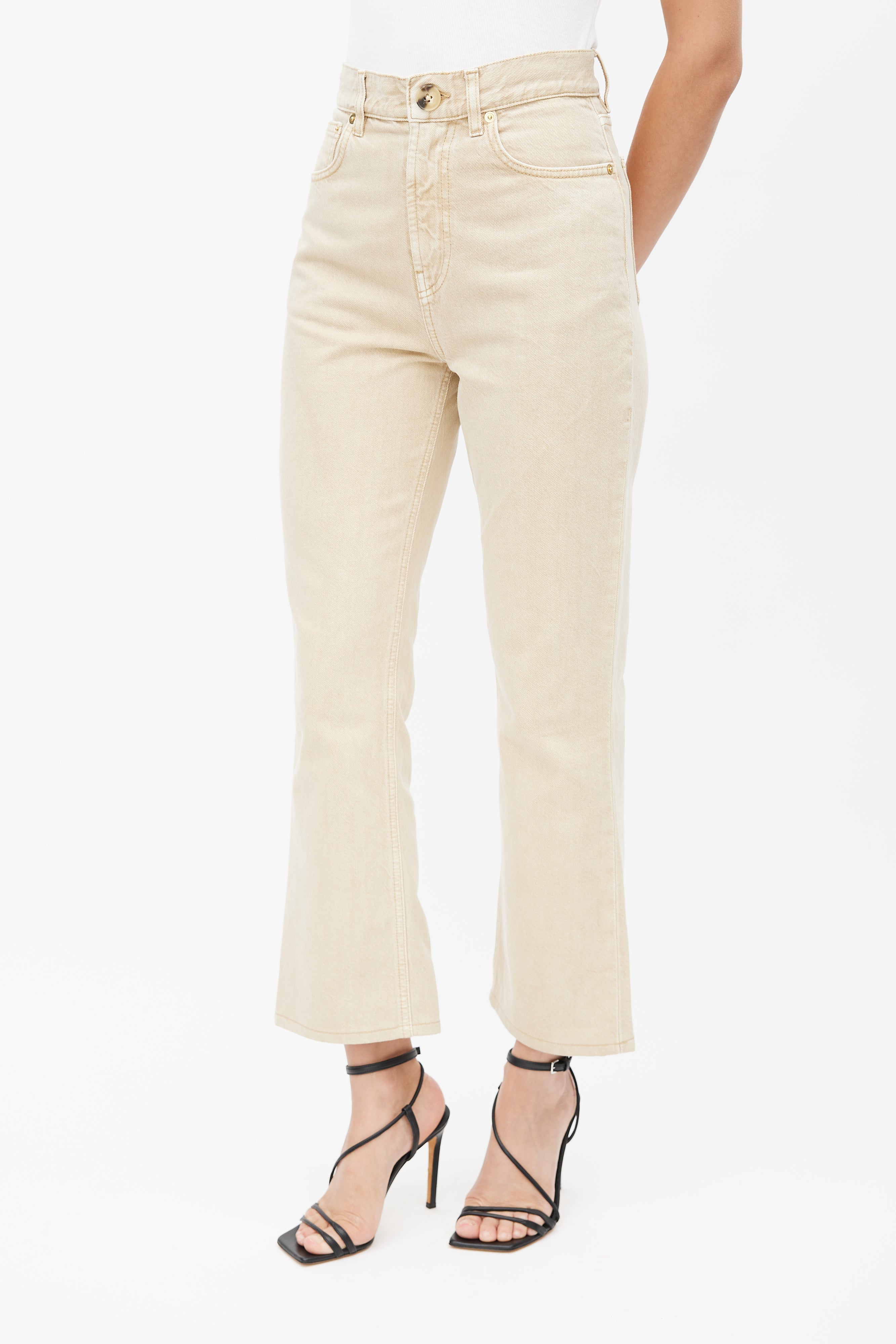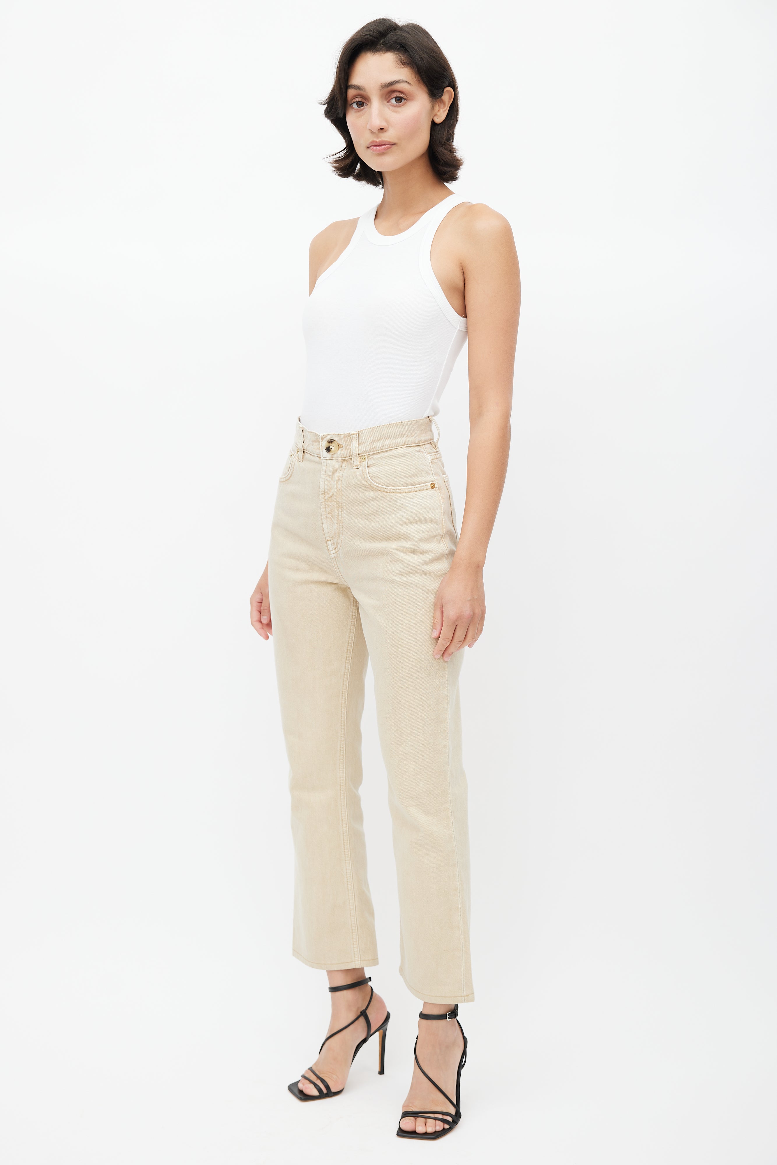 Pre-owned Jacquemus beige stonewash denim jeans featuring five pocket styling, slim leg, leather logo tab with gold tone logo hardware, and zip fly with button closure.