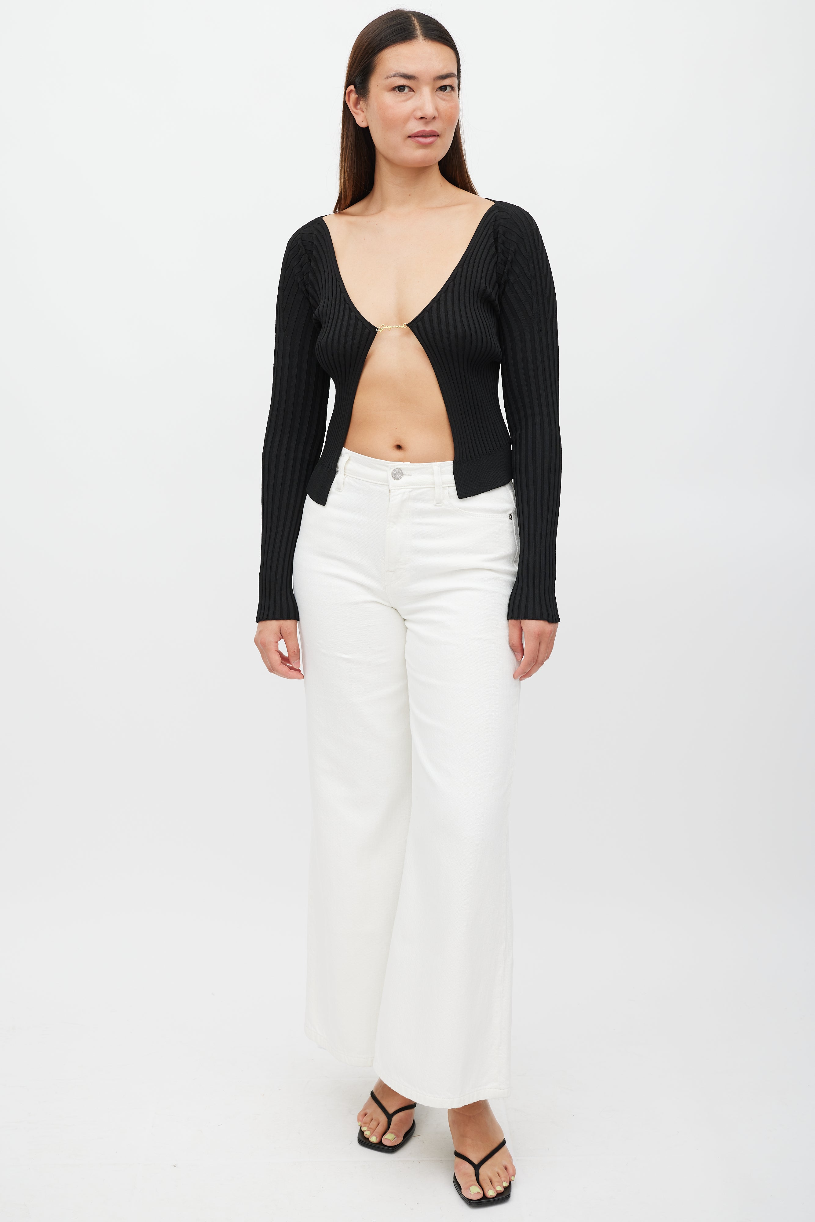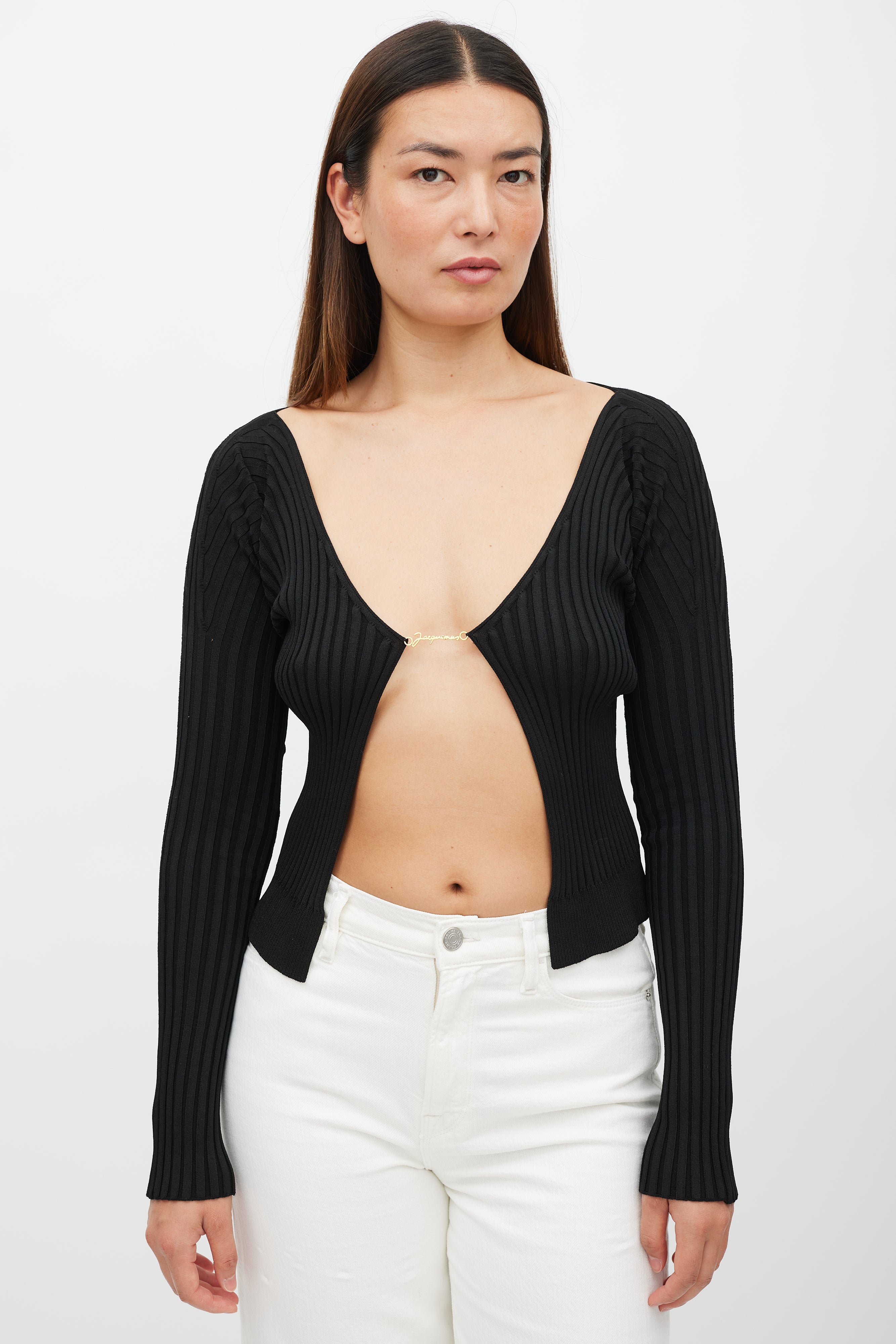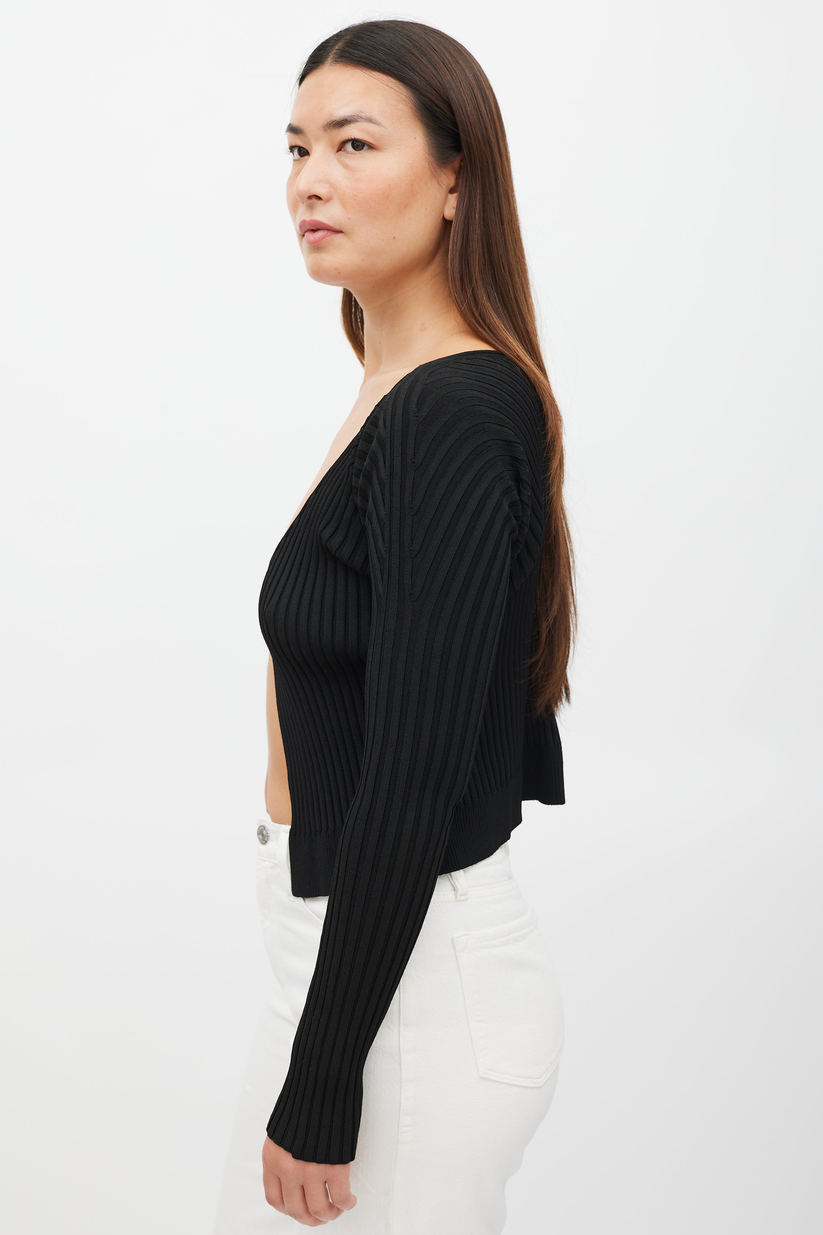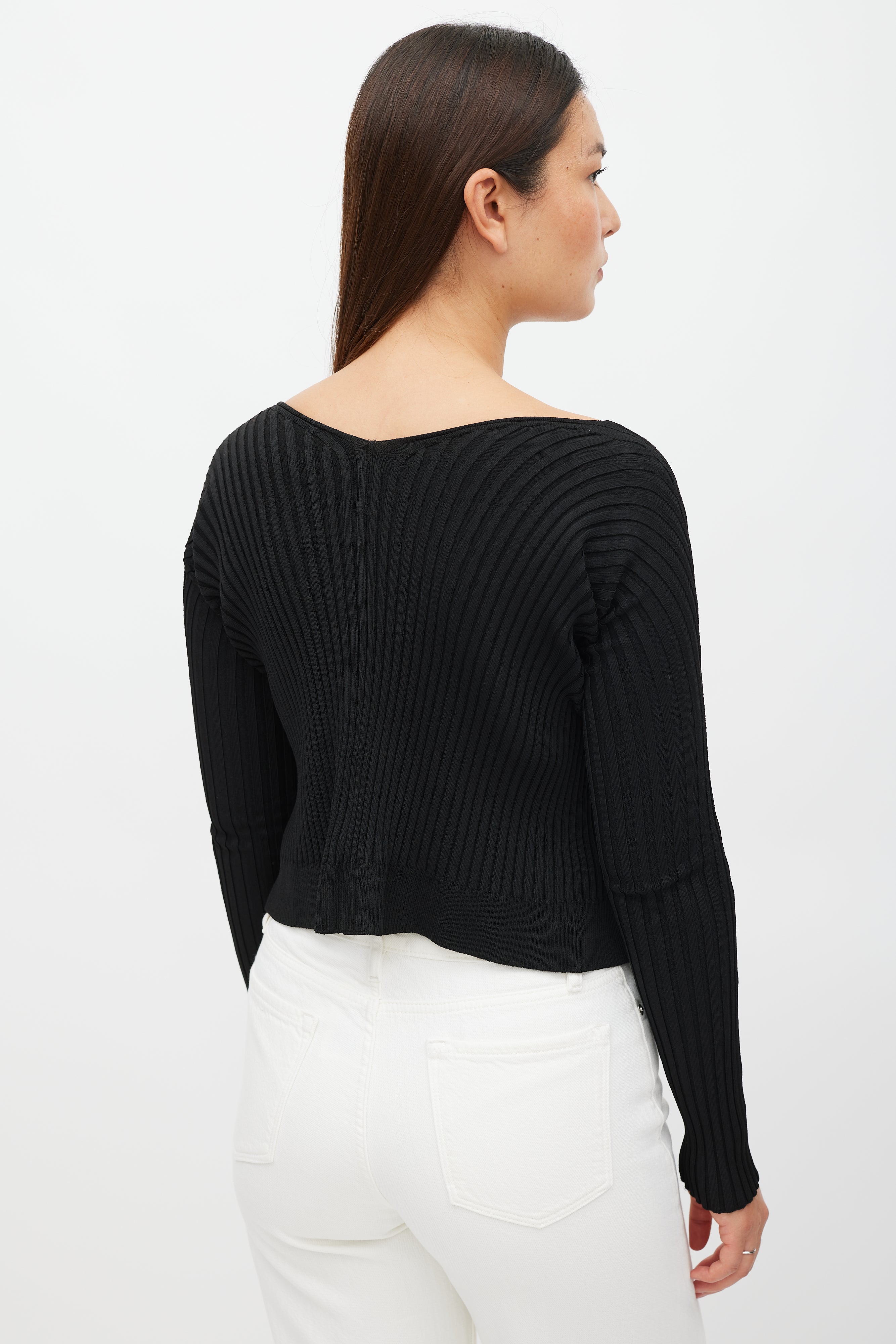 Pre-owned Jacquemus black top featuring a bateau neckline, long sleeves, ribbed detailing, and cut out at back with gold tone logo hardware.