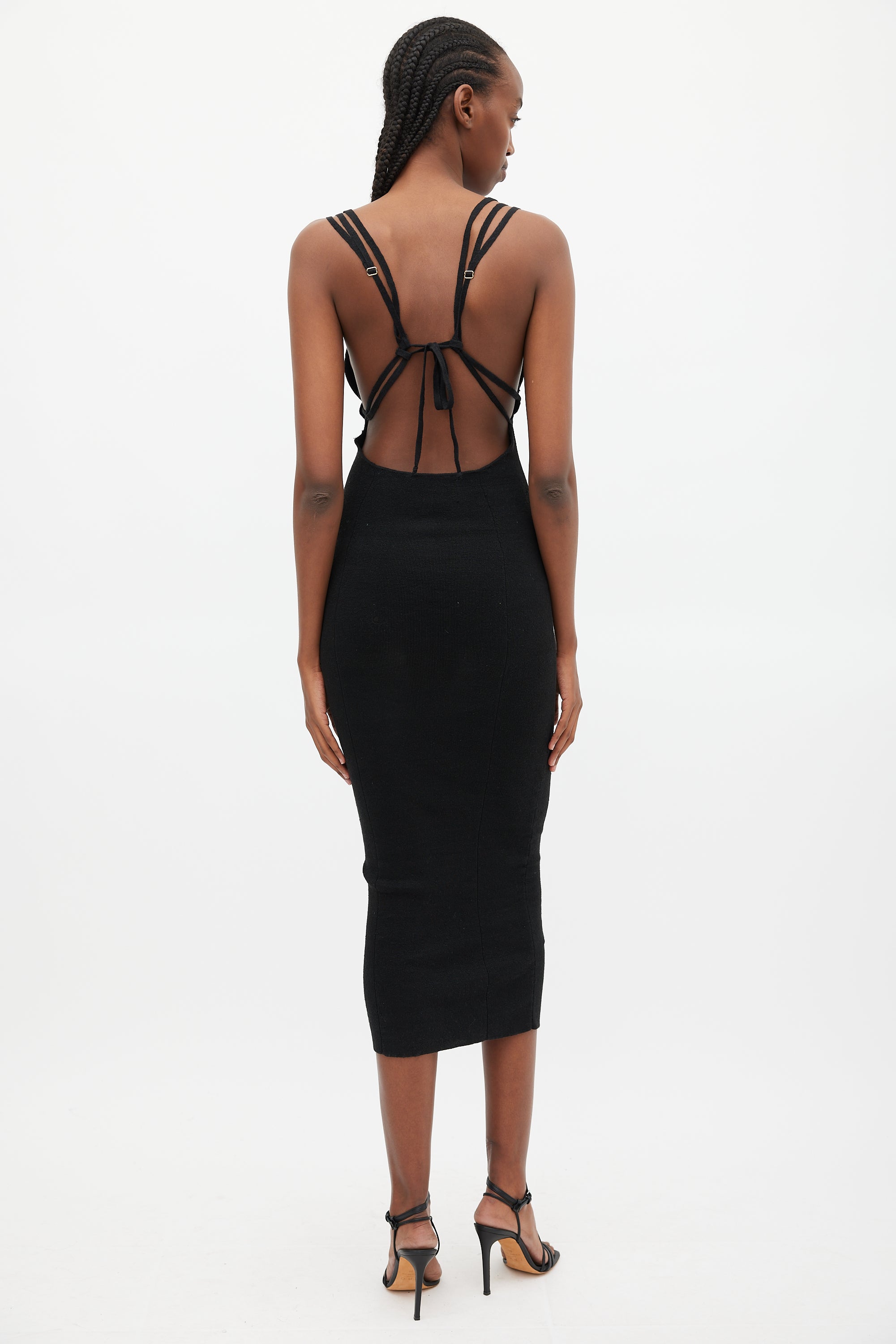 Pre-owned Jacquemus La Robe Pila dress featuring adjustable shoulder straps, layered bustier, cutout at front, and strappy back.