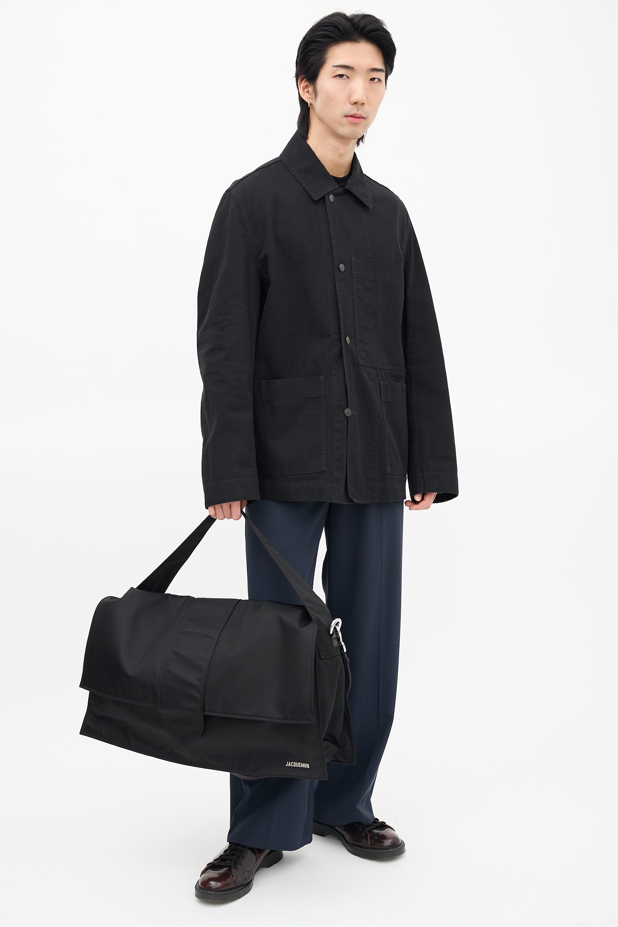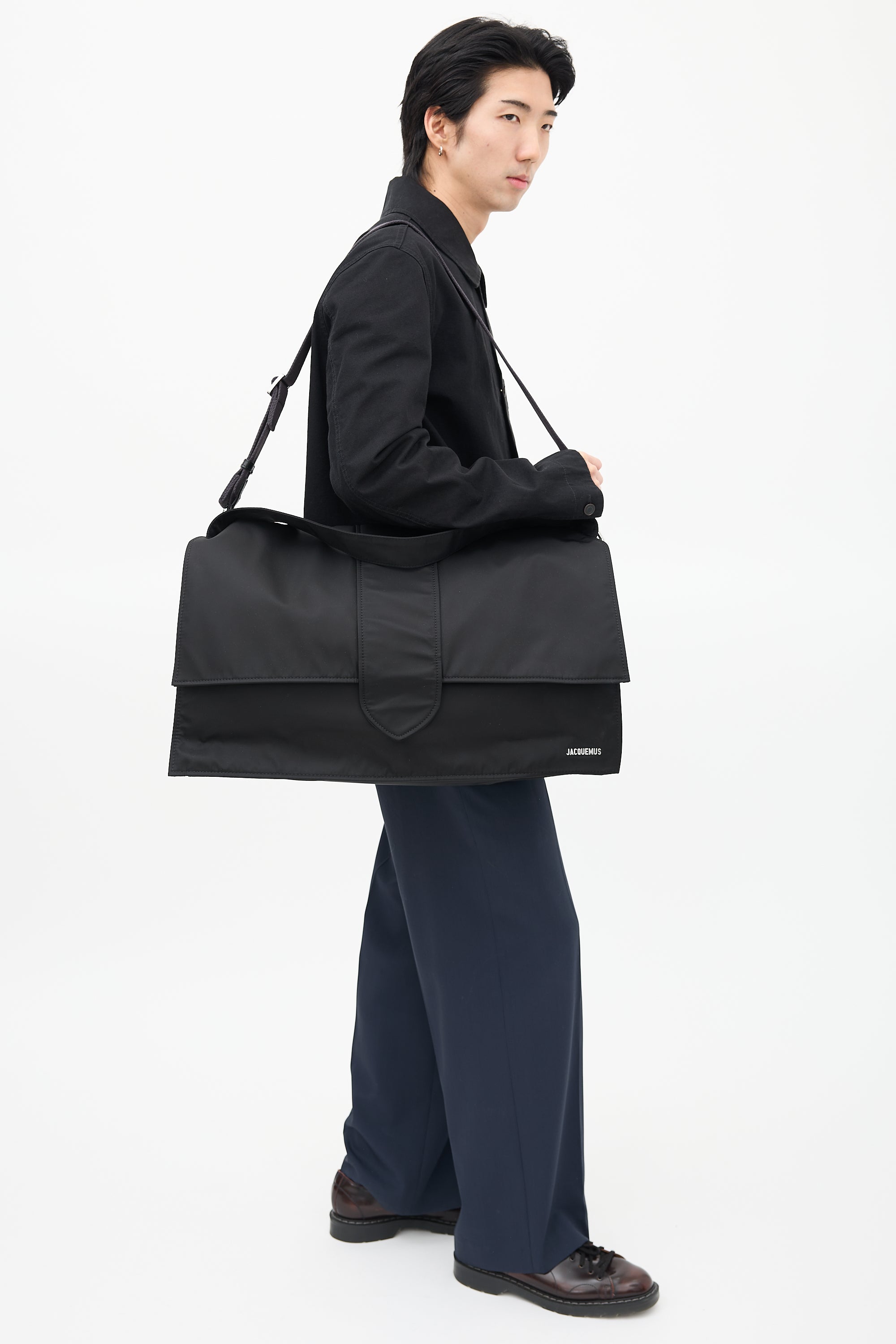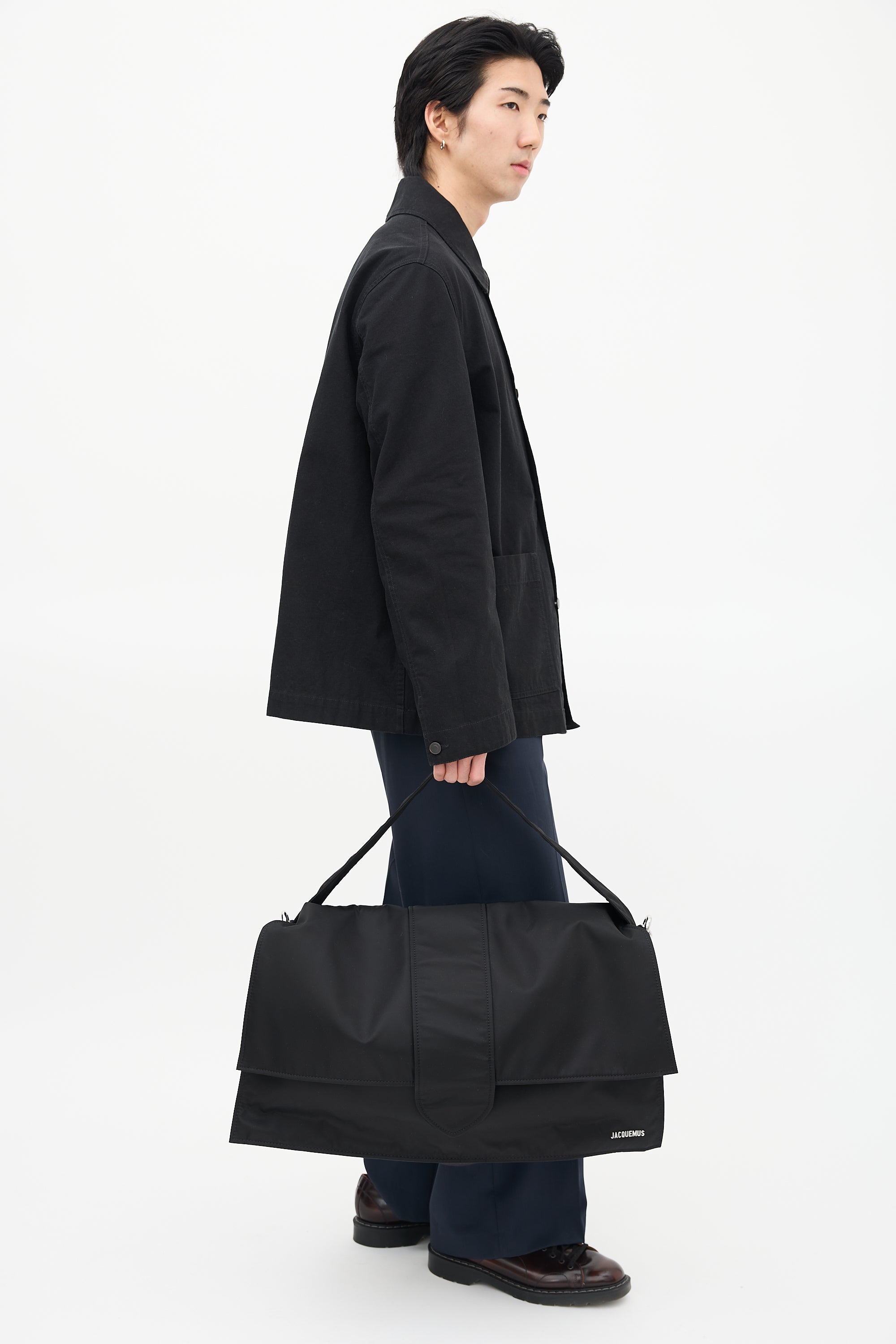 Pre-owned Jacquemus black nylon Le Bambino Voyage bag featuring silver tone hardware, flat top handle, detachable and adjustable shoulder strap, front flap with magnetic closure, logo hardware at front, rone lined main compartment with top zip closure and one zip pocket, and back slip pocket. Comes with original dust bag.