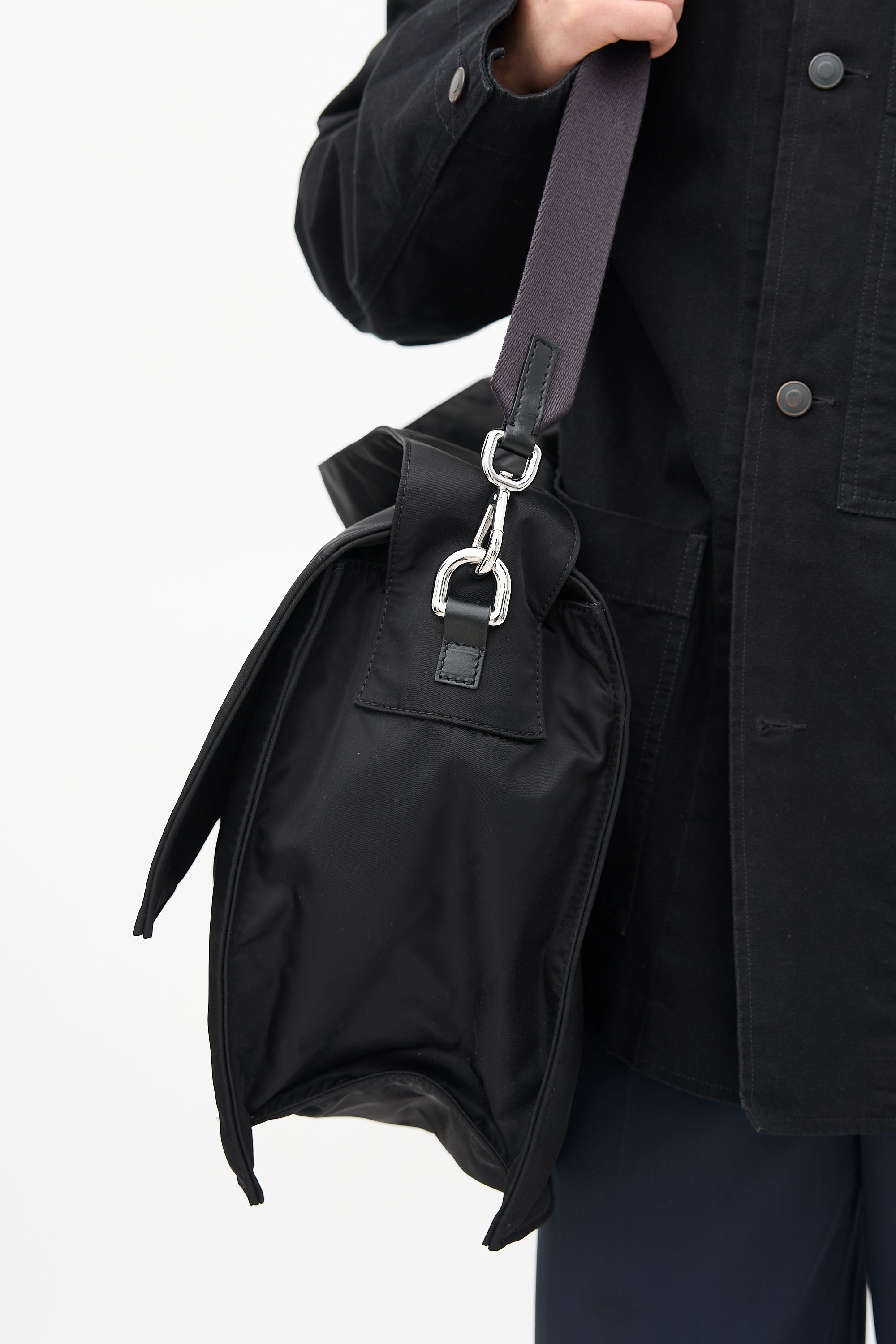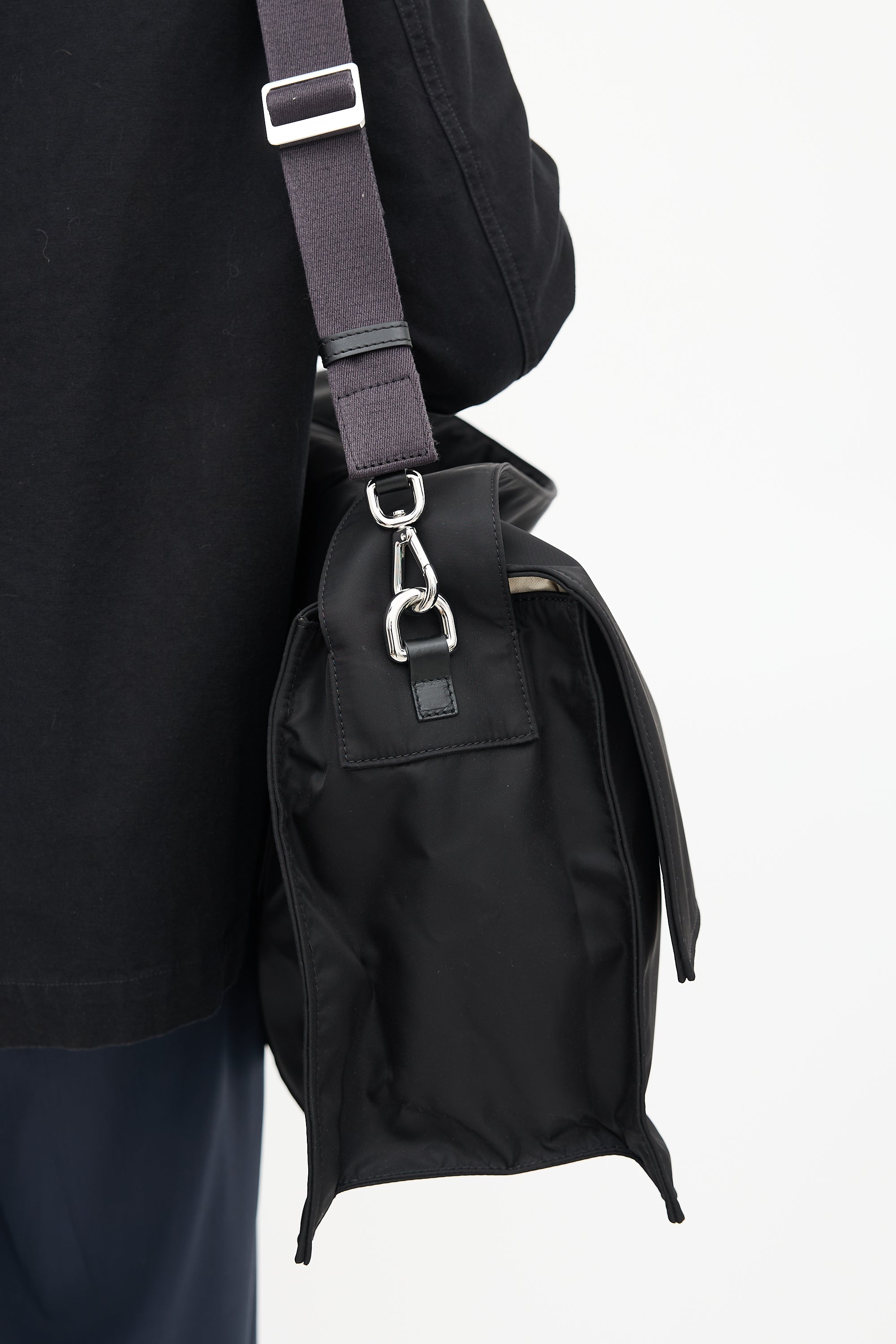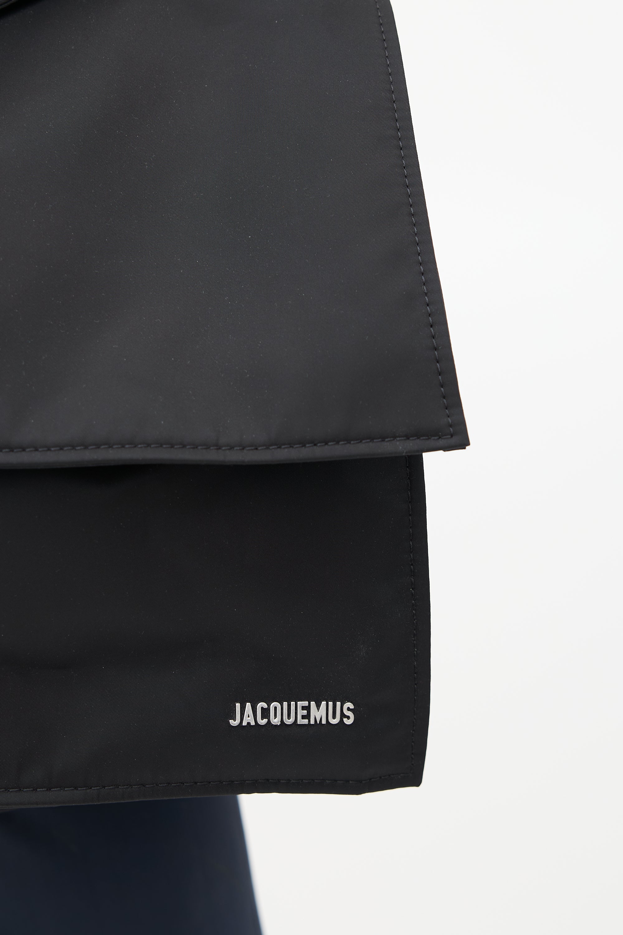 Pre-owned Jacquemus black nylon Le Bambino Voyage bag featuring silver tone hardware, flat top handle, detachable and adjustable shoulder strap, front flap with magnetic closure, logo hardware at front, rone lined main compartment with top zip closure and one zip pocket, and back slip pocket. Comes with original dust bag.