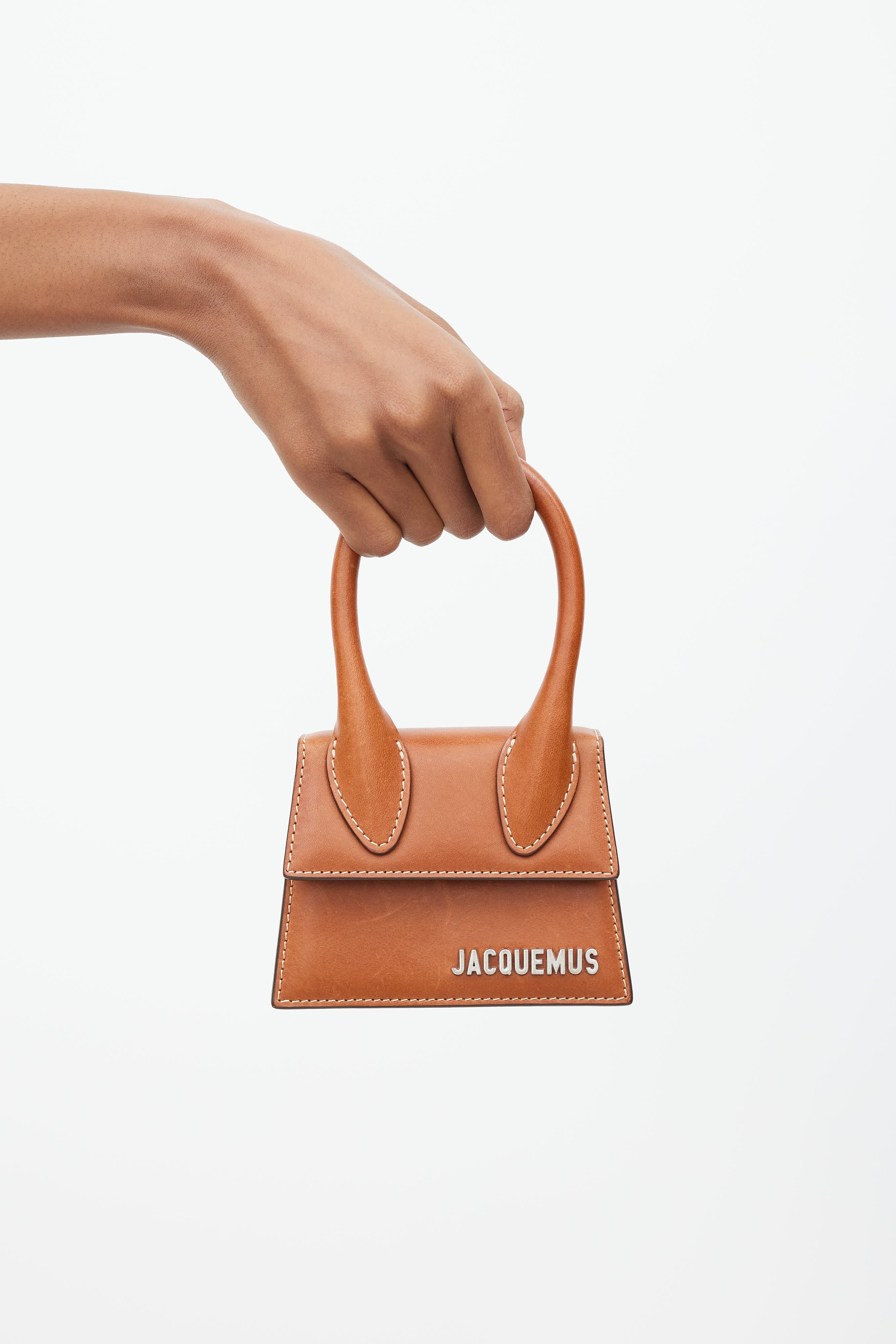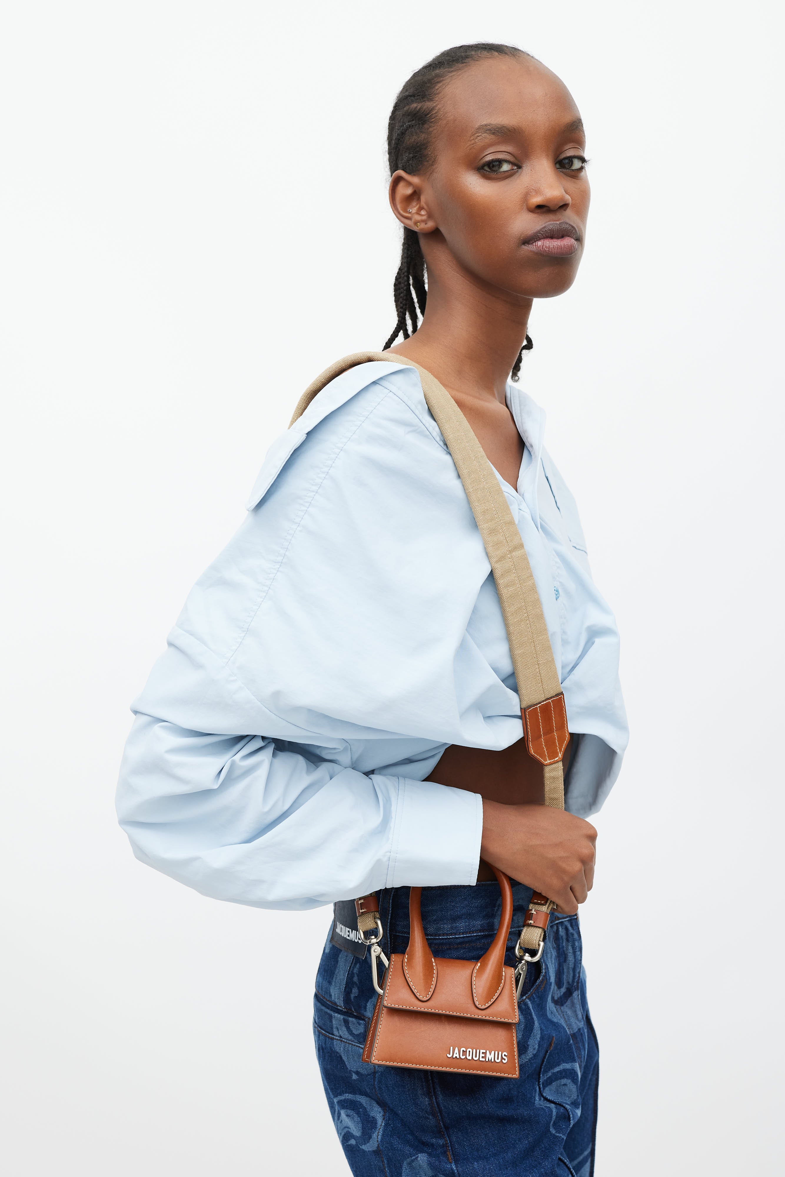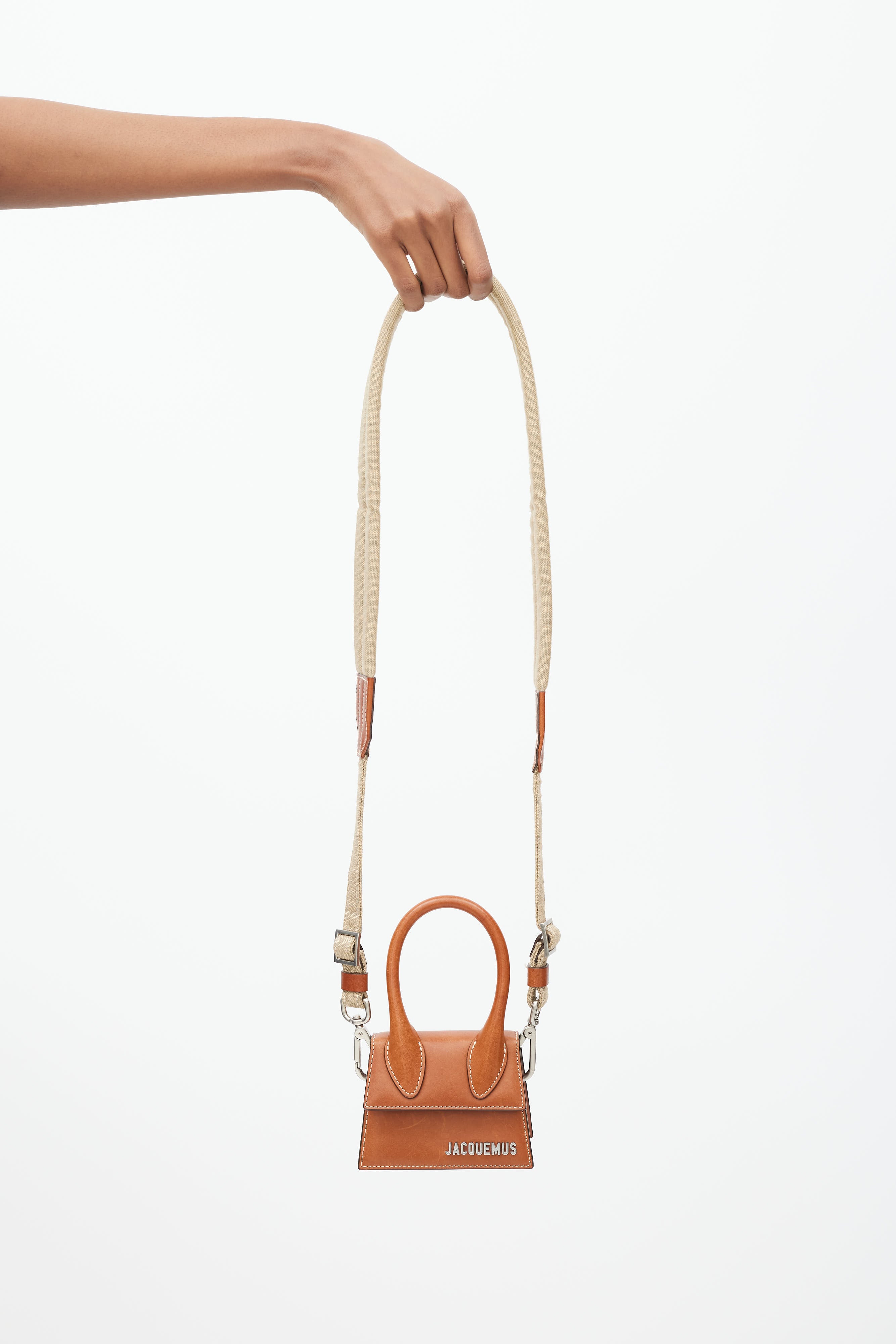 Pre-owned Jacqeumus Mini Le Chiquito bag featuring brown leather body, rolled top handle, silver tone logo hardware at front face, magnetic button closure, one lined main compartment with debossed leather logo tab, and detachable wide beige canvas shoulder strap.