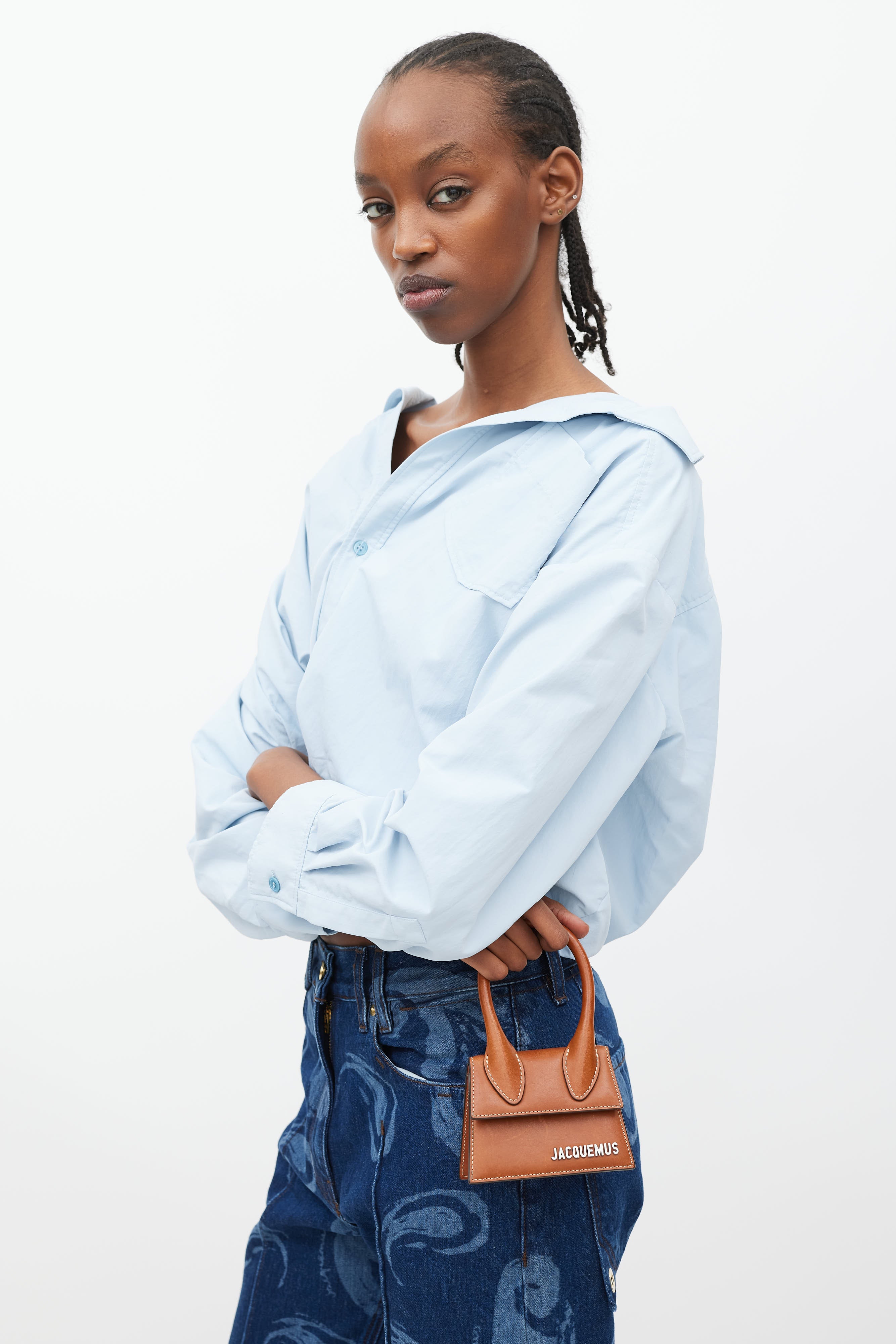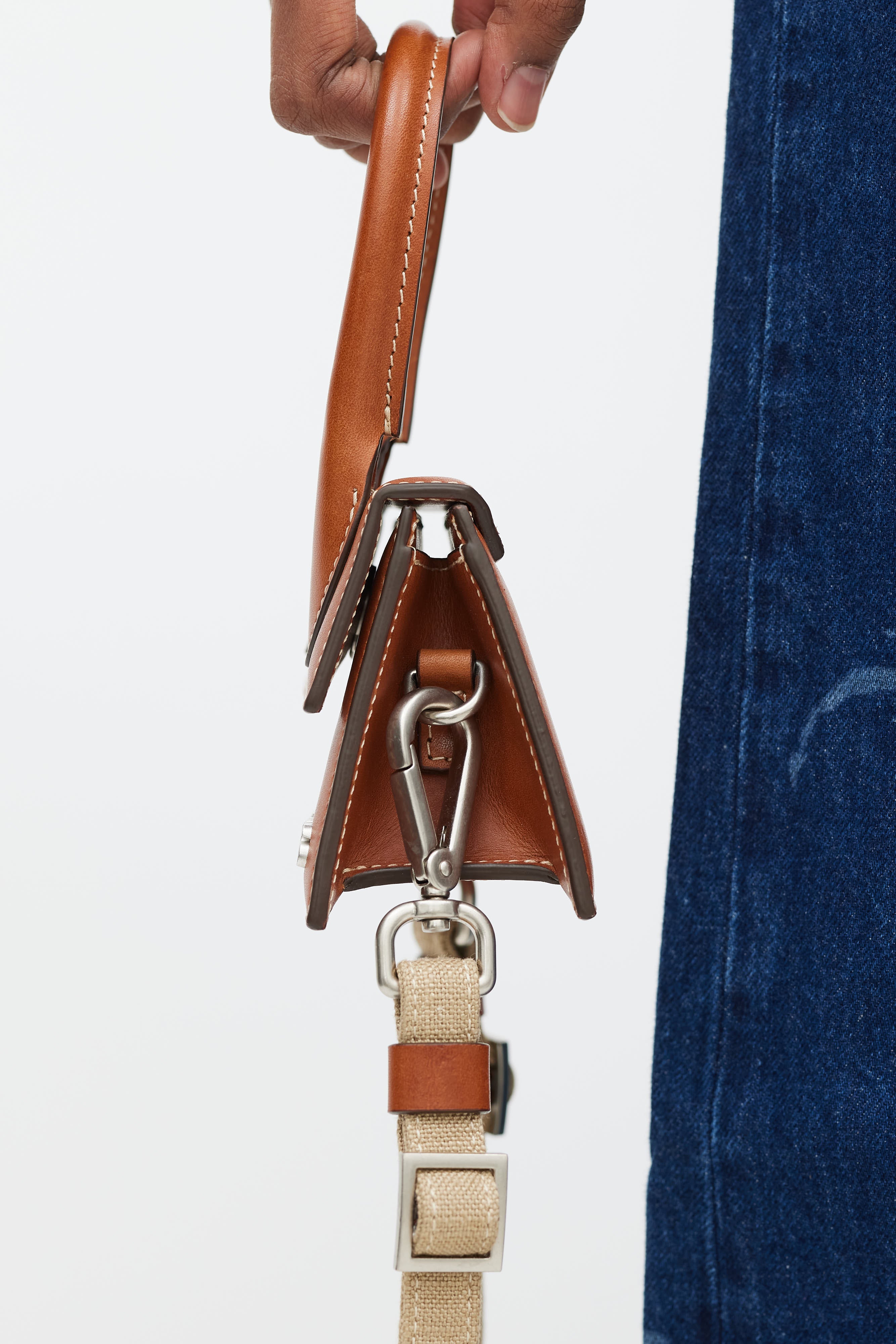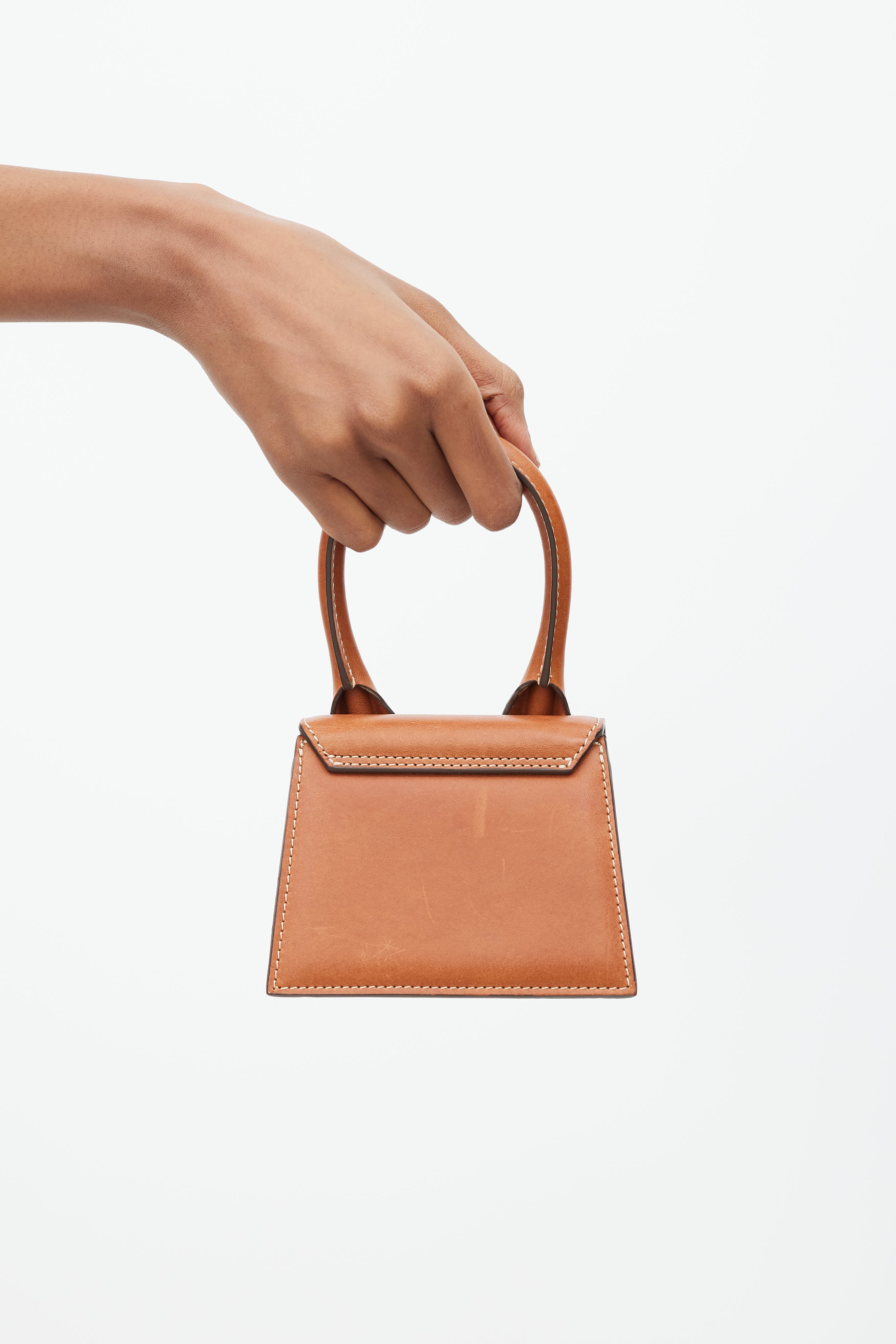 Pre-owned Jacqeumus Mini Le Chiquito bag featuring brown leather body, rolled top handle, silver tone logo hardware at front face, magnetic button closure, one lined main compartment with debossed leather logo tab, and detachable wide beige canvas shoulder strap.