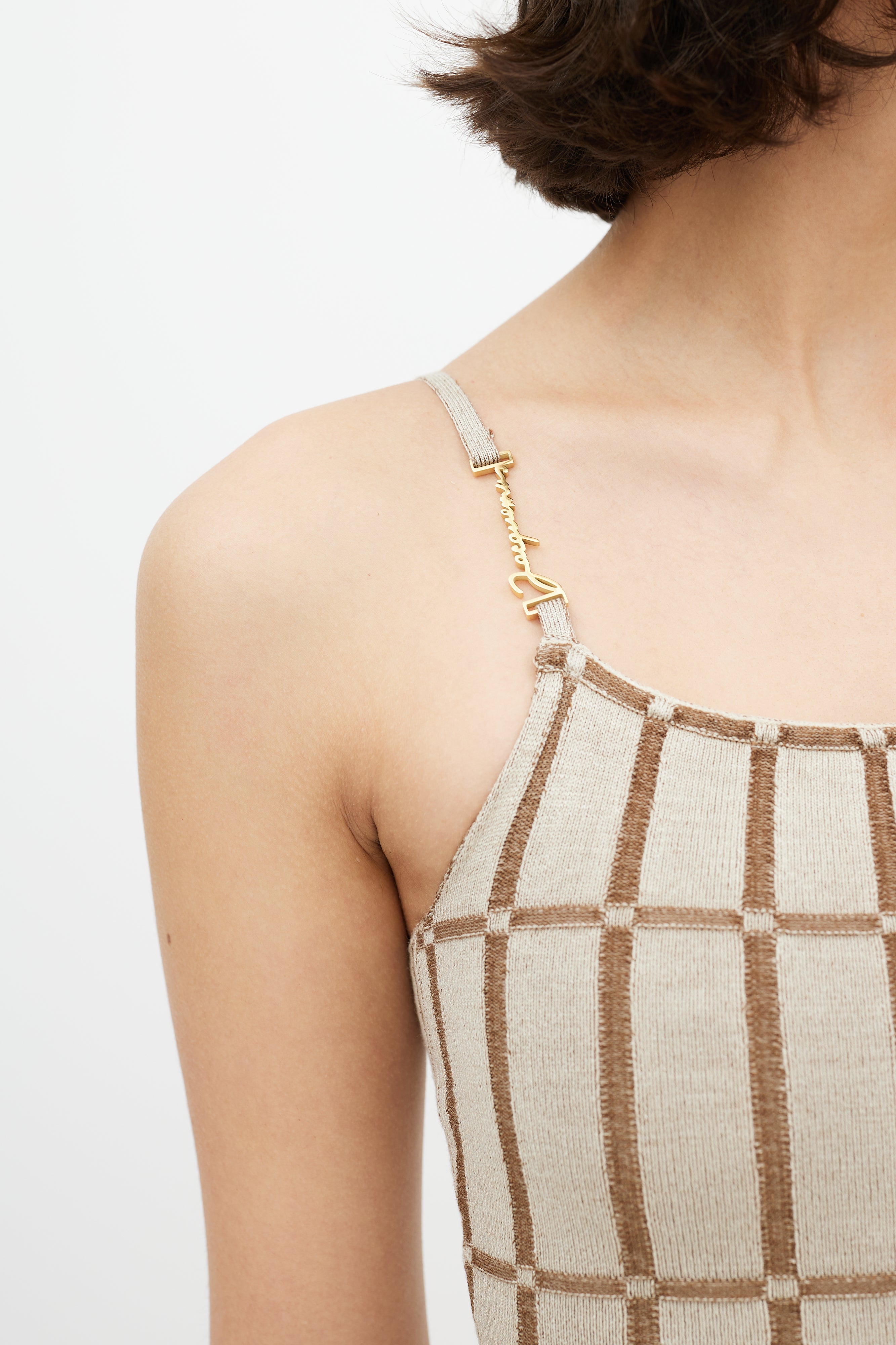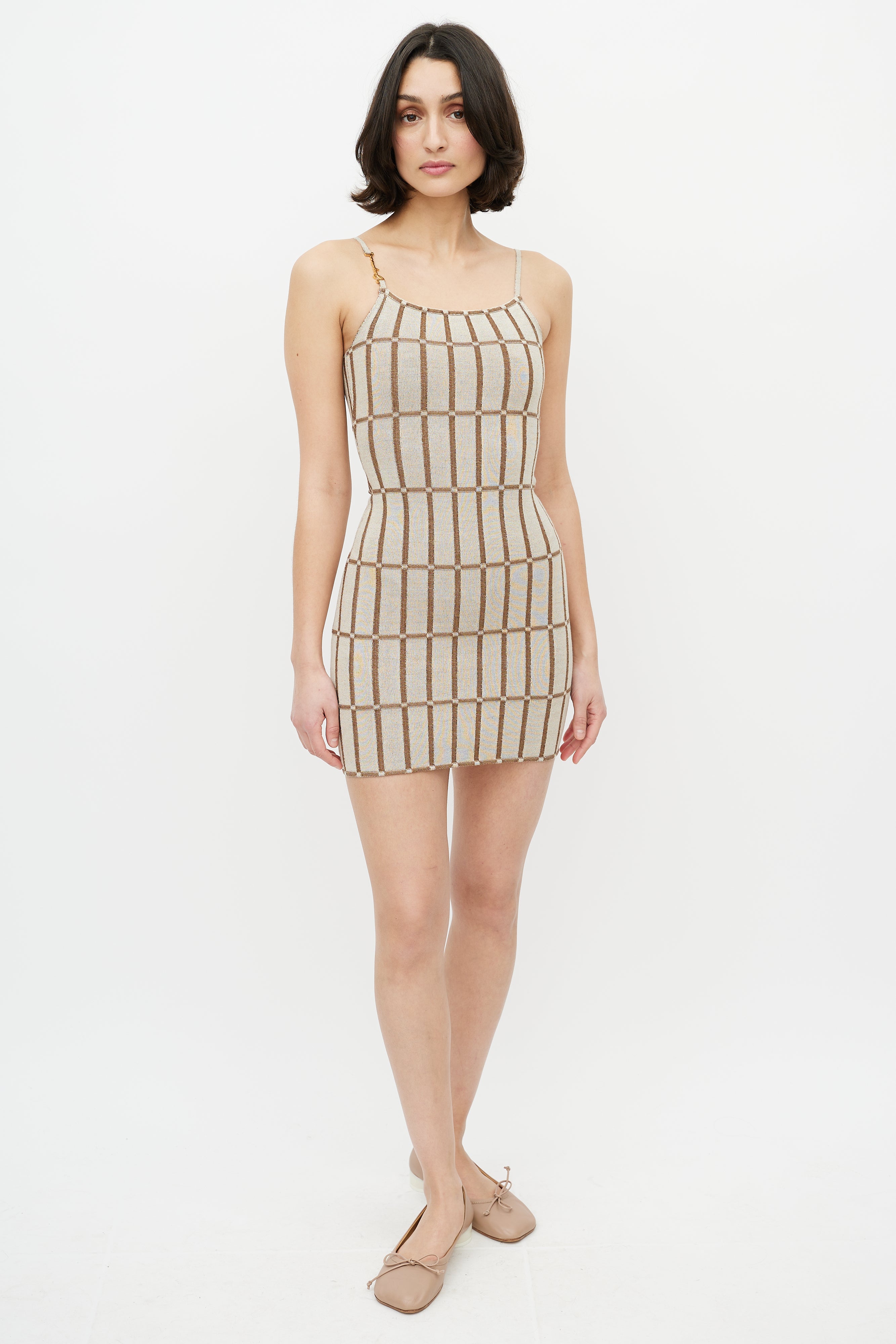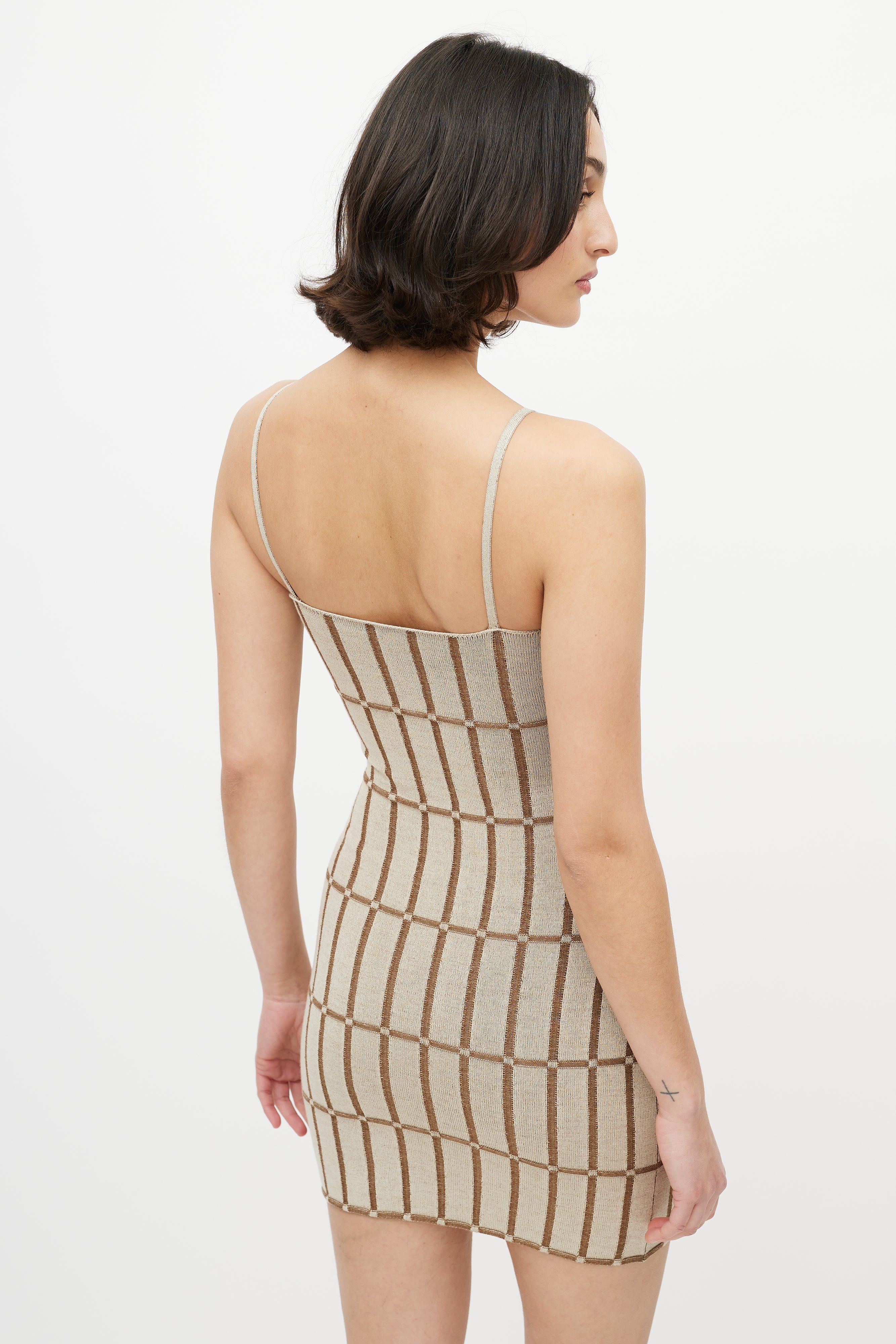Pre-owned Jacquemus brown La Robe Maille Malha dress featuring ribbed checkered knit, spaghetti straps, gold tone logo at right strap, and square neckline. From the Le Raphia collection.