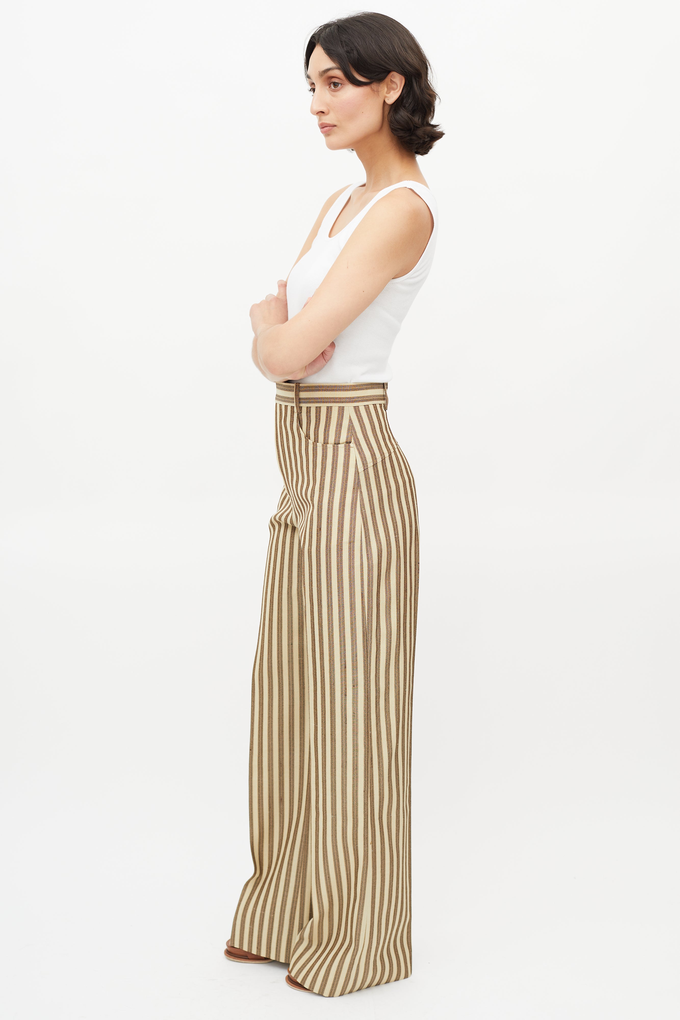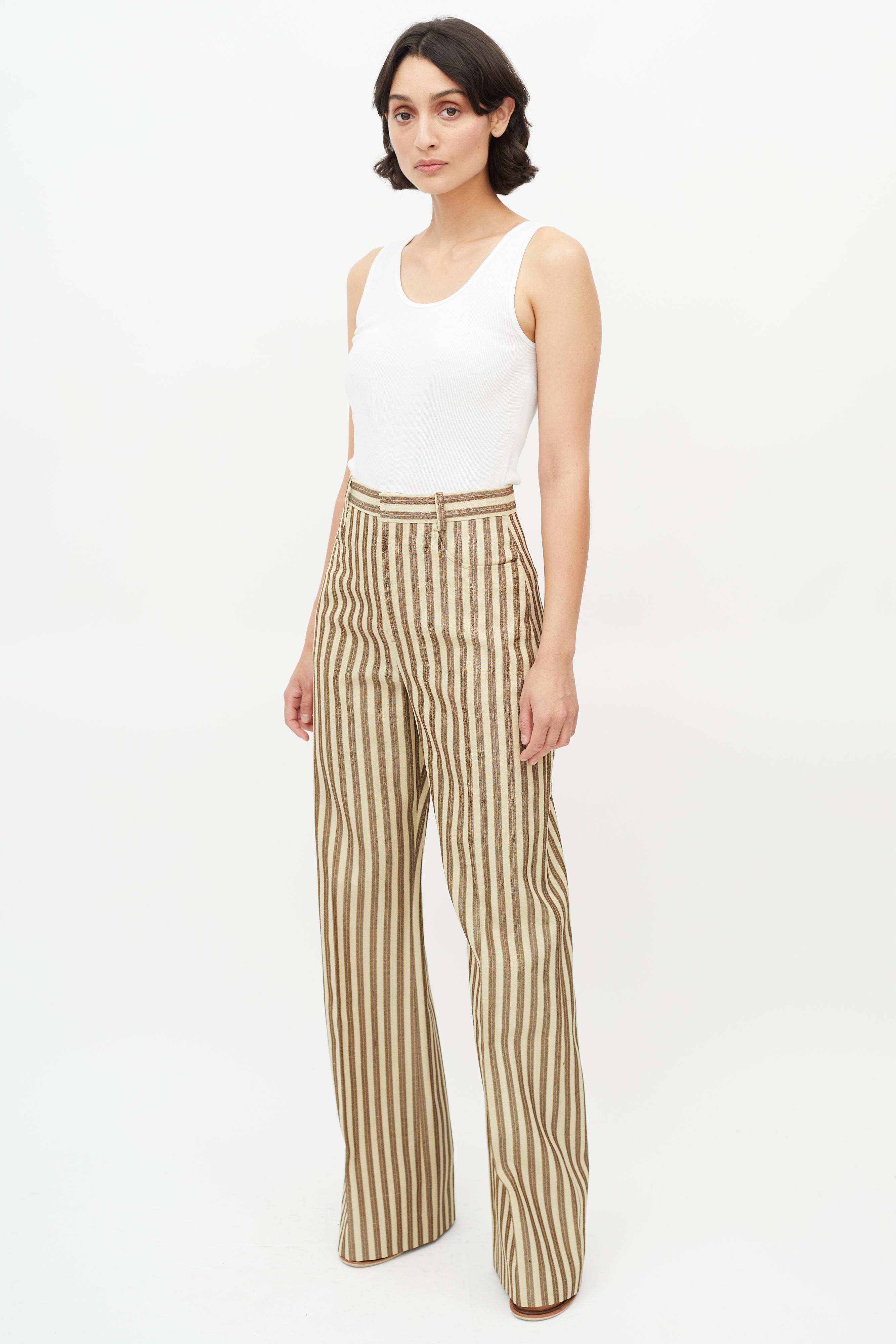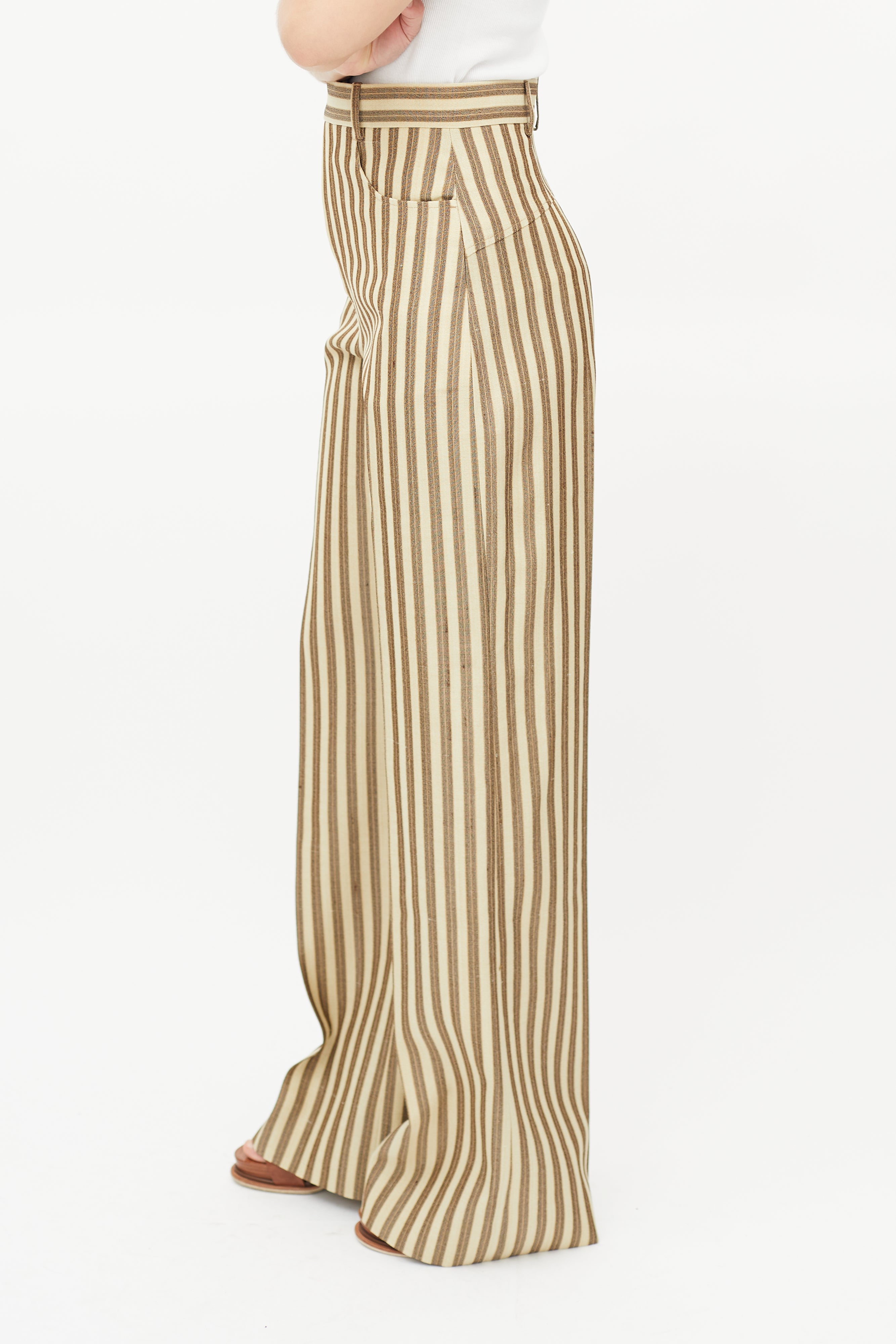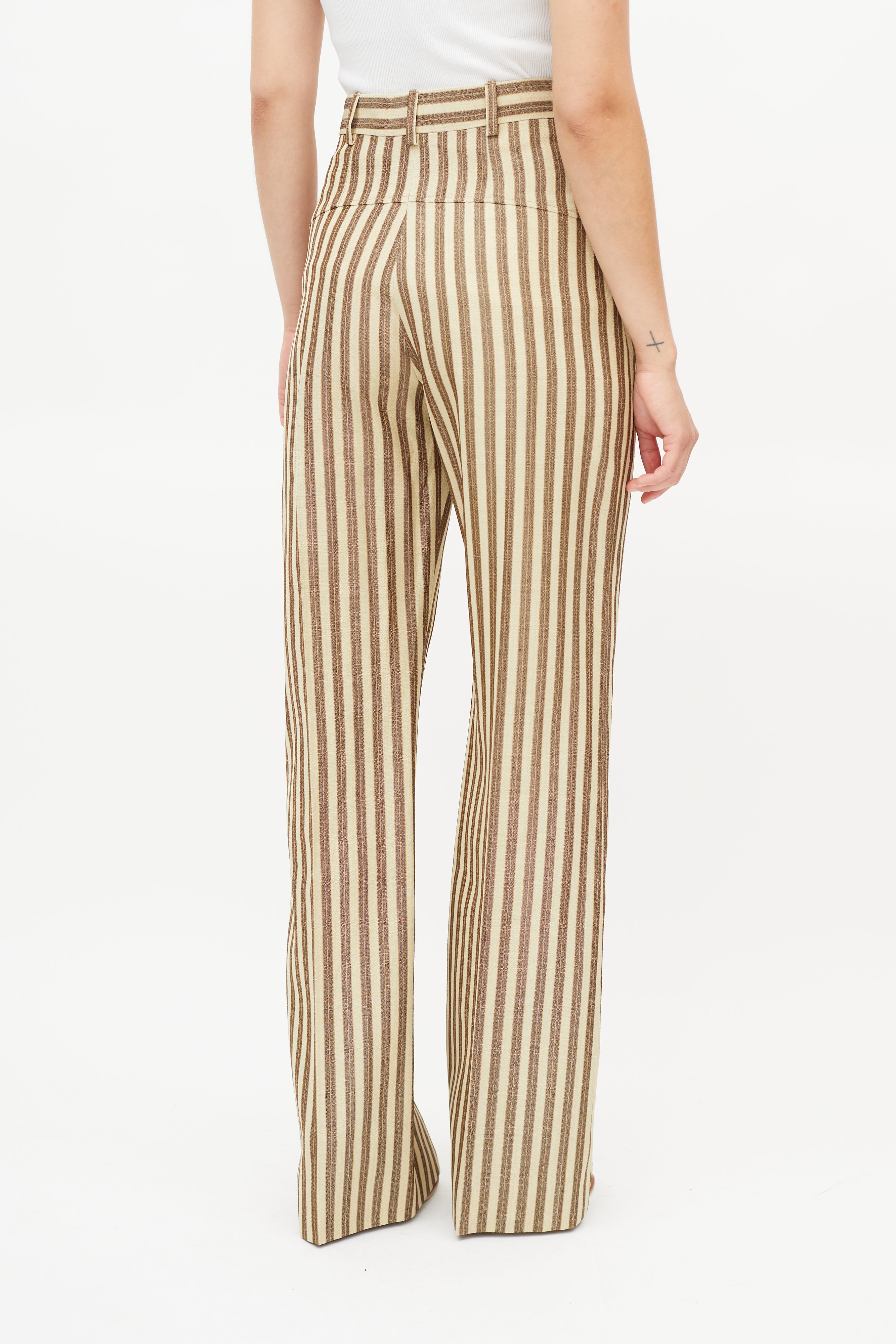 Pre-owned Jacquemus brown Le Papier trousers featuring belt loop, zip fly, stripes, and two pockets at hips.