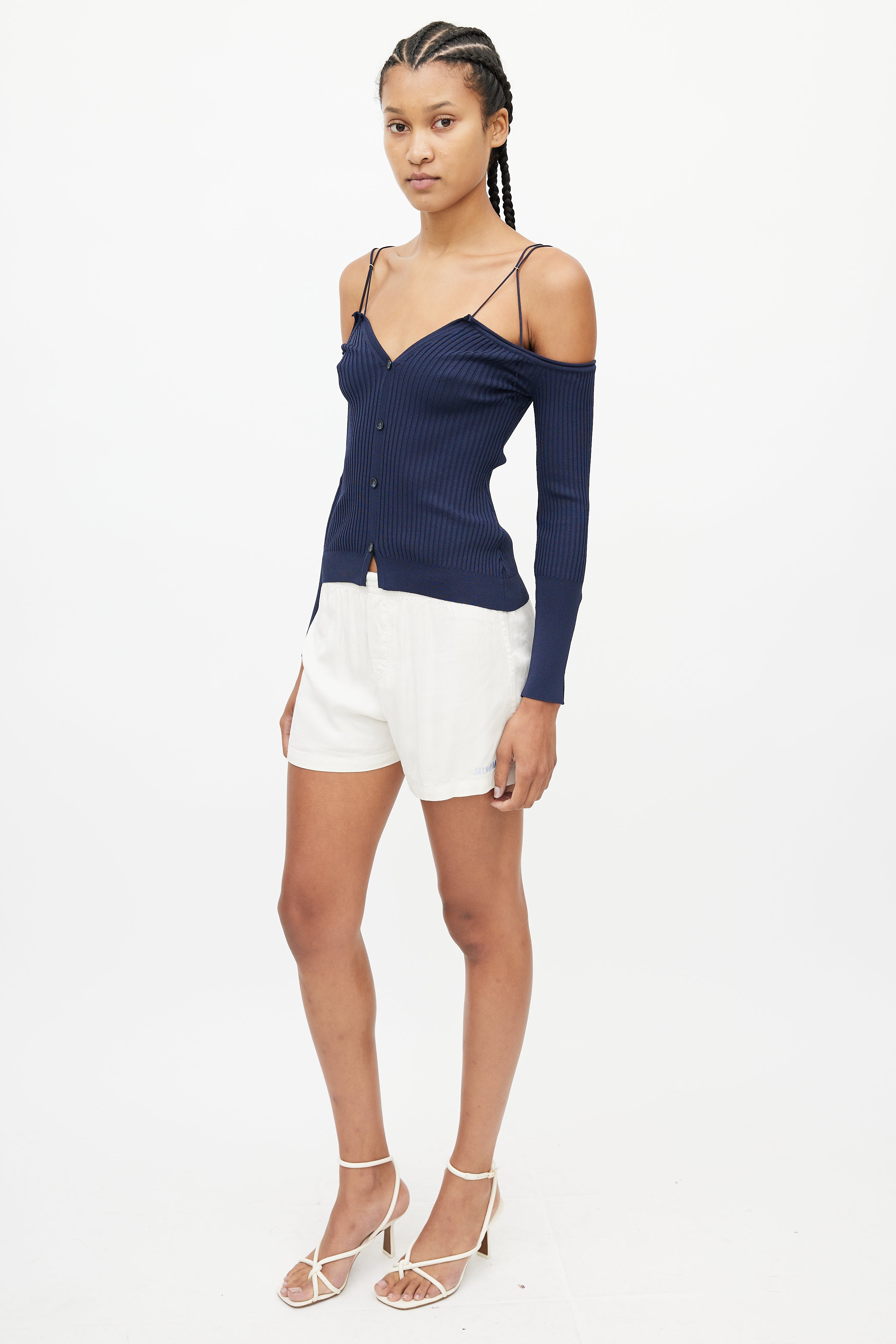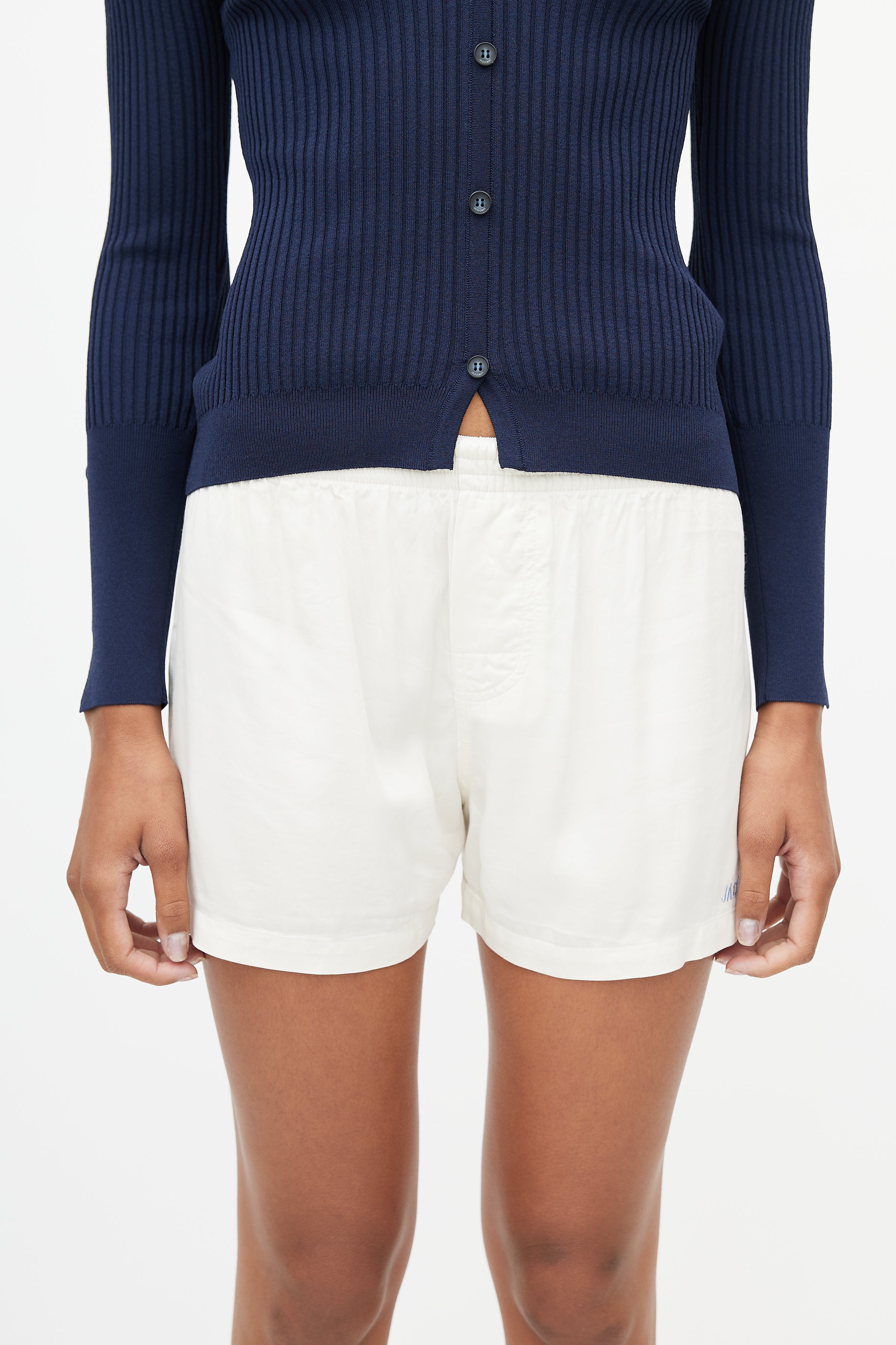 Pre-owned Jacquemus Le Calecon cream boxer shorts featuring an elasticized waist, blue logo at leg, elastic waistband and button fly.