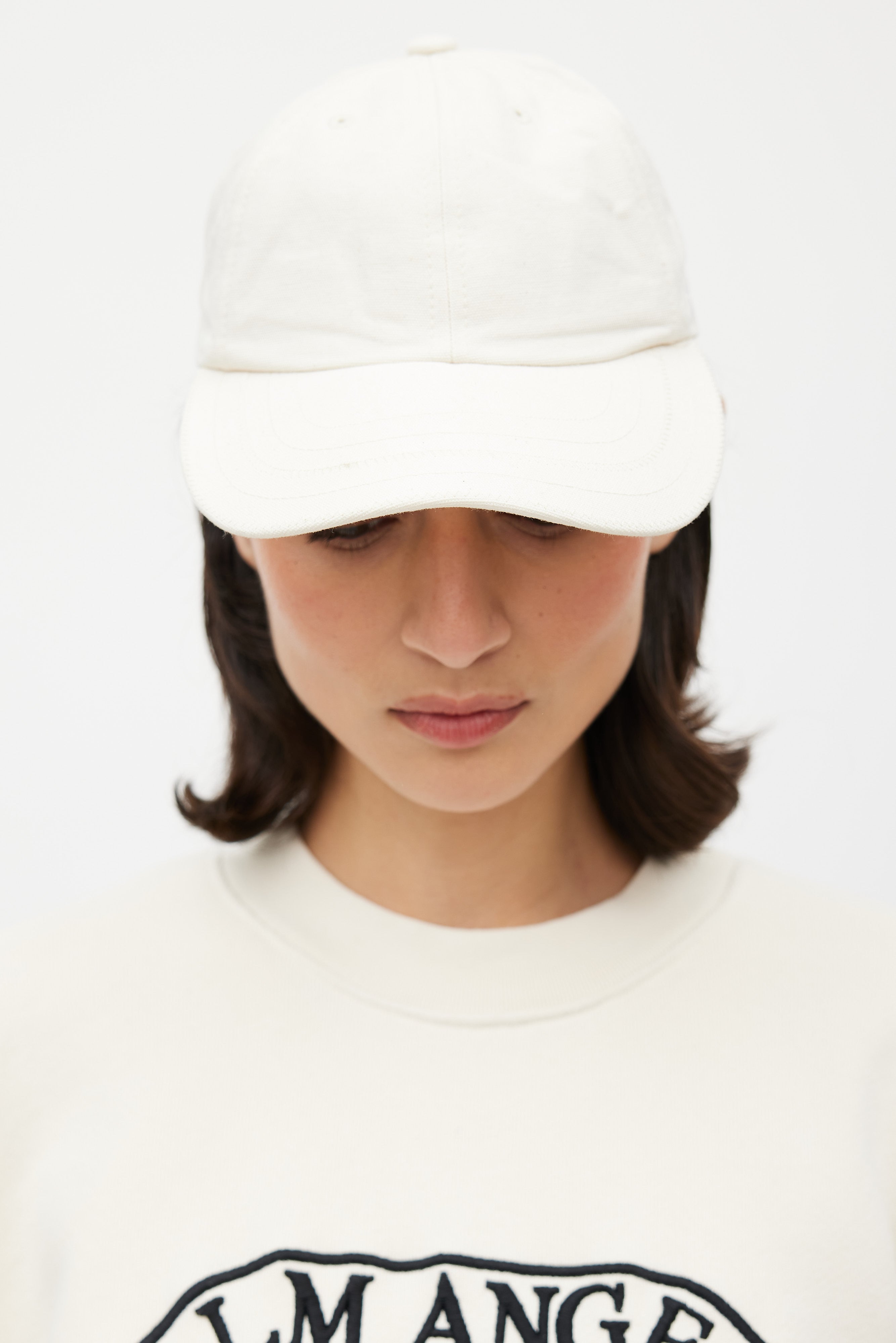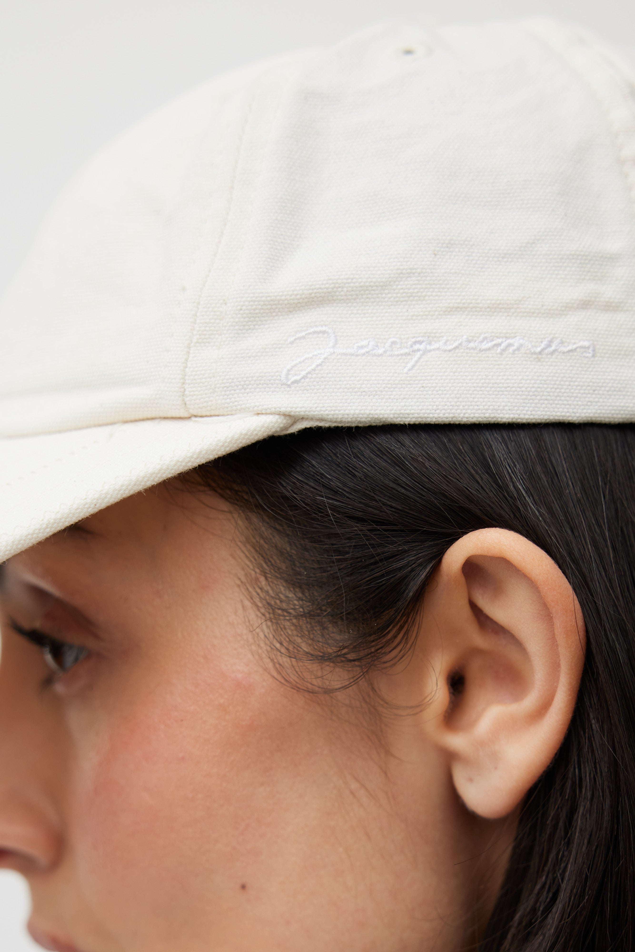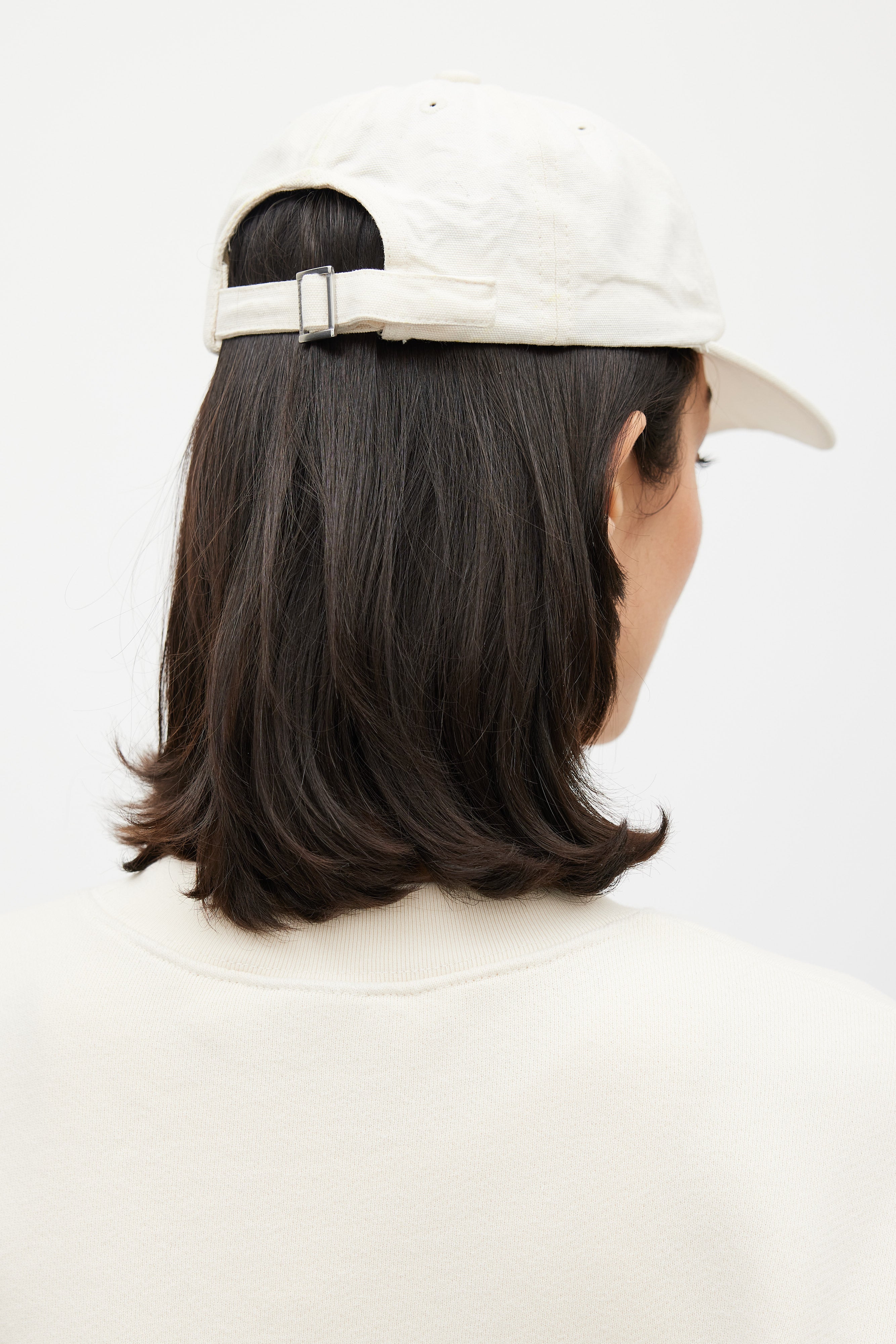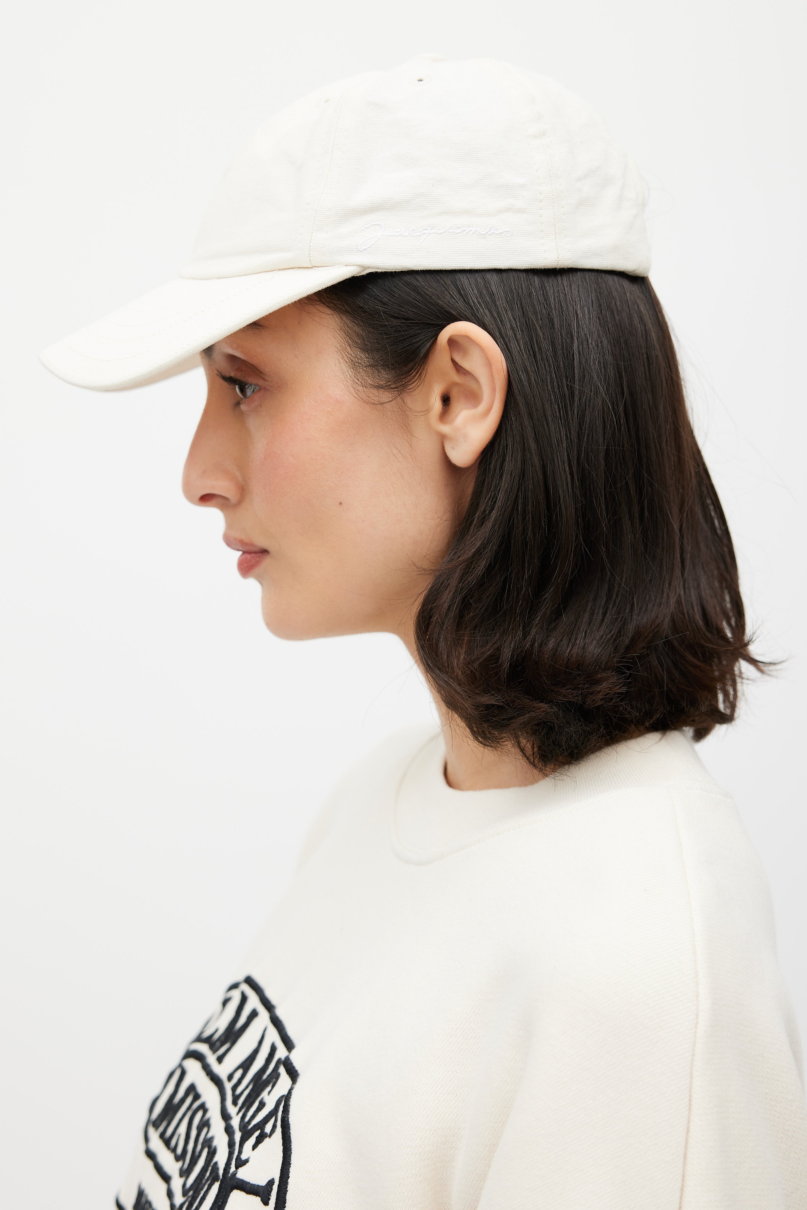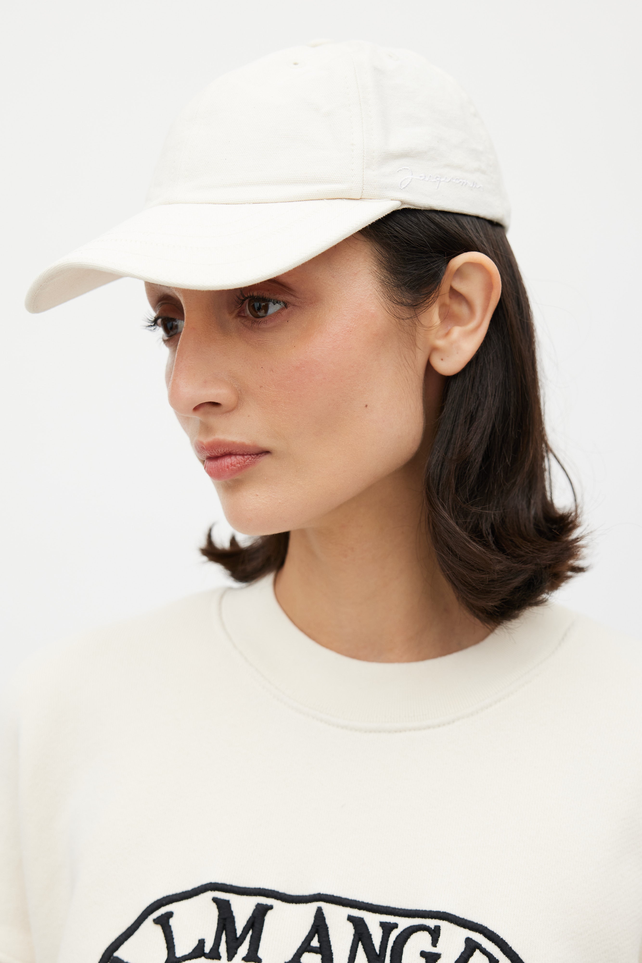 Pre-owned Jacquemus cream canvas cap featuring tonal stitching, adjustable strap back, and tonal embroidered logo at side.