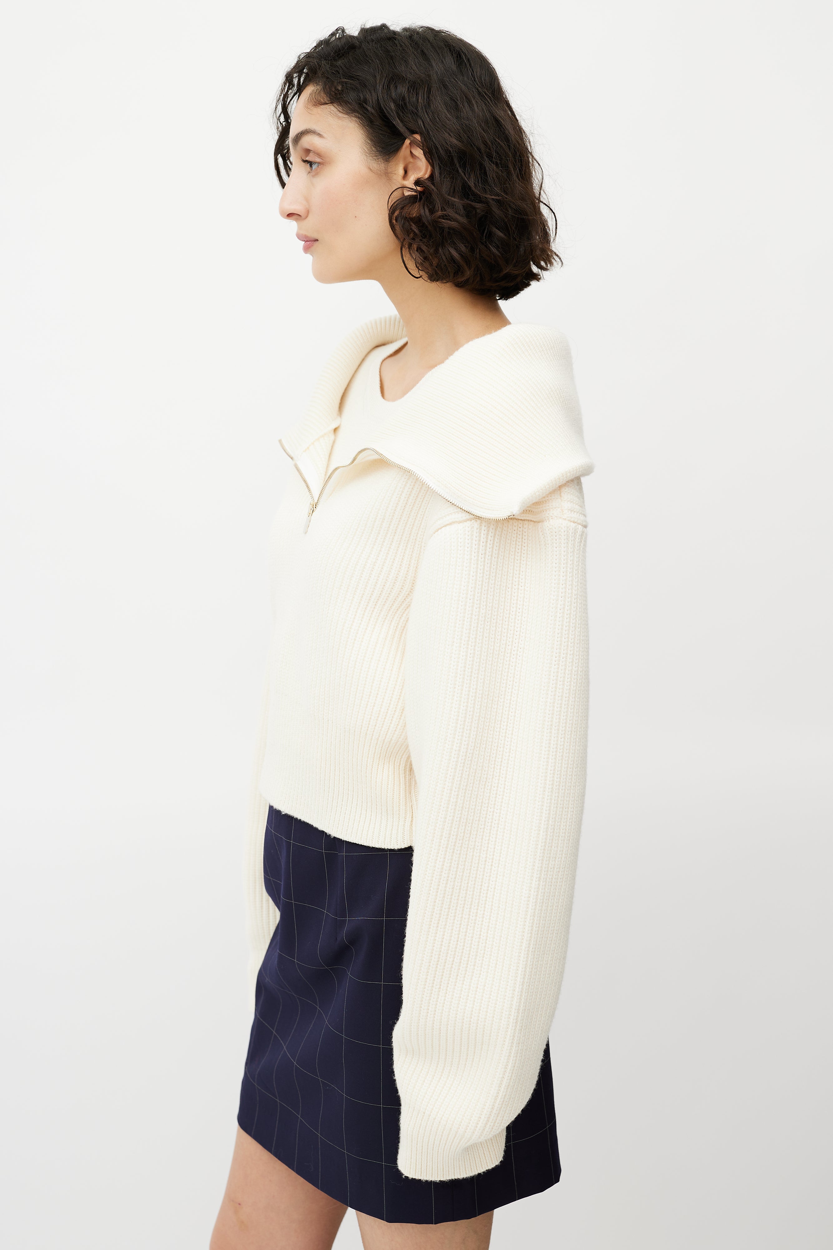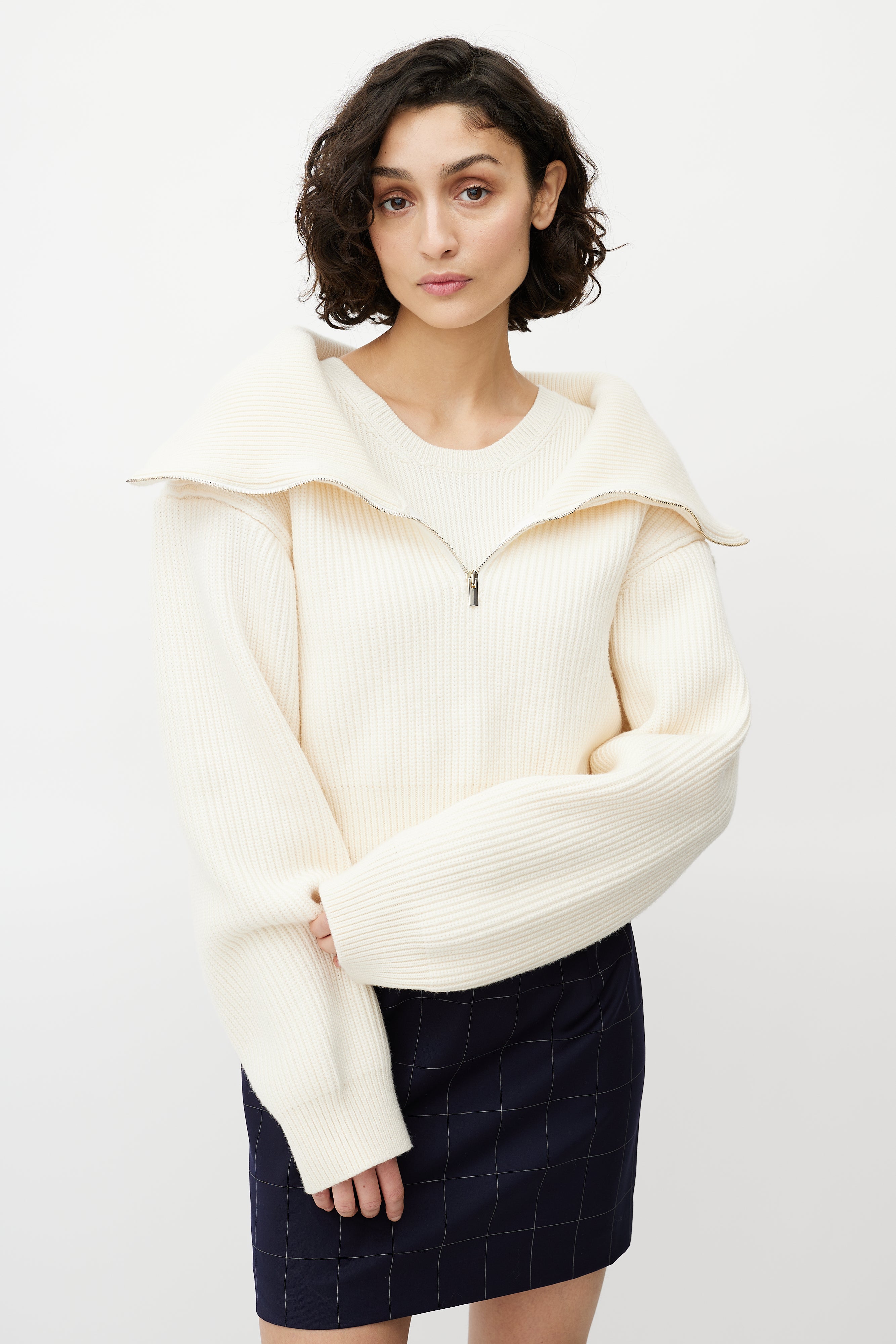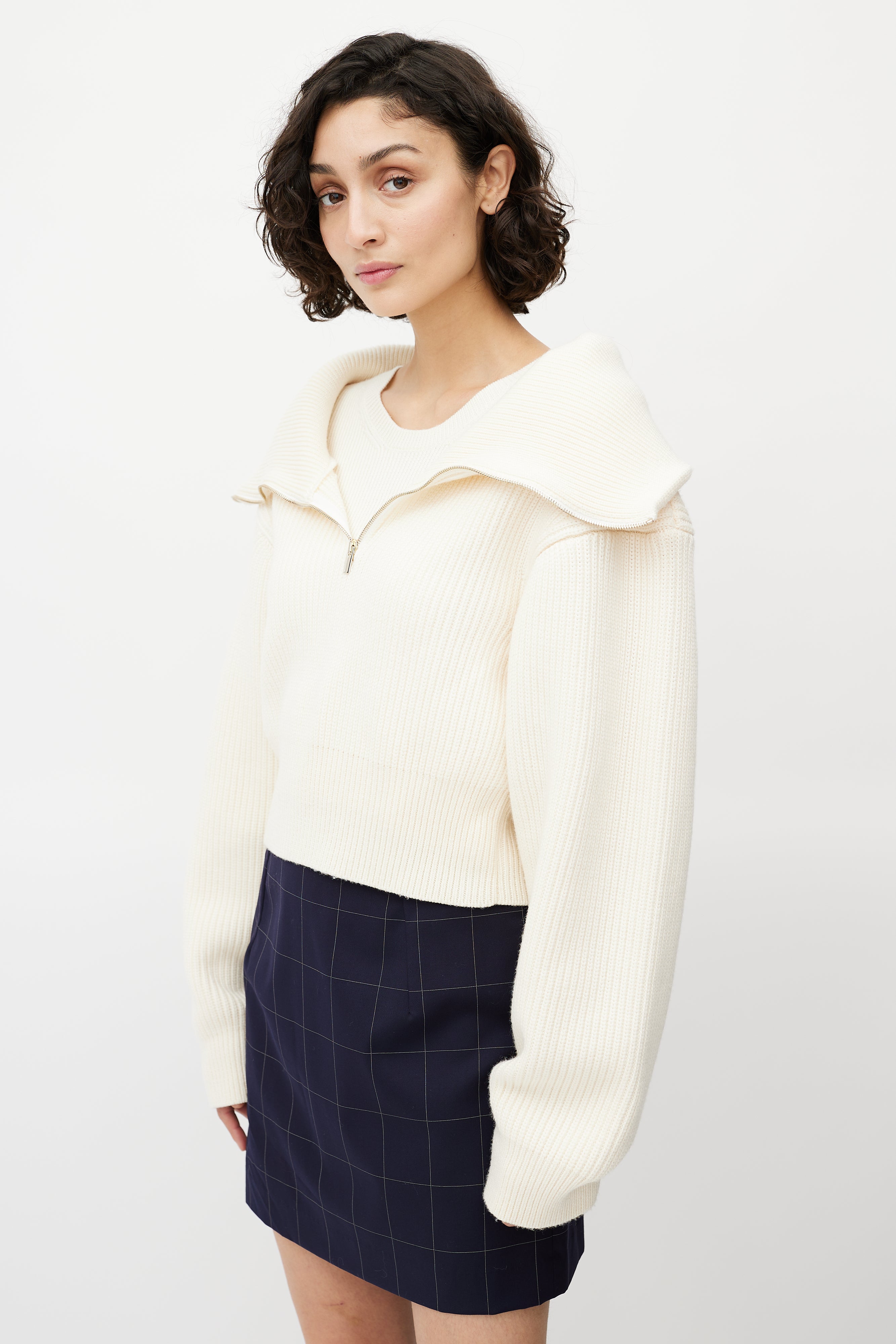 Pre-owned Jacquemus cream merino wool sweater featuring ribbed knit, cropped length, spread collar, half zip front, and attached cami layer.