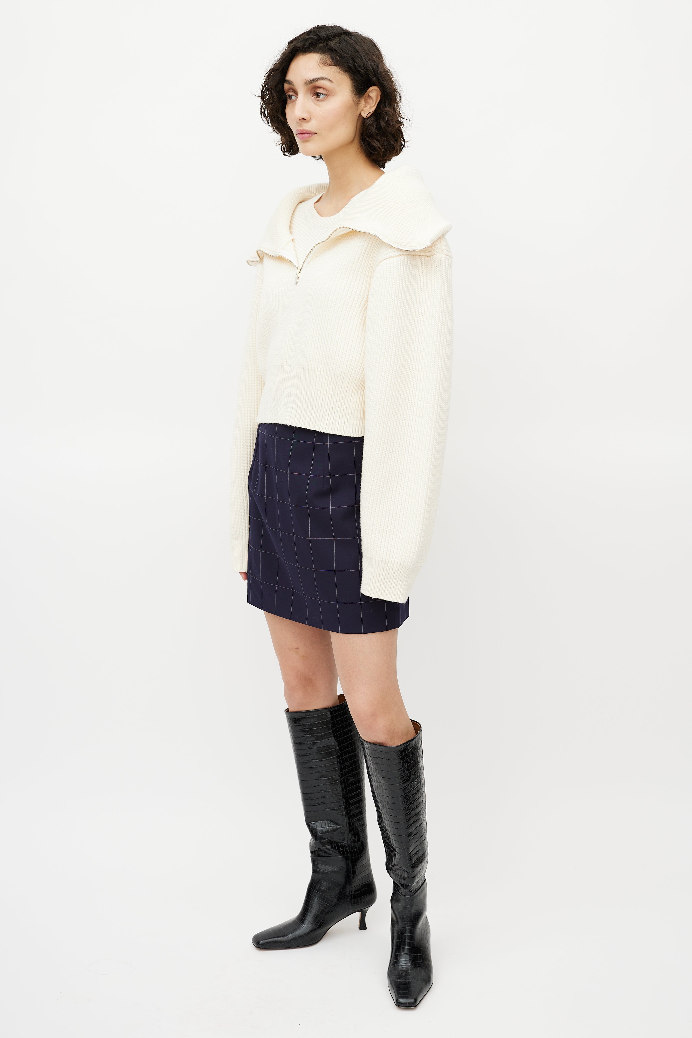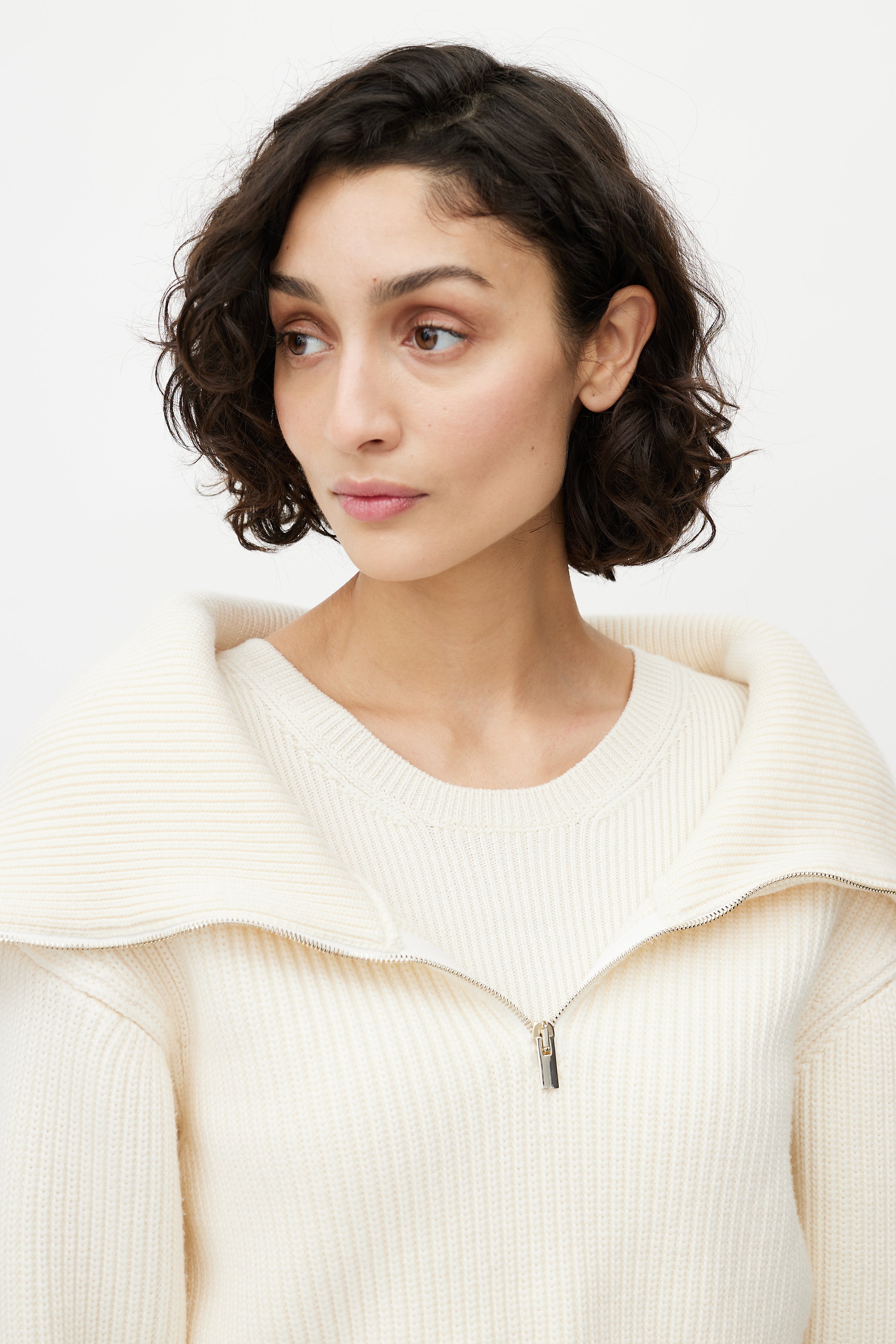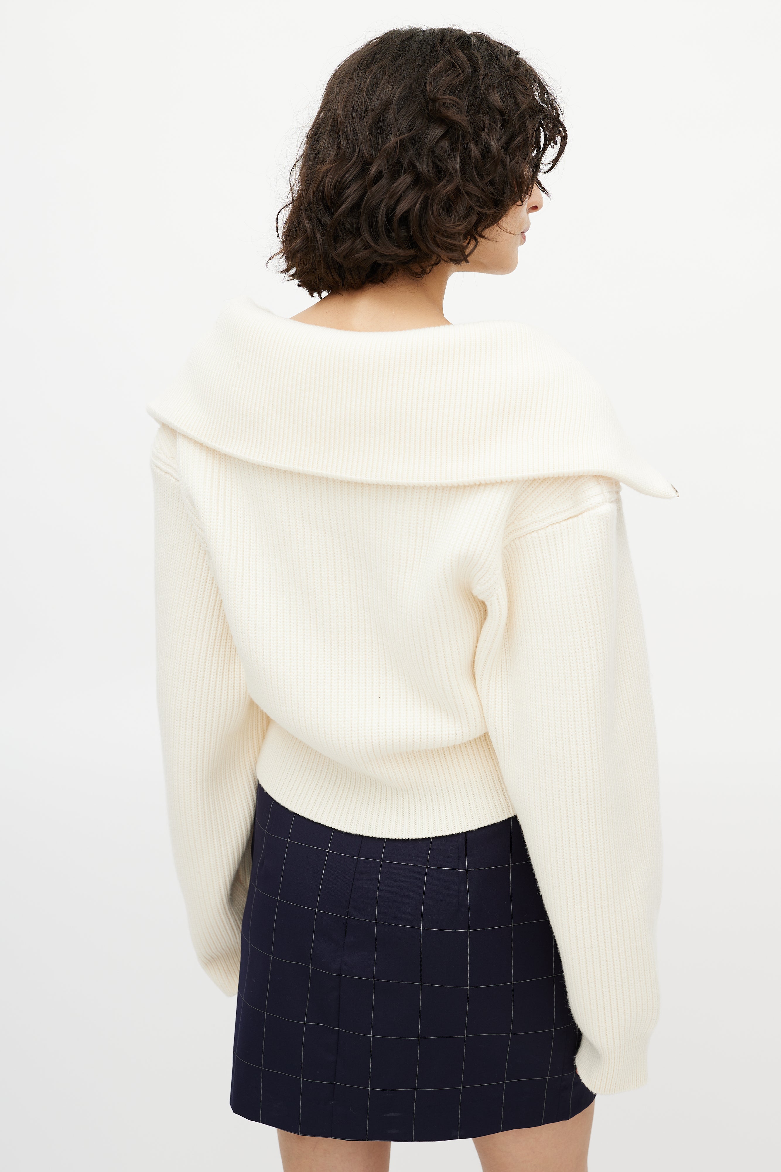Pre-owned Jacquemus cream merino wool sweater featuring ribbed knit, cropped length, spread collar, half zip front, and attached cami layer.