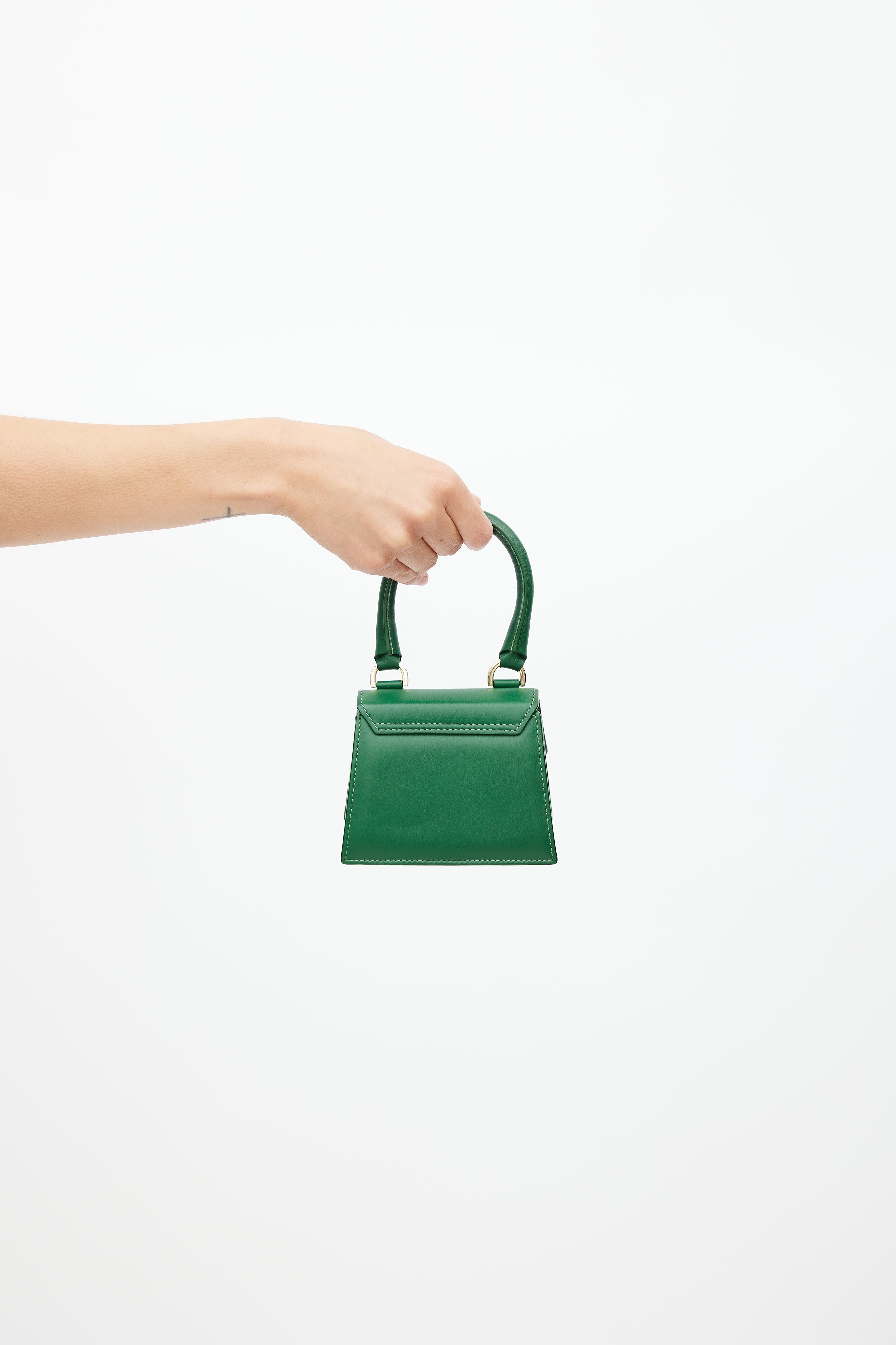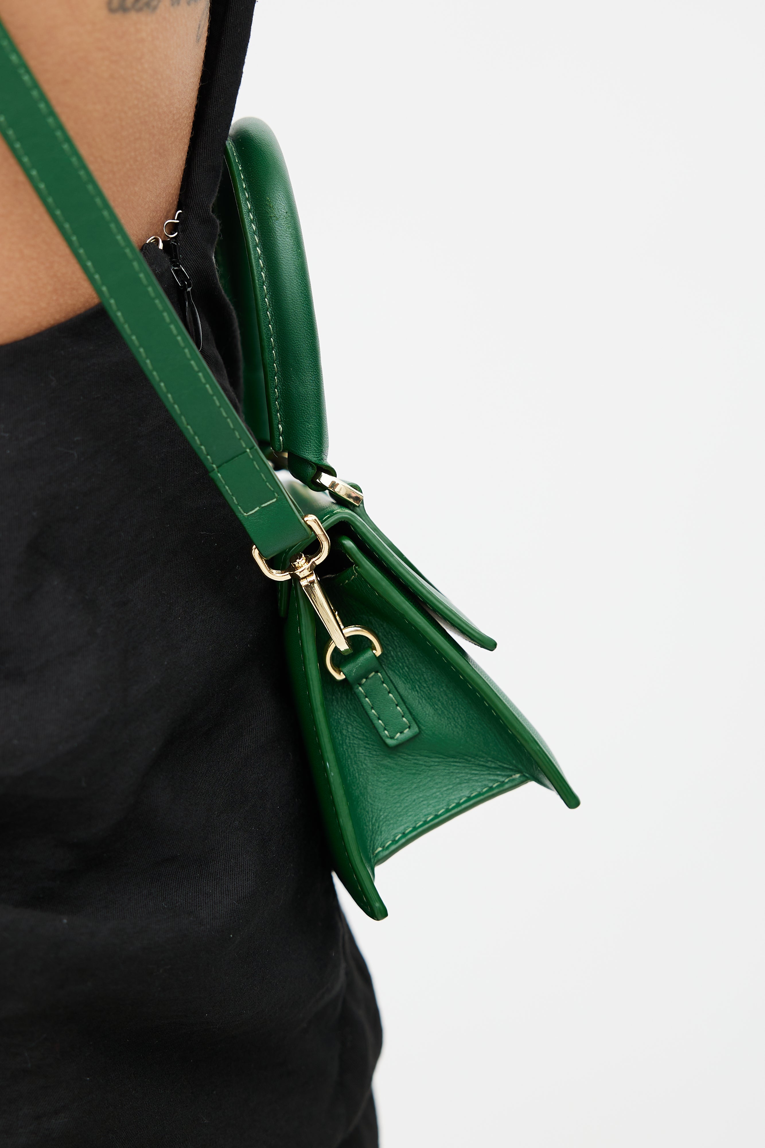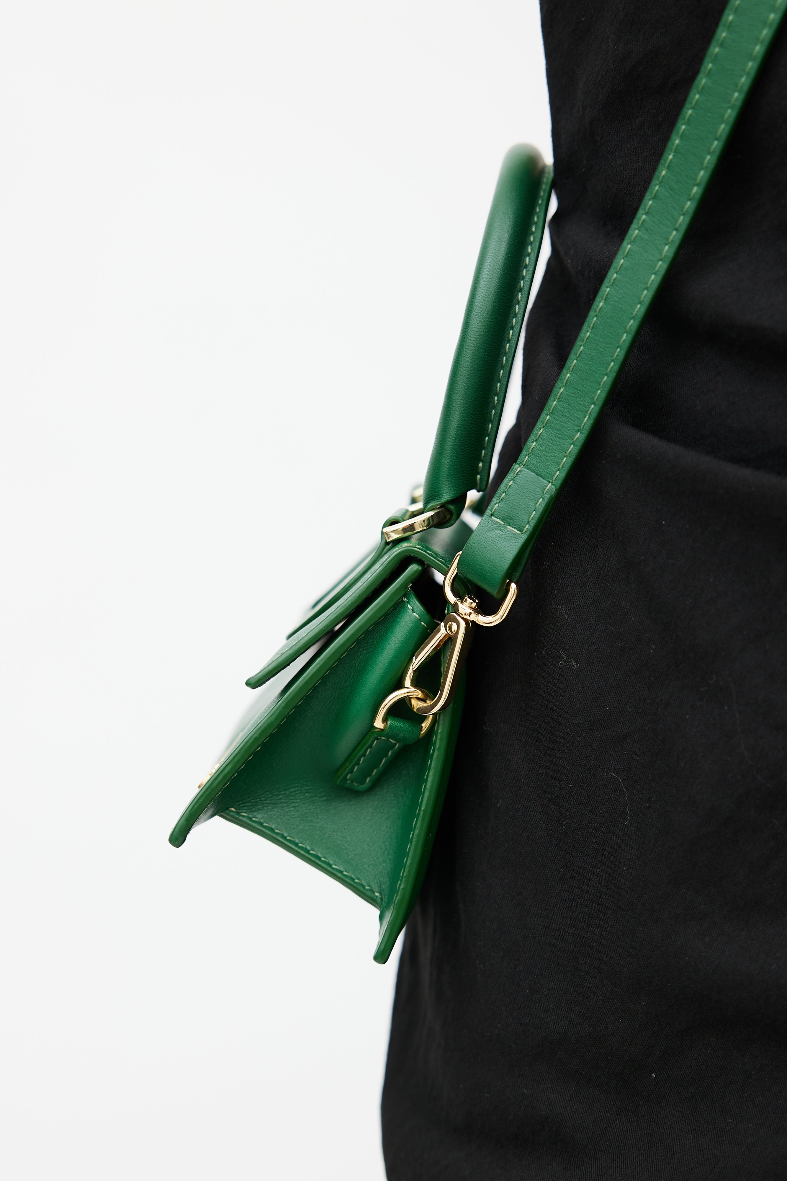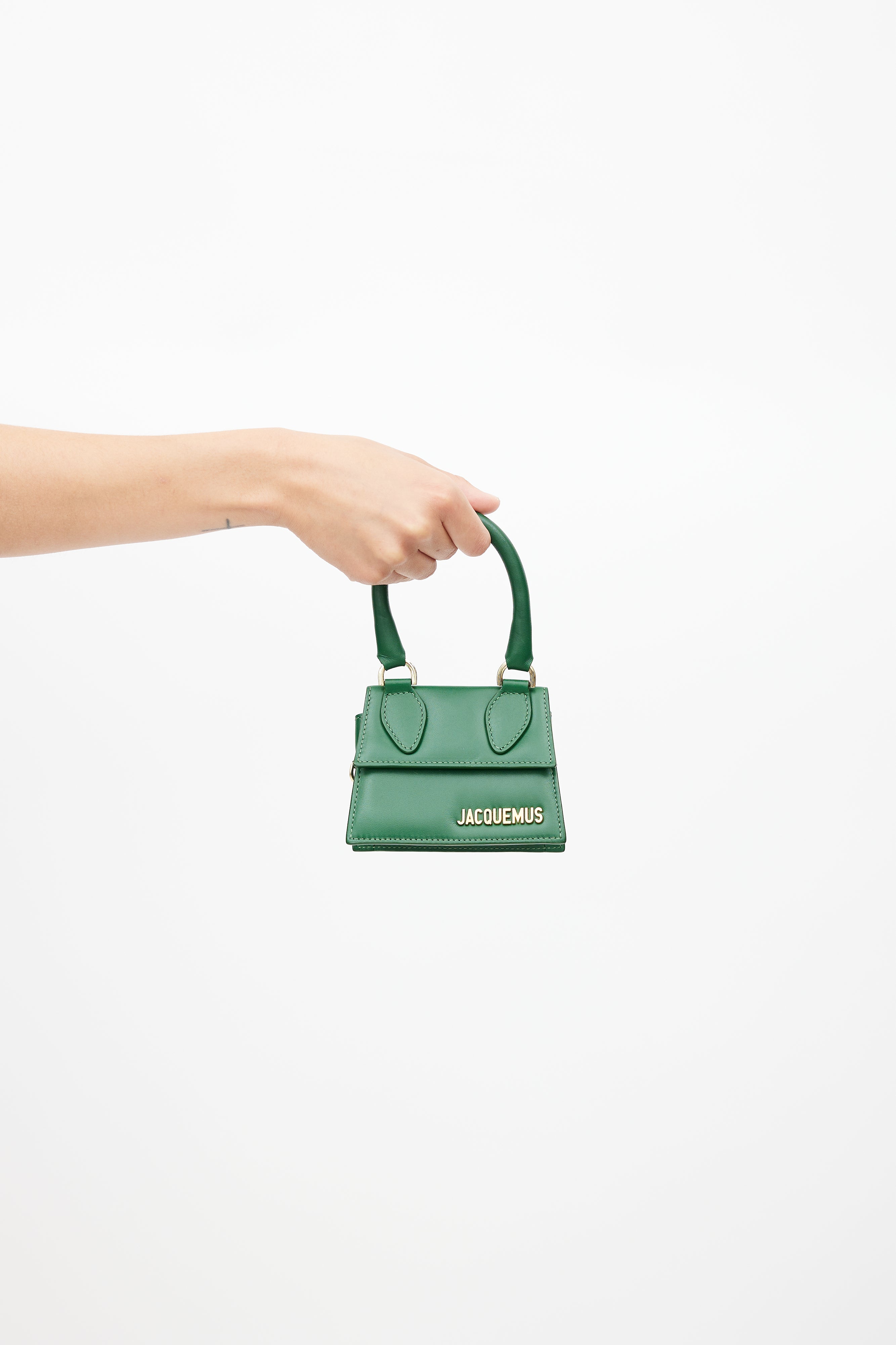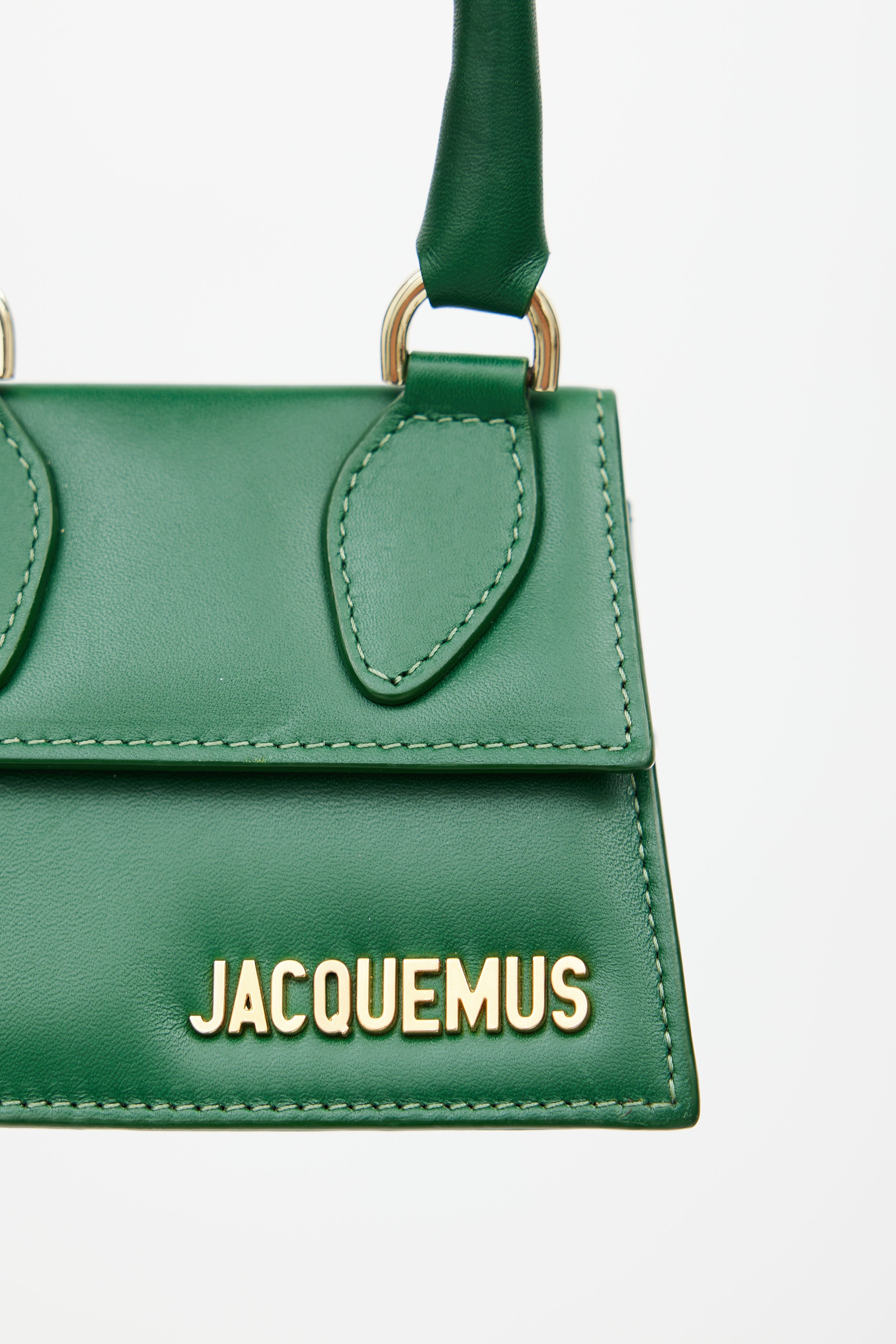 Pre-owned Jacquemus green La Chiquito crossbody bag featuring a top flap, wrapped top handle, gold tone logo hardware at front, one main compartment, removable shoulder strap, and magnetic snap closure.