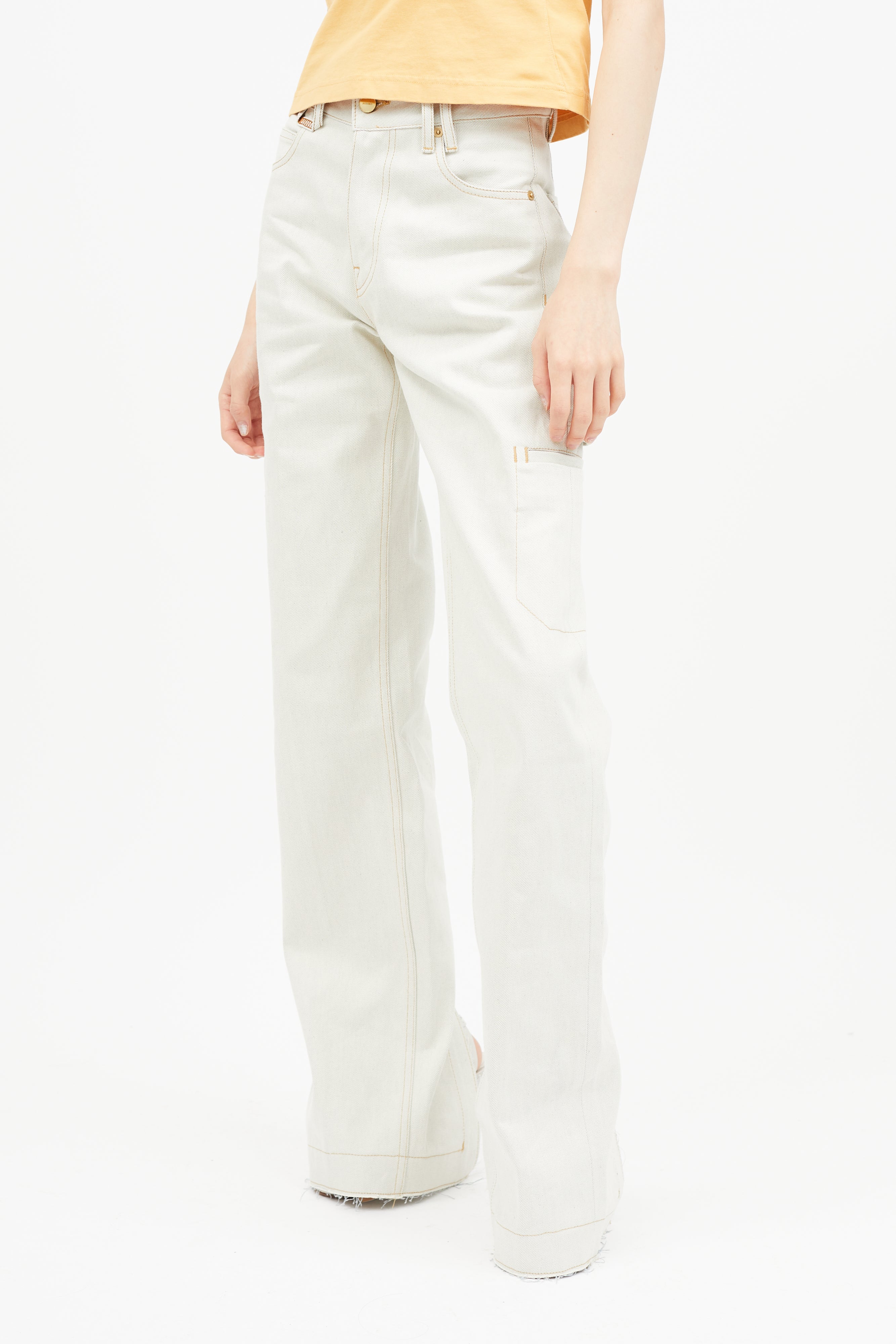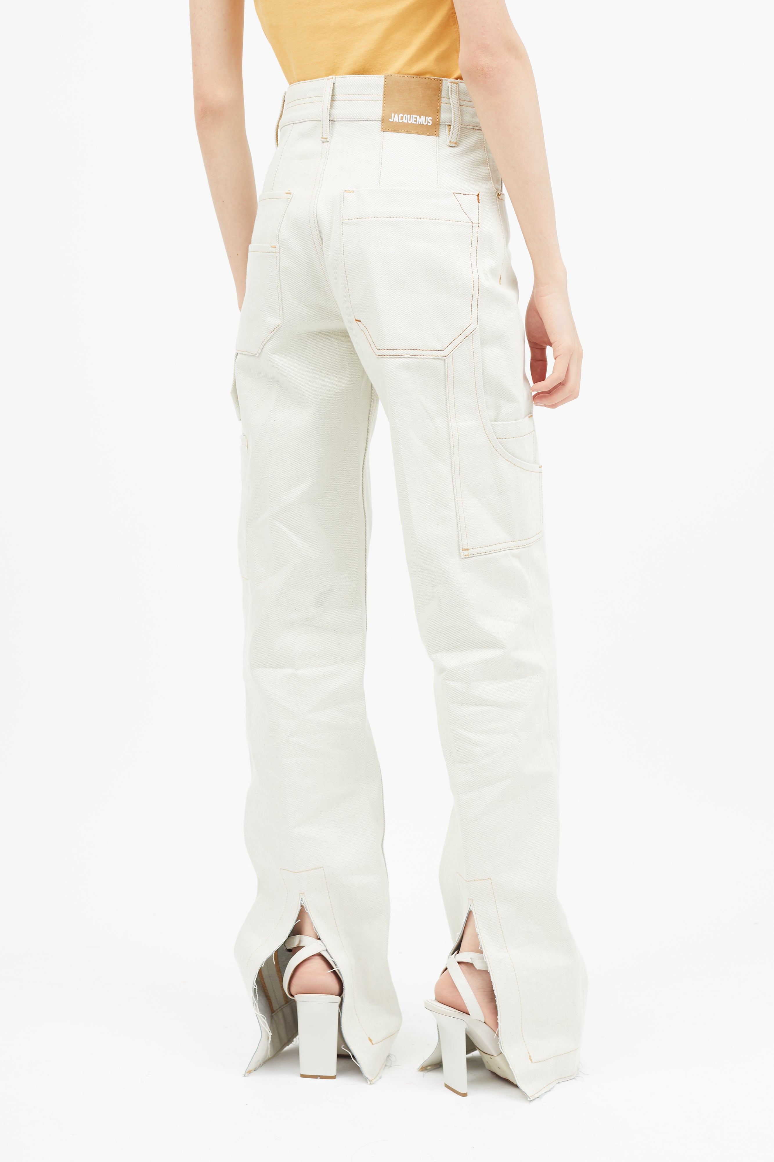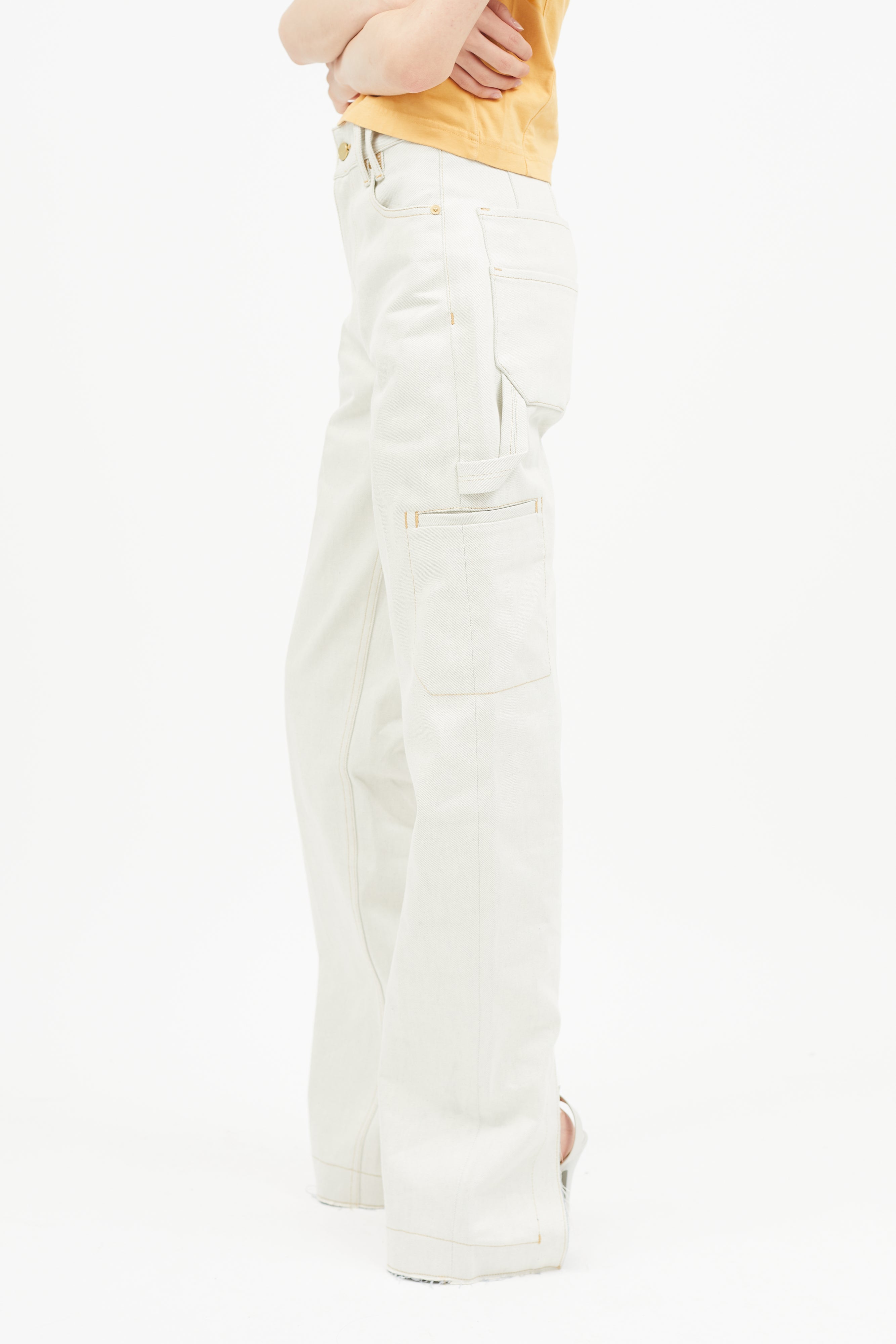 Pre-owned Jacquemus grey carpenter trousers featuring five pocket styling, contrast stitching throughout, three slip pockets at leg, loop at side, embossed logo tab at back, slim leg, raw hem with slit detail, and zip fly with button closure.