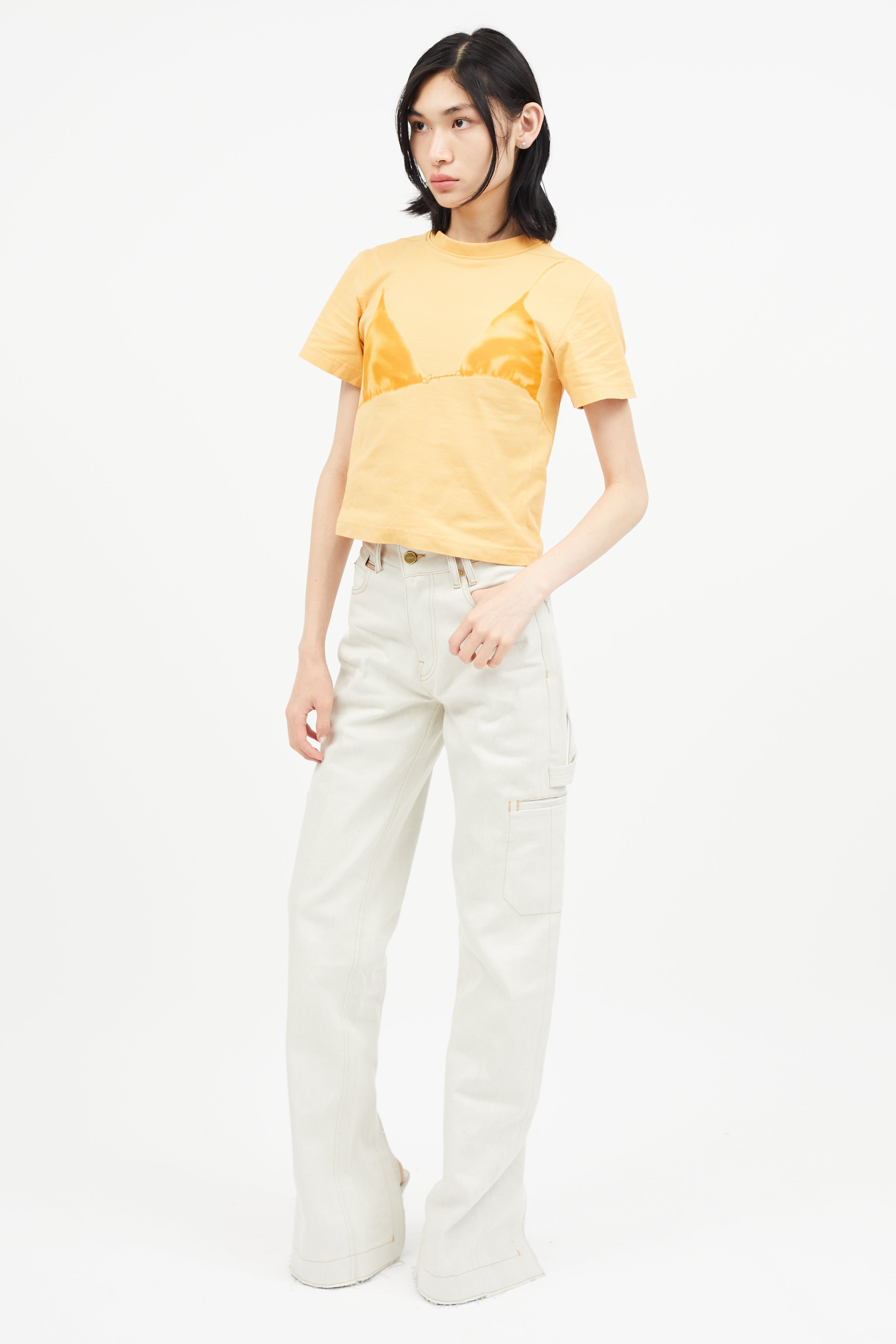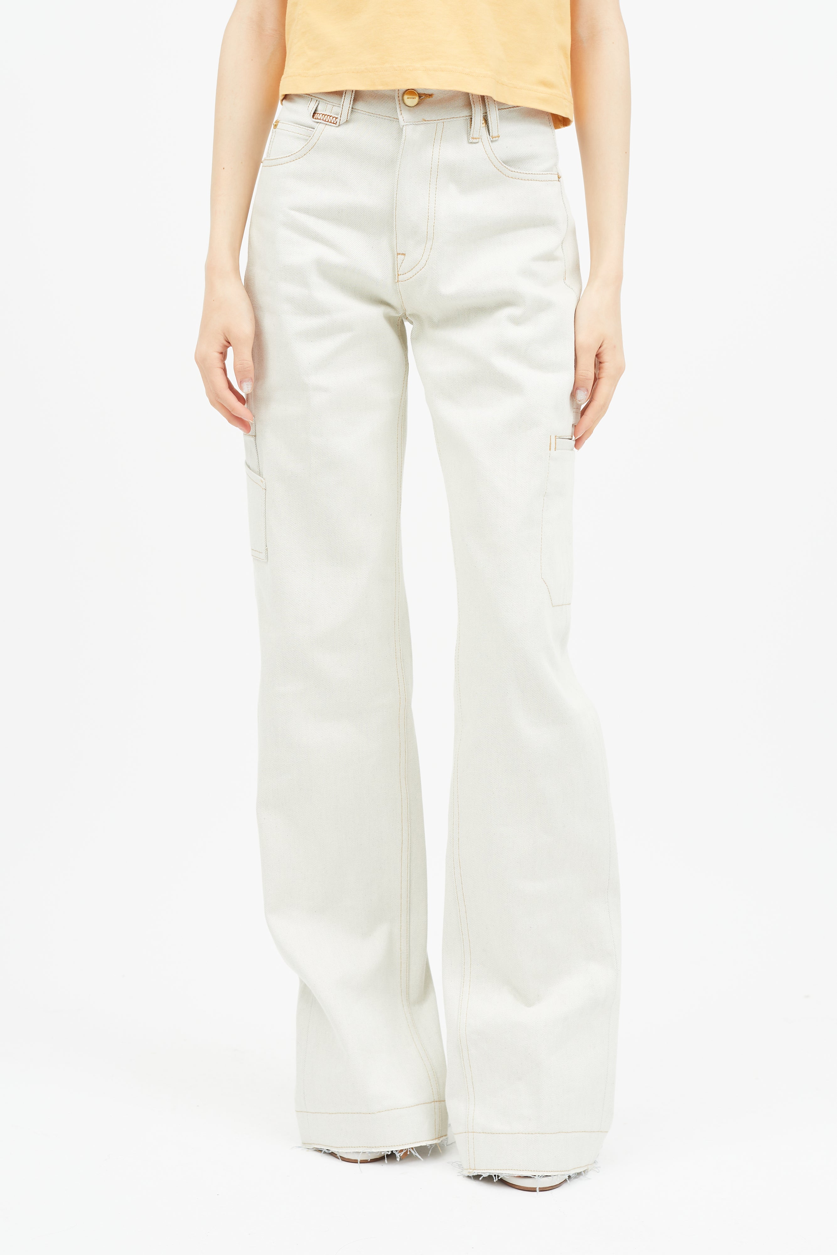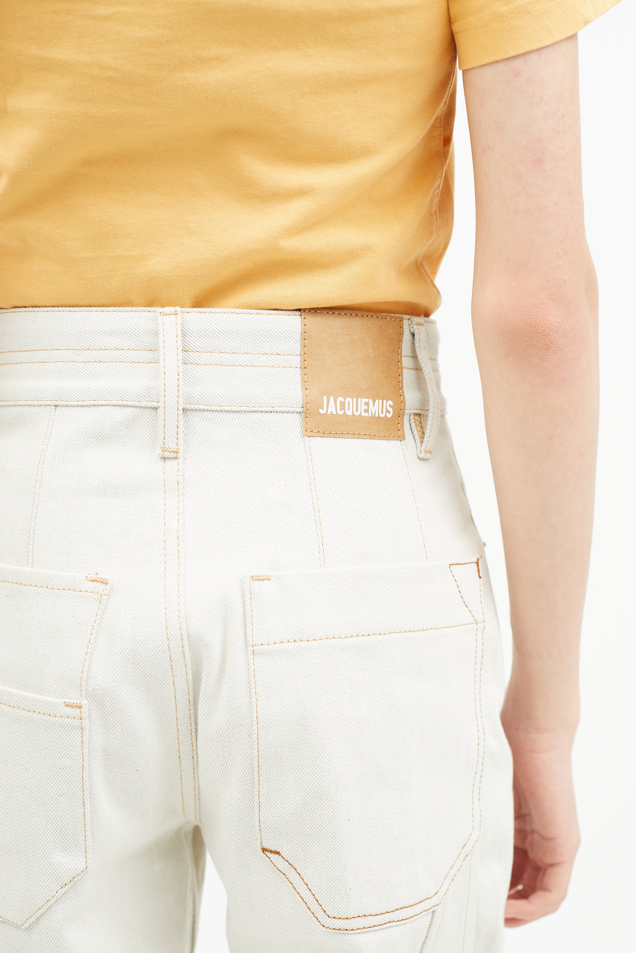 Pre-owned Jacquemus grey carpenter trousers featuring five pocket styling, contrast stitching throughout, three slip pockets at leg, loop at side, embossed logo tab at back, slim leg, raw hem with slit detail, and zip fly with button closure.