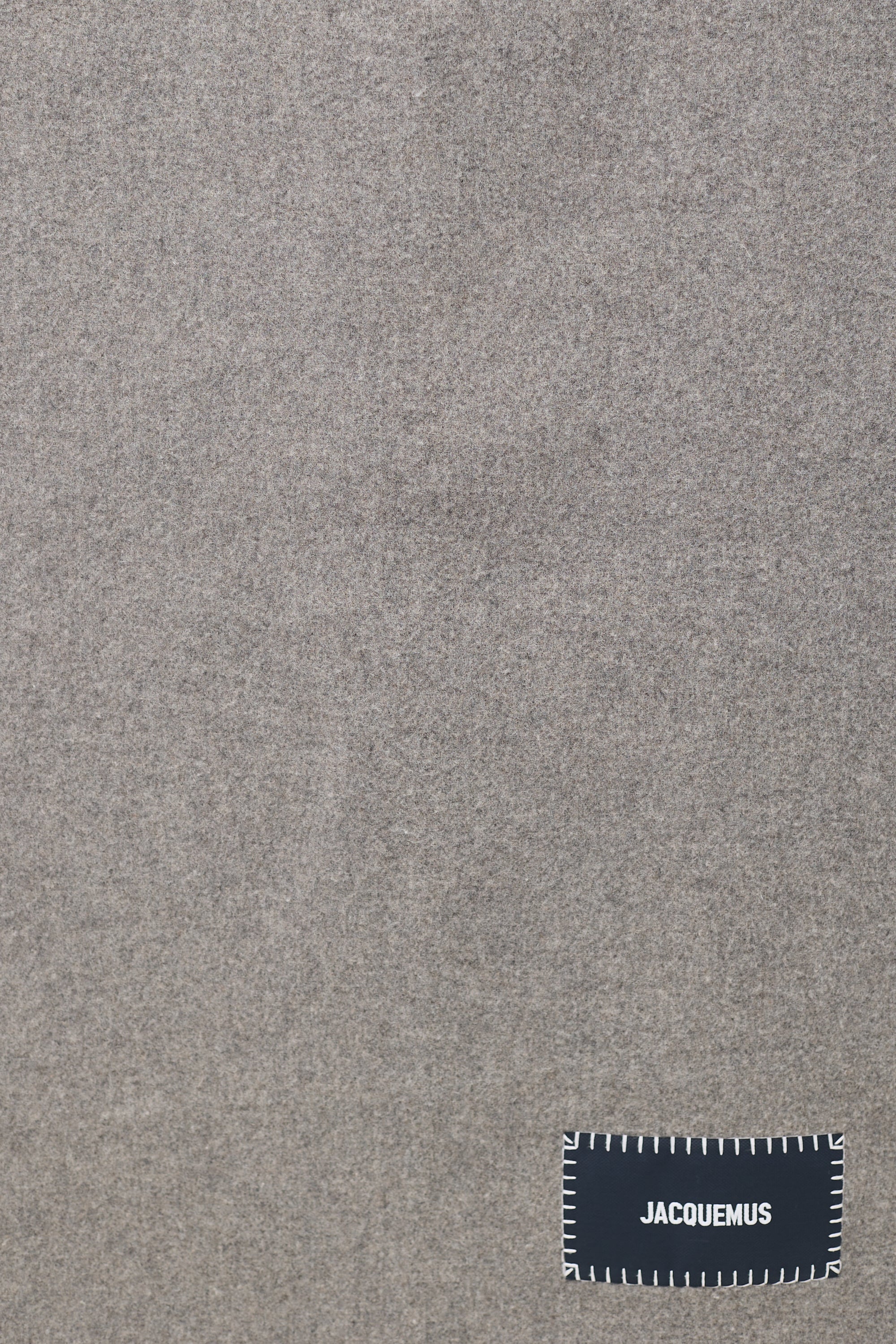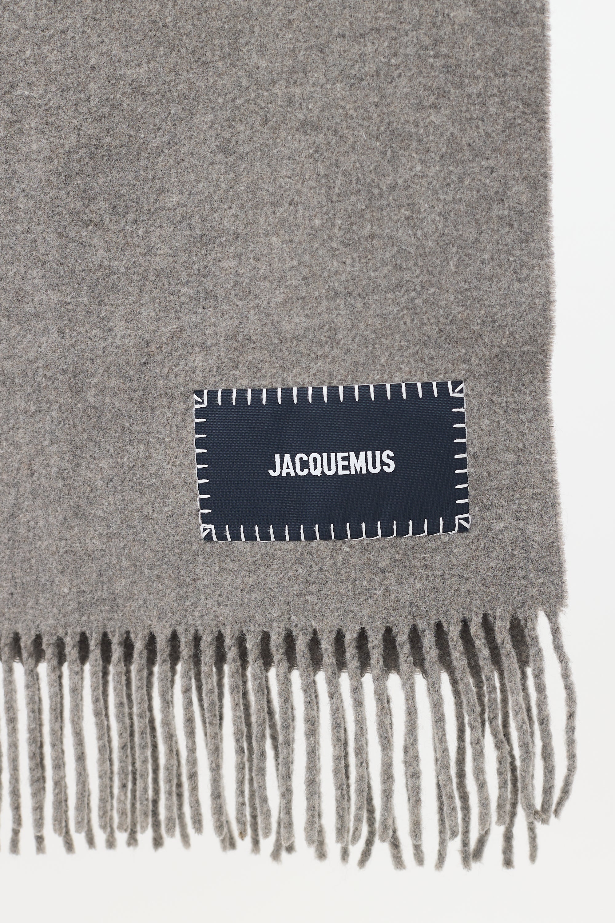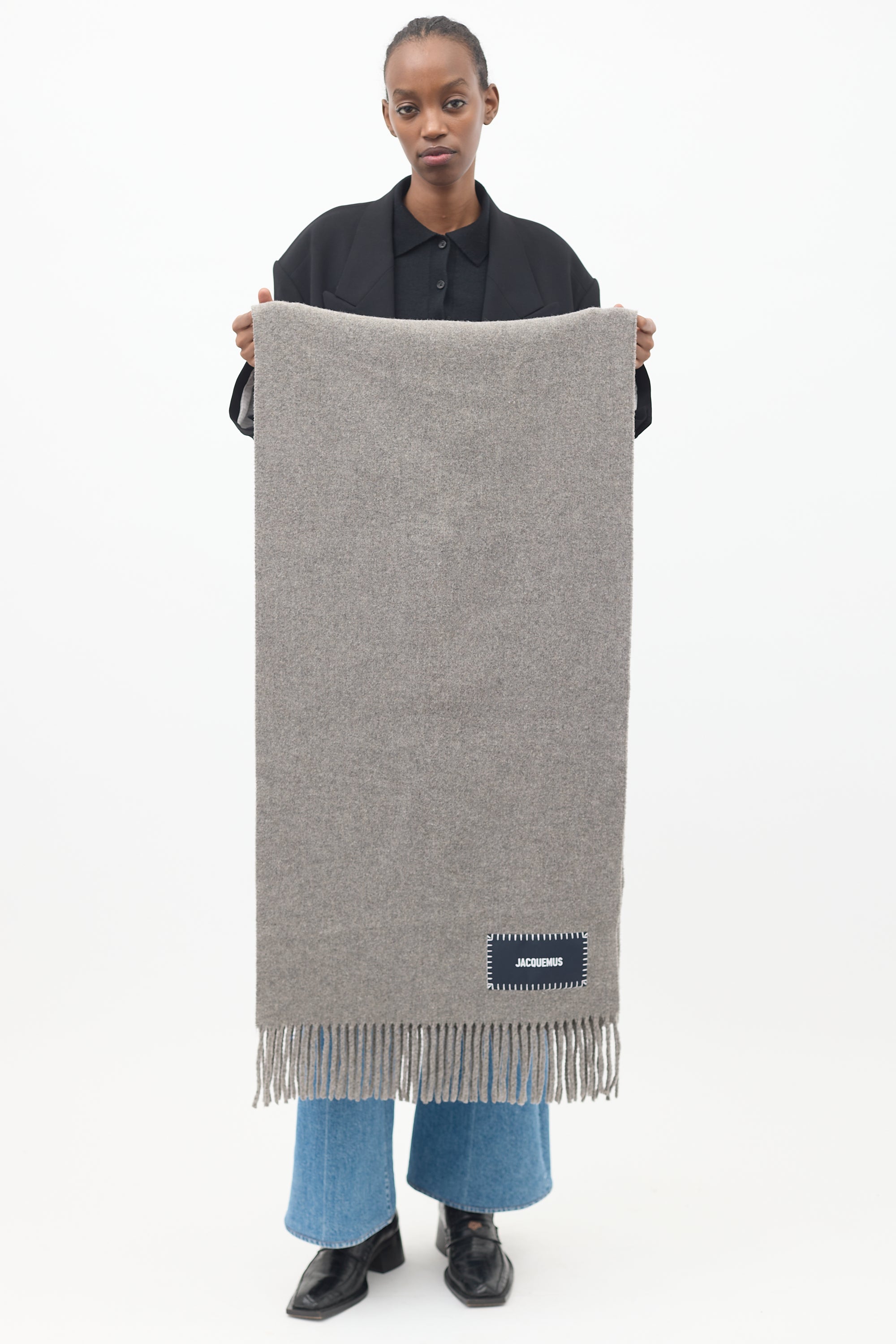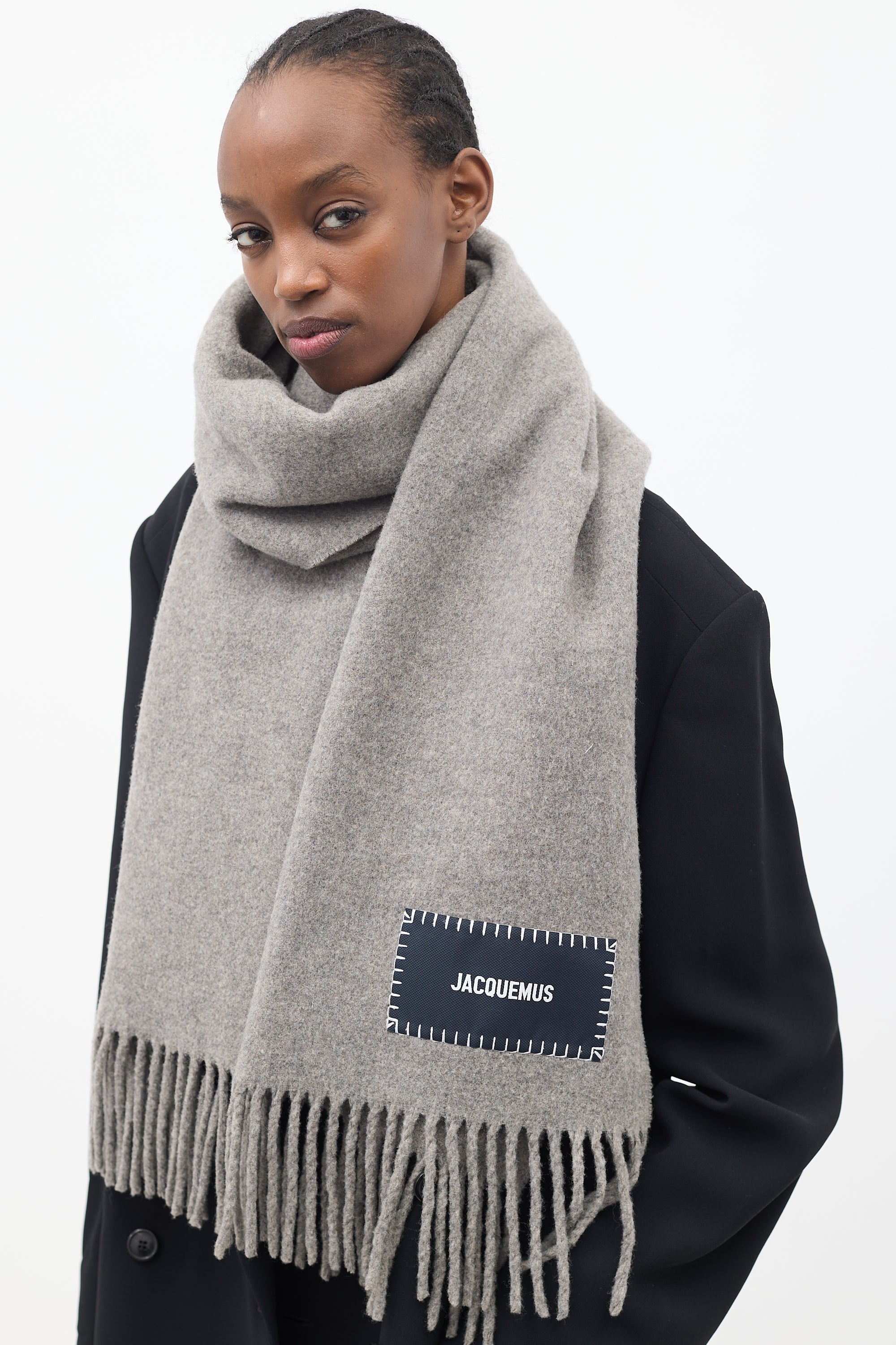 Pre-owned Jacquemus grey wool scarf featuring navy and white logo tab at one end, and fringe and both ends.
