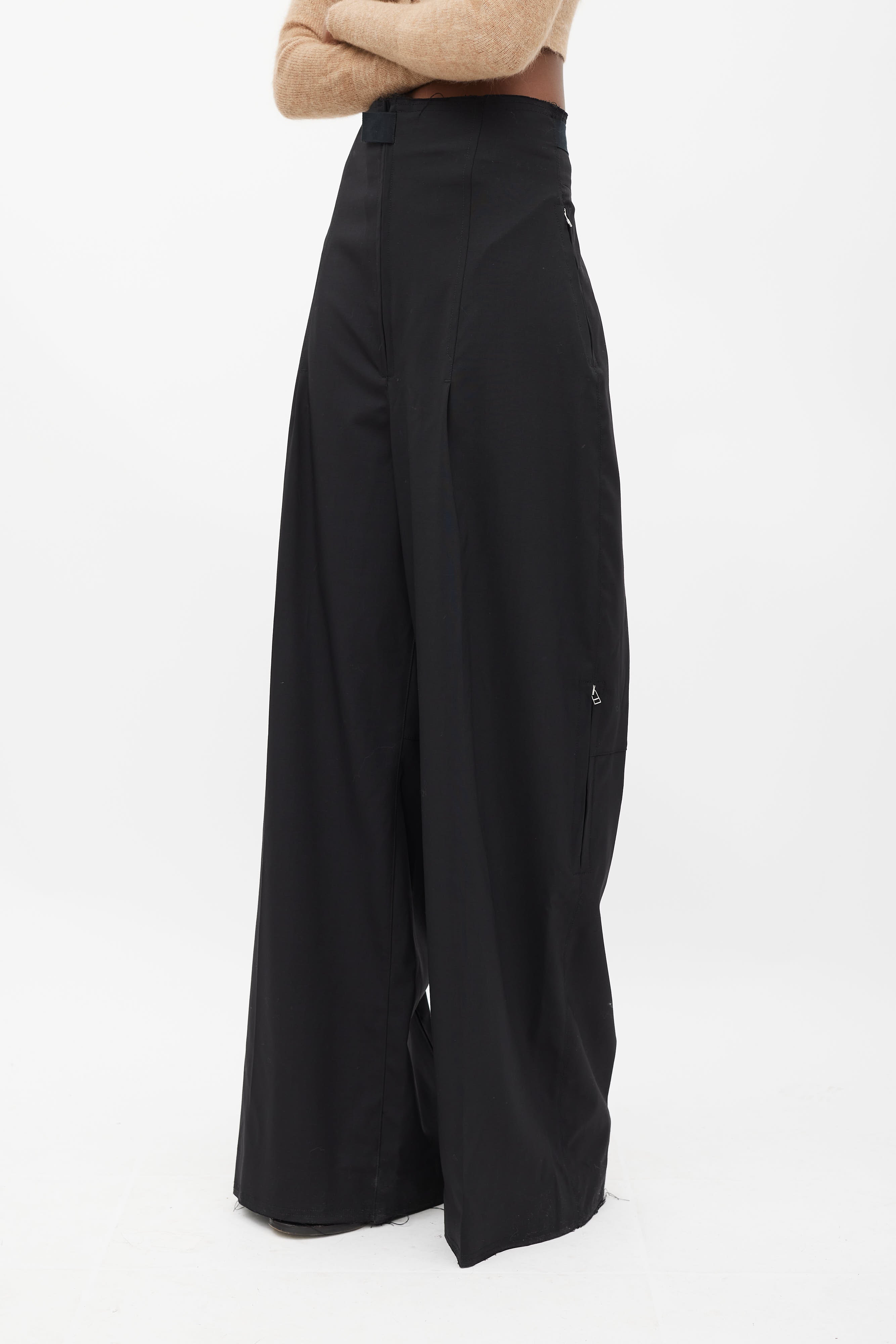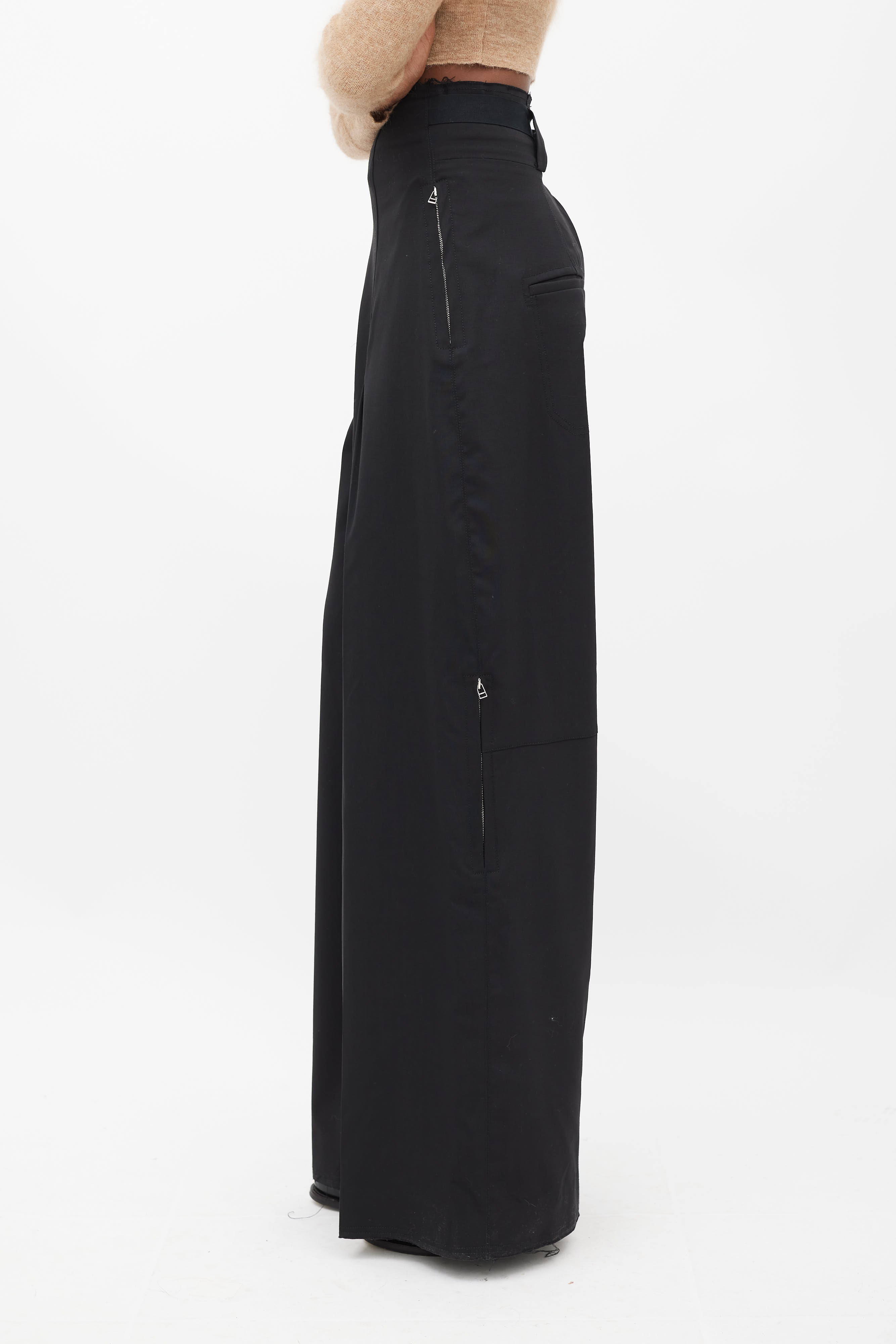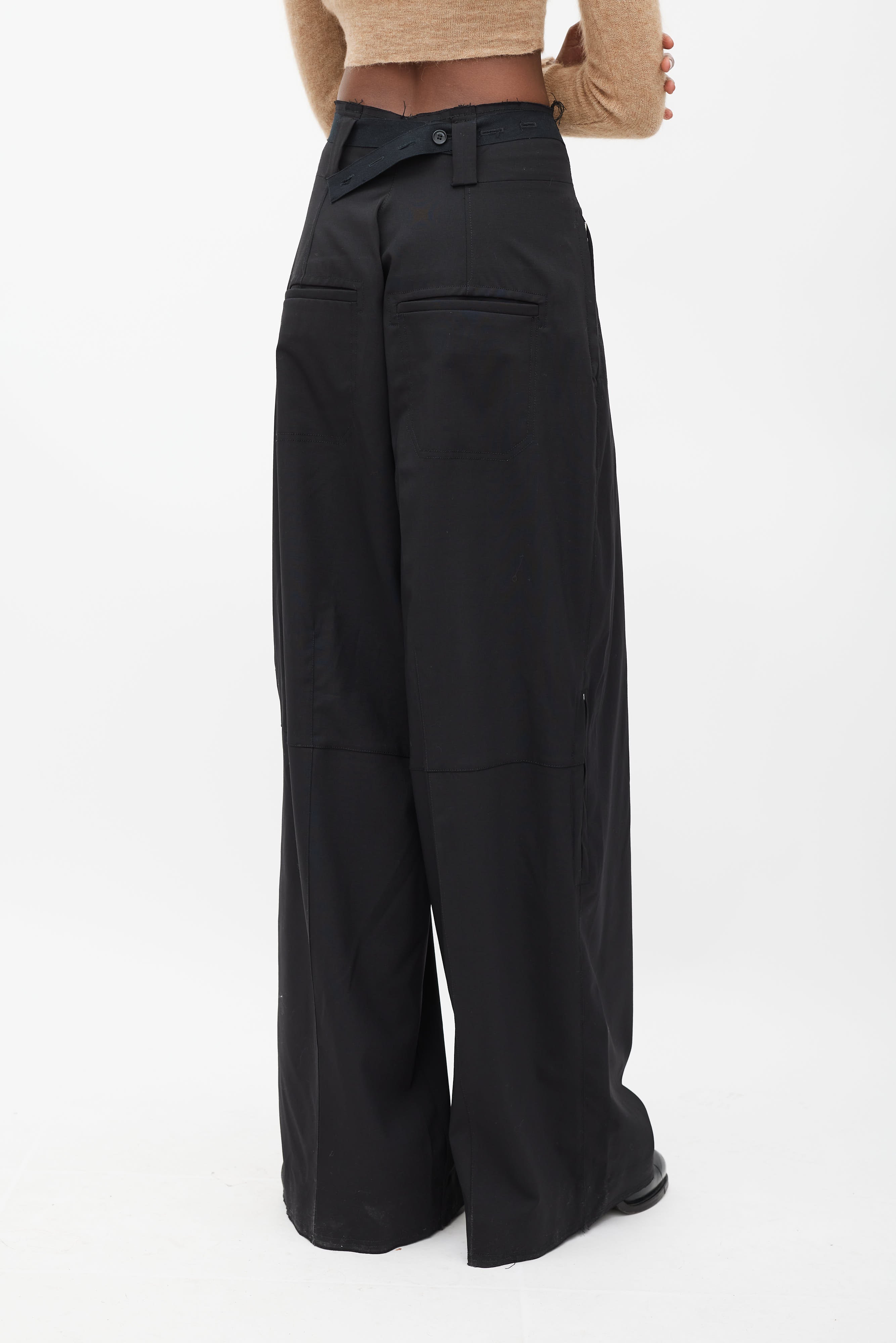 Pre-owned Jacquemus Le Papier black wool blend trousers featuring a high waist, wide straight leg, raw edges, four welt pockets with silver tone zip closures at sides, two welt pockets at back, adjustable strap detail at back waist, and concealed front zip closure with tab and button fastening. Clipped to fit model.