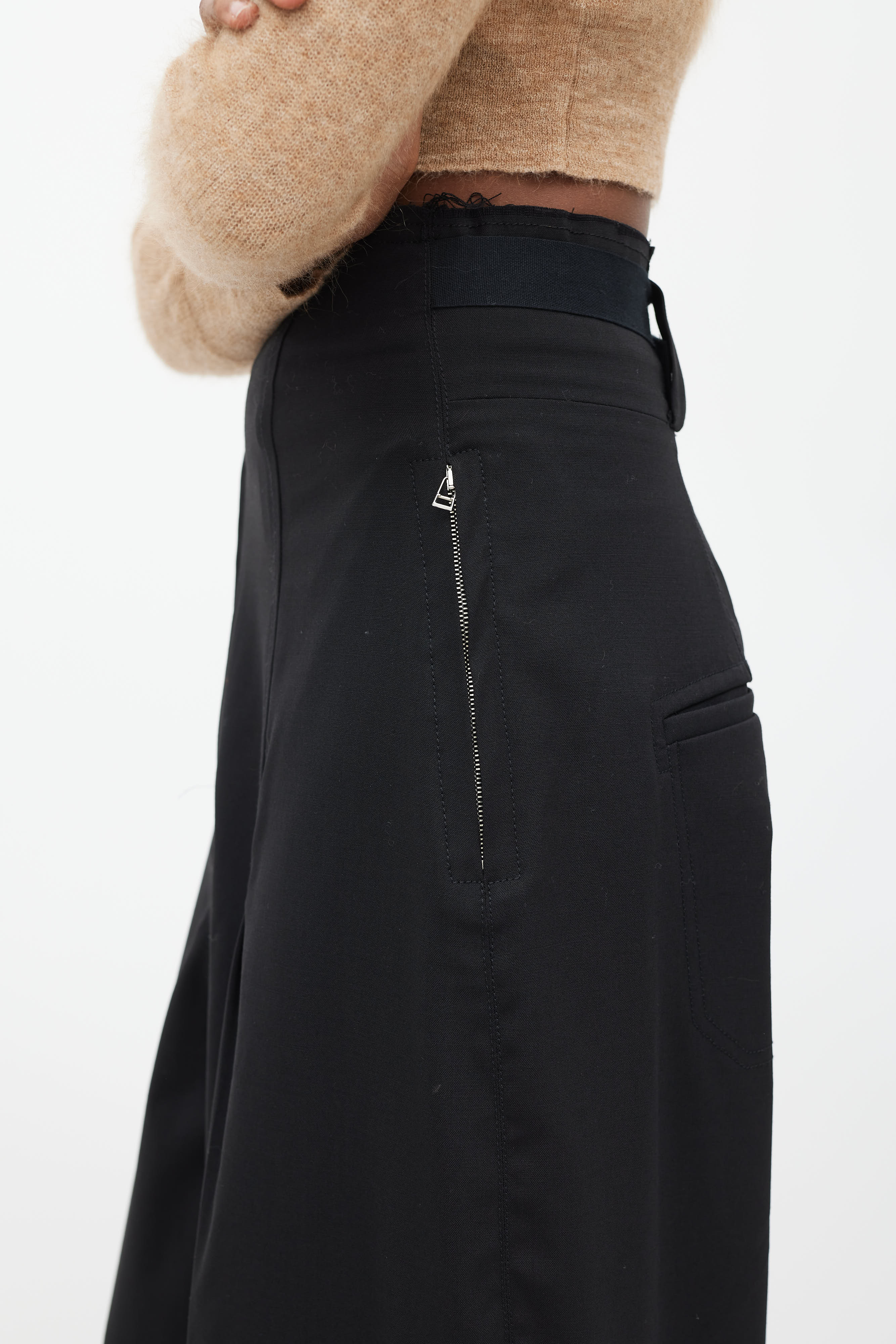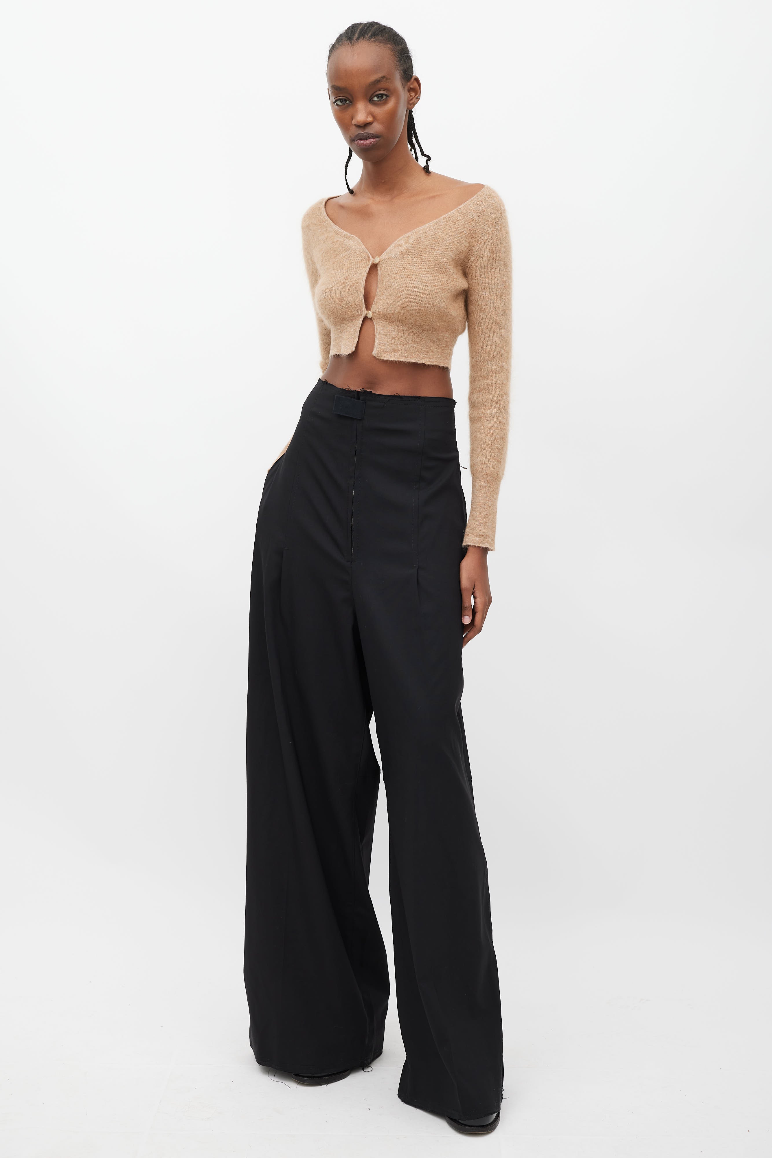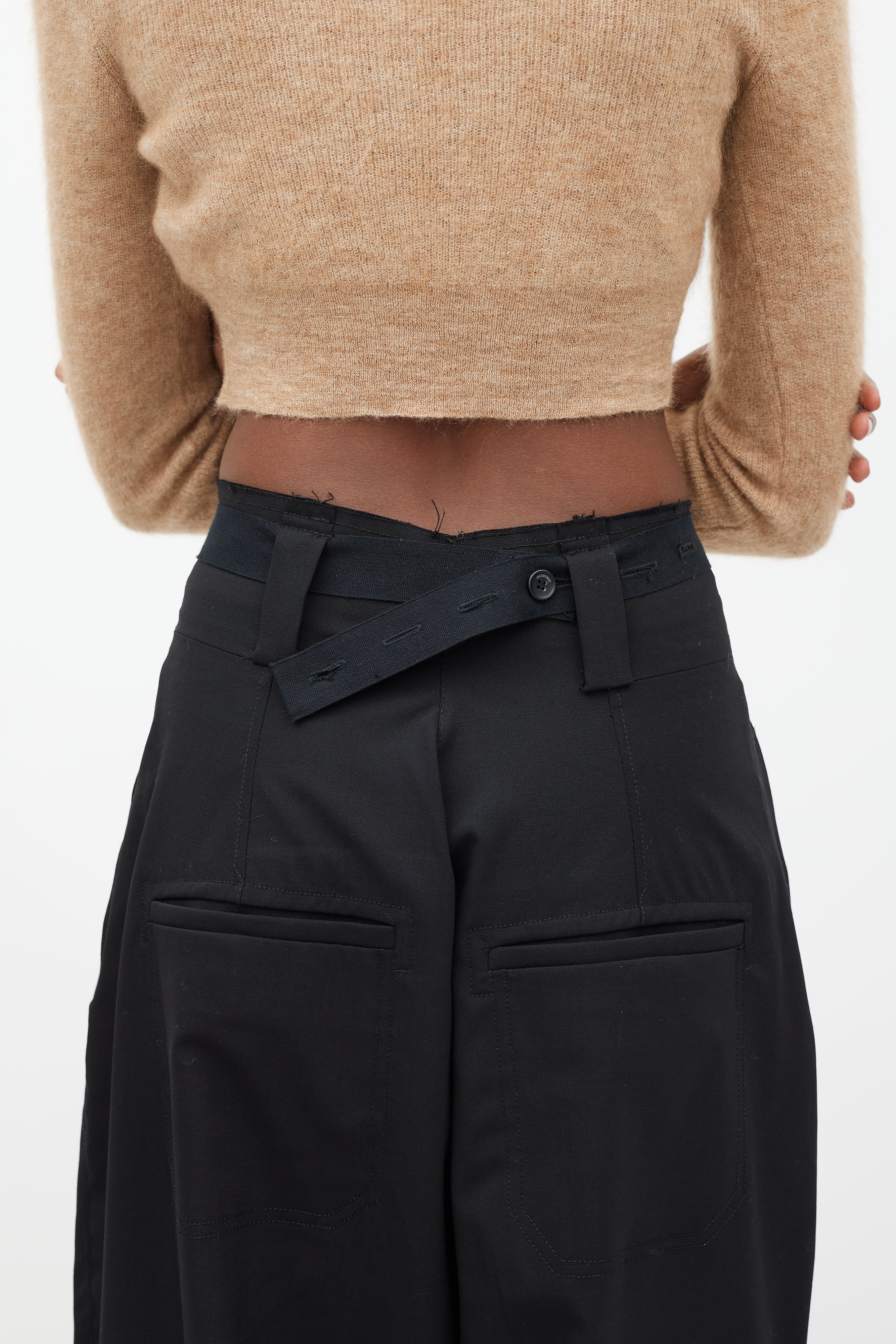 Pre-owned Jacquemus Le Papier black wool blend trousers featuring a high waist, wide straight leg, raw edges, four welt pockets with silver tone zip closures at sides, two welt pockets at back, adjustable strap detail at back waist, and concealed front zip closure with tab and button fastening. Clipped to fit model.