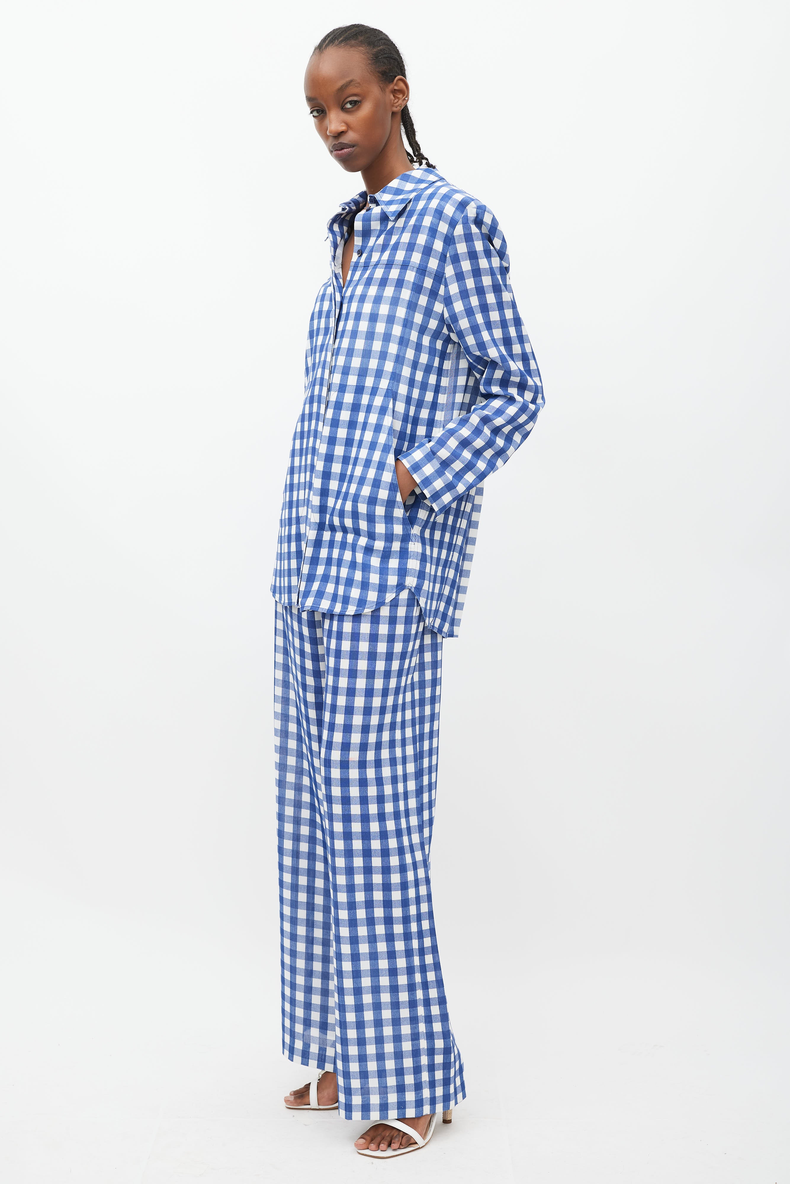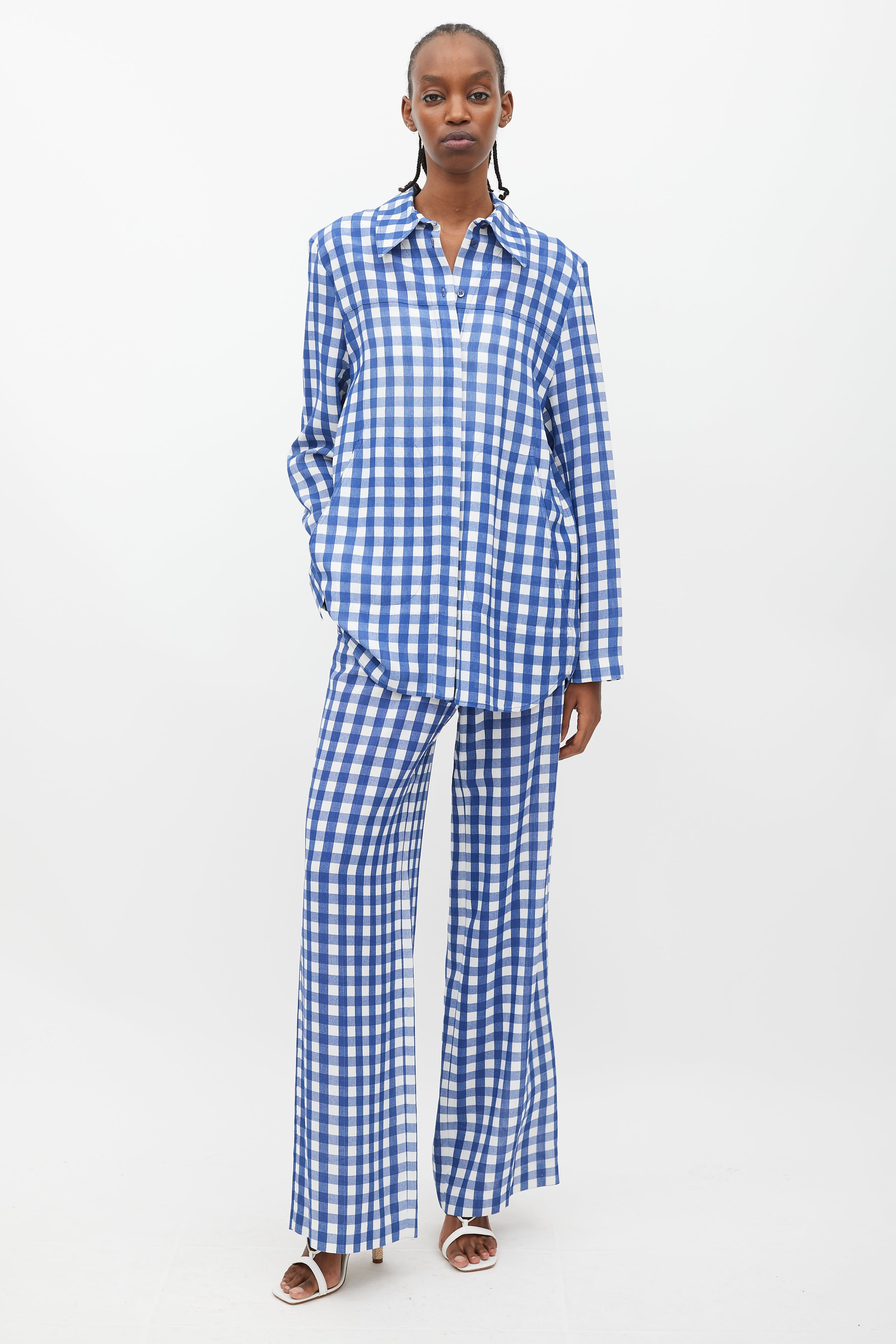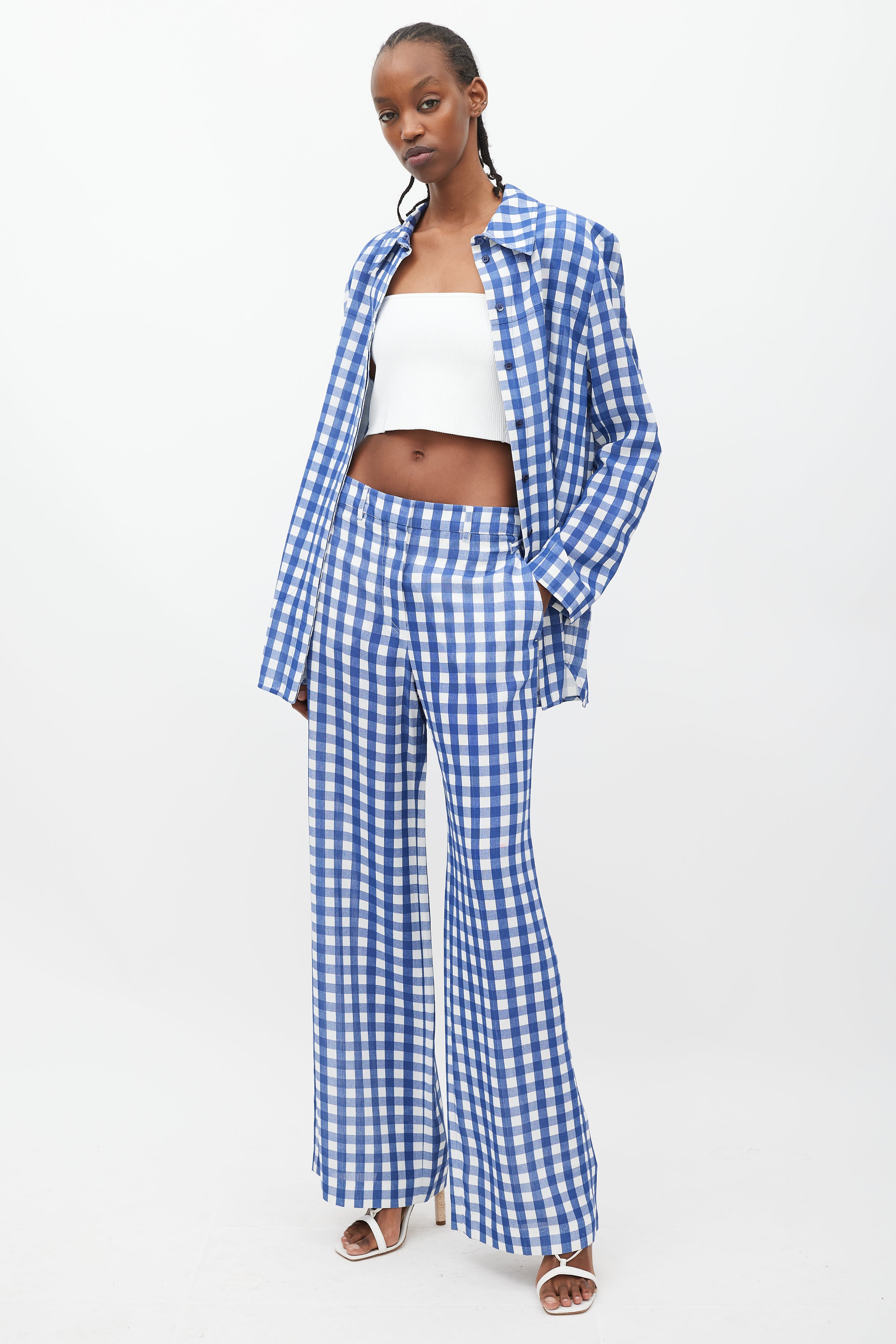 Pre-owned Jacquemus Le Splash blue and white gingham co-ord set featuring a shirt with a pointed collar, two slash pockets at front hip, long sleeves with buttoned cuffs, split open back with adjustable straps, and partially concealed front button closure. Matching trousers feature high waist with adjustable strap at back, wide straight leg, four pocket styling, and front zip closure with top hook fastening.