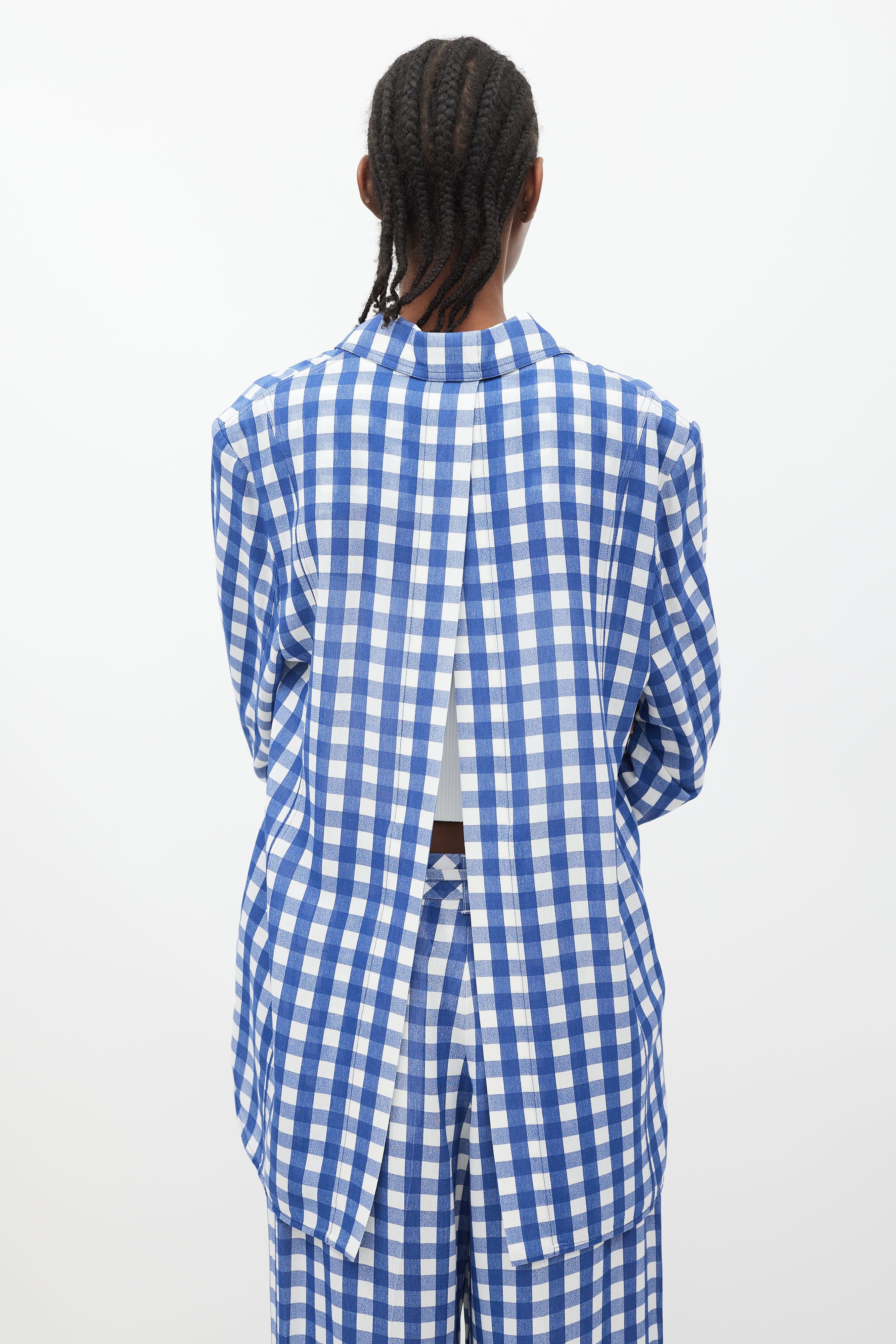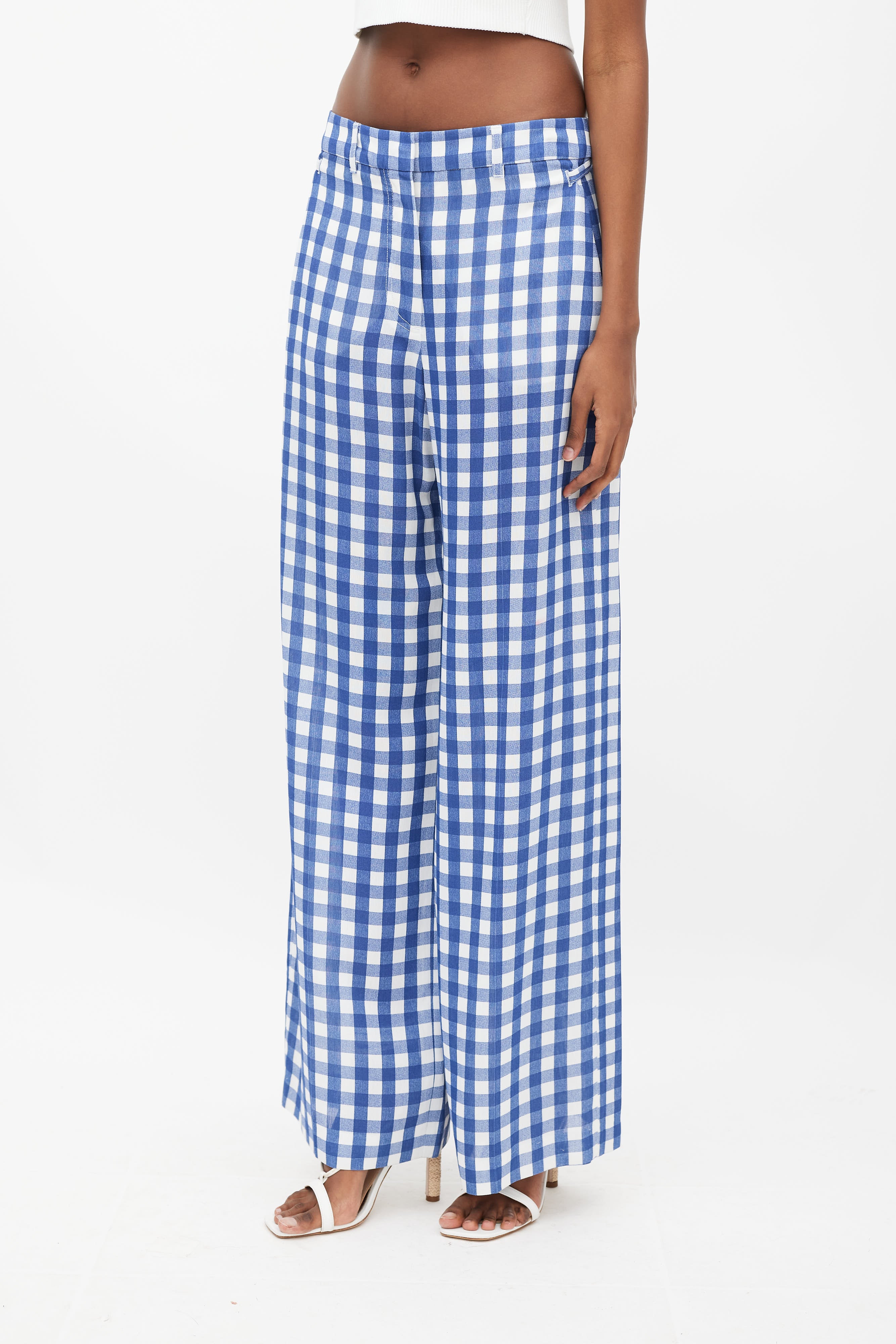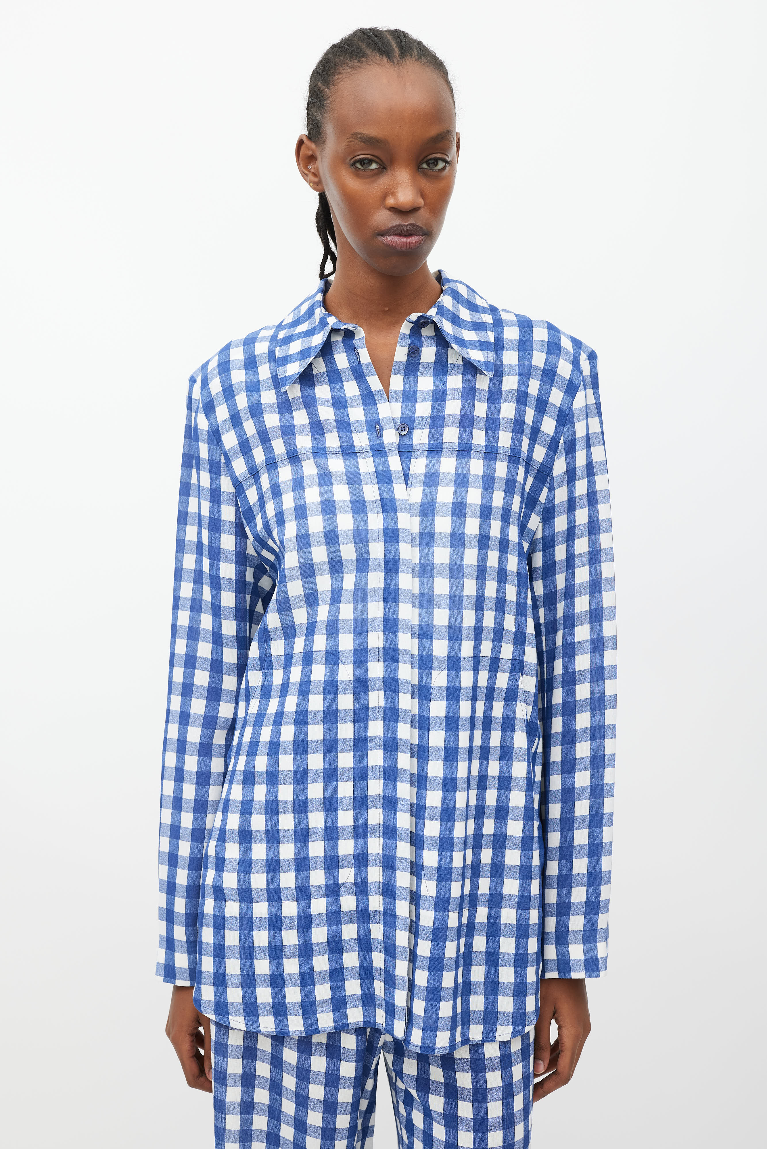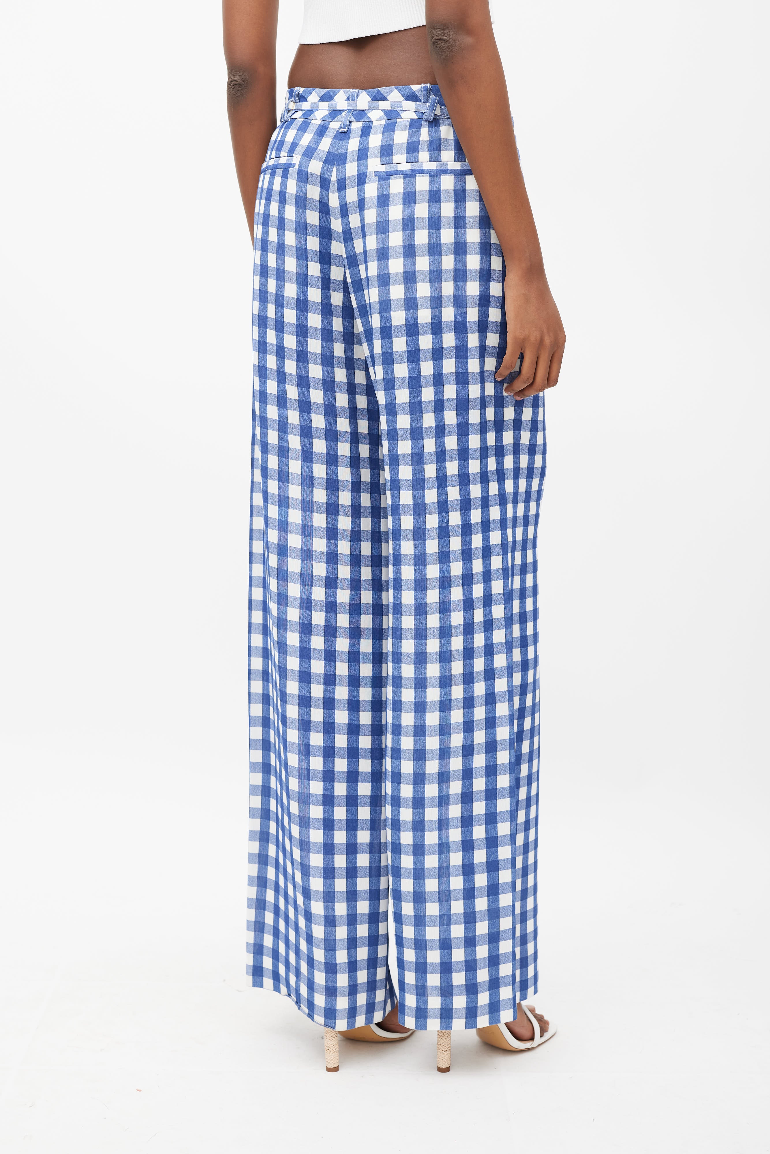 Pre-owned Jacquemus Le Splash blue and white gingham co-ord set featuring a shirt with a pointed collar, two slash pockets at front hip, long sleeves with buttoned cuffs, split open back with adjustable straps, and partially concealed front button closure. Matching trousers feature high waist with adjustable strap at back, wide straight leg, four pocket styling, and front zip closure with top hook fastening.