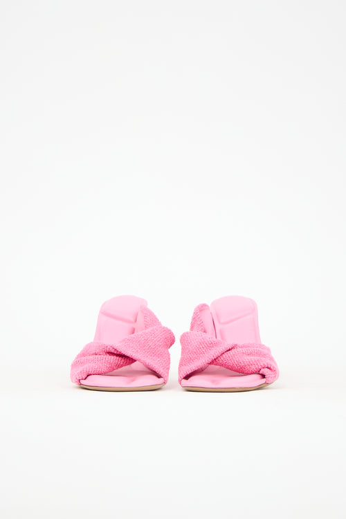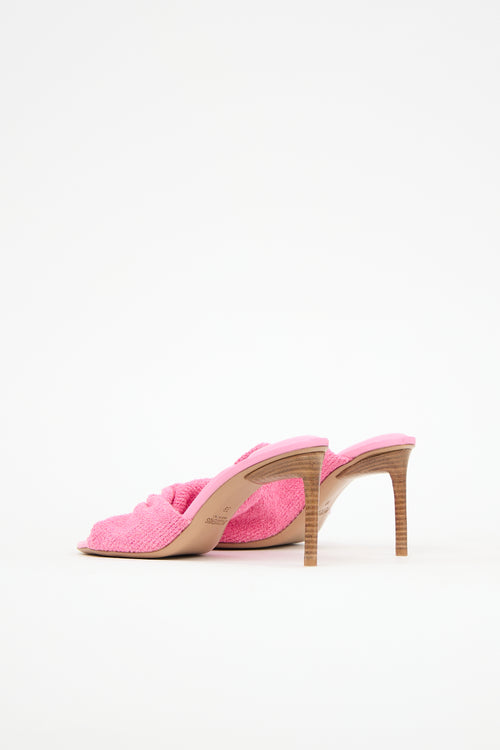 Pre-owned Jacquemus pink Les Mules Bagnu heels featuring a ribbed terry cloth folded strap across vamp, slip on entry, padded leather insole with debossed logo, and a stacked stiletto heel.