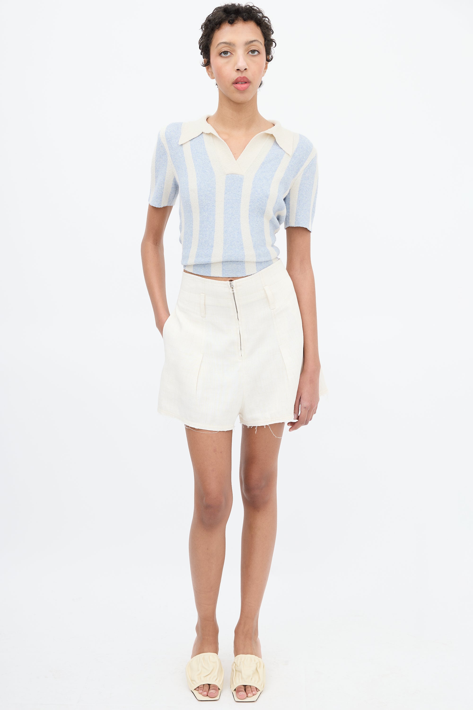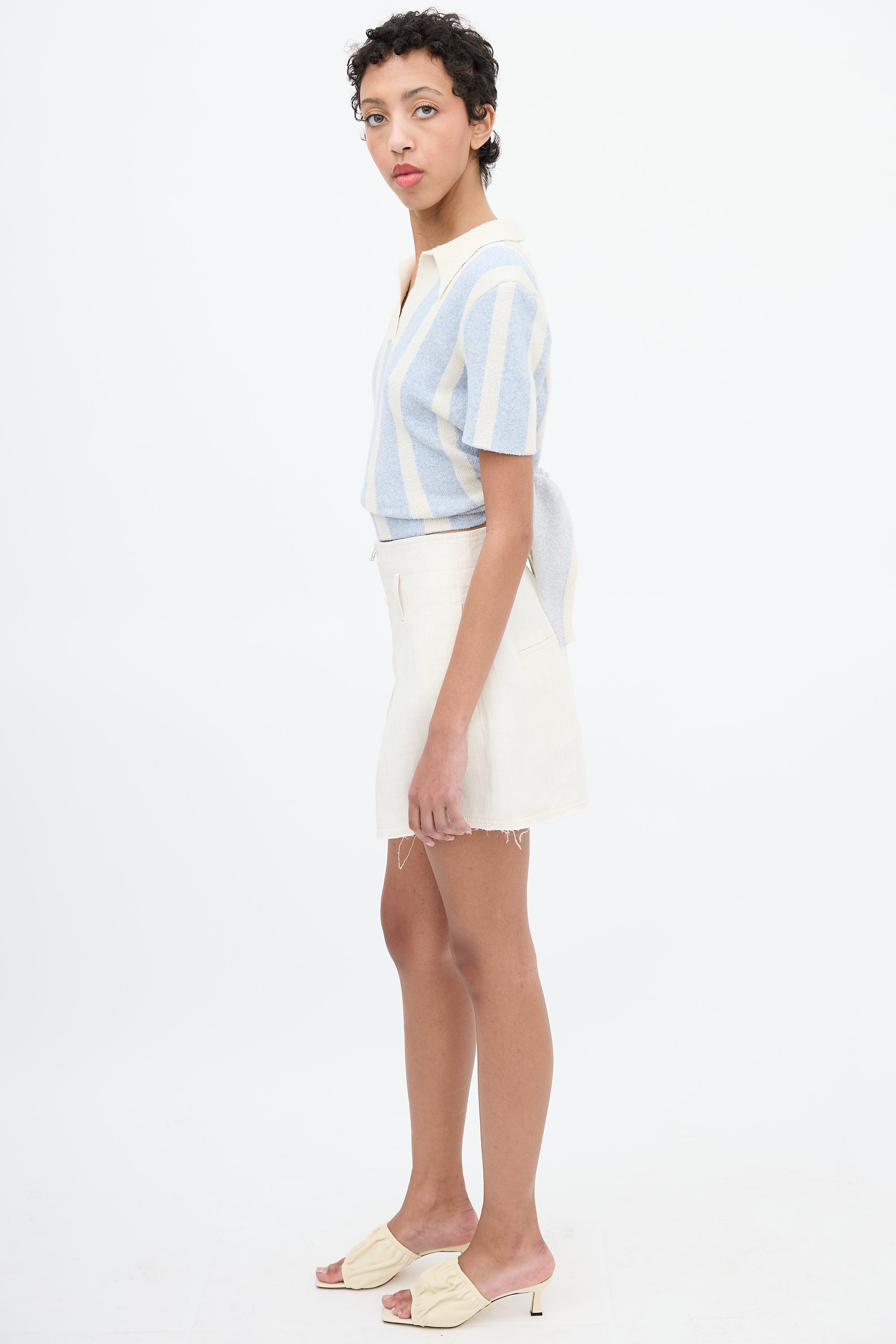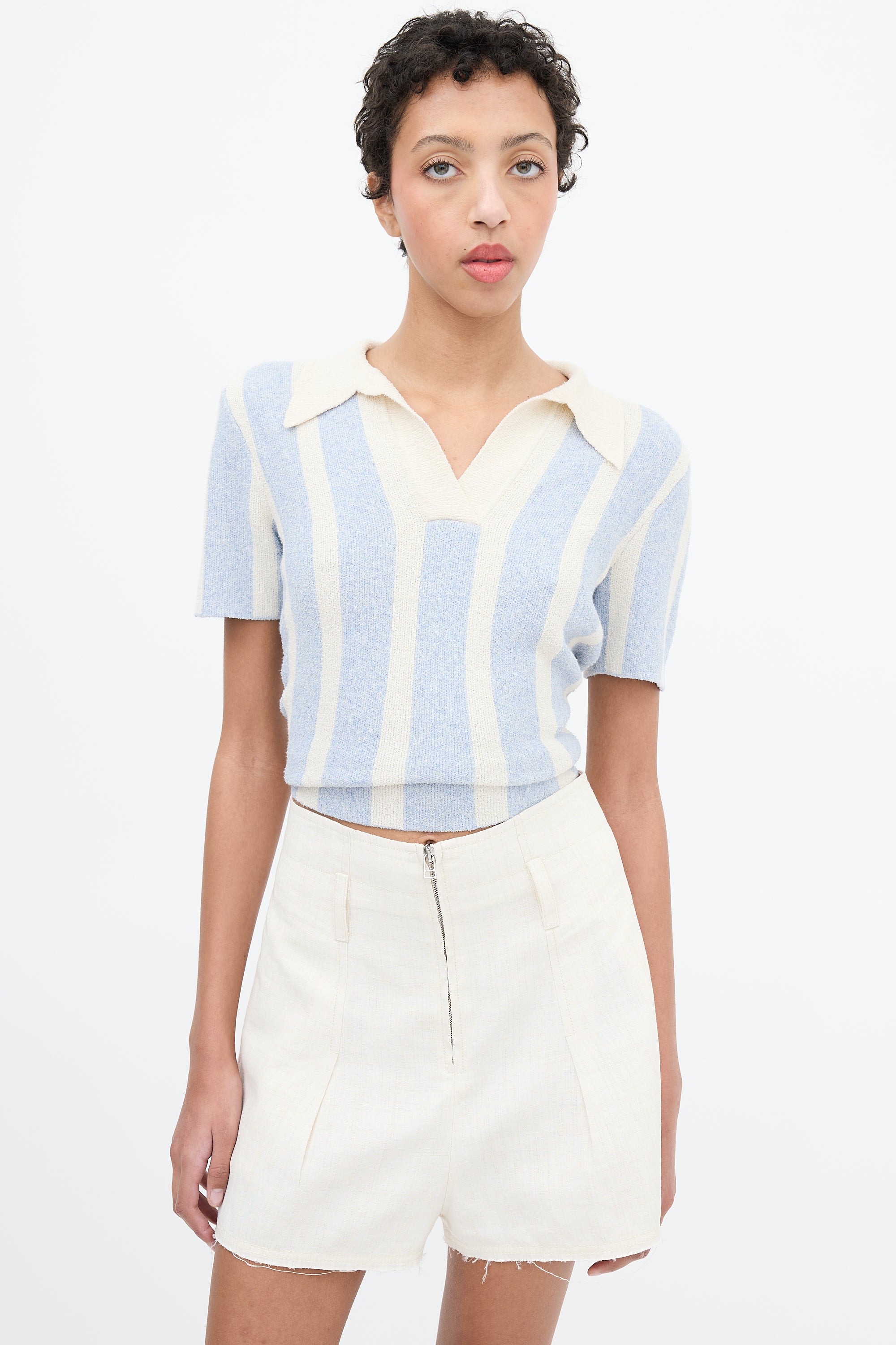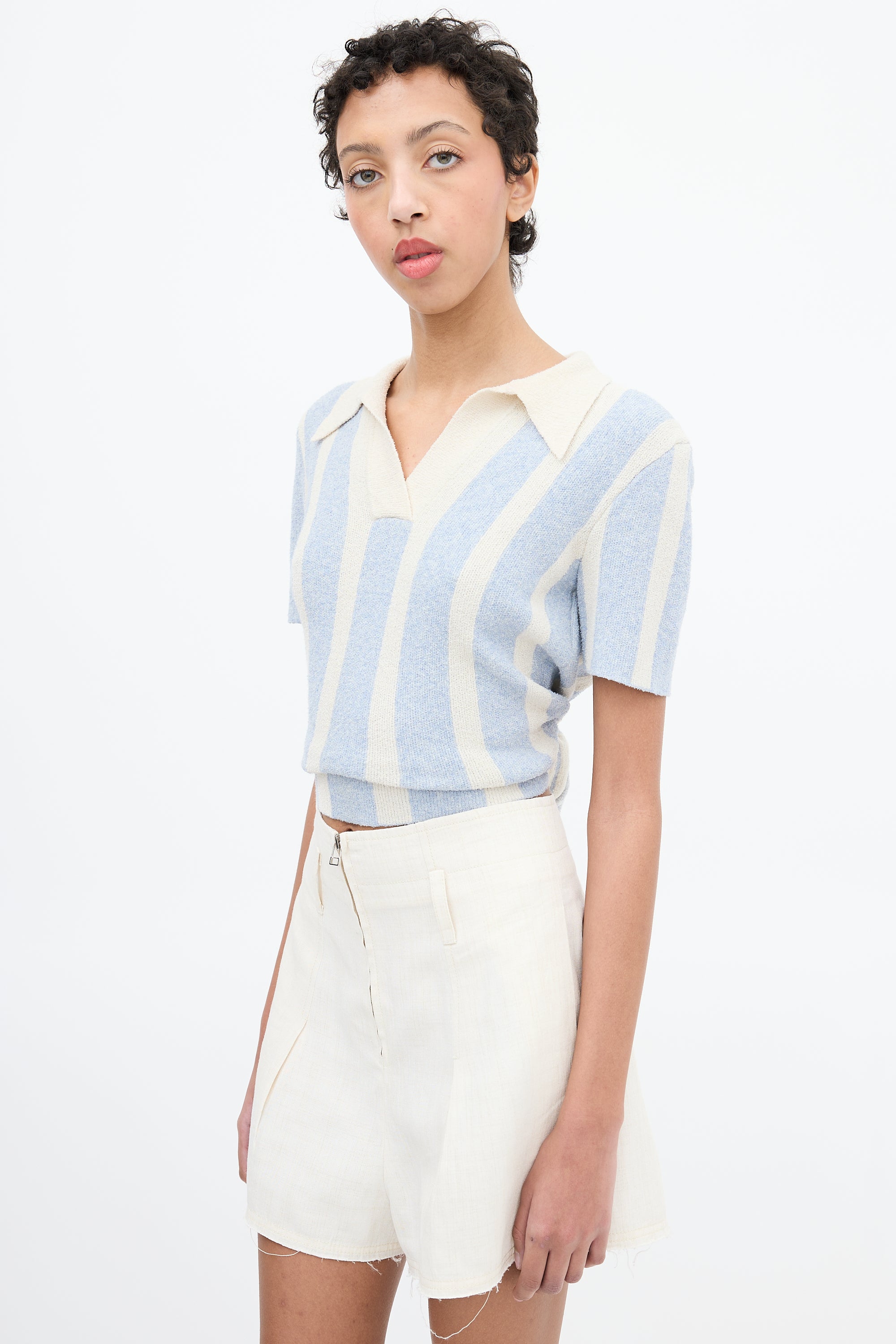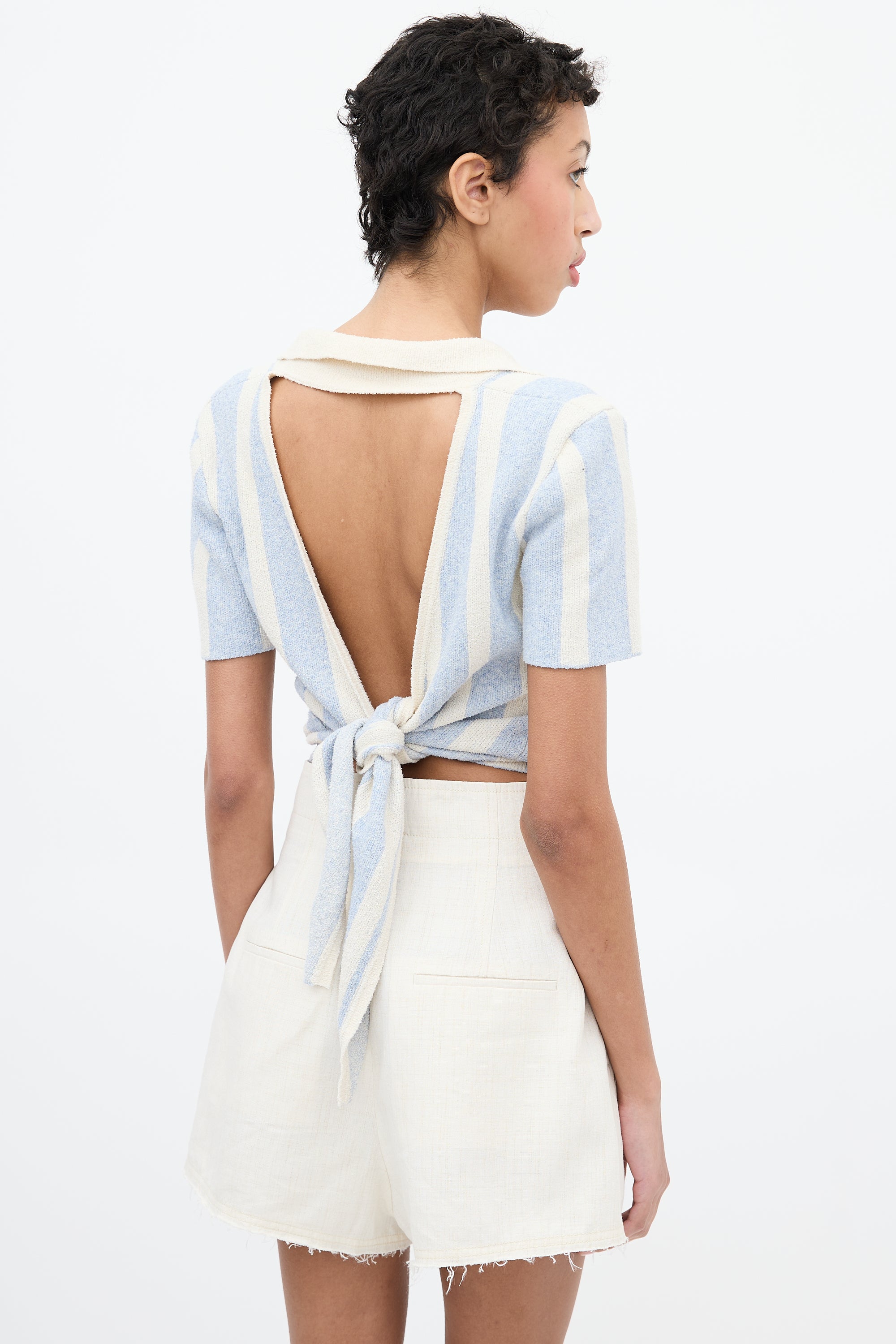 Pre-owned Jacquemus light blue and white terry polo top featuring vertical stripes, Johnny collar, and open tie back.