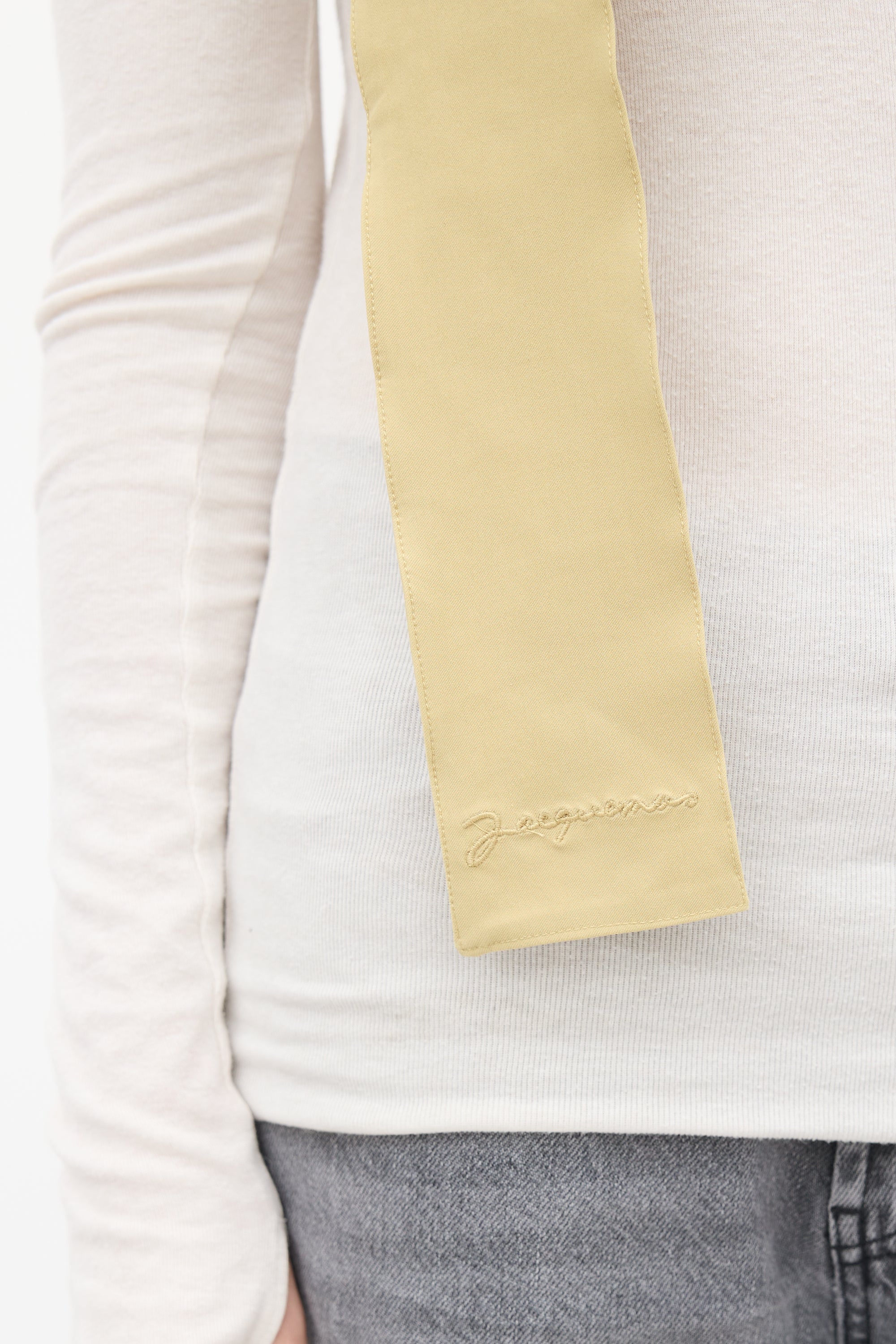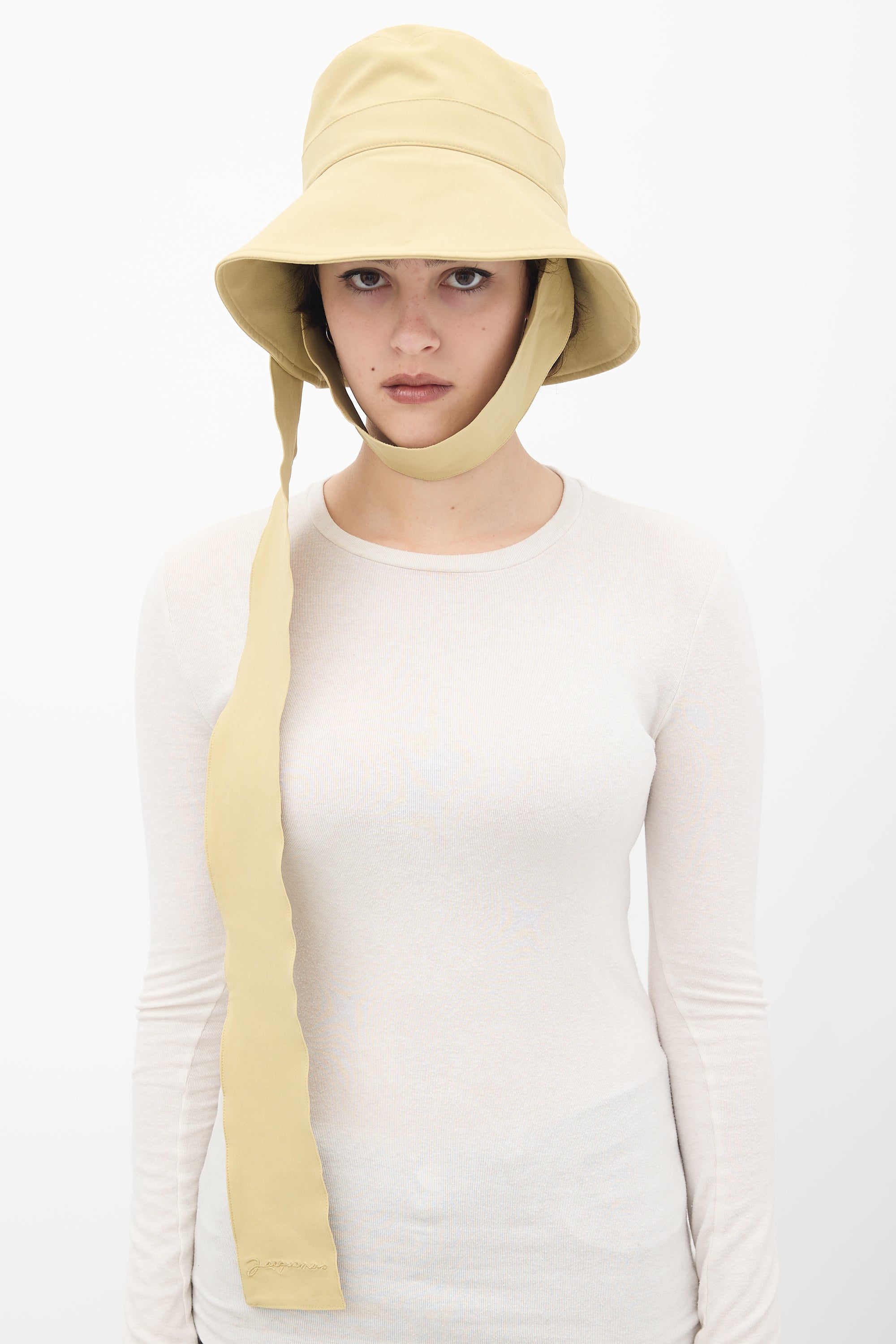 Pre-owned Jacquemus light green nylon and cotton blend Le Bob Bando bucket hat featuring a wide brim and wide adjustable chin strap with embroidered logo at end.