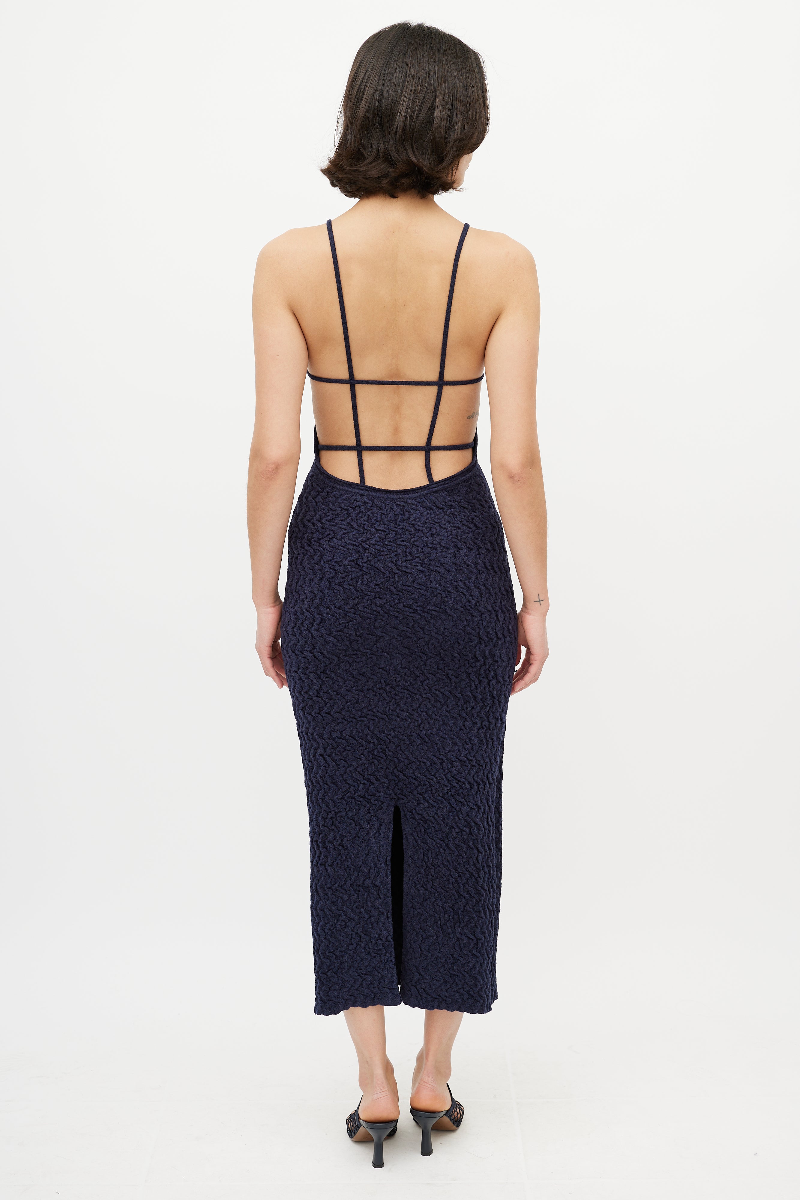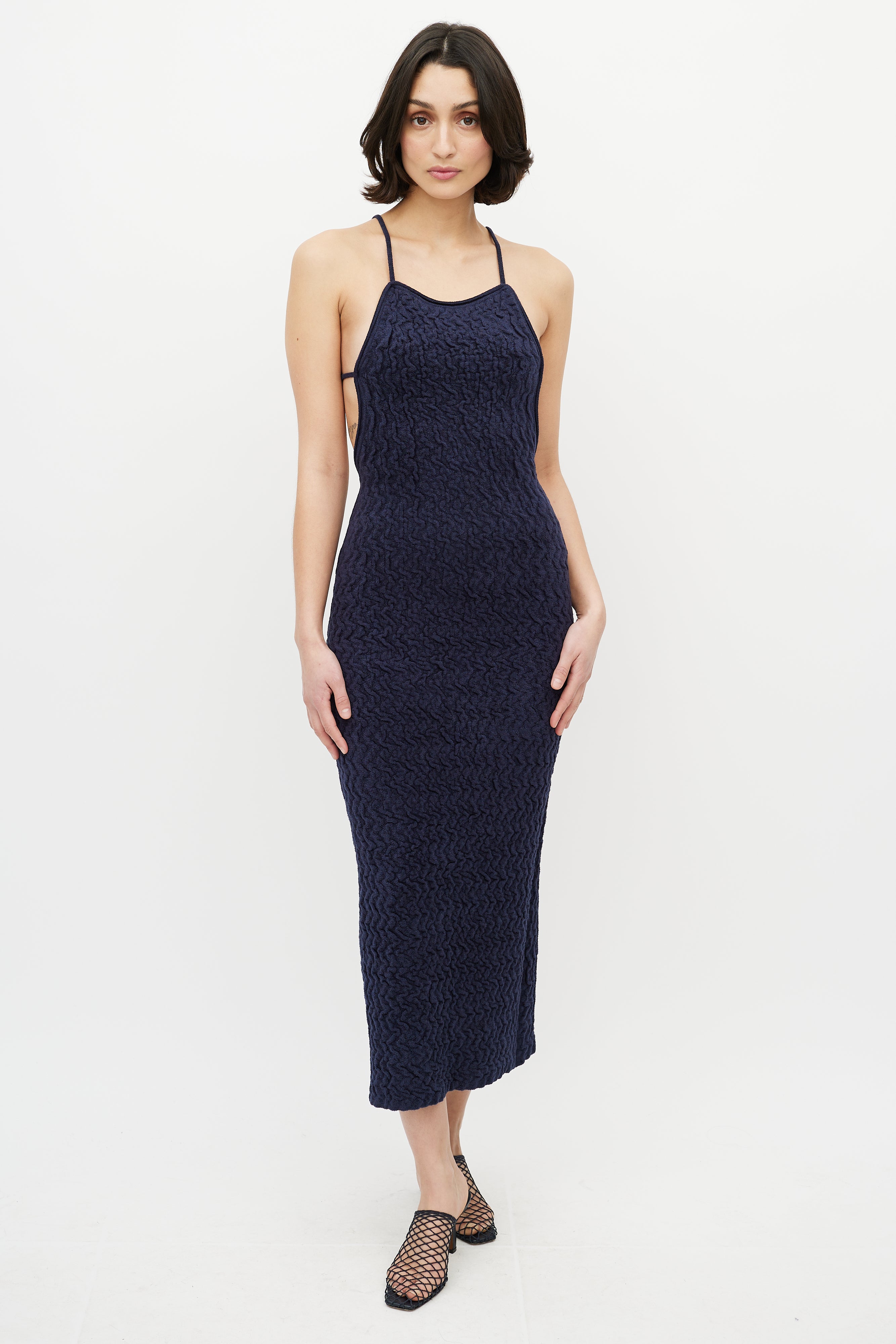 Pre-owned Jacquemus navy Maille Velour dress featuring square neckline, backless design with criss cross straps, spaghetti shoulder straps, back slit, and wavy texture throughout.
