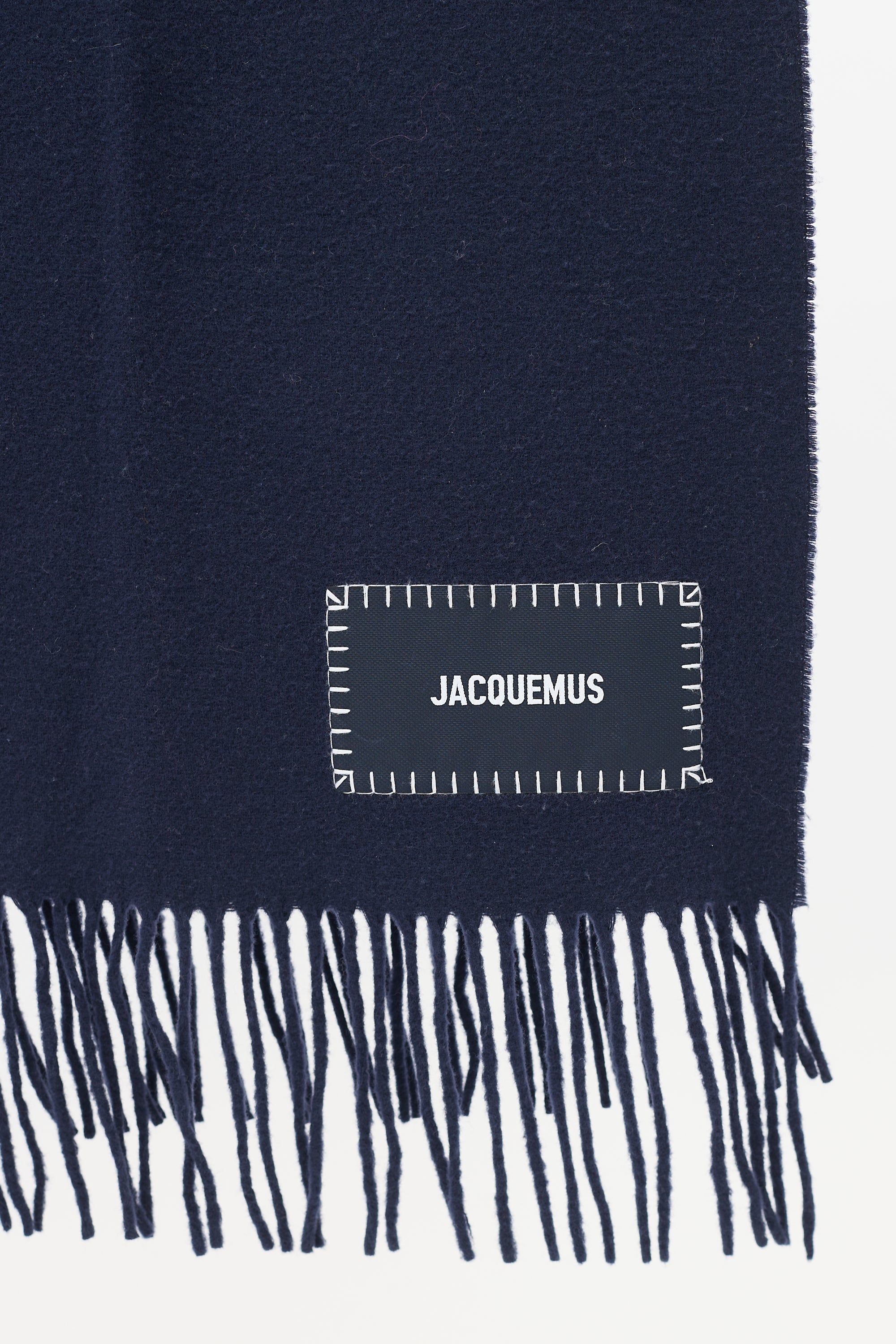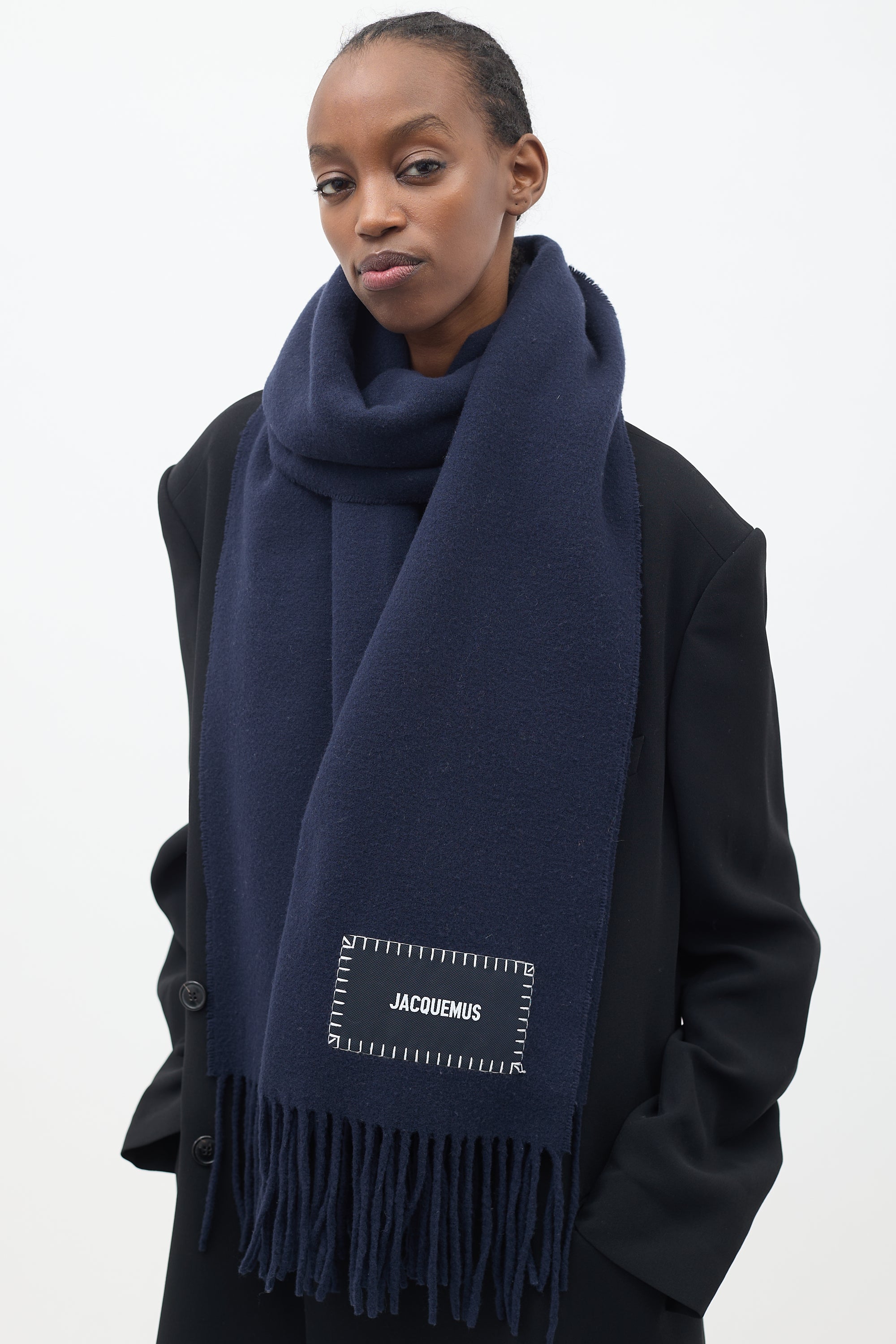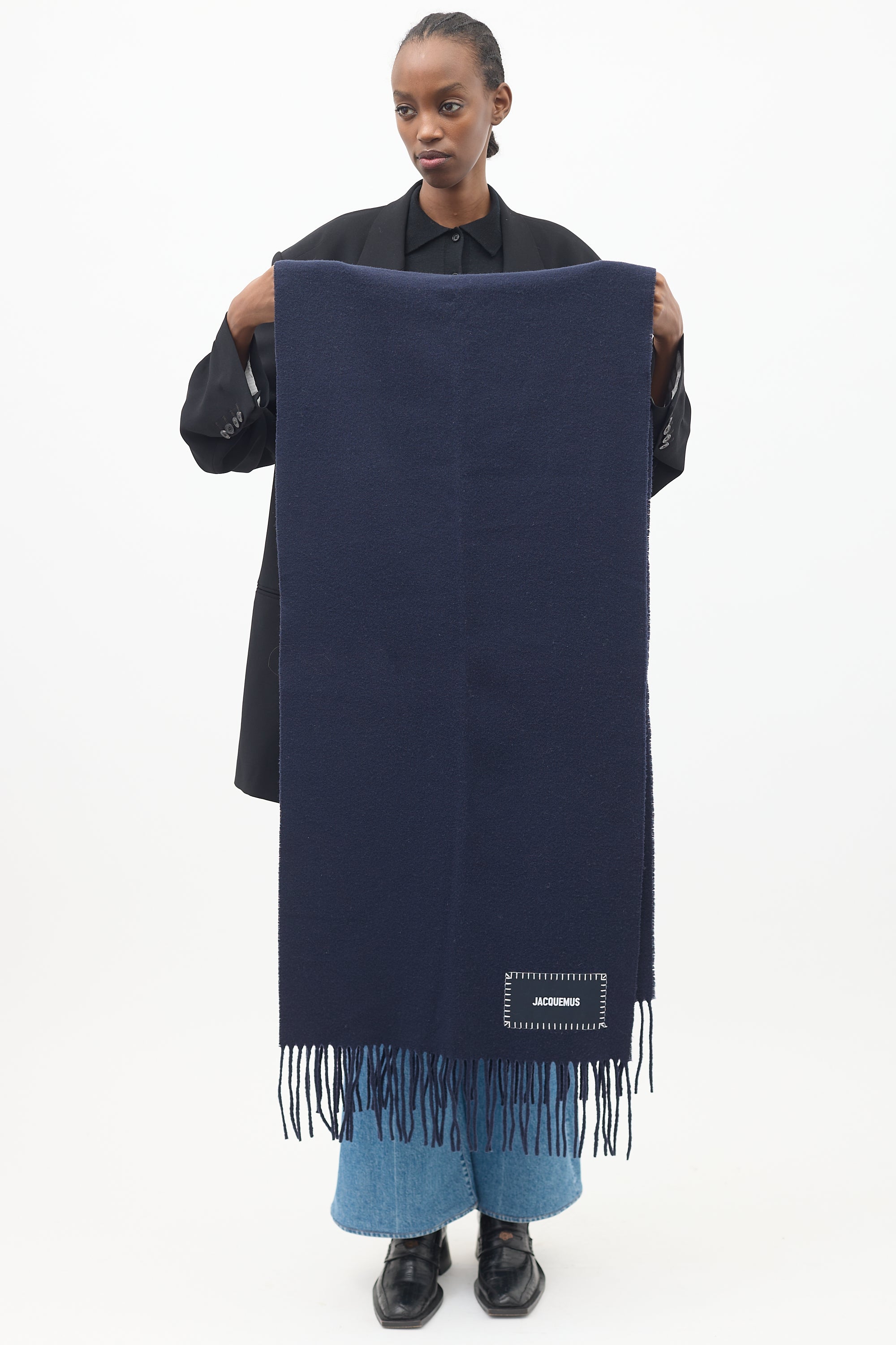 Pre-owned Jacquemus navy wool scarf featuring navy and white logo tab at one end, and fringe and both ends.