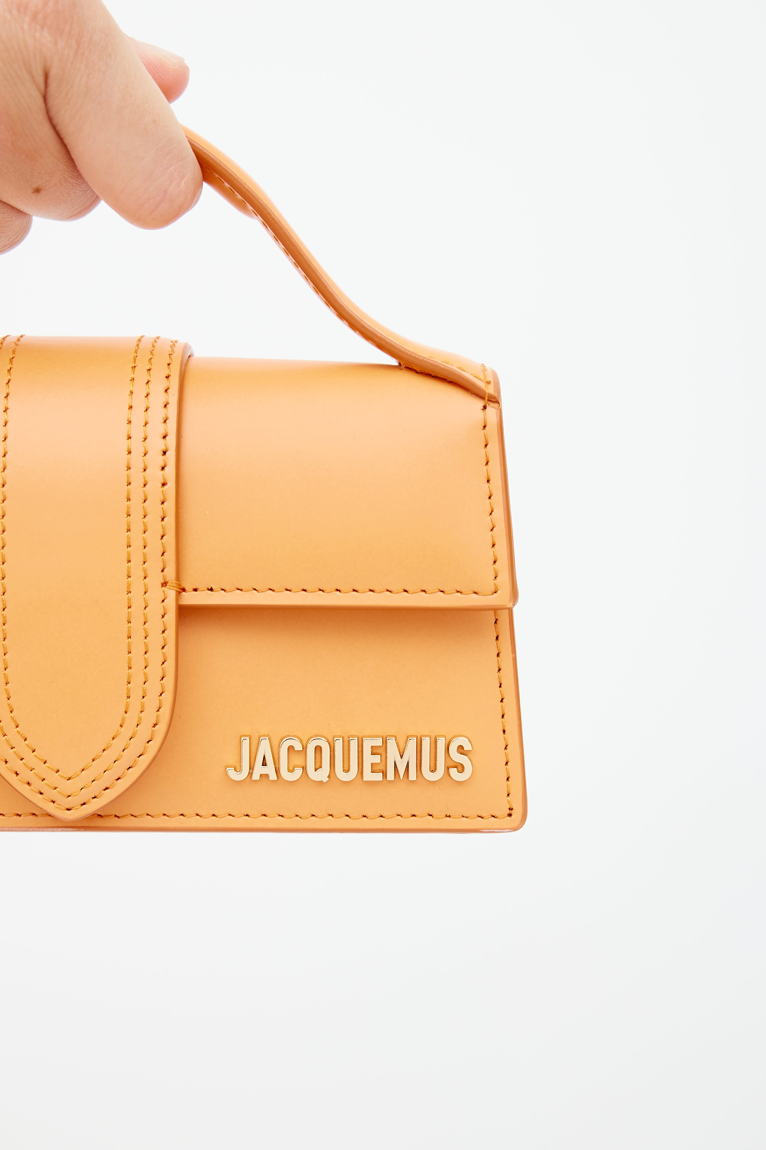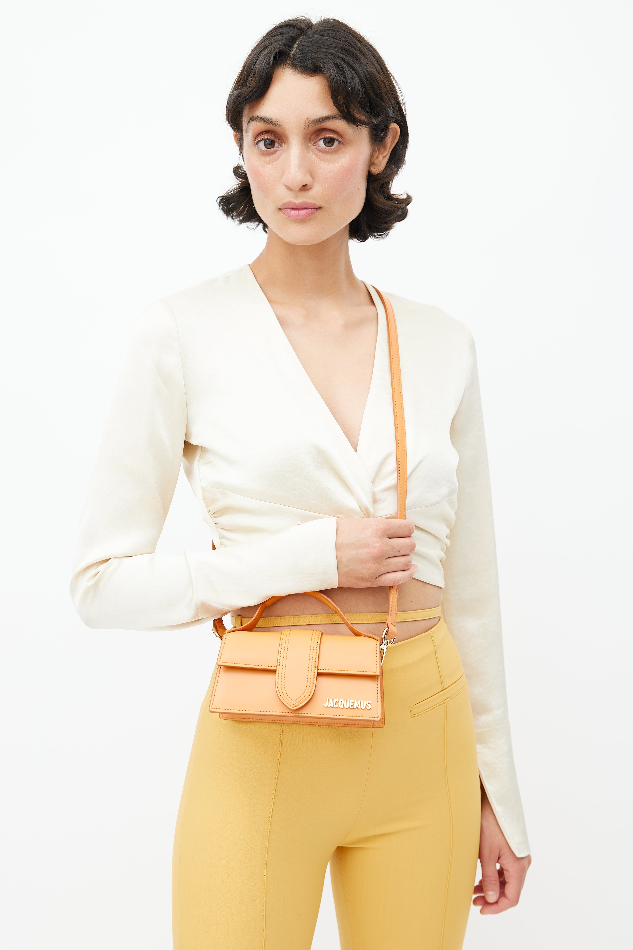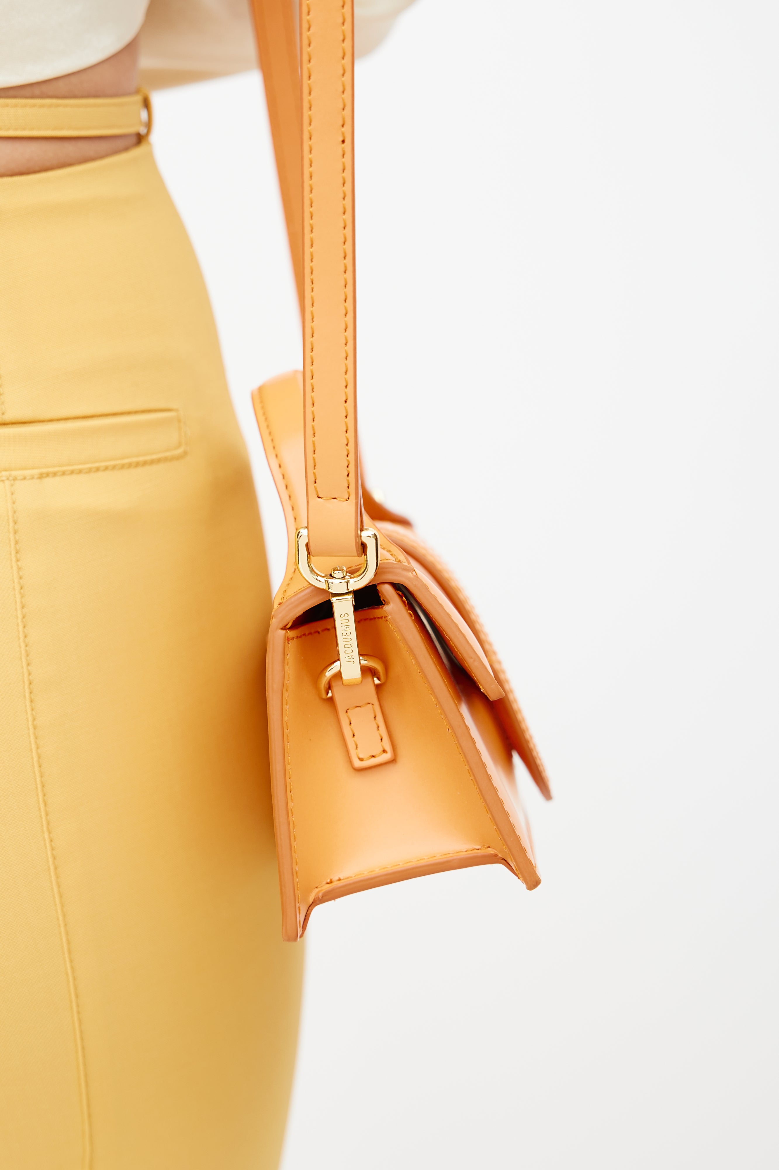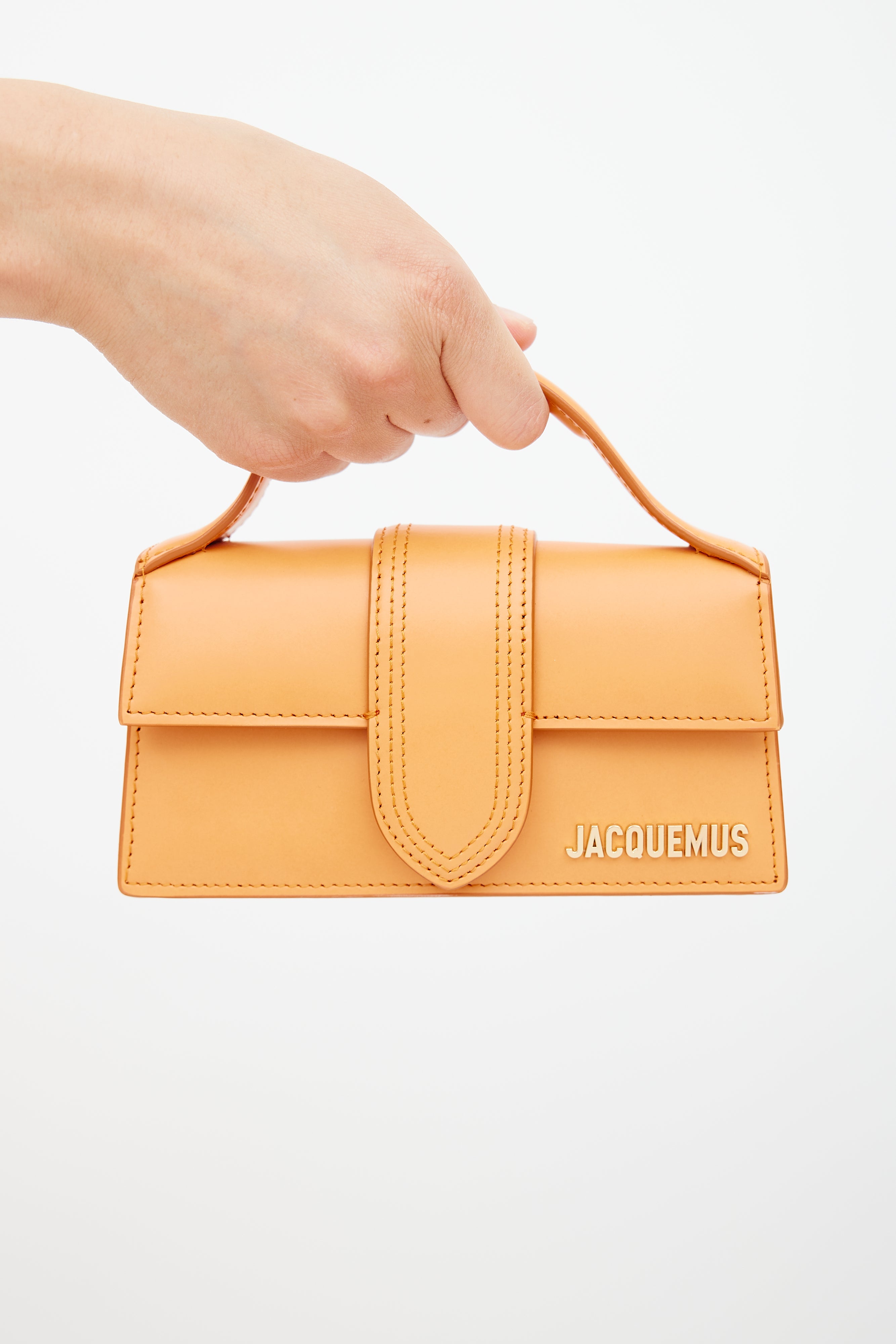 Pre-owned Jacquemus orange Le Bambino crossbody bag featuring flat top handle, tonal stitch throughout, magnetic closure, gold tone logo at face, slip pocket at back, detachable shoulder strap, and lined main compartment. Comes with original dust bag. From the Le Raphia collection.