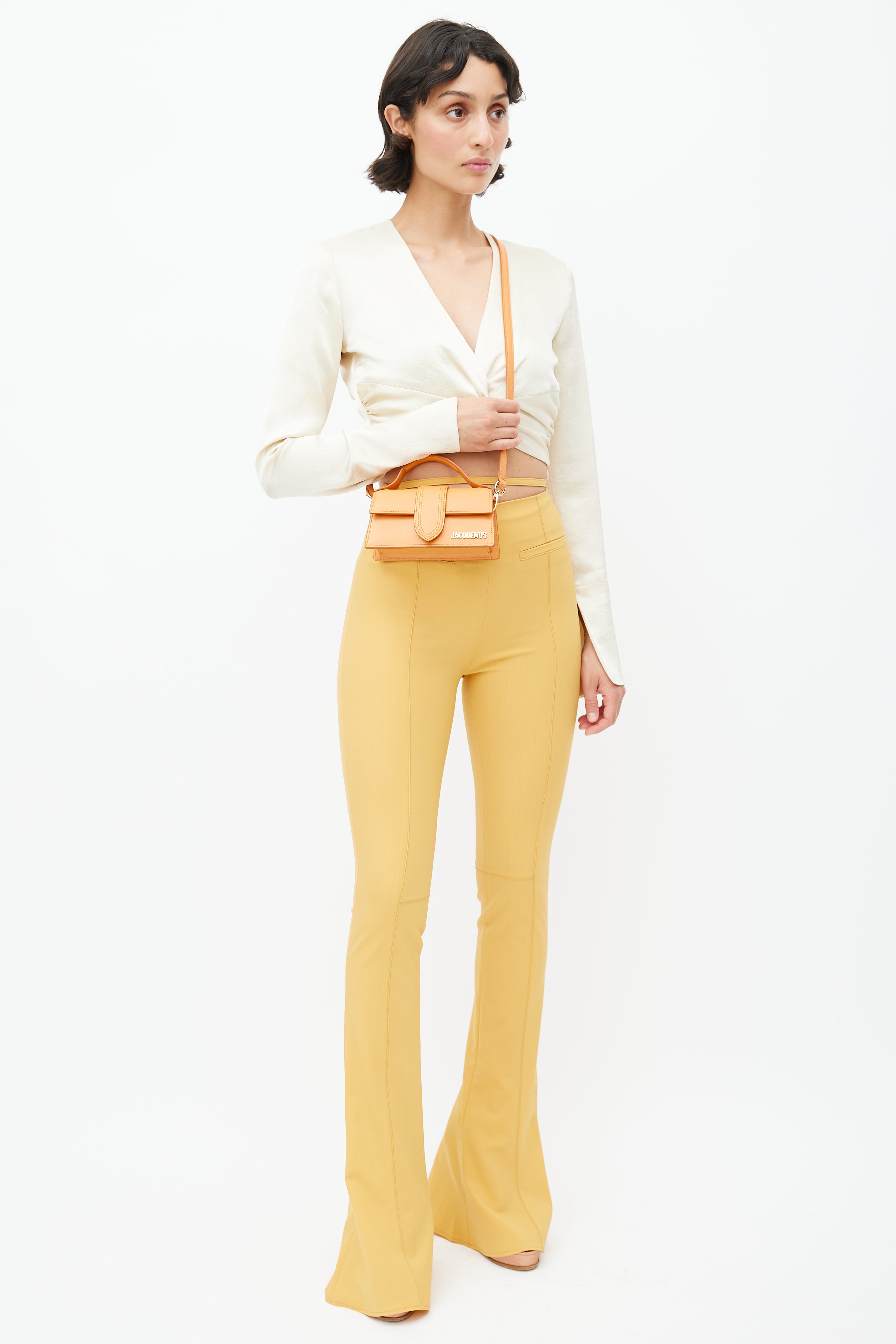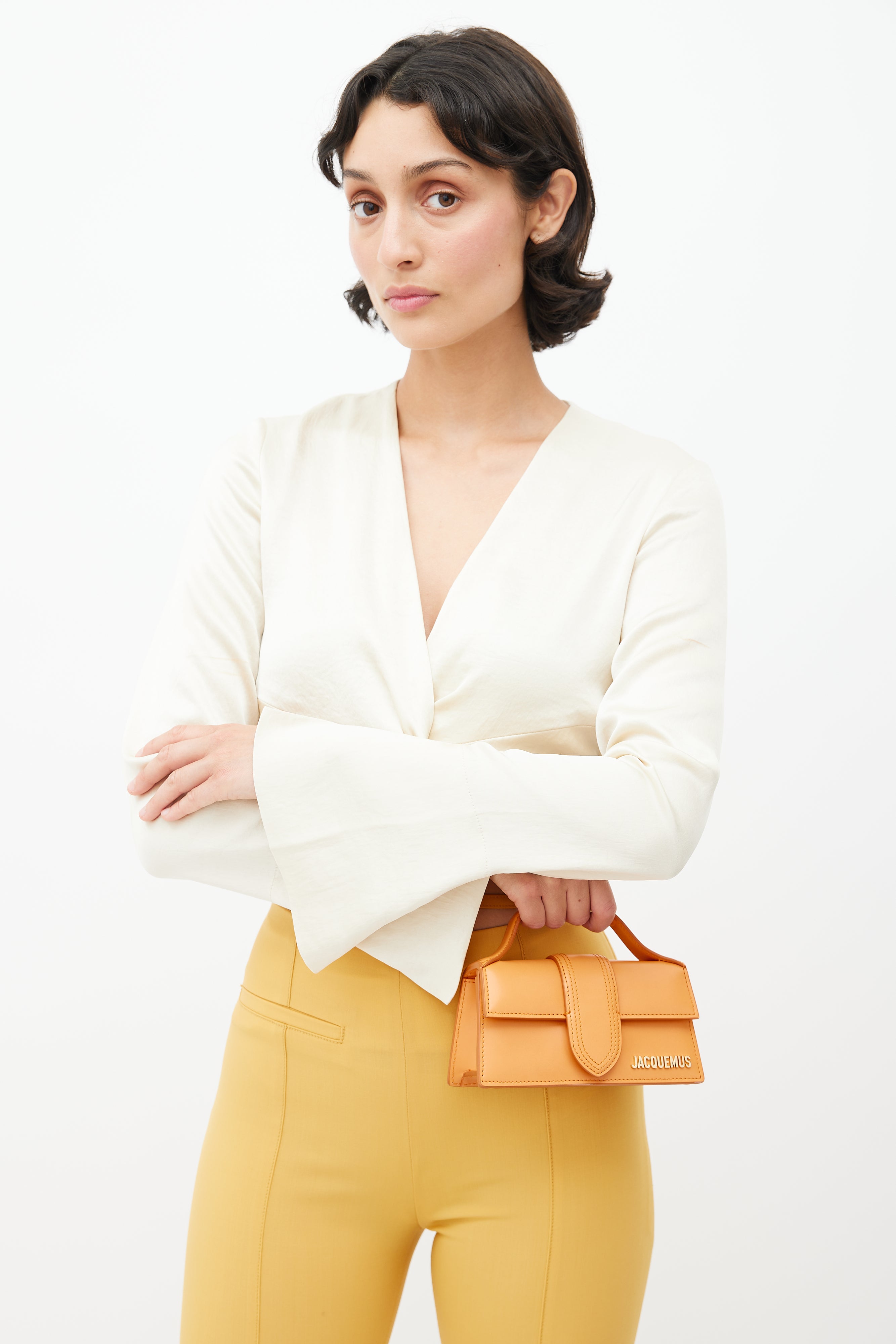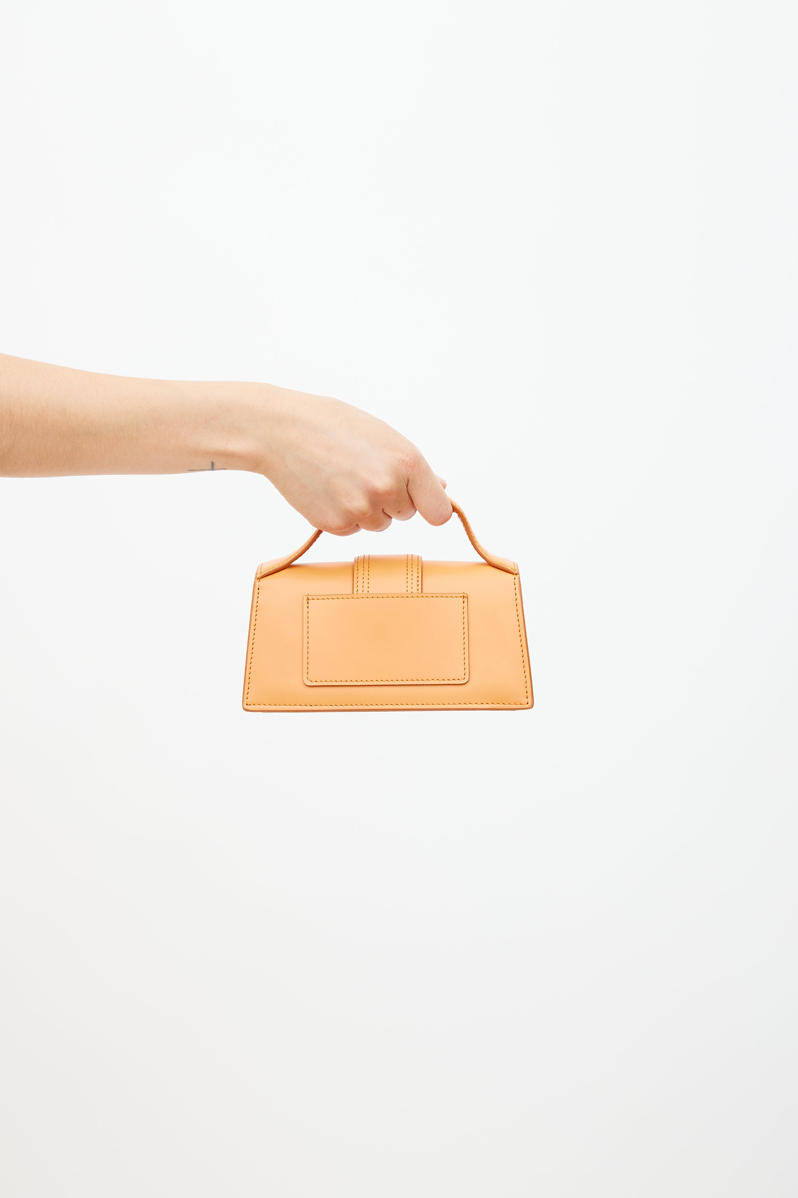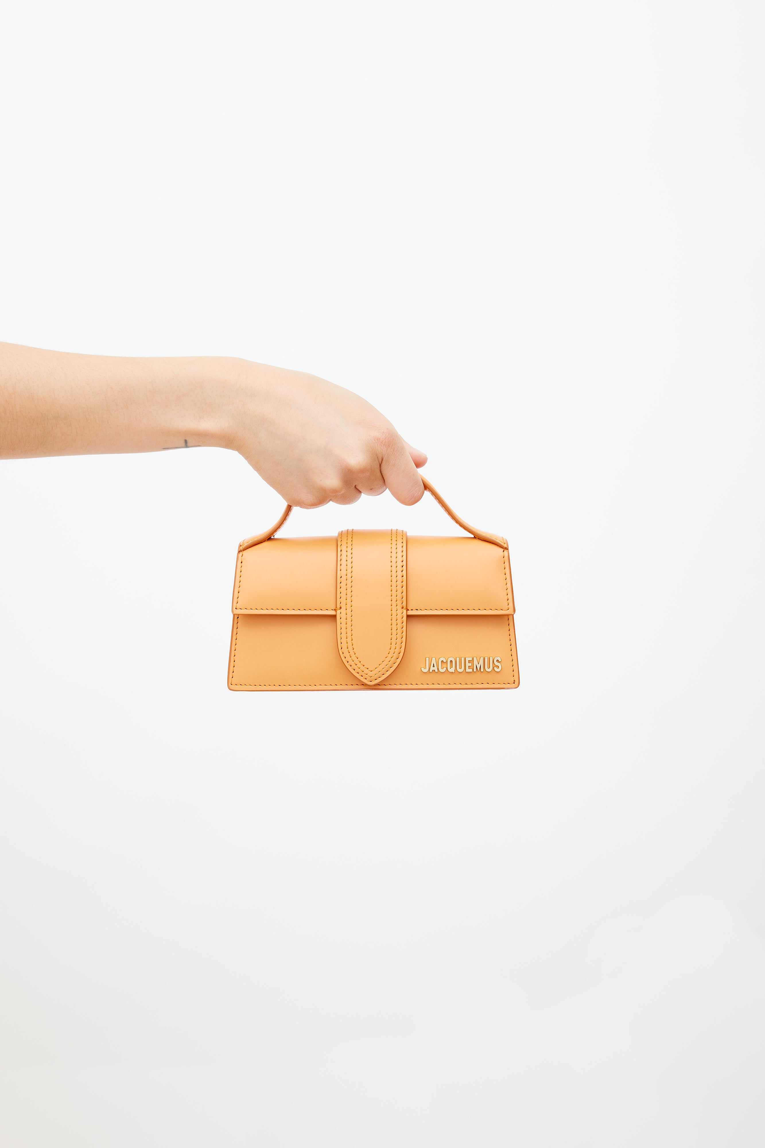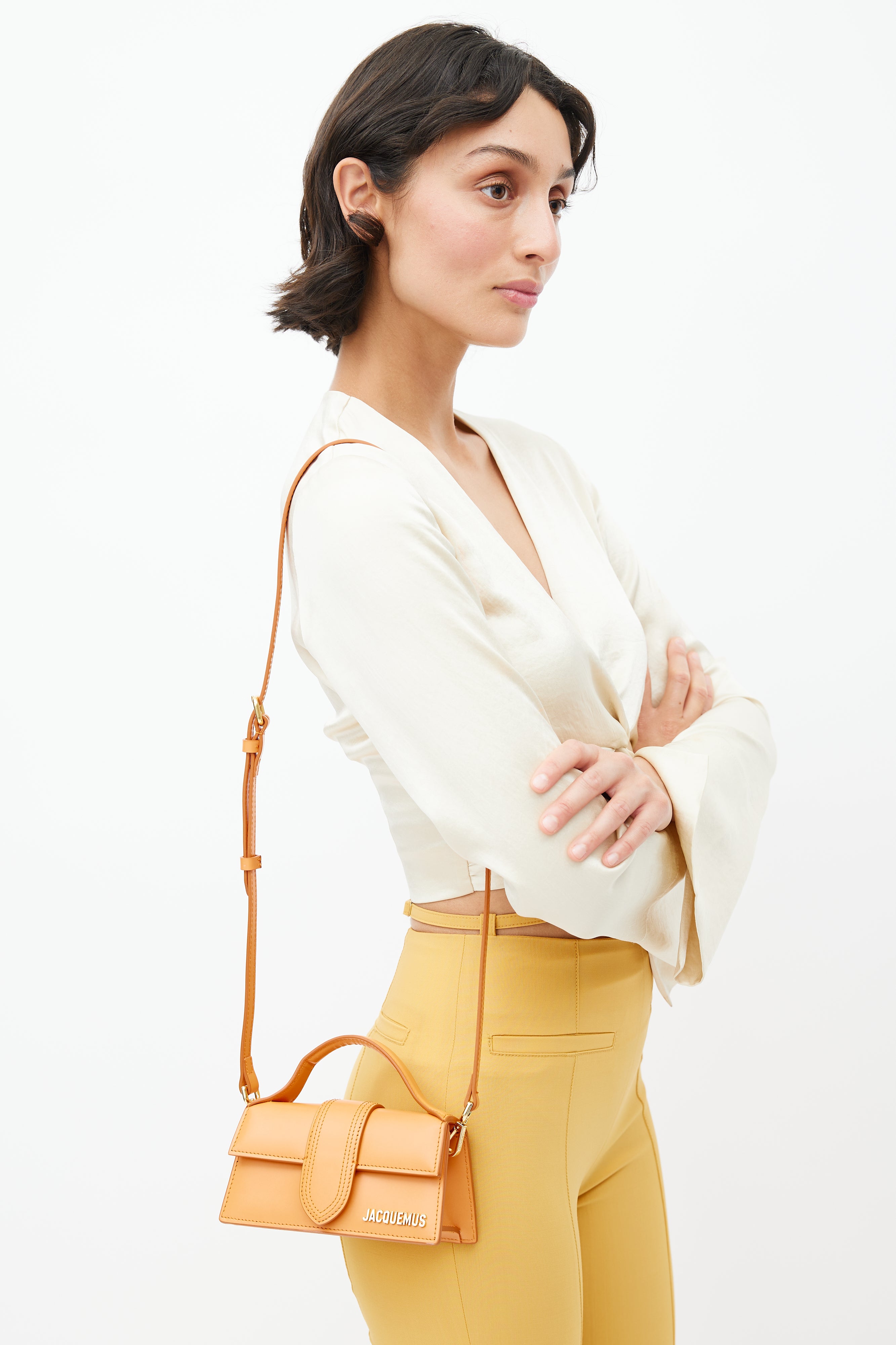 Pre-owned Jacquemus orange Le Bambino crossbody bag featuring flat top handle, tonal stitch throughout, magnetic closure, gold tone logo at face, slip pocket at back, detachable shoulder strap, and lined main compartment. Comes with original dust bag. From the Le Raphia collection.
