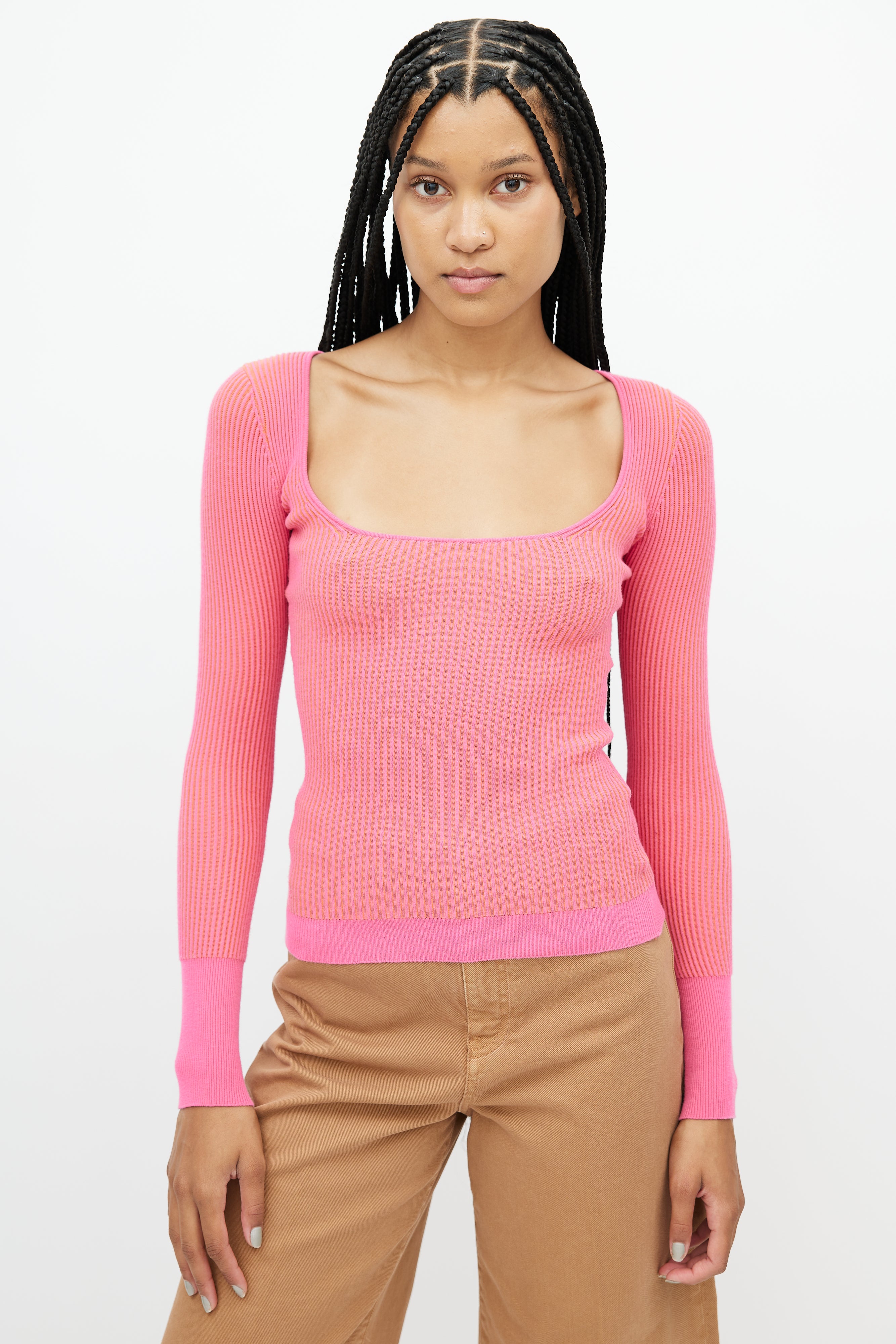 Pre-owned Jacquemus pink and orange ribbed top featuring a scoop neckline, and long sleeves.