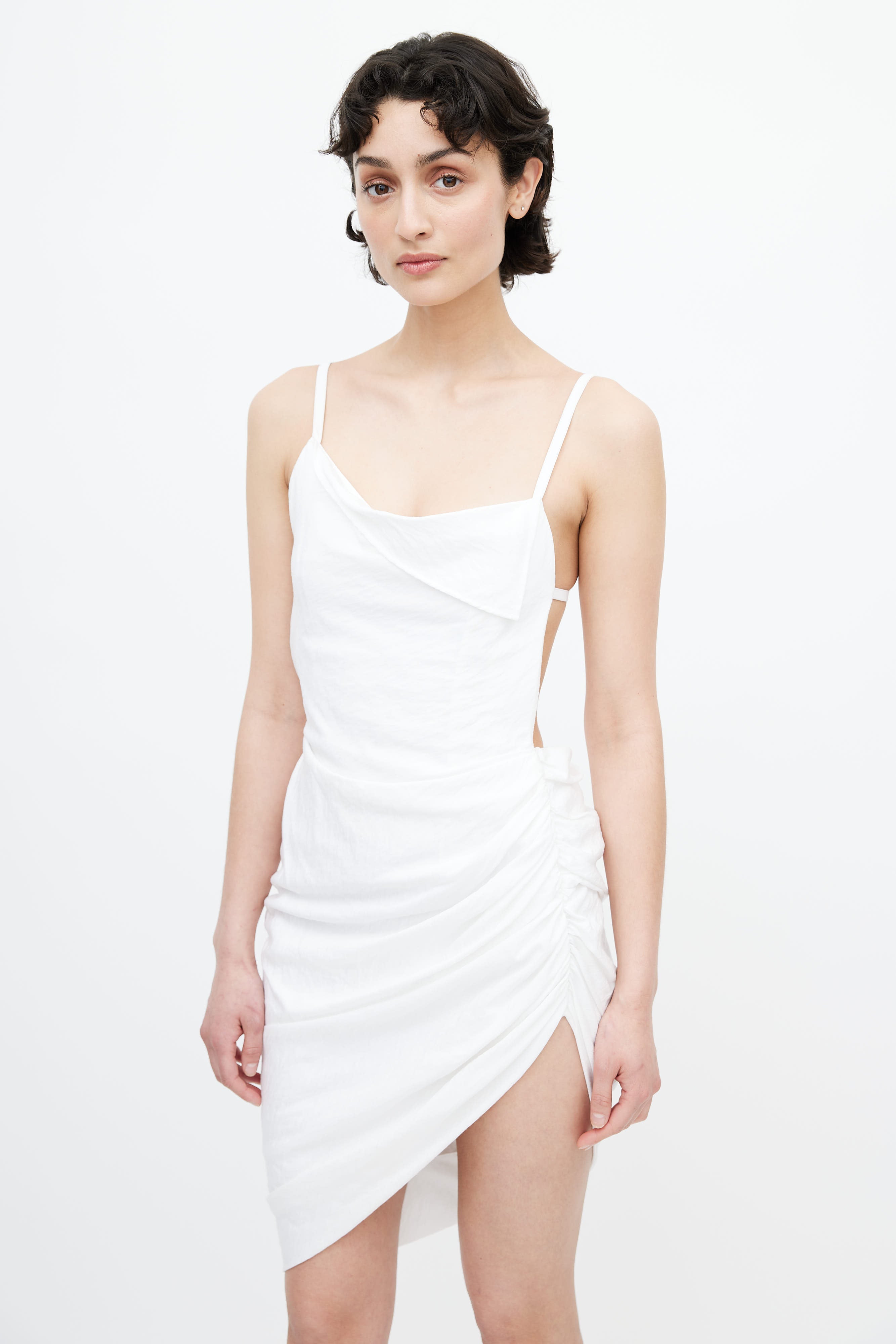 Pre-owned Spring Summer 2022 Jacquemus Le Splash white dress featuring adjustable spaghetti straps, gathered detail at side, concealed zip closure at side, and backless design with buckle fastening. Lined.