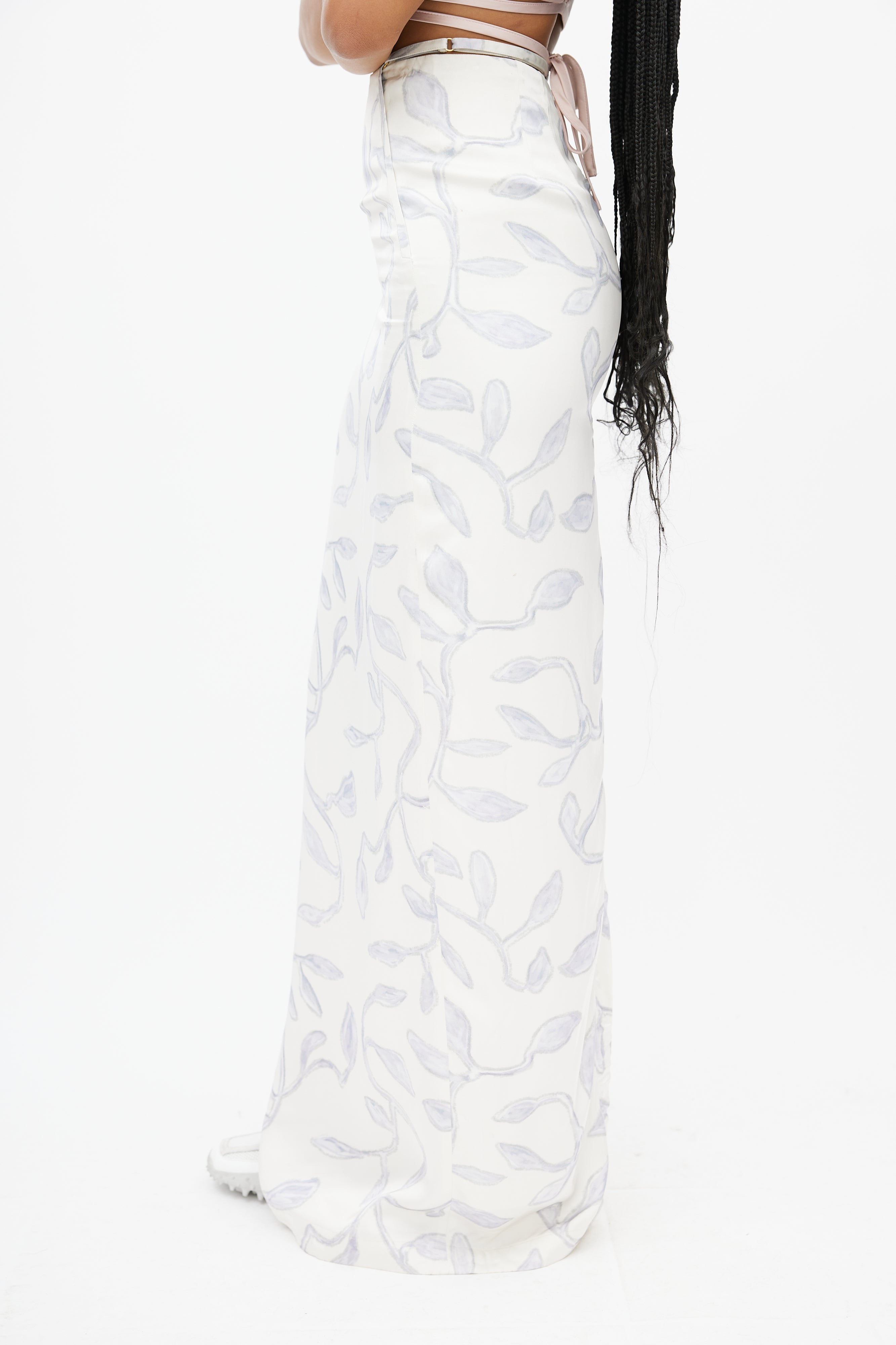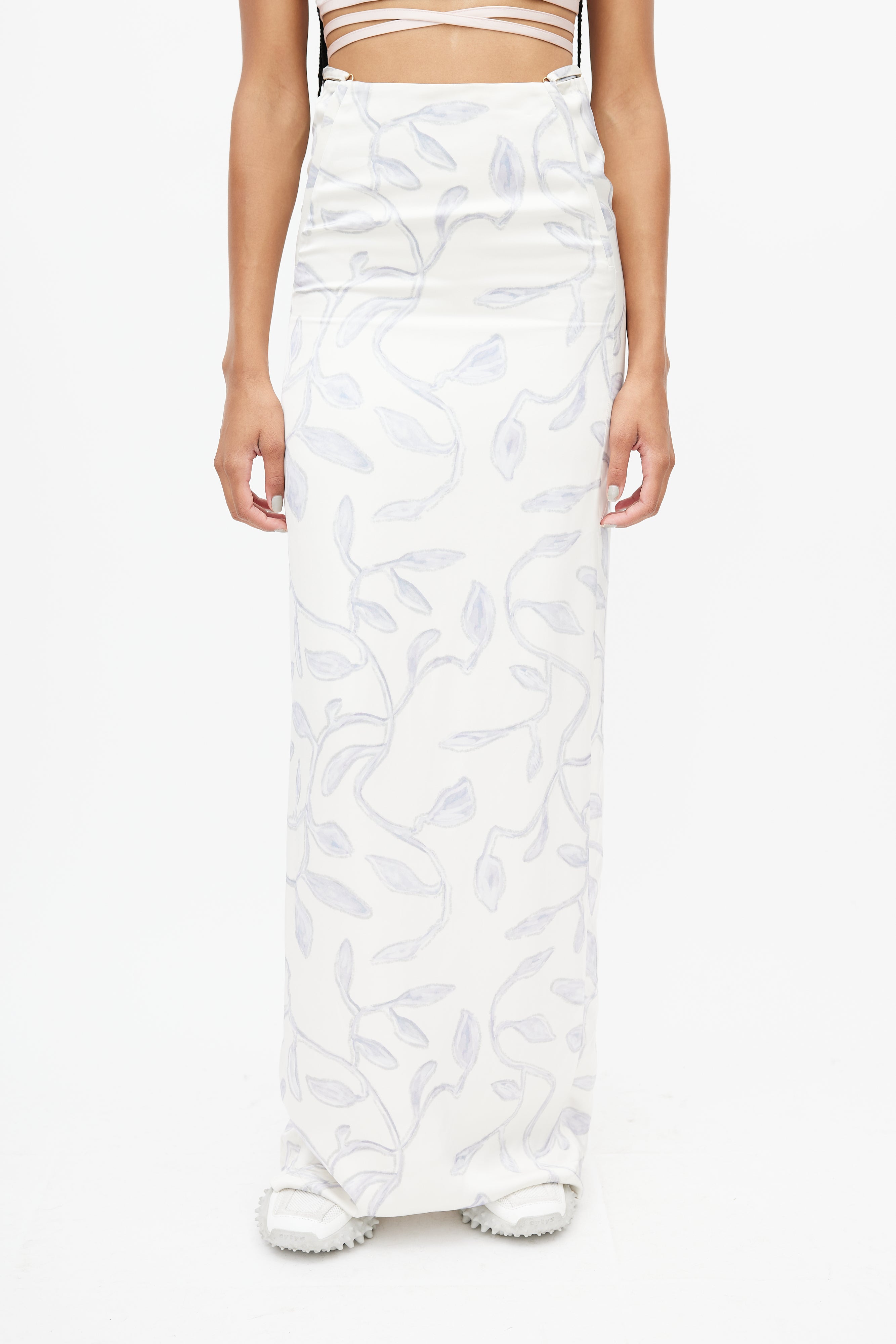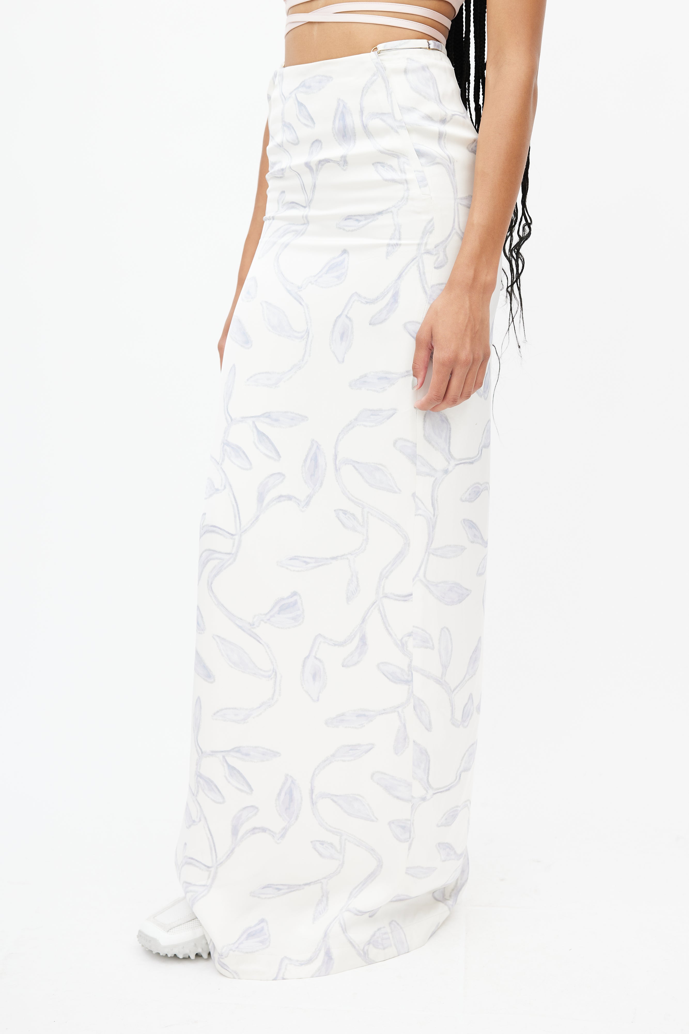 Pre-owned Jacquemus white skirt featuring a blue leaf print throughout, adjustable strap at waist, slit at hem, and zip at back with hook and eye closure.
