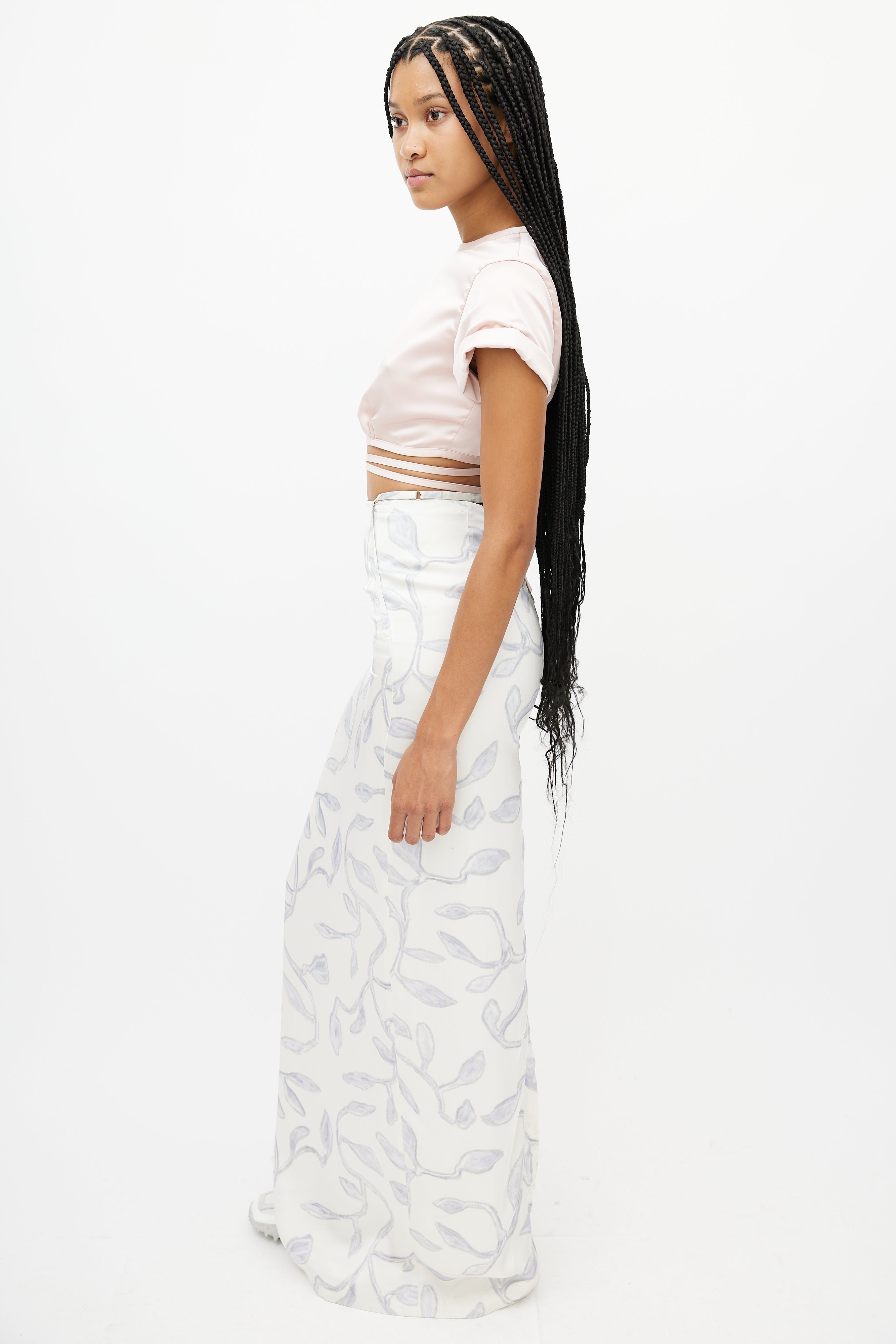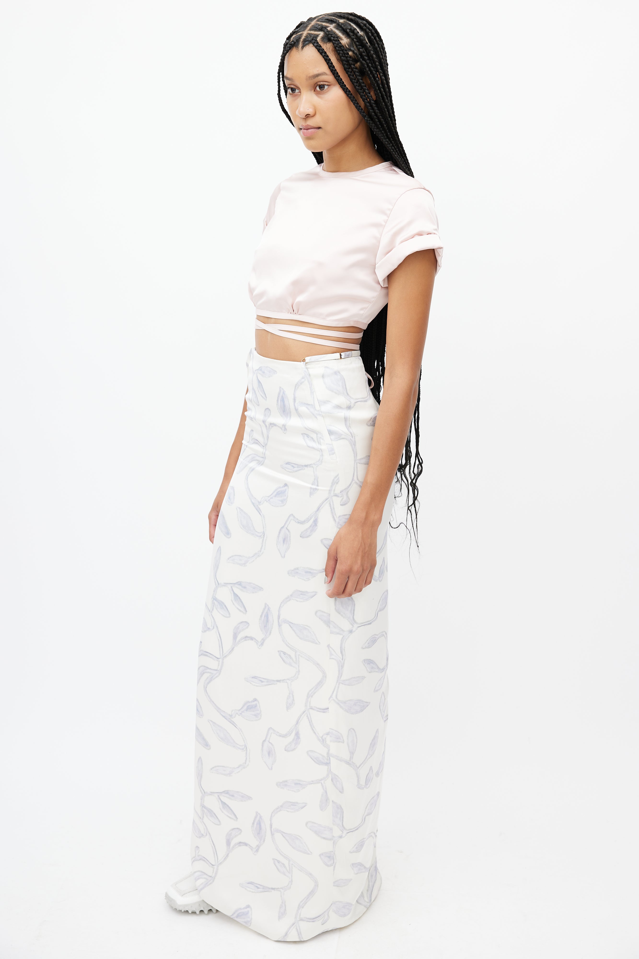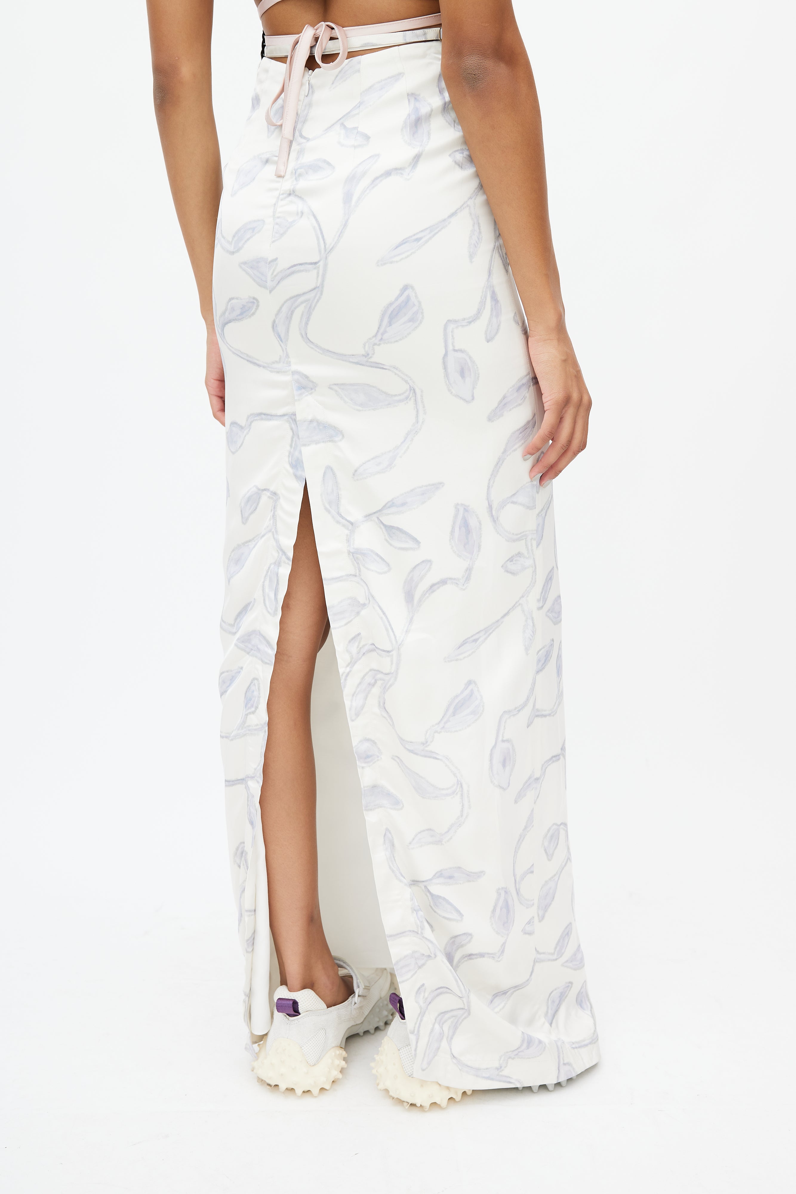 Pre-owned Jacquemus white skirt featuring a blue leaf print throughout, adjustable strap at waist, slit at hem, and zip at back with hook and eye closure.