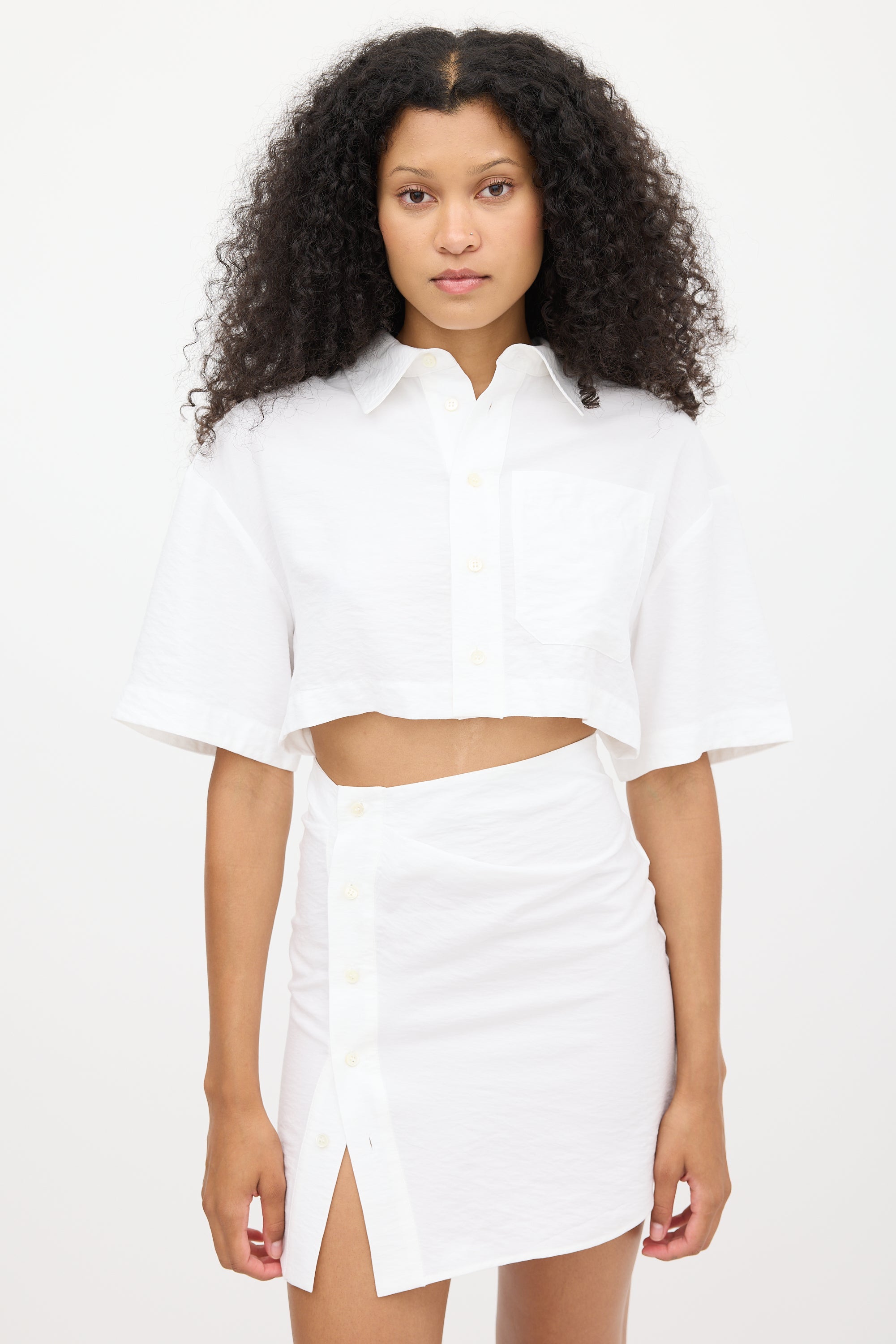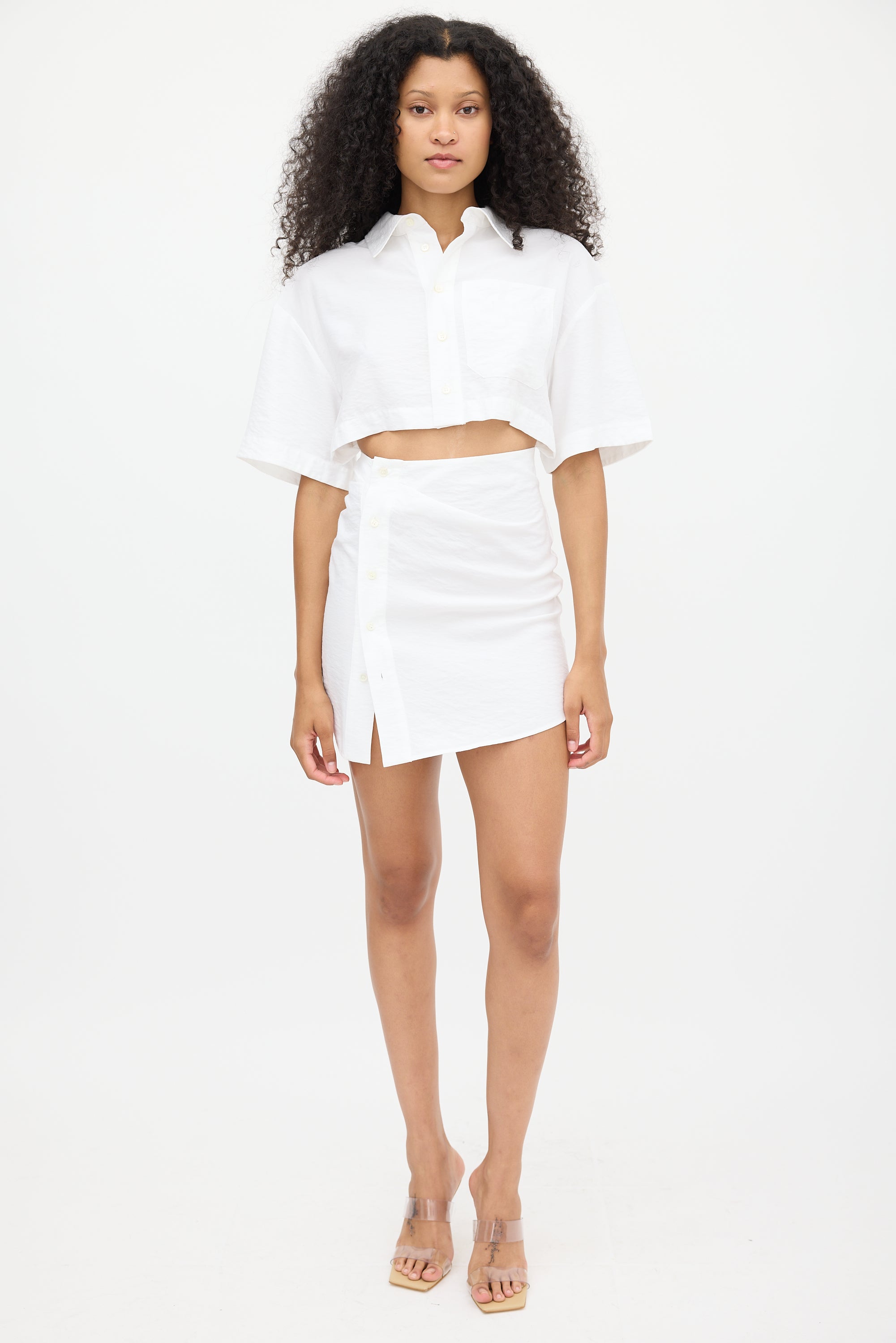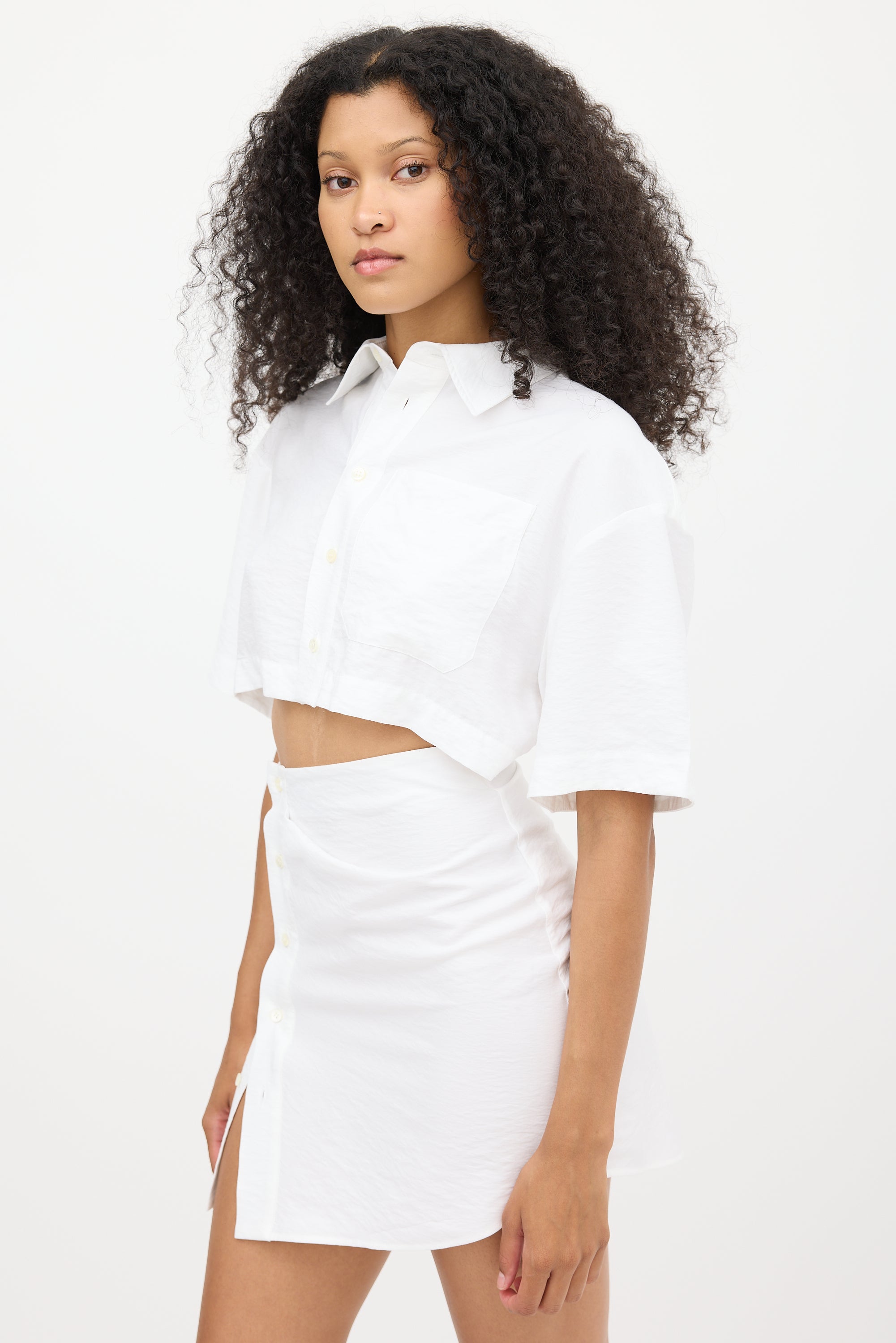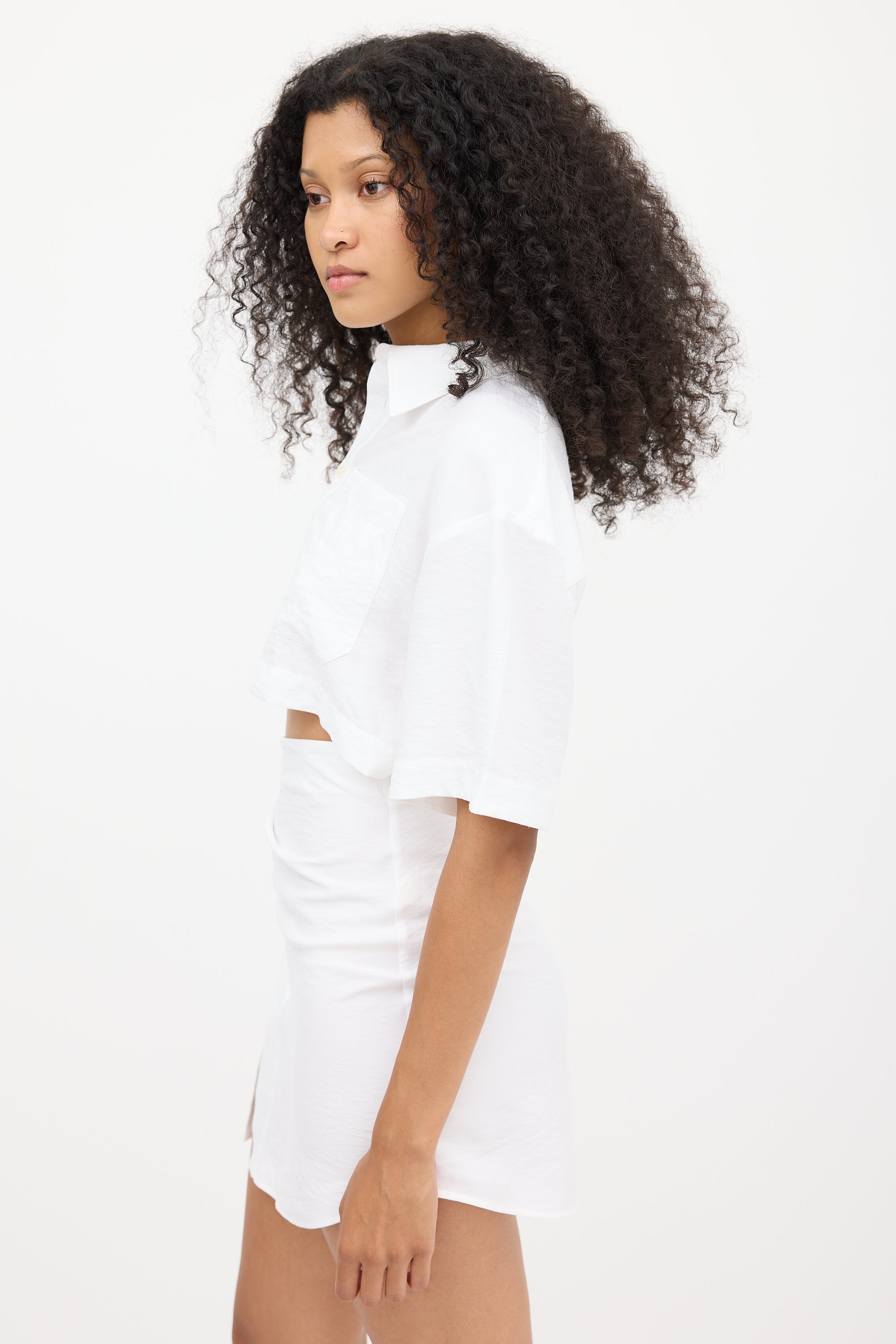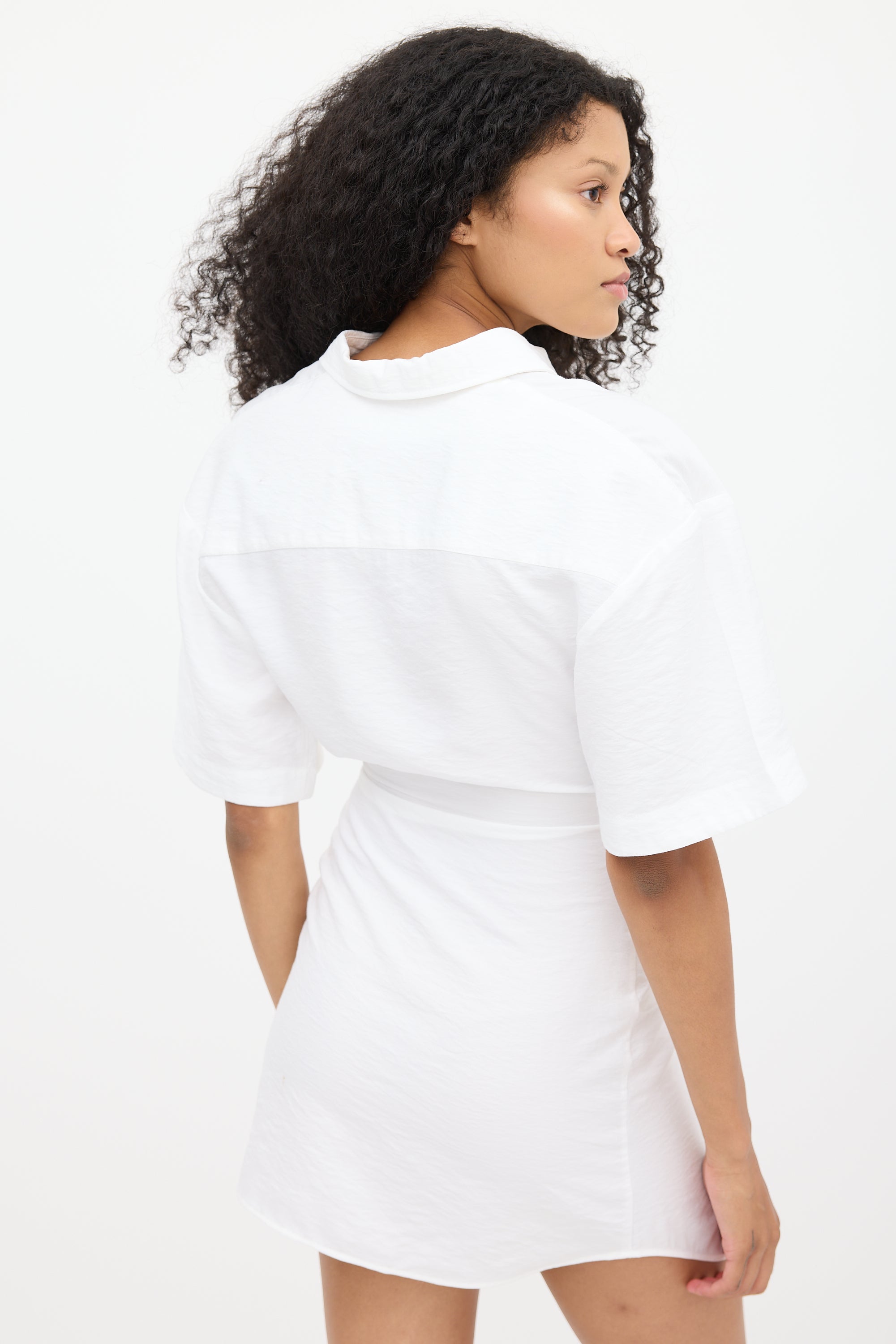 Pre-owned Jacquemus white Le Splash shirt dress featuring a pointed collar, short sleeves, one patch pocket at chest, cut out at waist, and gathered button up front.