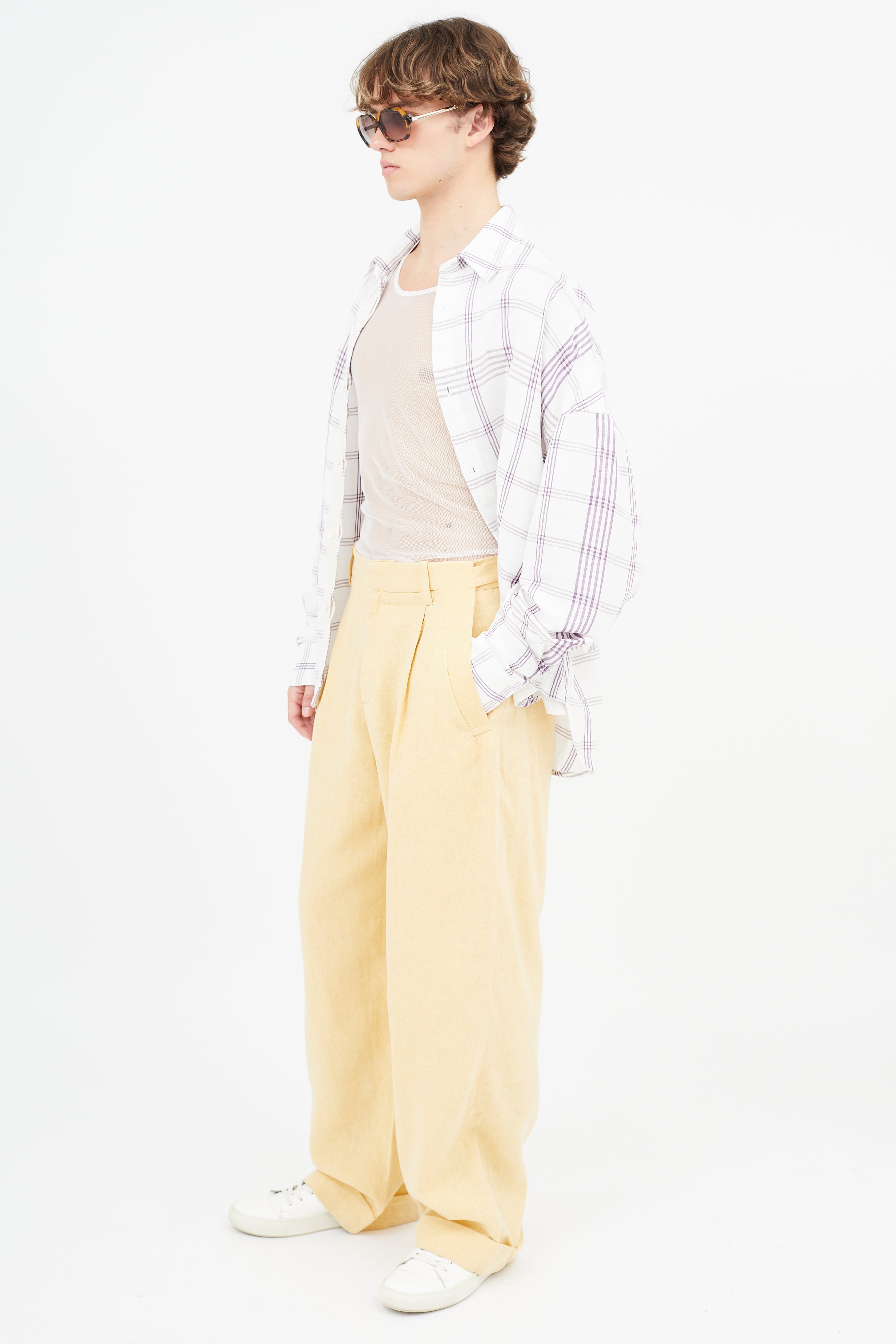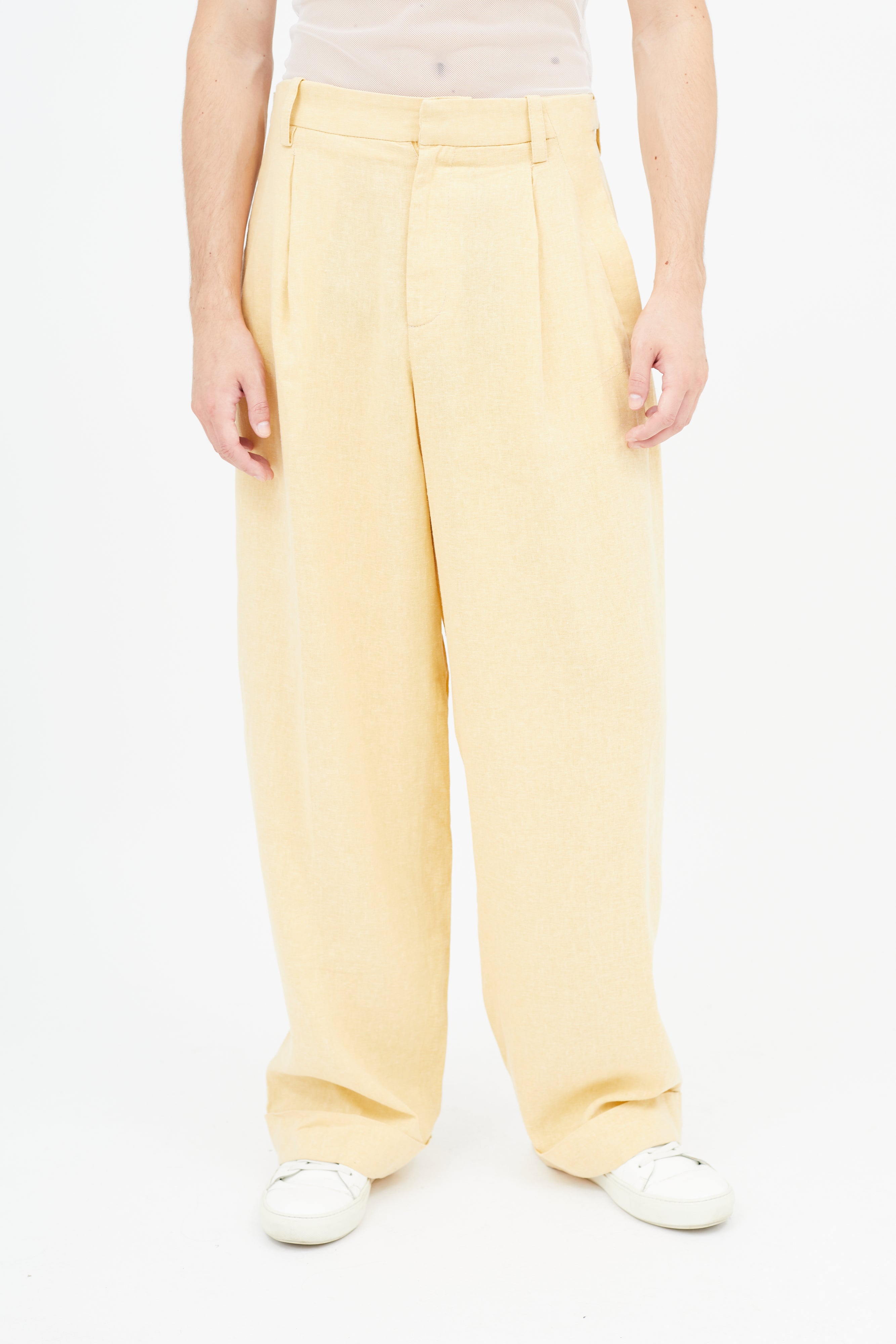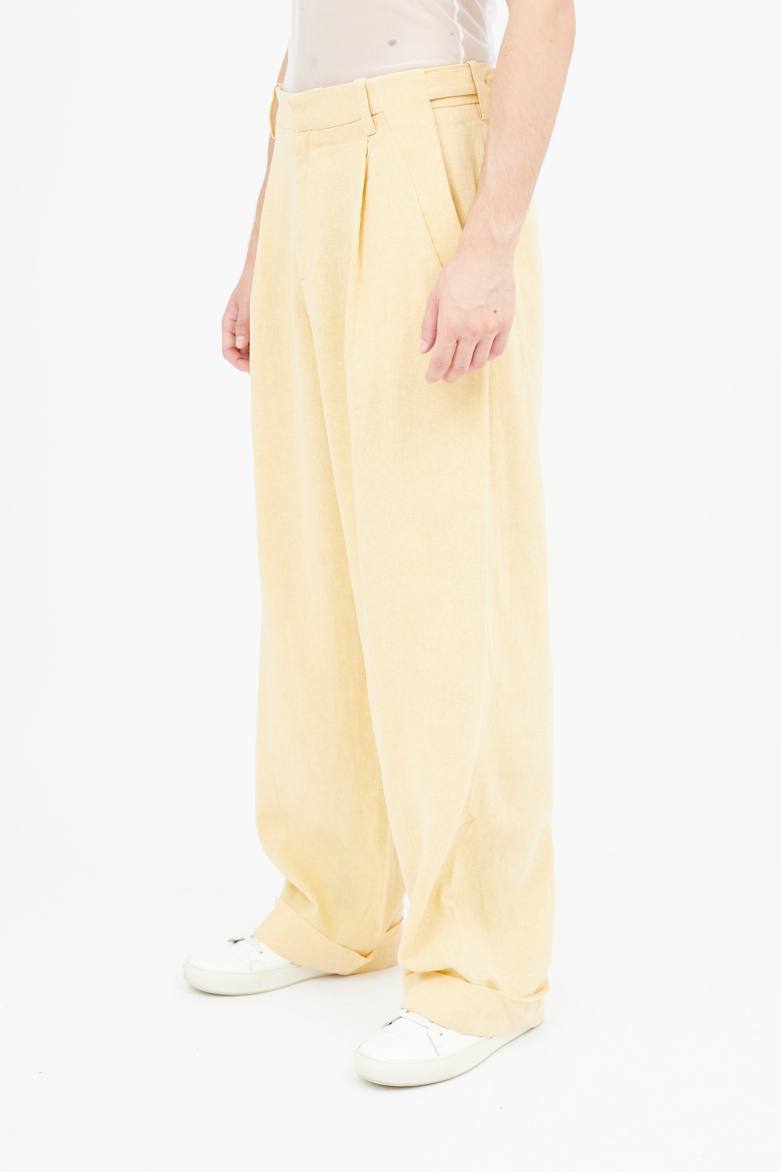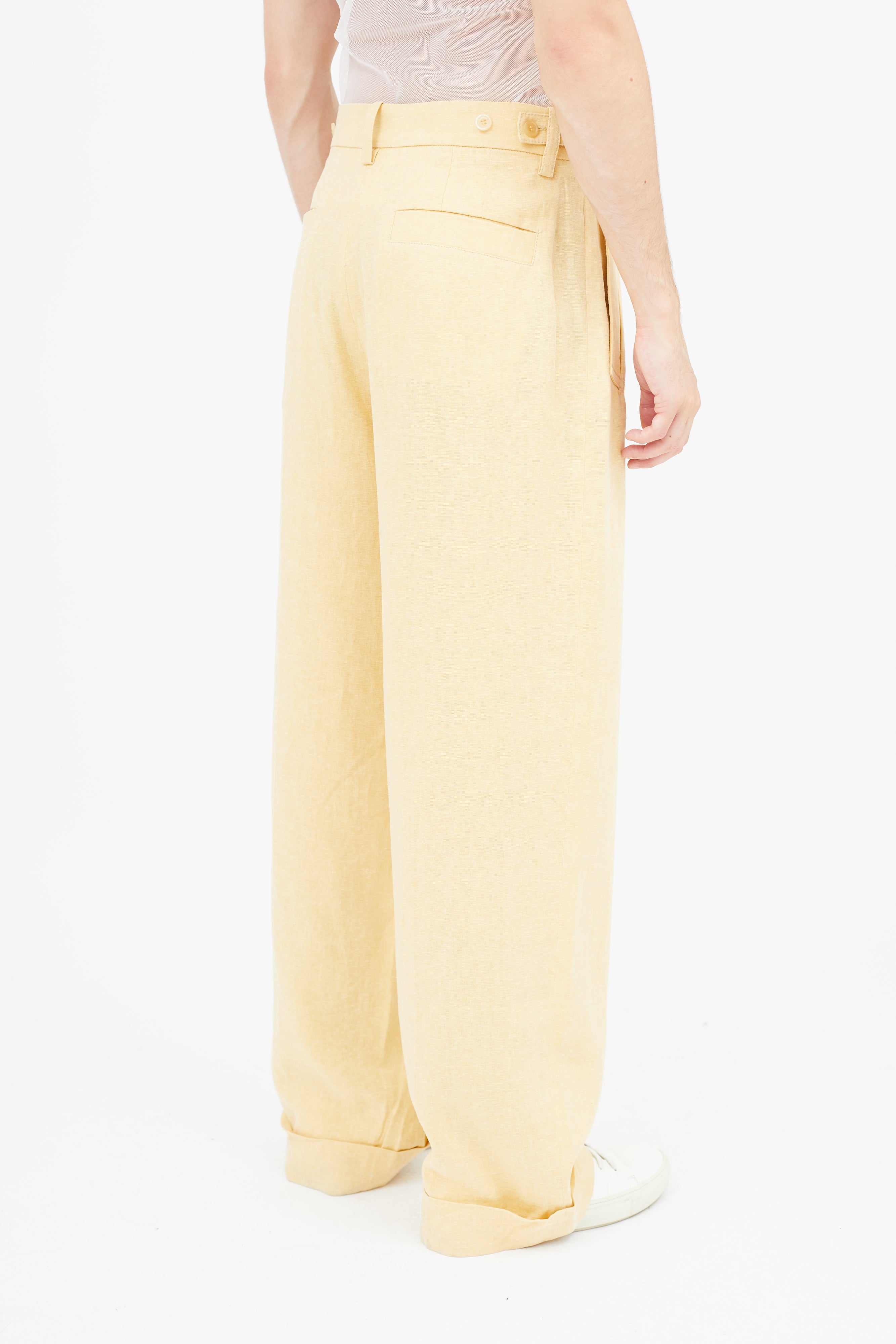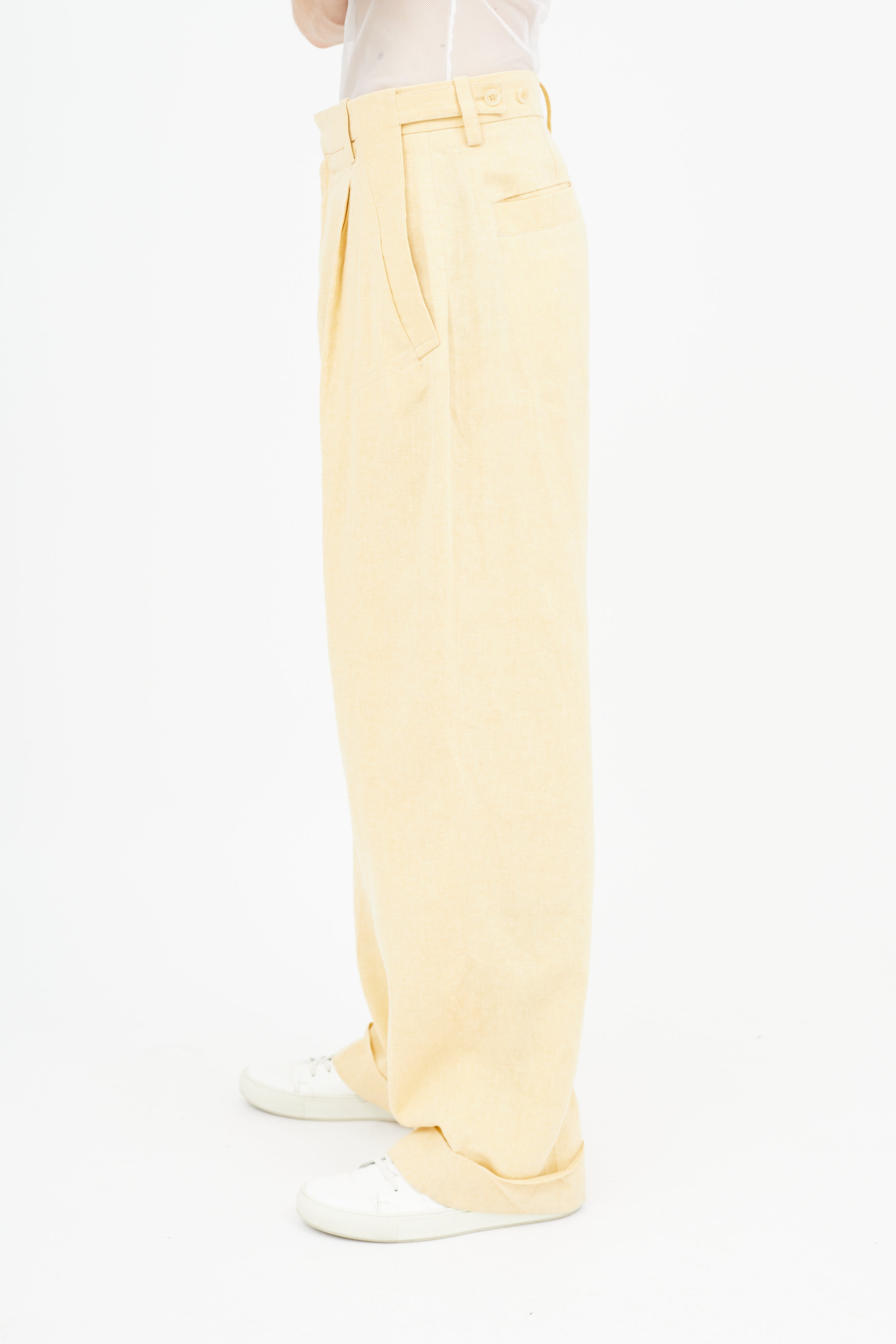 Pre-owned Jacquemus yellow wide leg pants featuring belt loops, zip fly, two slash pockets at side, two welt pockets at back, and waist straps with buttons fastening.