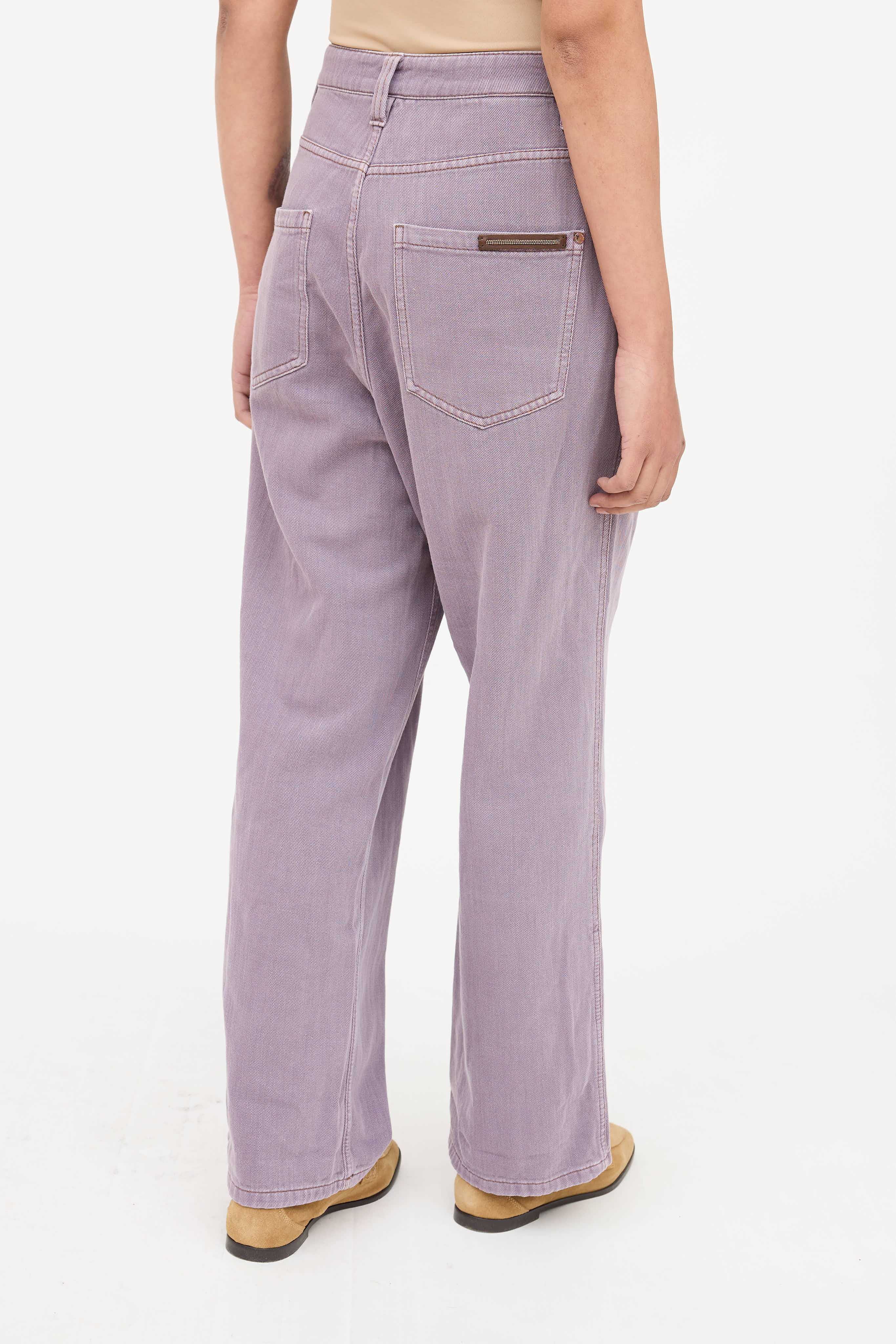 Pre-owned Brunello Cucinelli purple low slung jeans featuring a relaxed fit, belt loops, zip fly, five pocket styling, pleated waist, and Monili leather patch at back pocket.