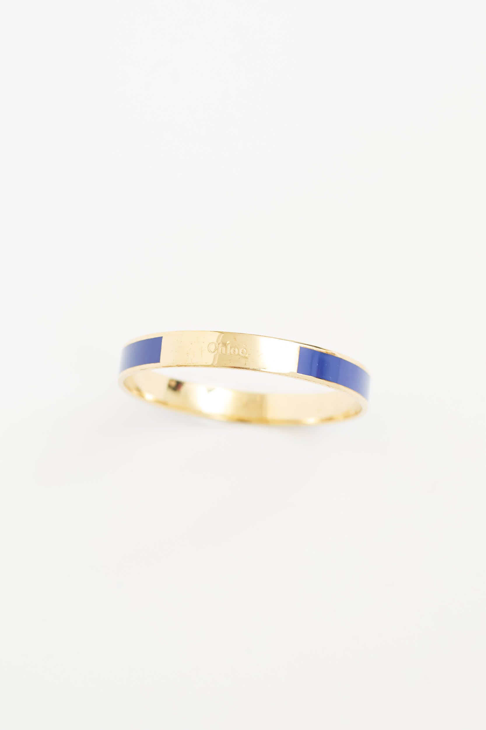 Pre-owned Chloe gold tone bangle featuring a blue enamel band, and embossed logo at face. Includes original dust bag and box.