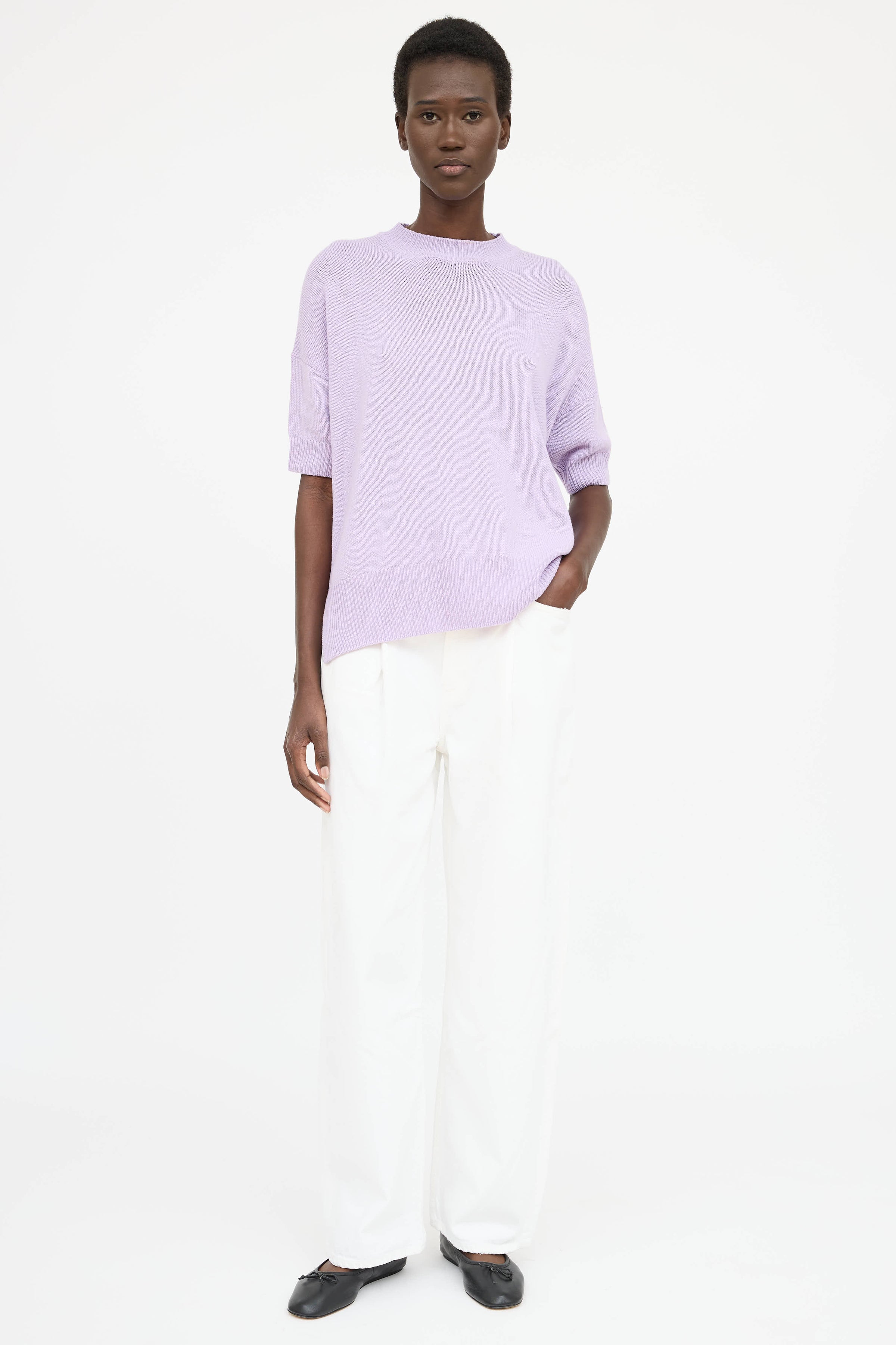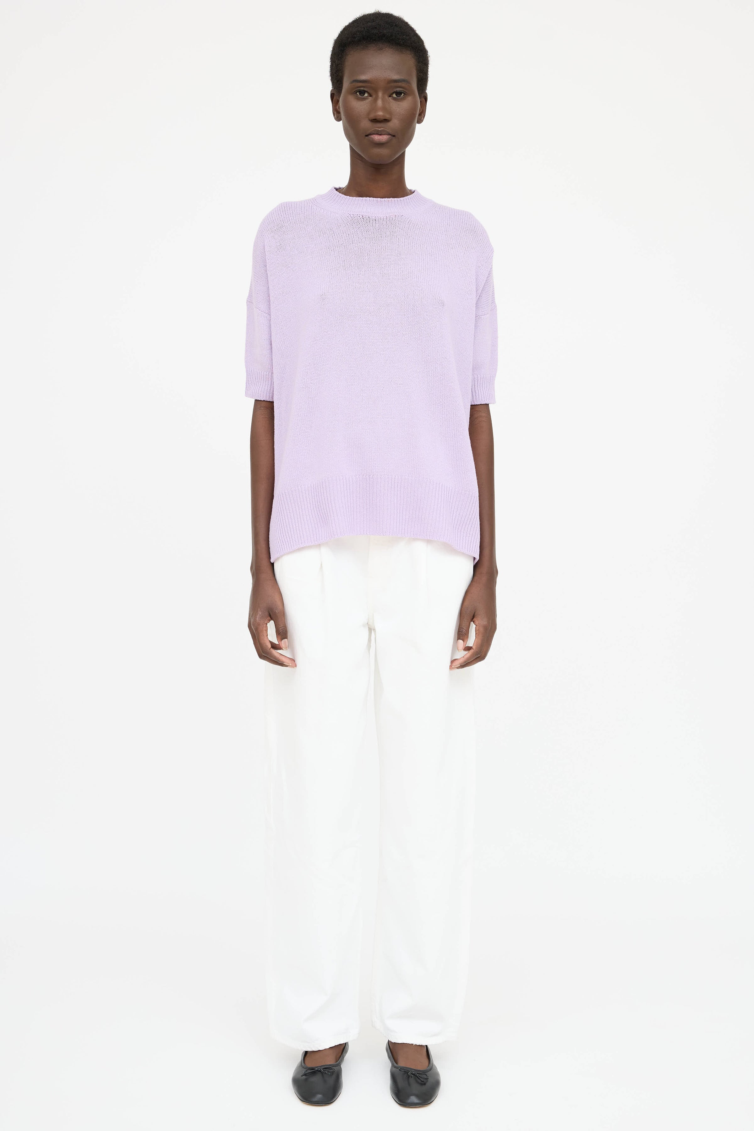 Pre-owned Jil Sander 2023 purple short sleeve sweater featuring ribbed cuffs, collar, and hemline, and slits at hemline.