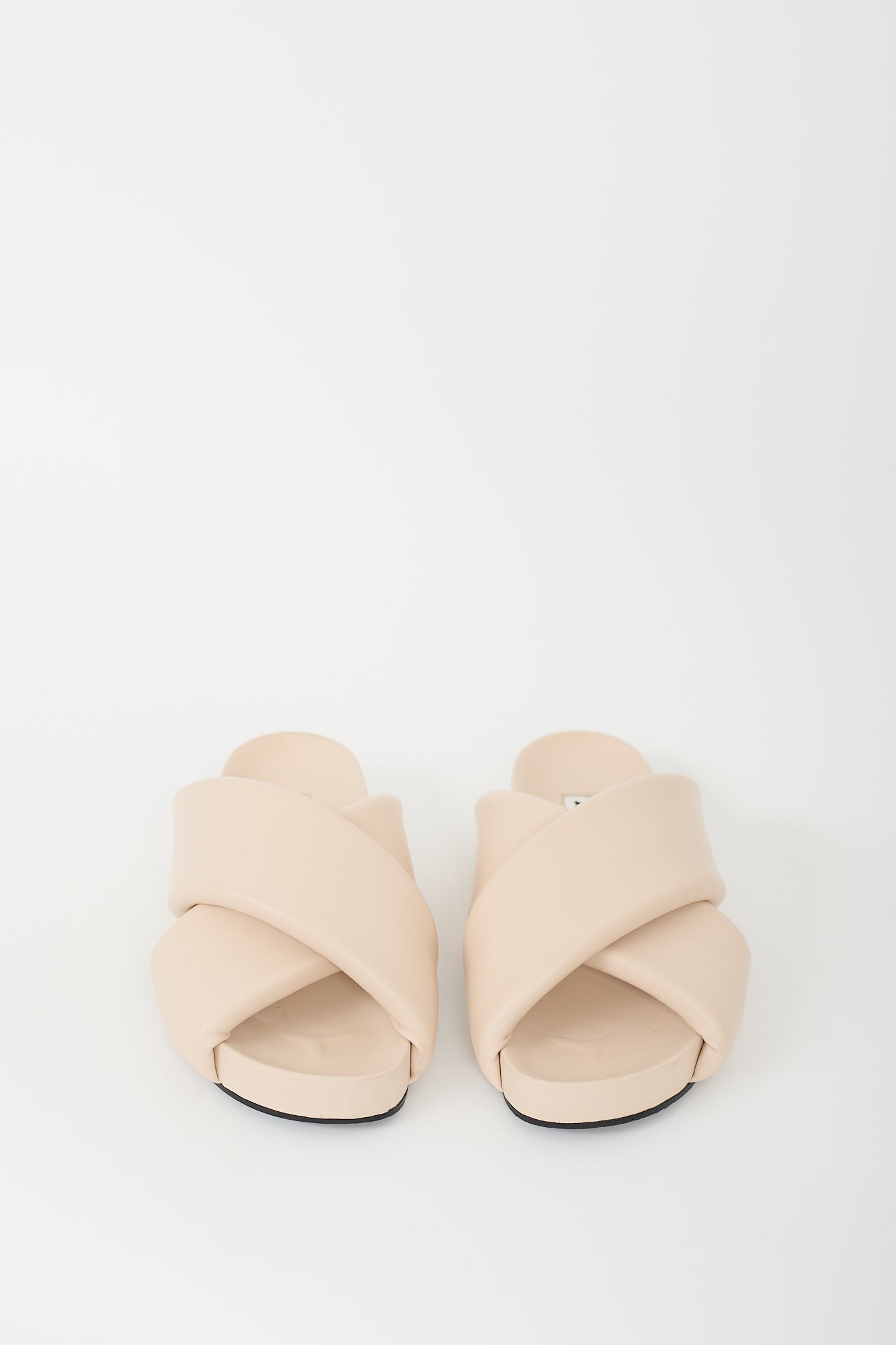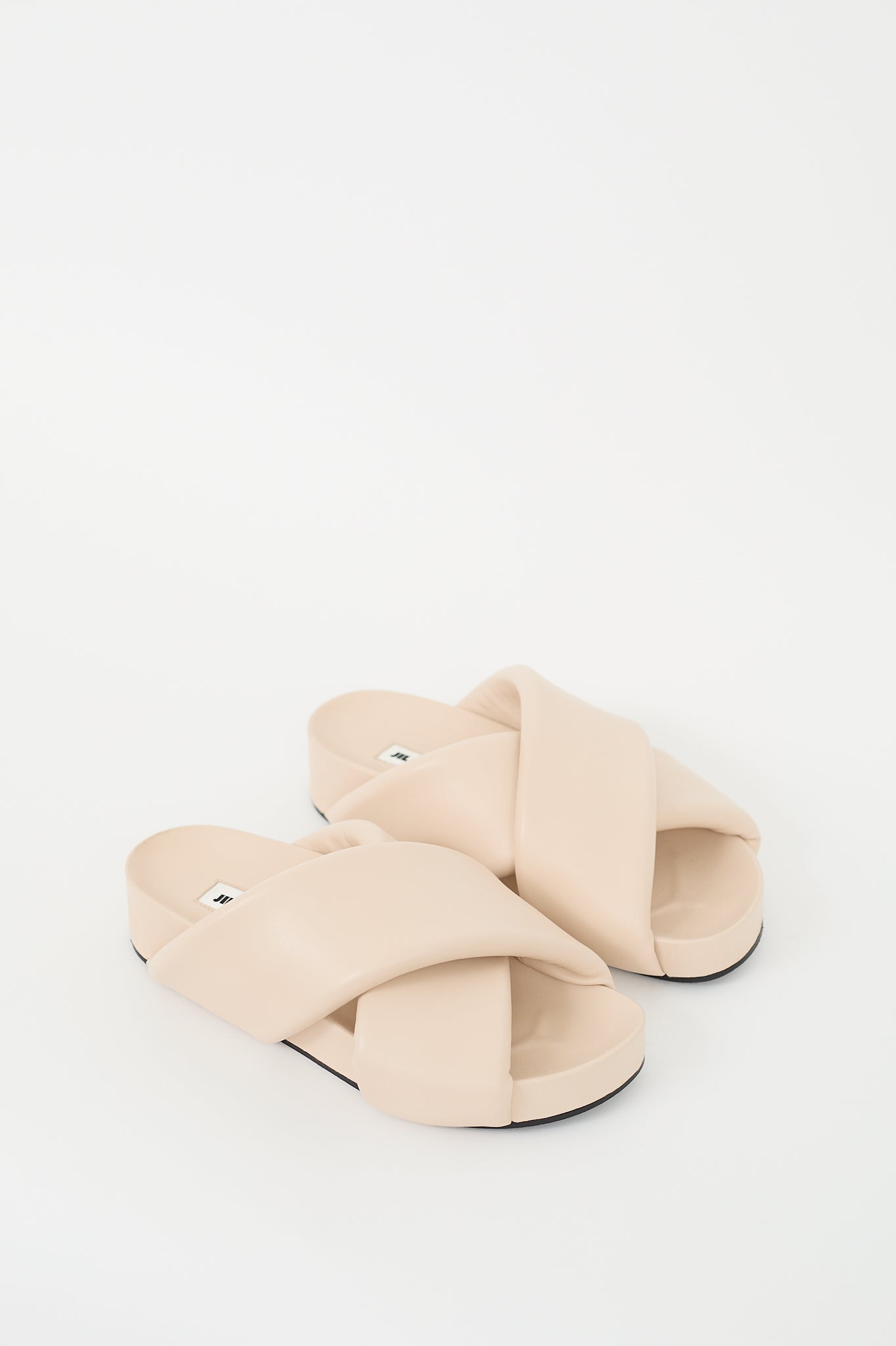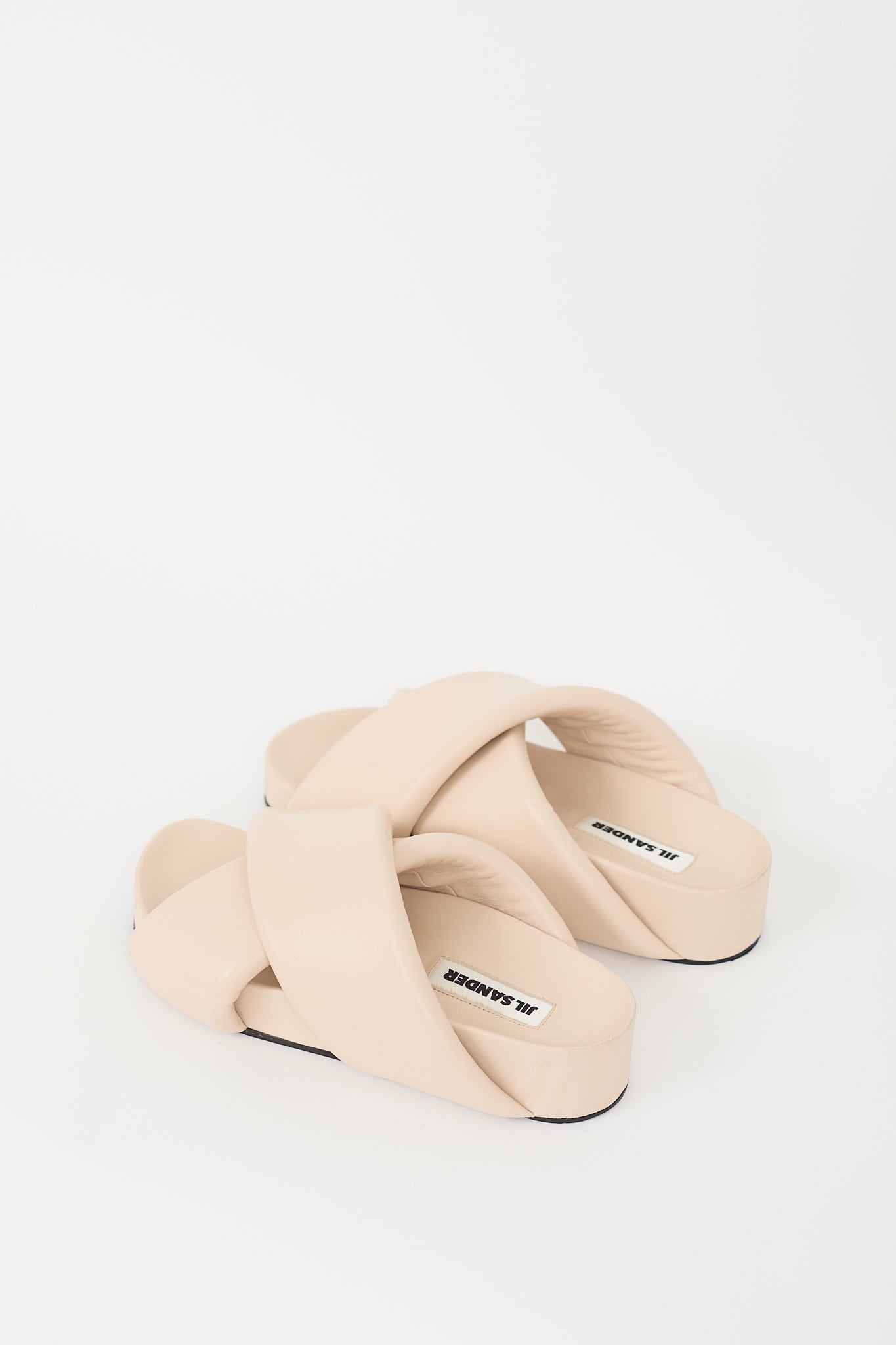 Pre-owned Jil Sander beige leather slides featuring an open rounded toe, padded criss cross strap at vamp, and molded footbed.