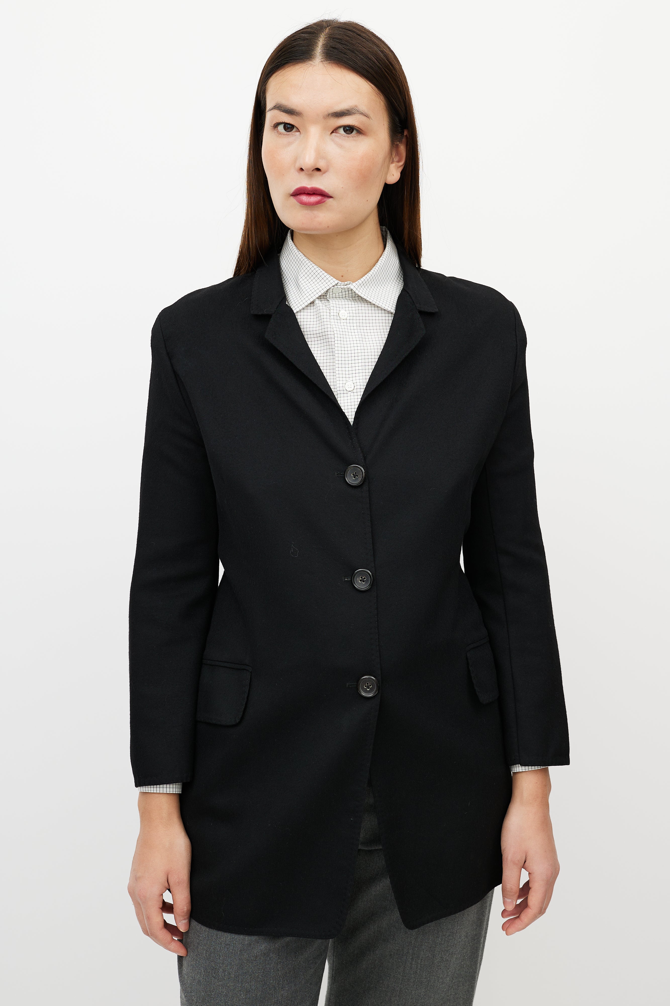 Pre-owned Jil Sander black cashmere blazer featuring notch lapel, button up front, two flap pockets, and back vent. Unlined.