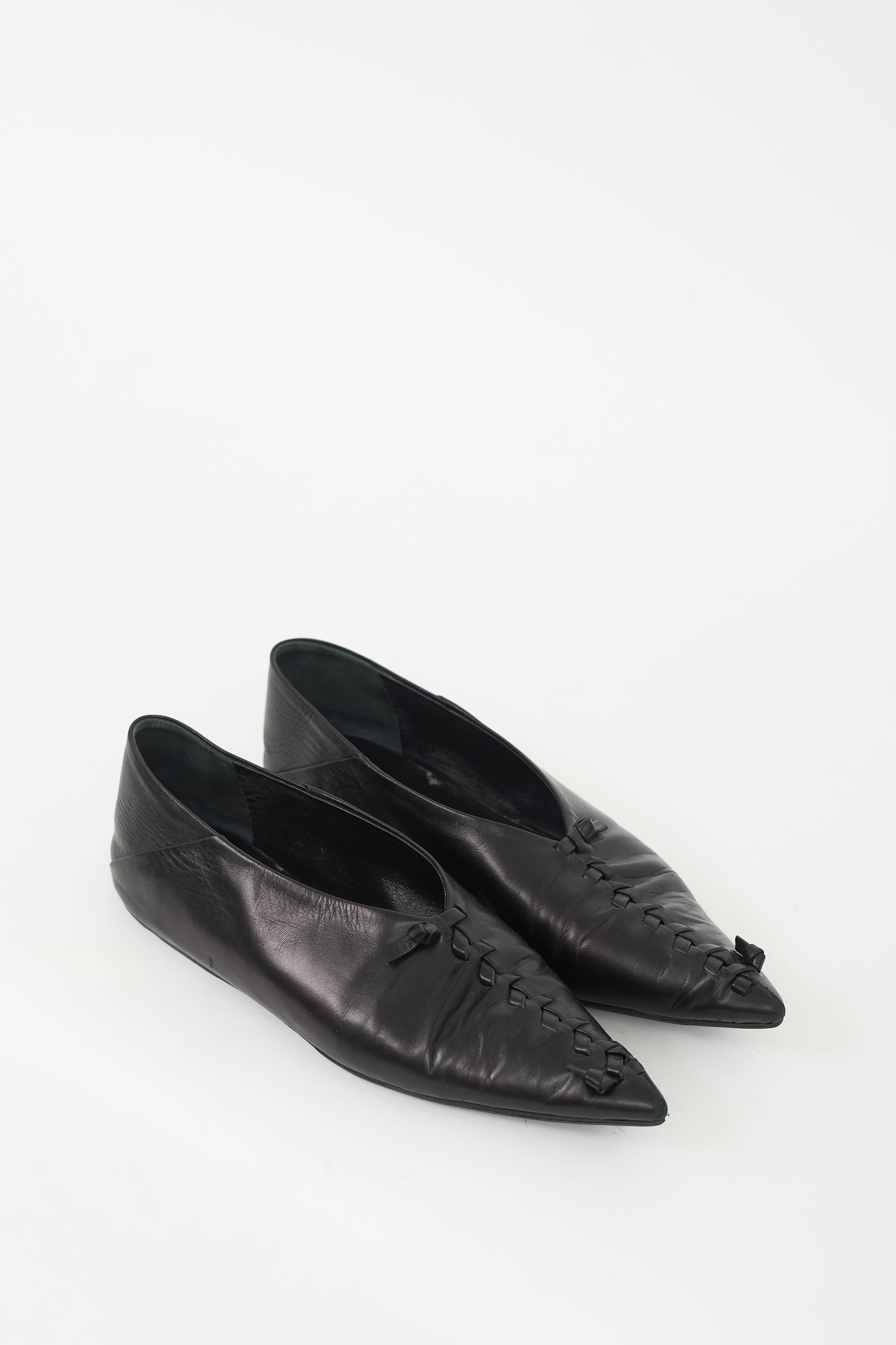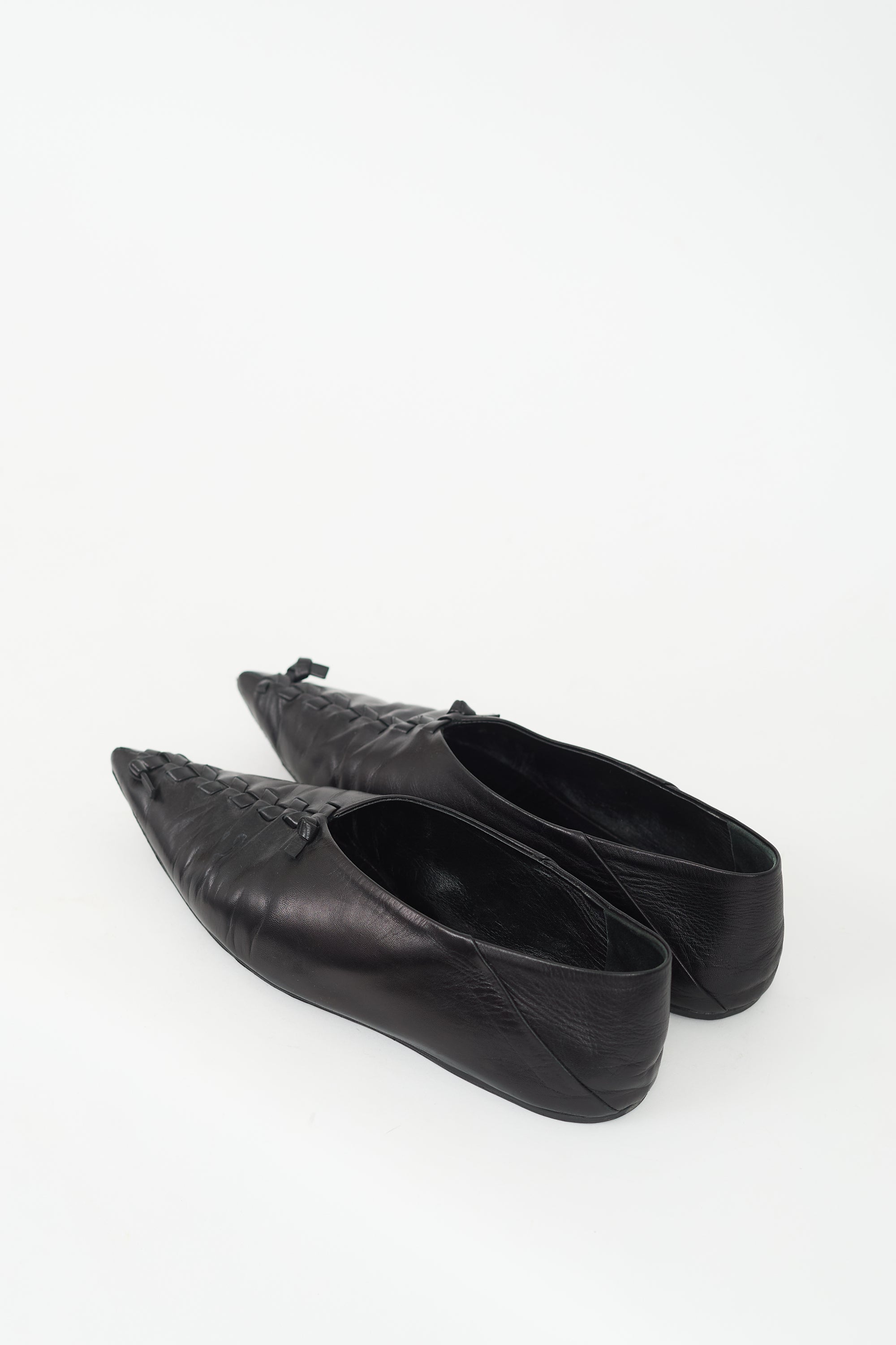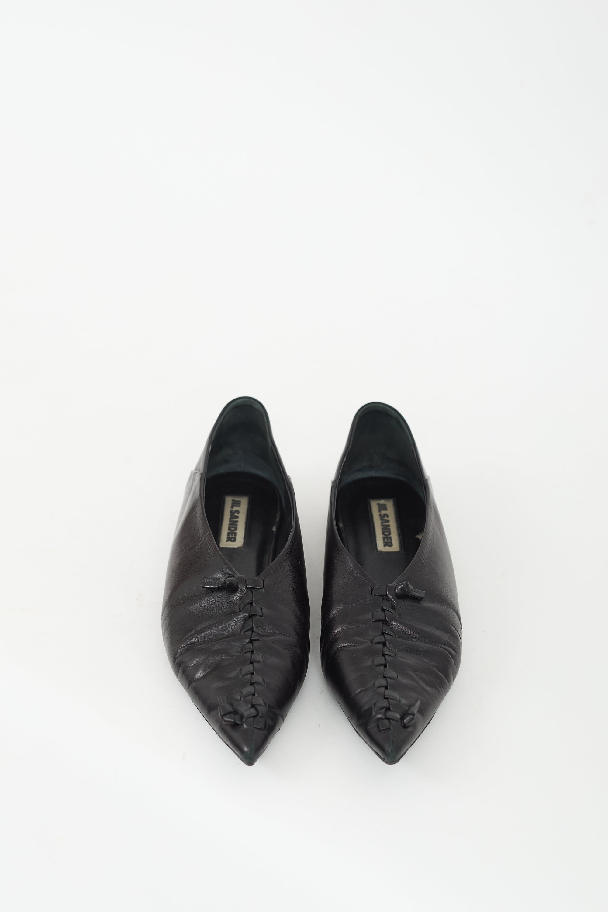 Pre-owned Jil Sander black leather ballet flats featuring a pointed toe, braided vamp, foldable counter for modular styling, slip on entry, leather insole, and rubber outsole.