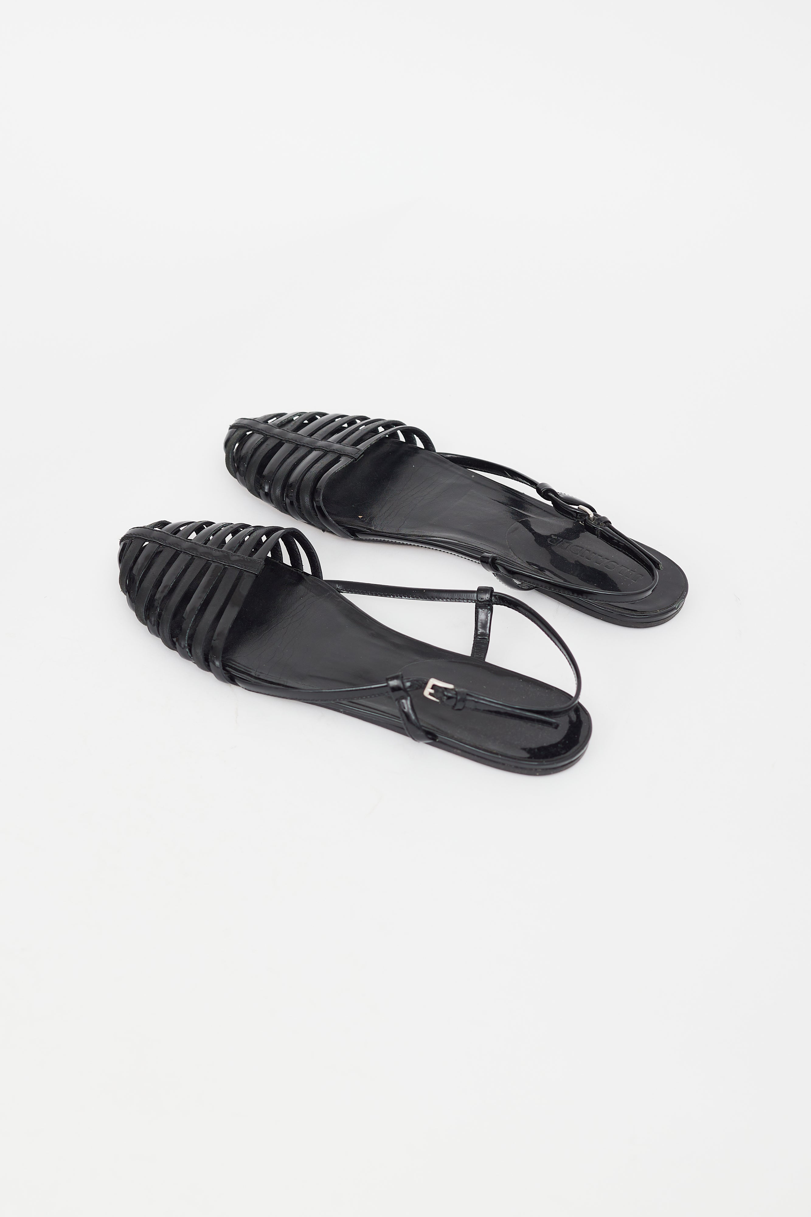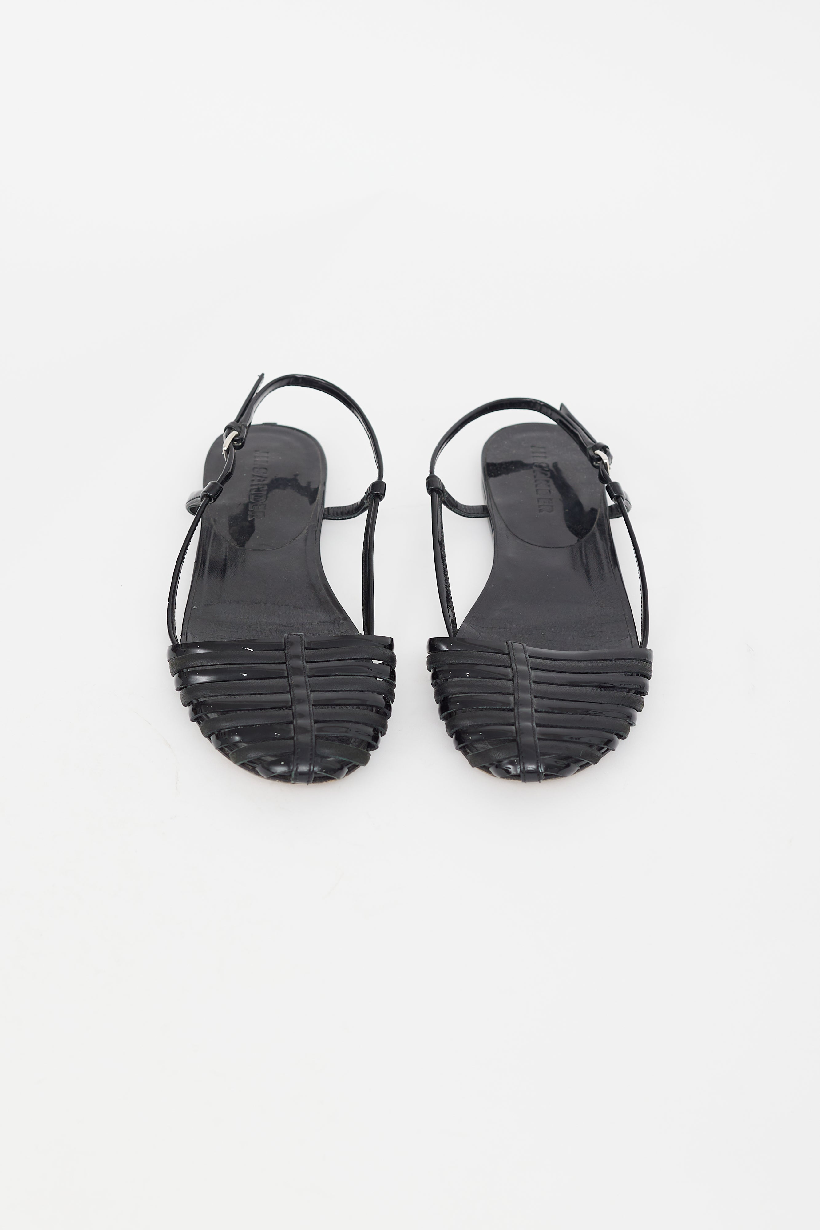 Pre-owned Jil Sander black leather sandals featuring rounded toe with caged straps, ankle strap with buckle fastening, leather insole, and wooden outsole.