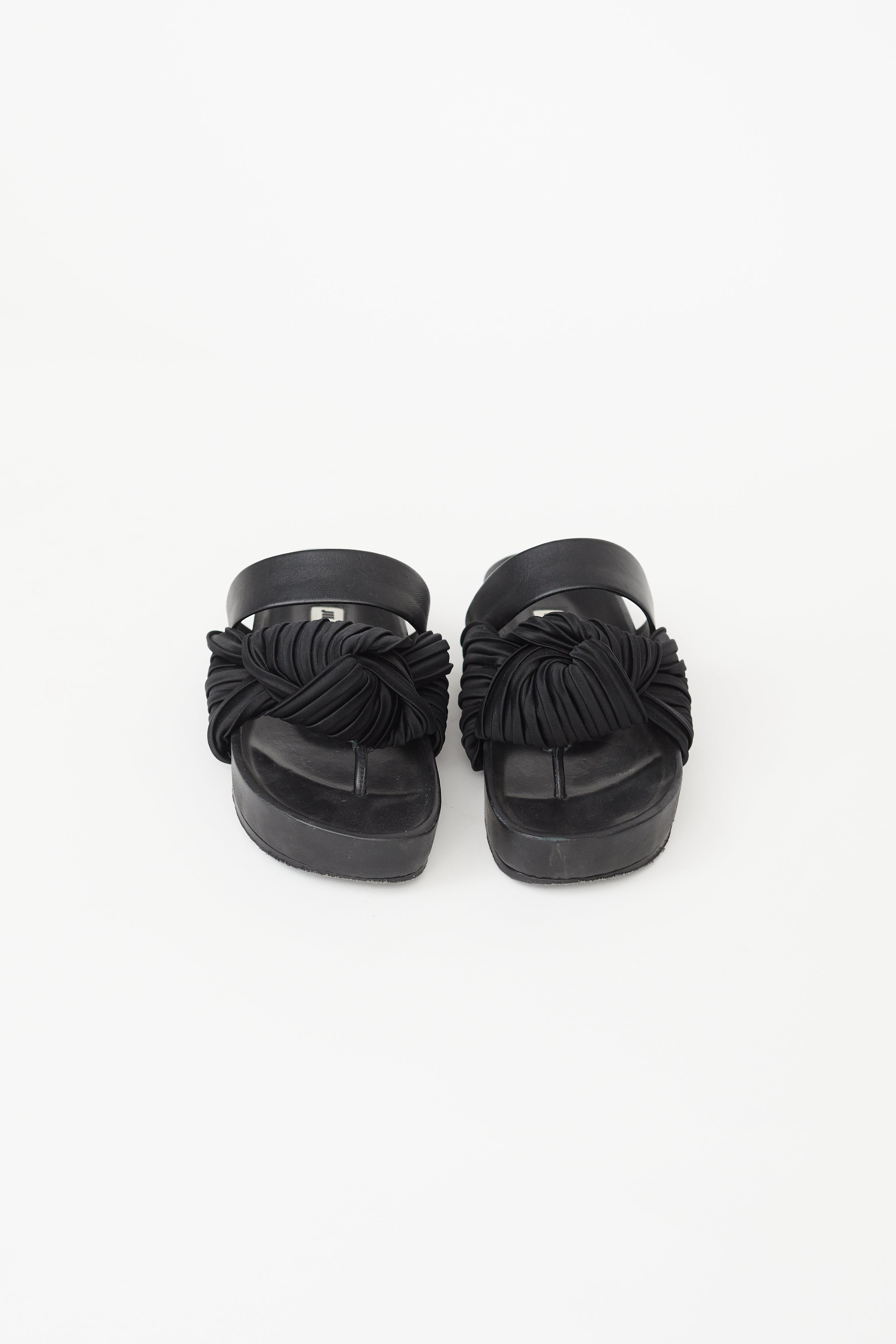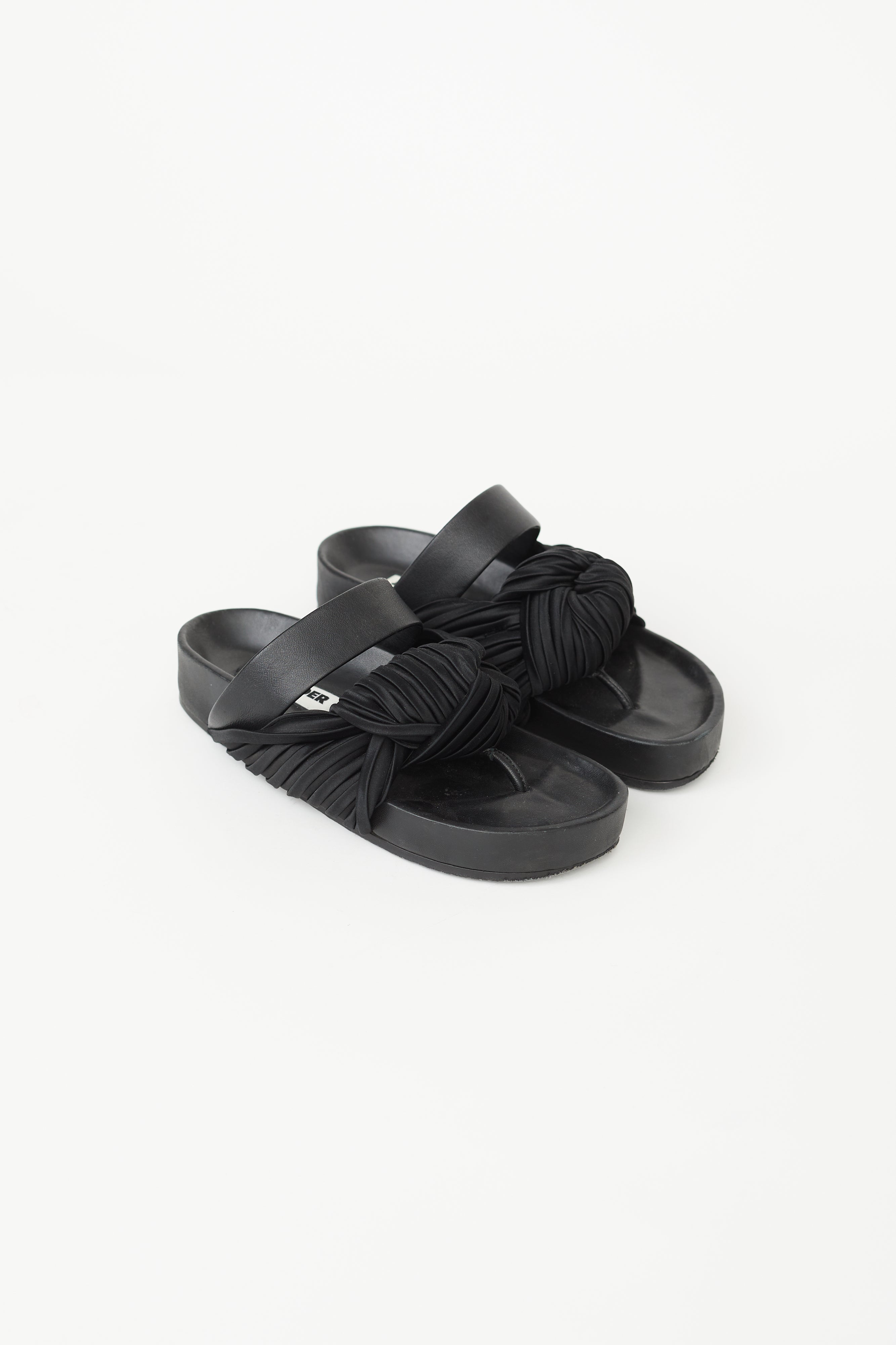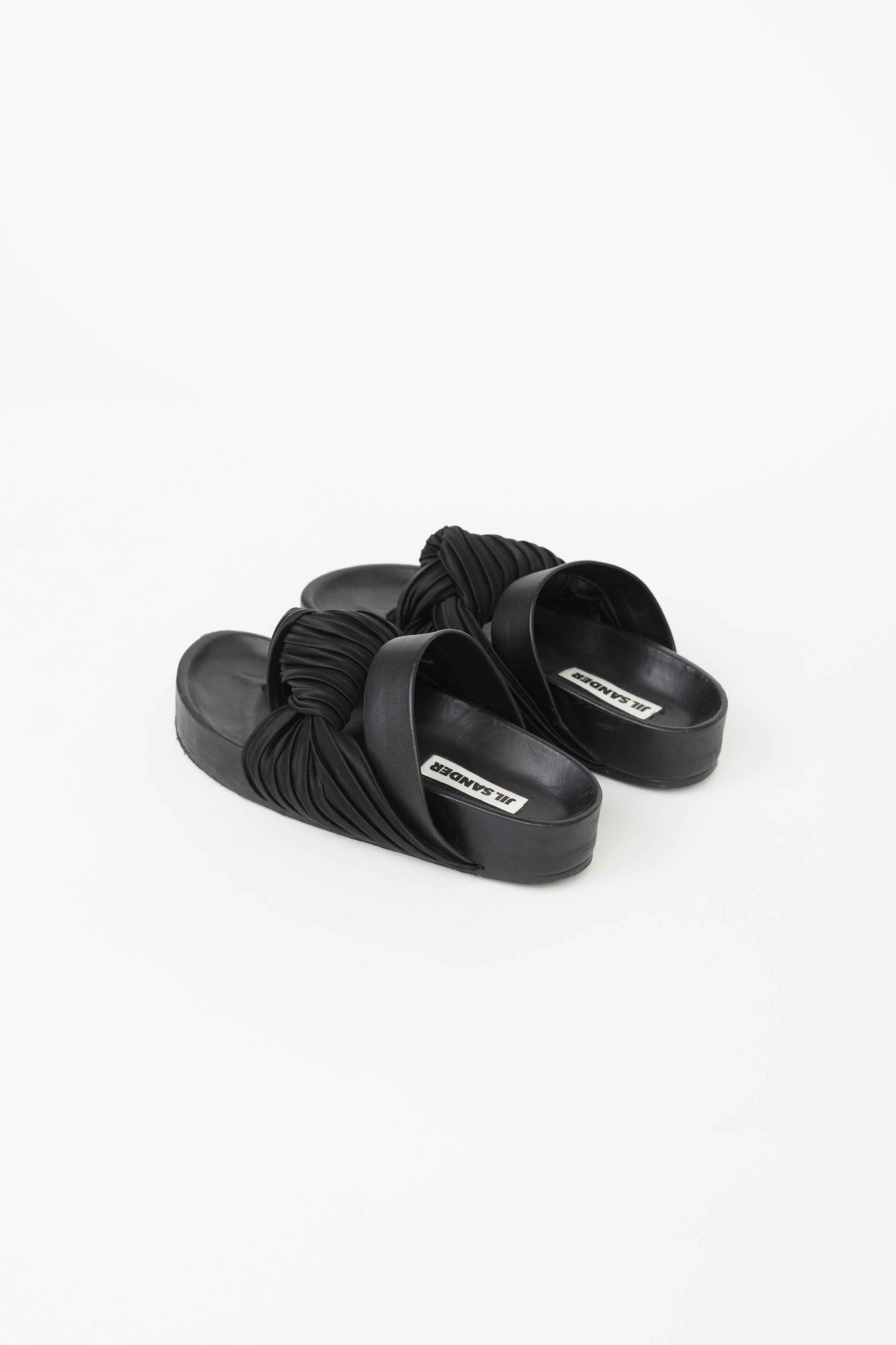 Pre-owned Jil Sander black leather knotted strap sandal featuring slip-on, open-toe, nappa-covered footbed, pleated and knotted strap detail at vamp and leather sole.
