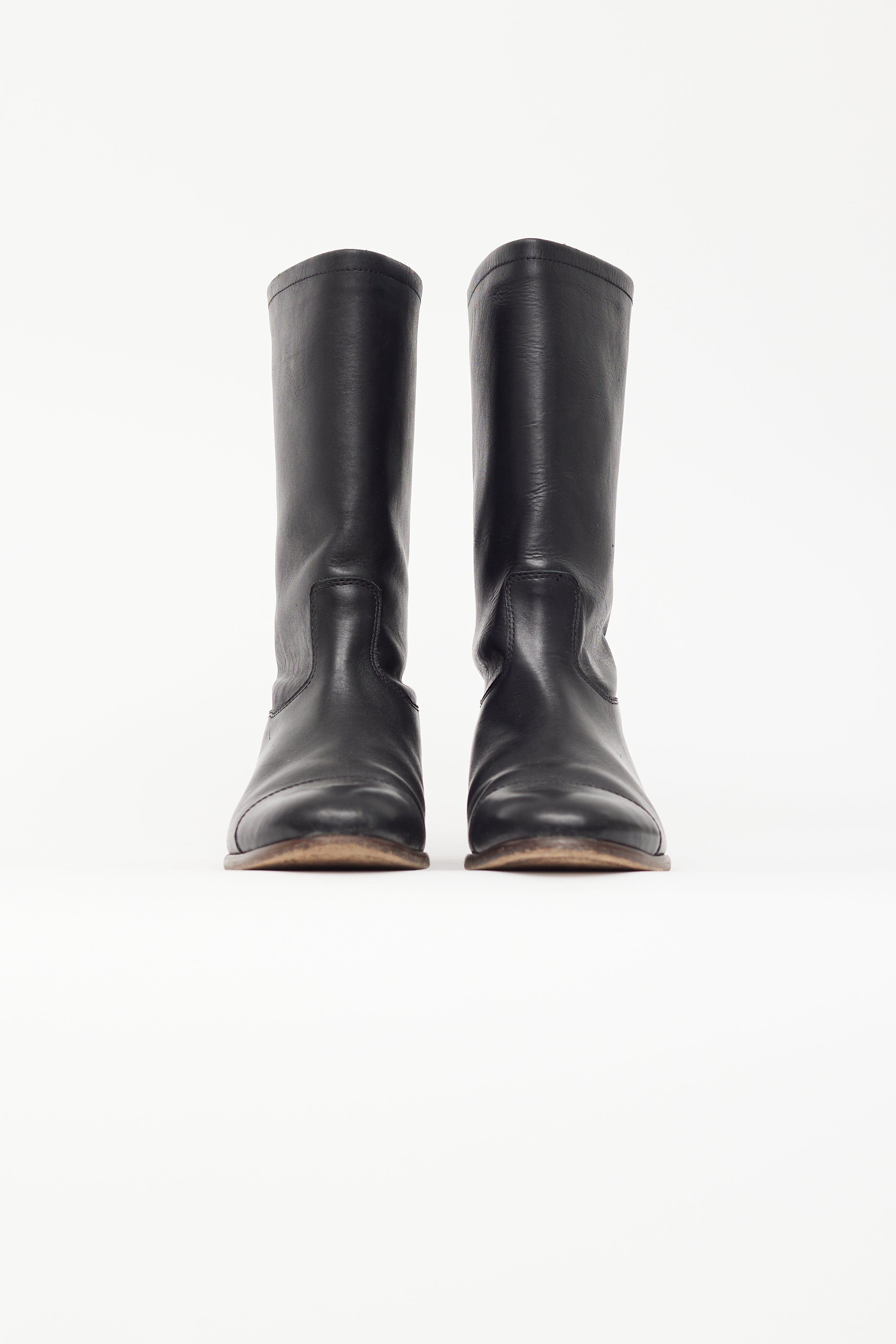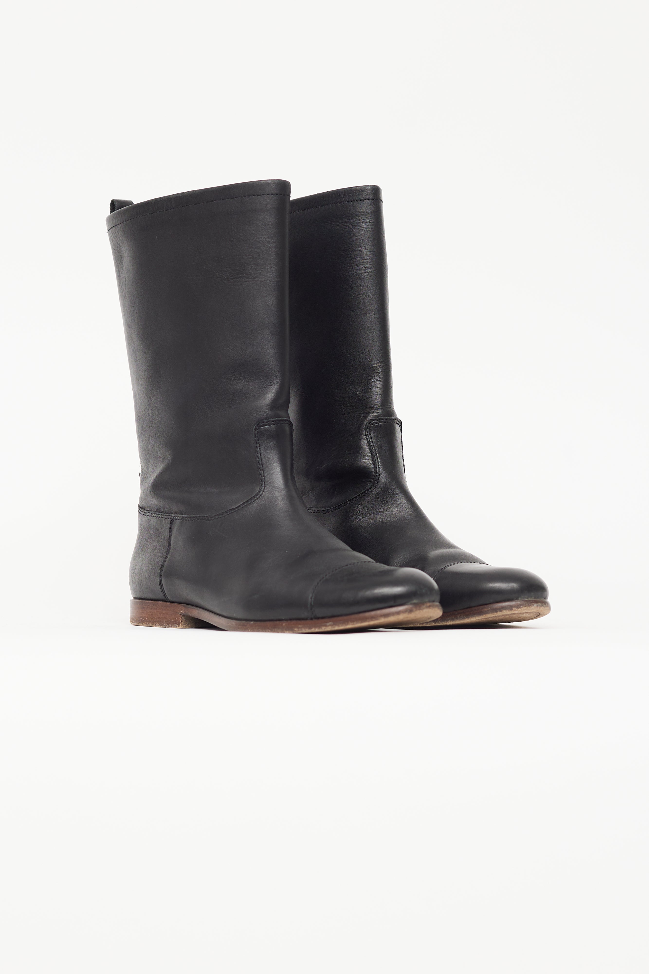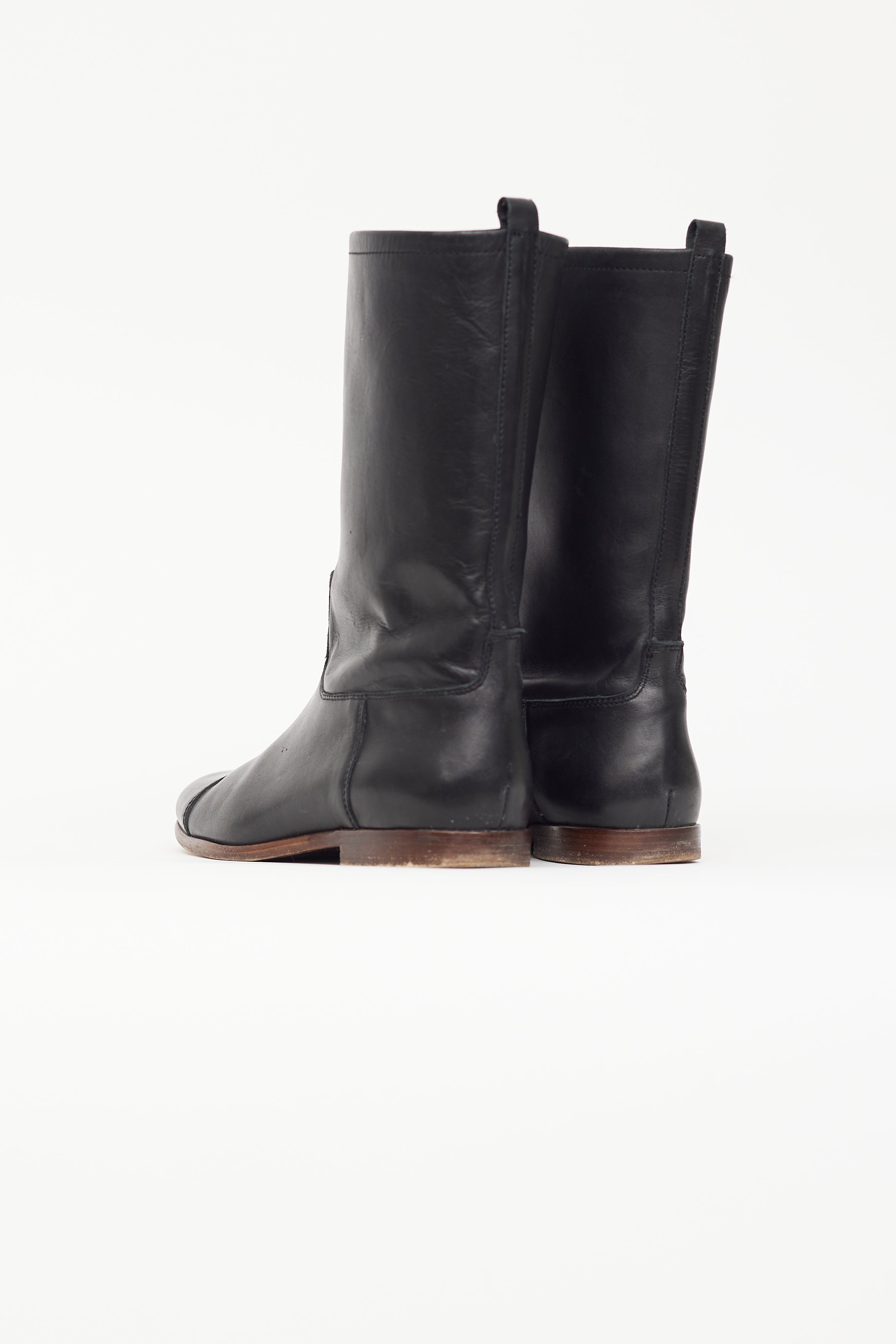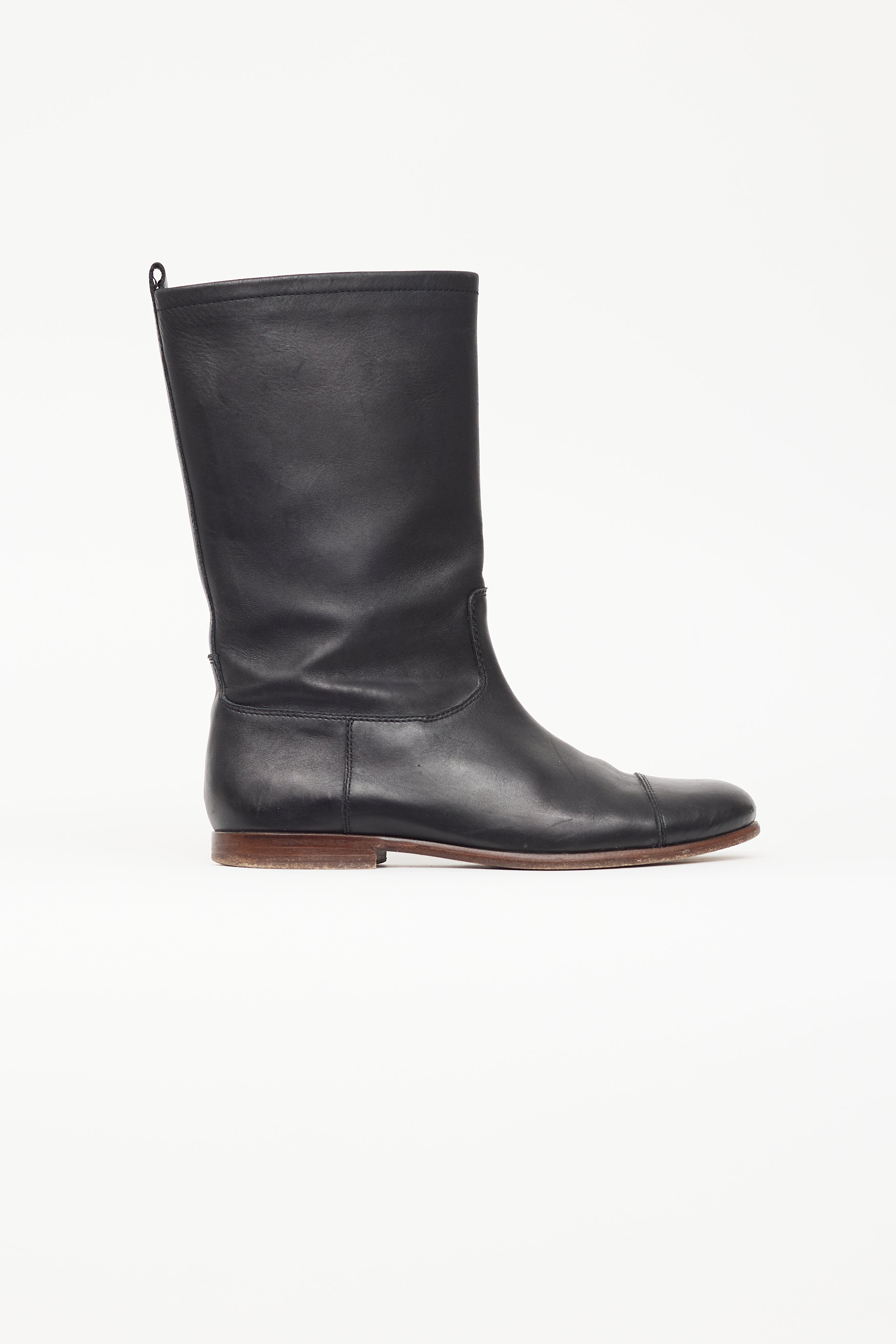 Pre-owned Jil Sander black leather mid calf boot featuring round toe, brown wooden midsole, pull loop at collar, and leather insoles.