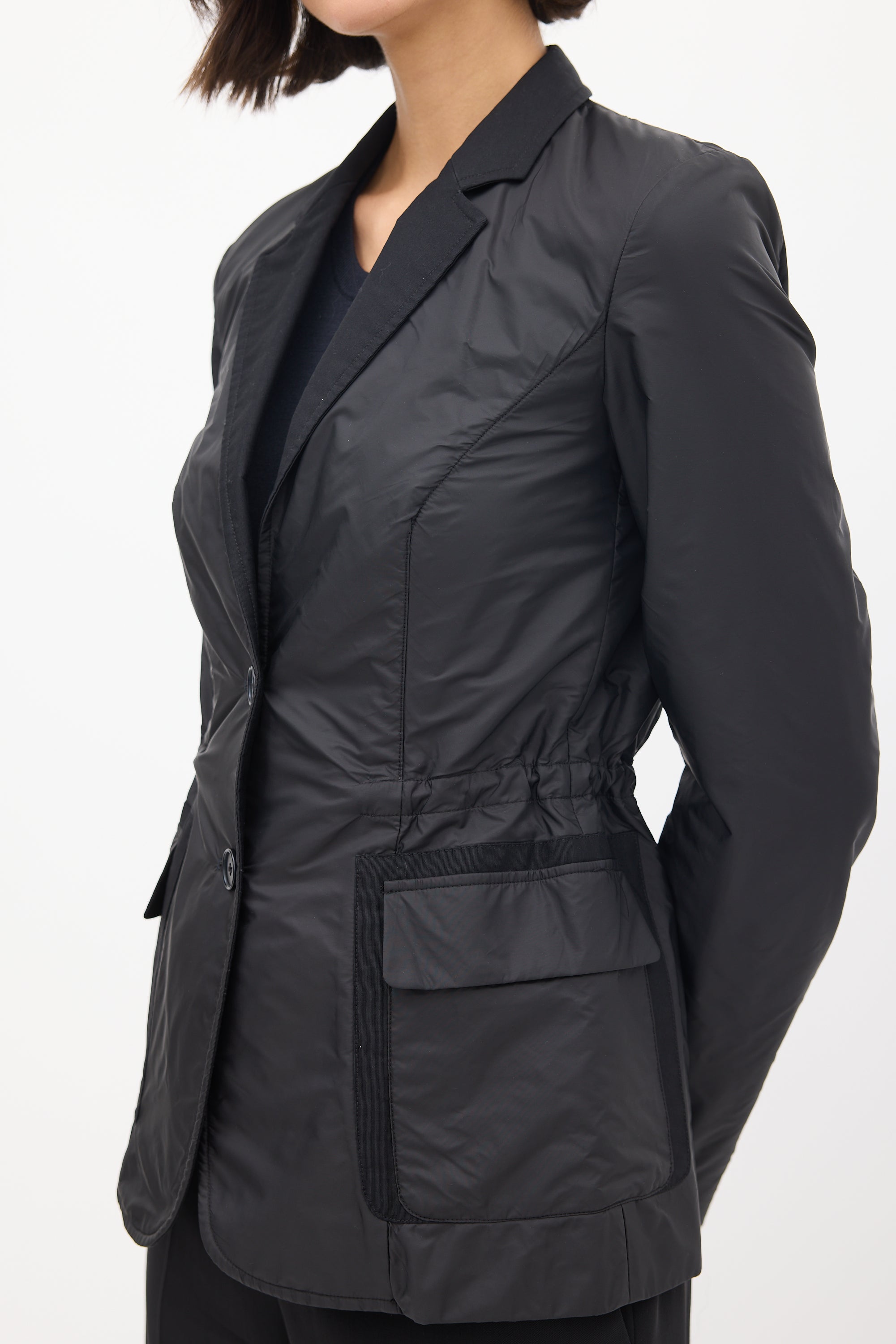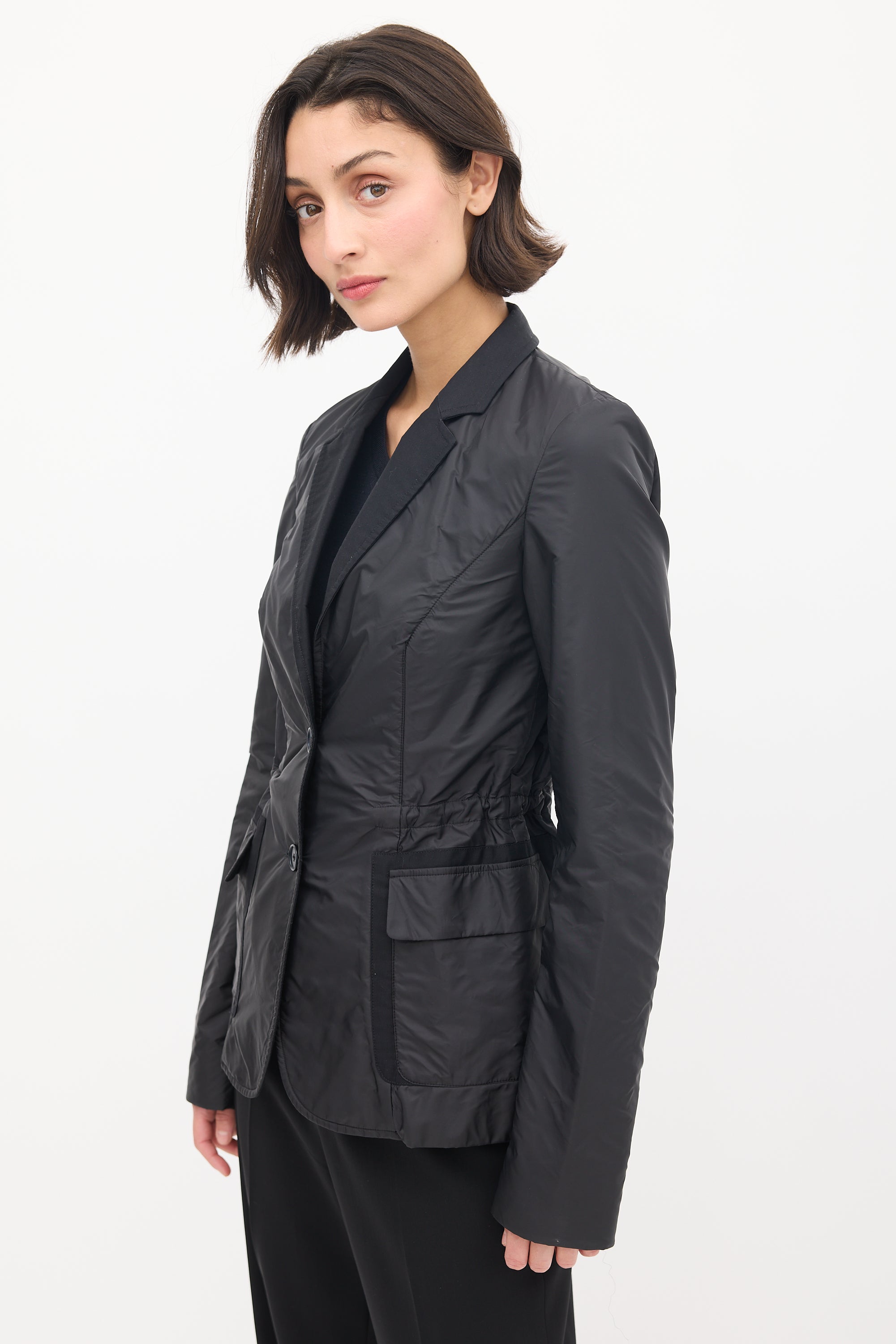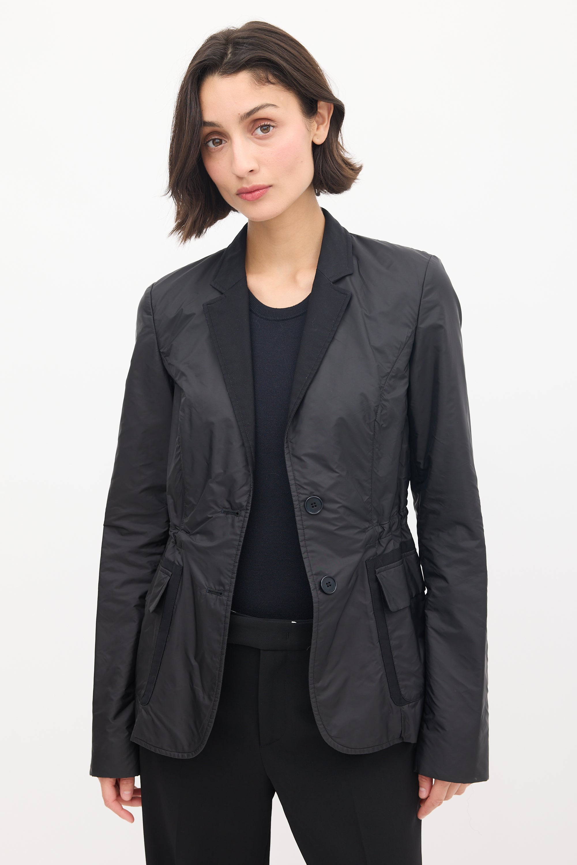 Pre-owned Jil Sander black nylon and cotton blend blazer featuring a notched collar, two front buttons, two front flap pockets at hip, drawcord waist with interior toggle fastenings, and long sleeves. Lined.