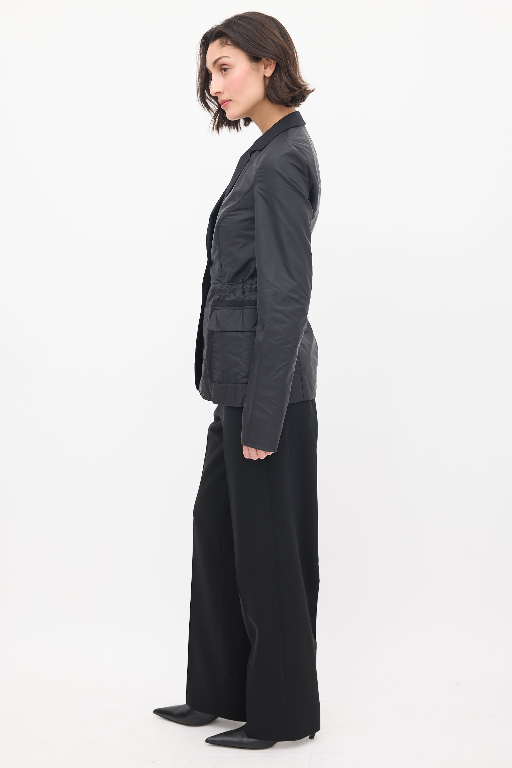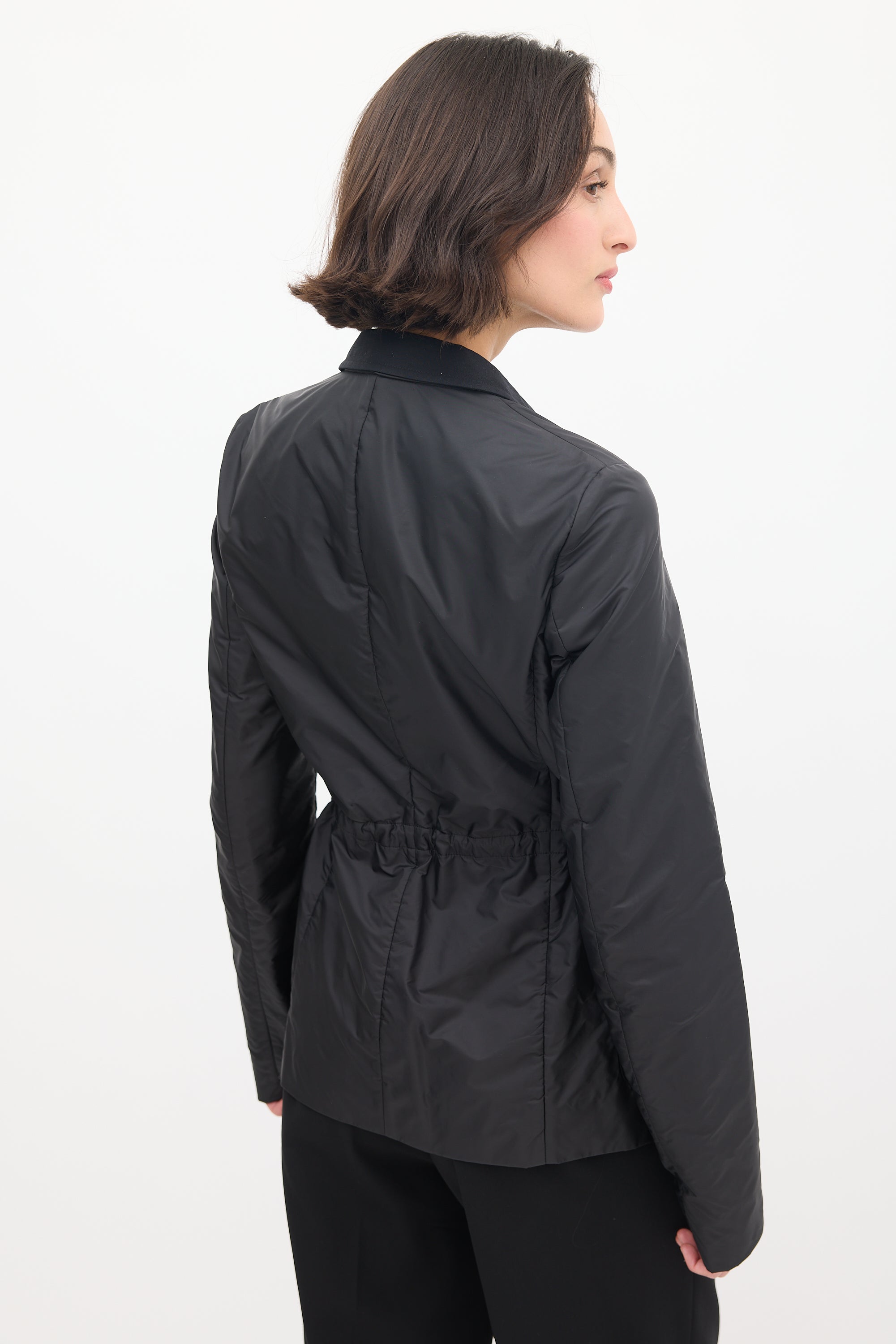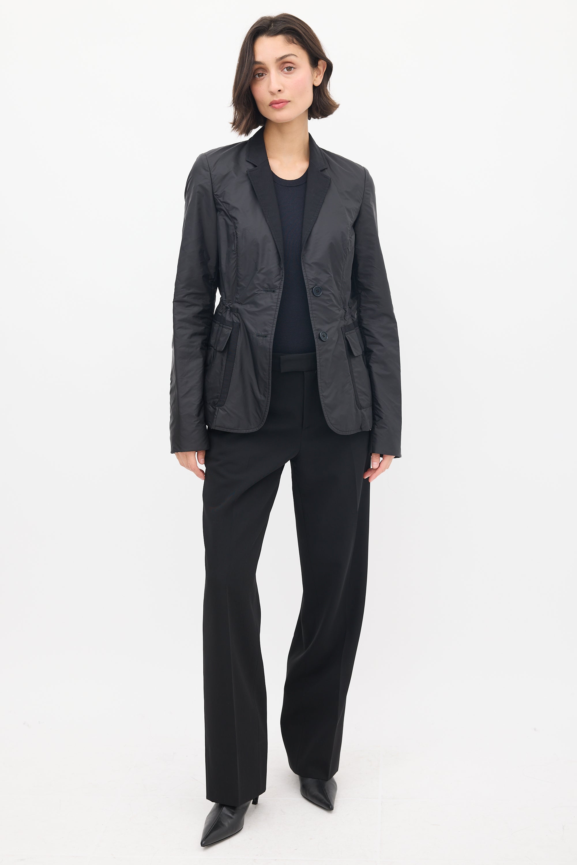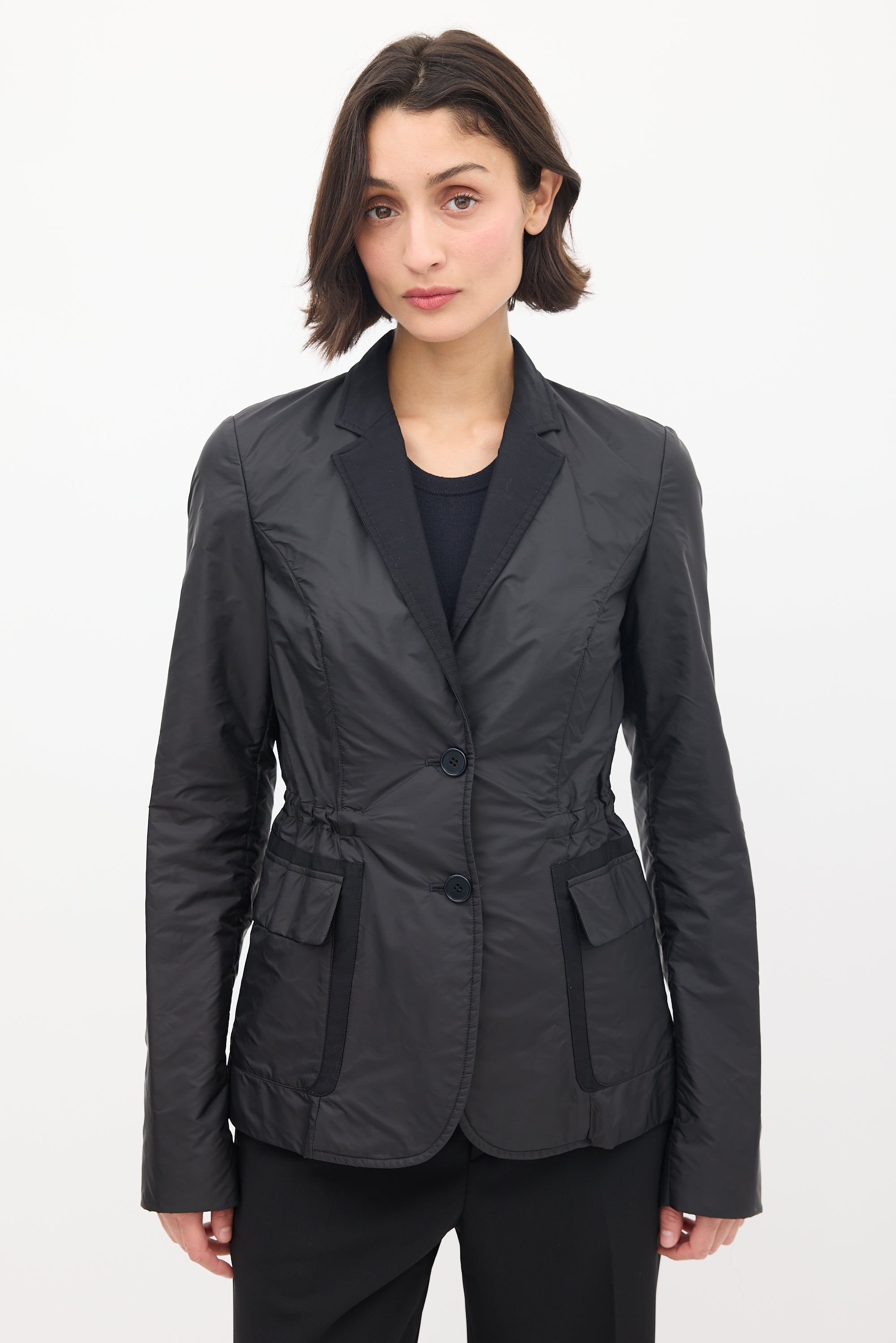 Pre-owned Jil Sander black nylon and cotton blend blazer featuring a notched collar, two front buttons, two front flap pockets at hip, drawcord waist with interior toggle fastenings, and long sleeves. Lined.