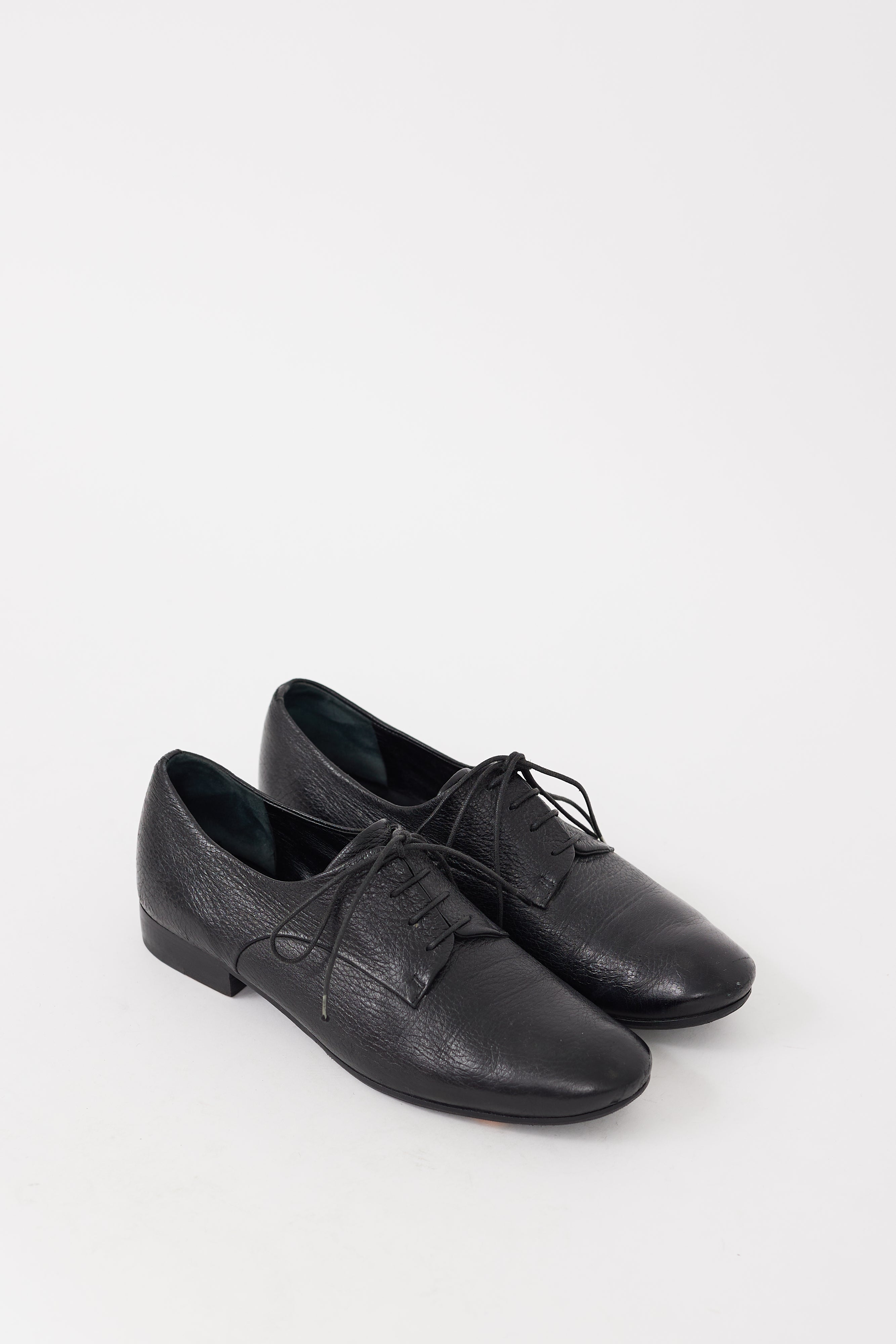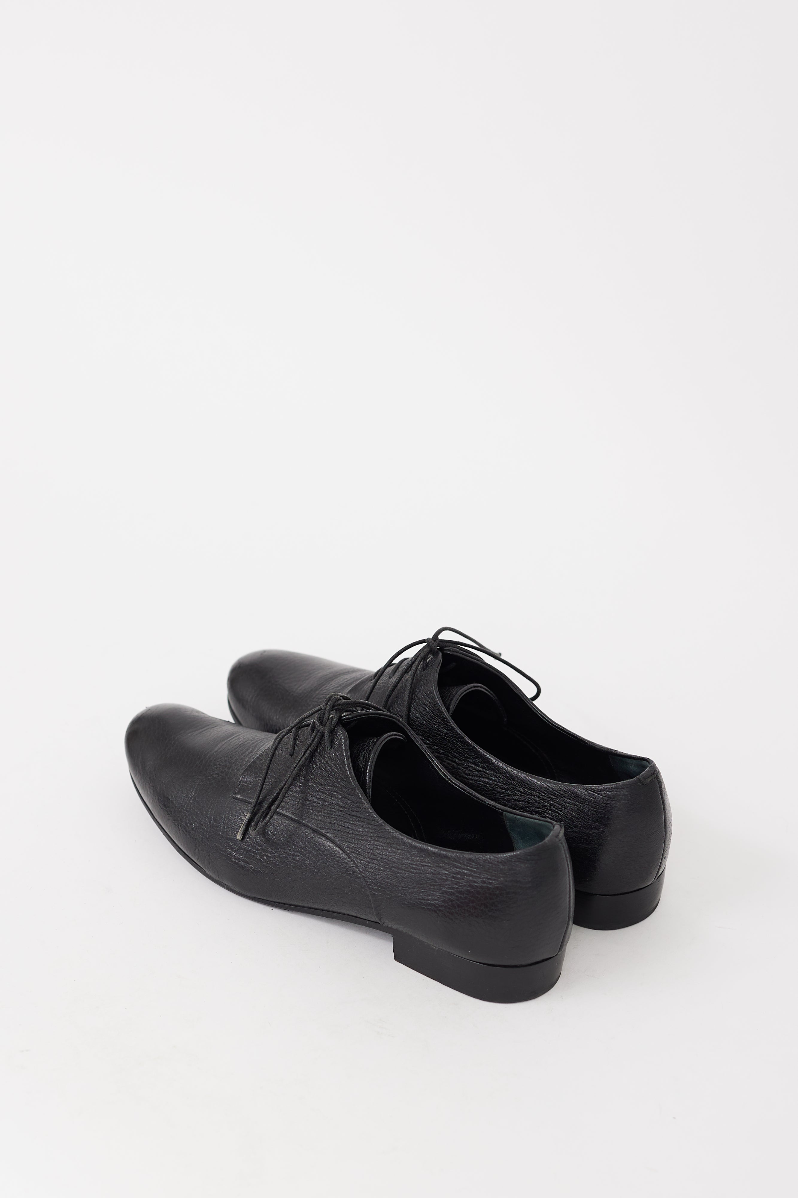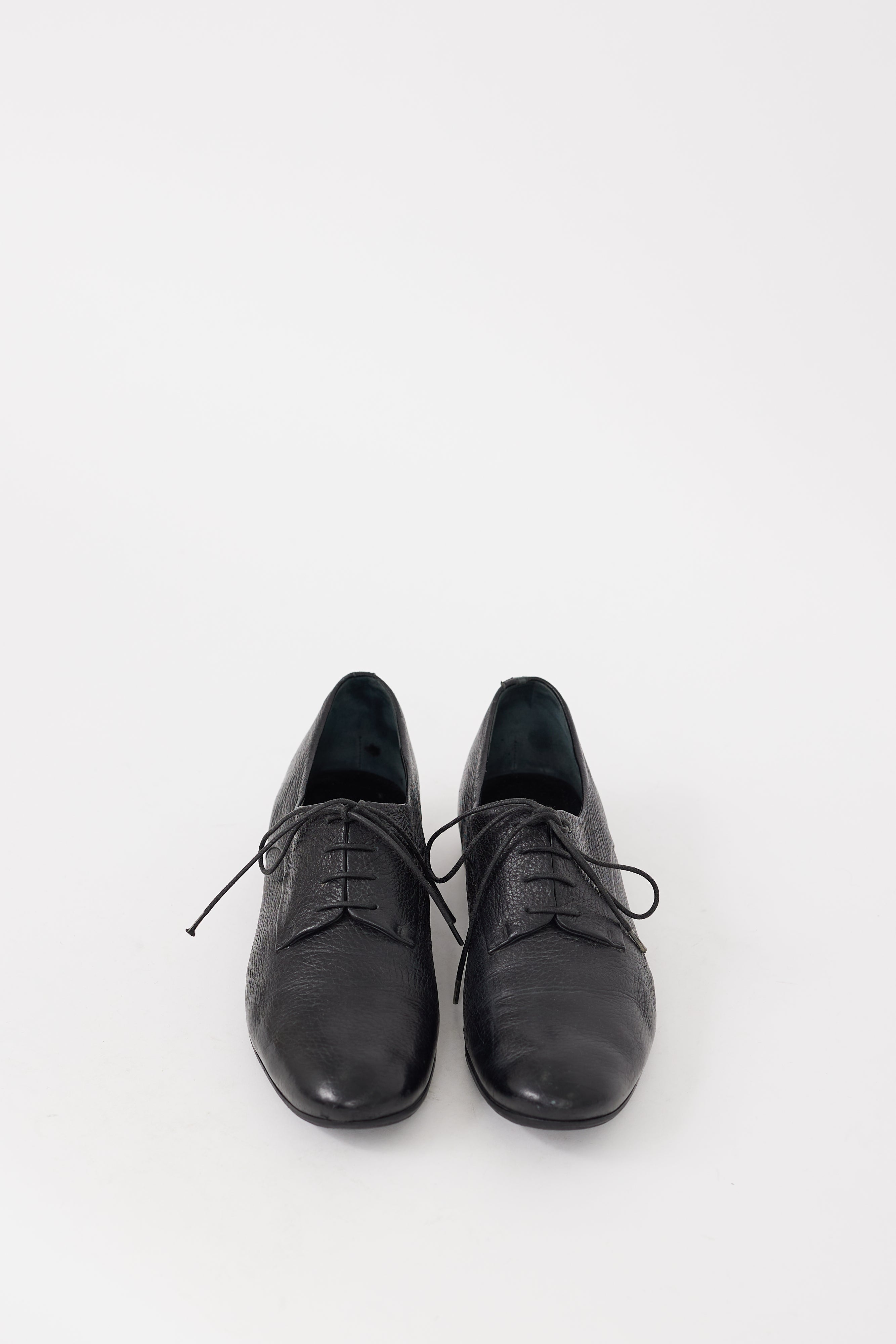 Pre-owned Jil Sander black pebbled leather oxfords featuring a round toe, stacked heel, and lace up closure.