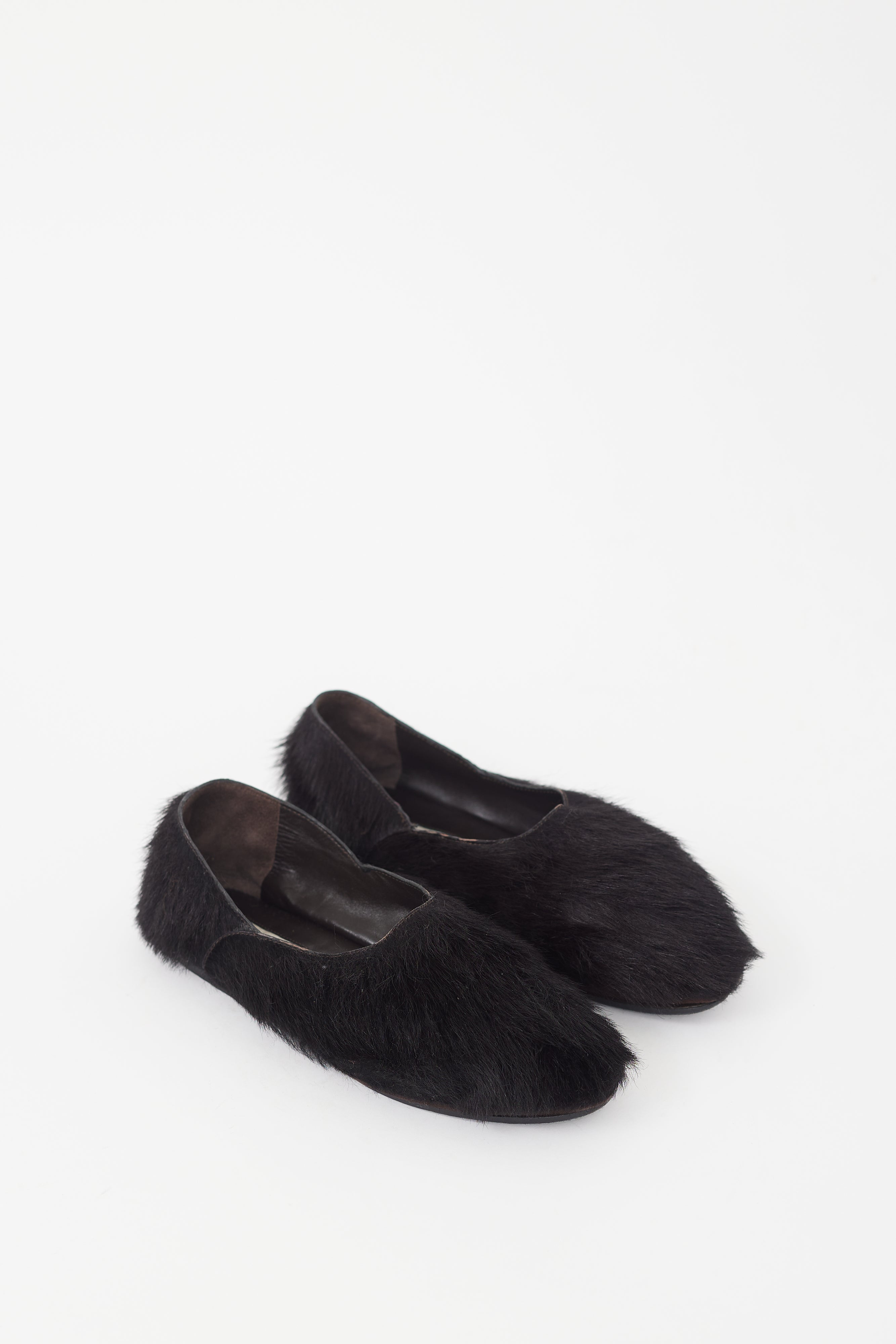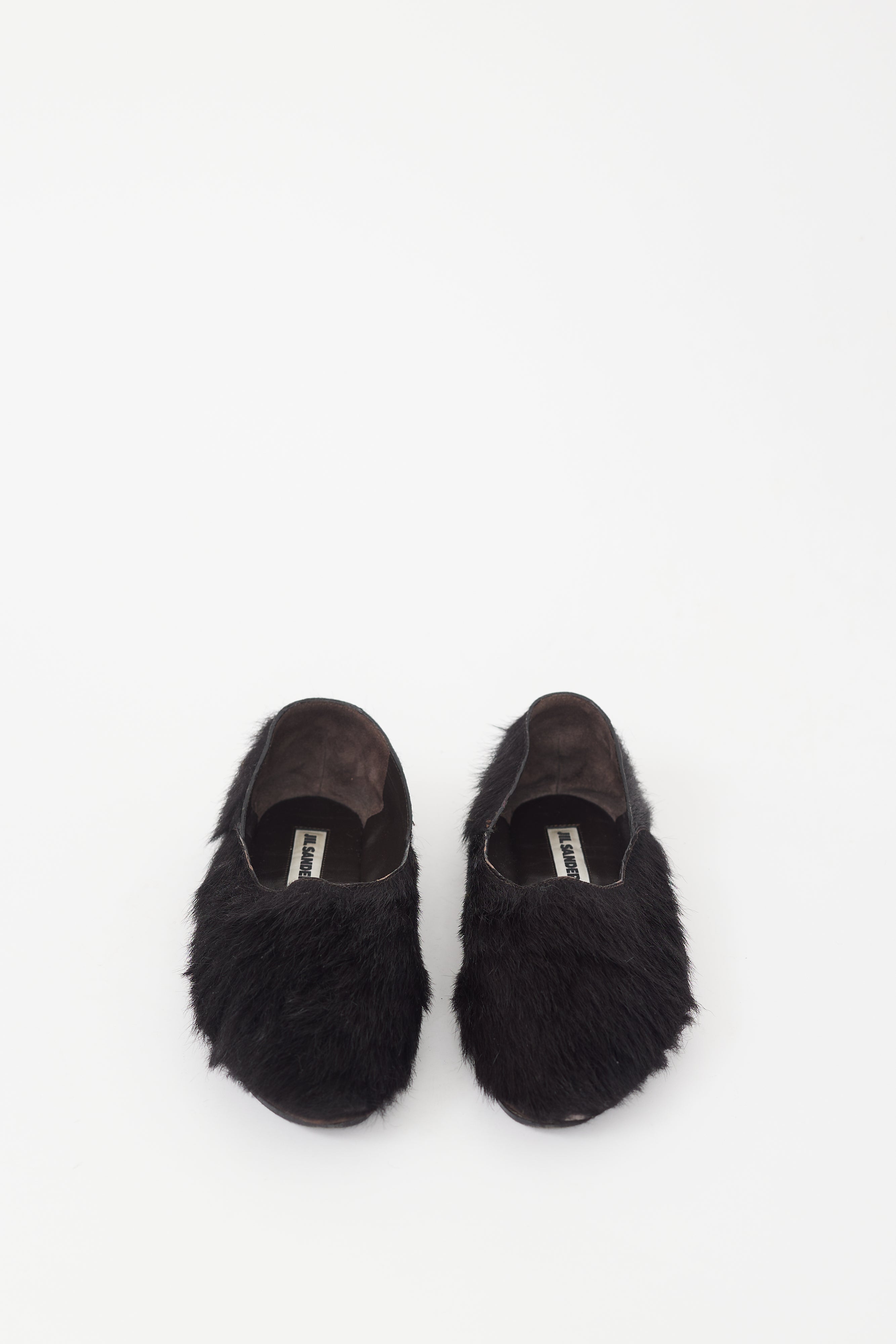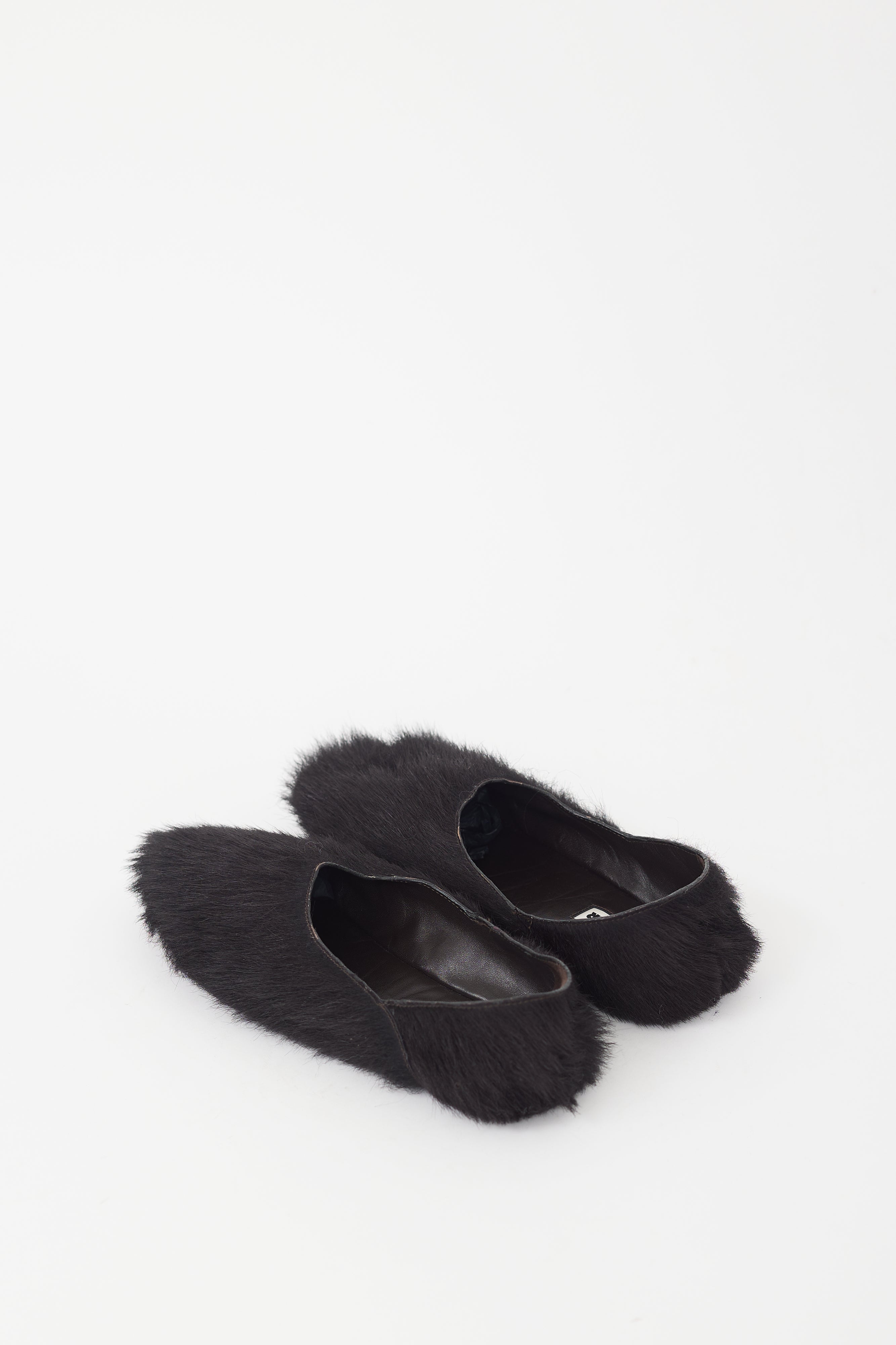 Pre-owned Jil Sander pony fur flats featuring black fur upper, leather insole, partial leather and wood outsole and slip on entry.